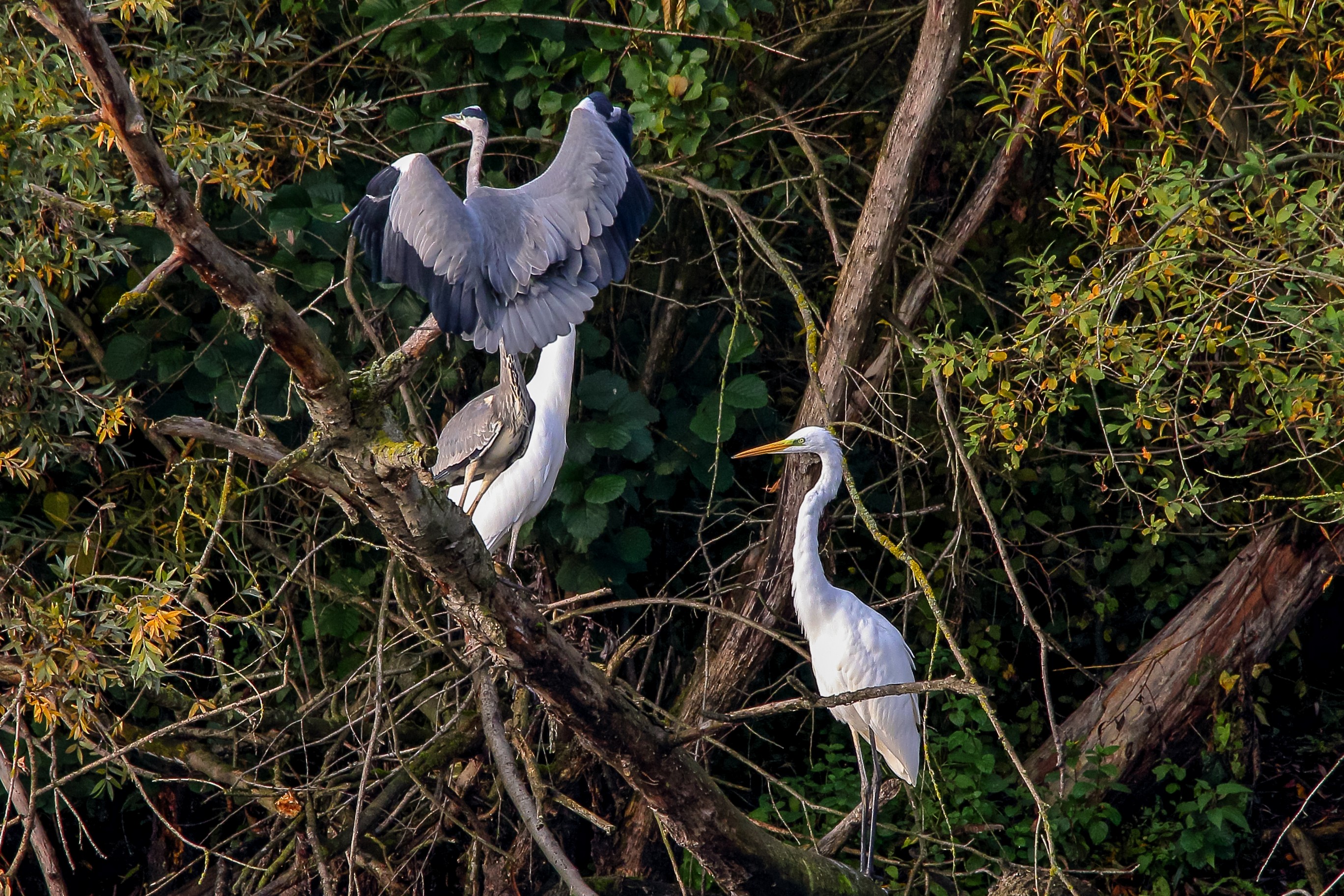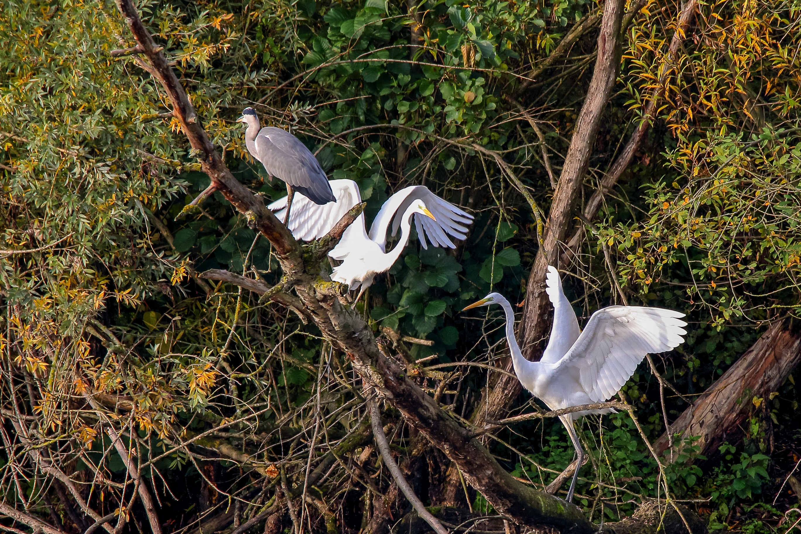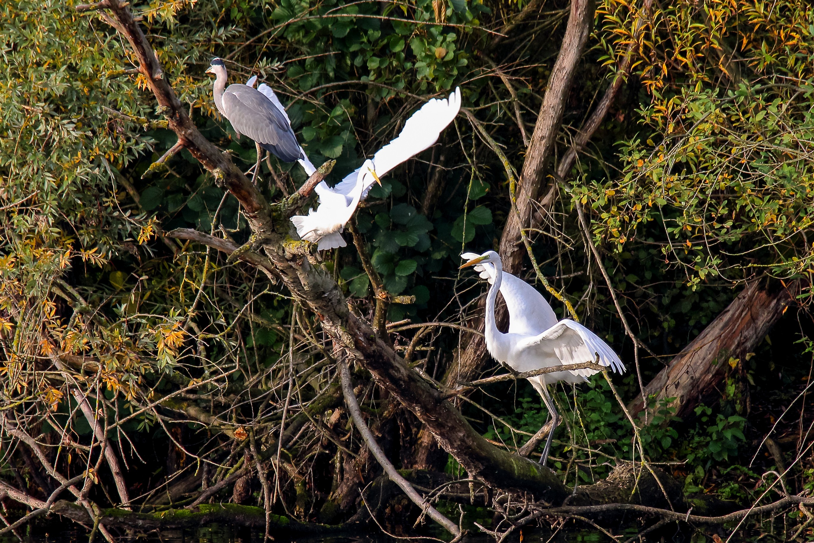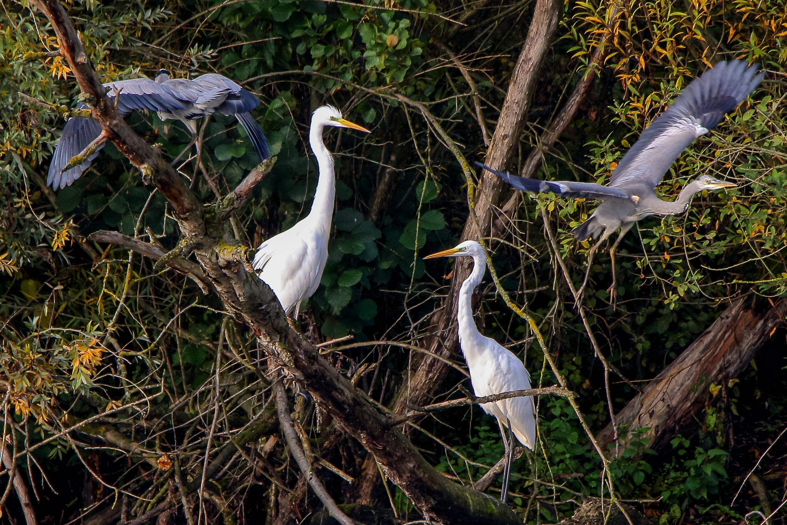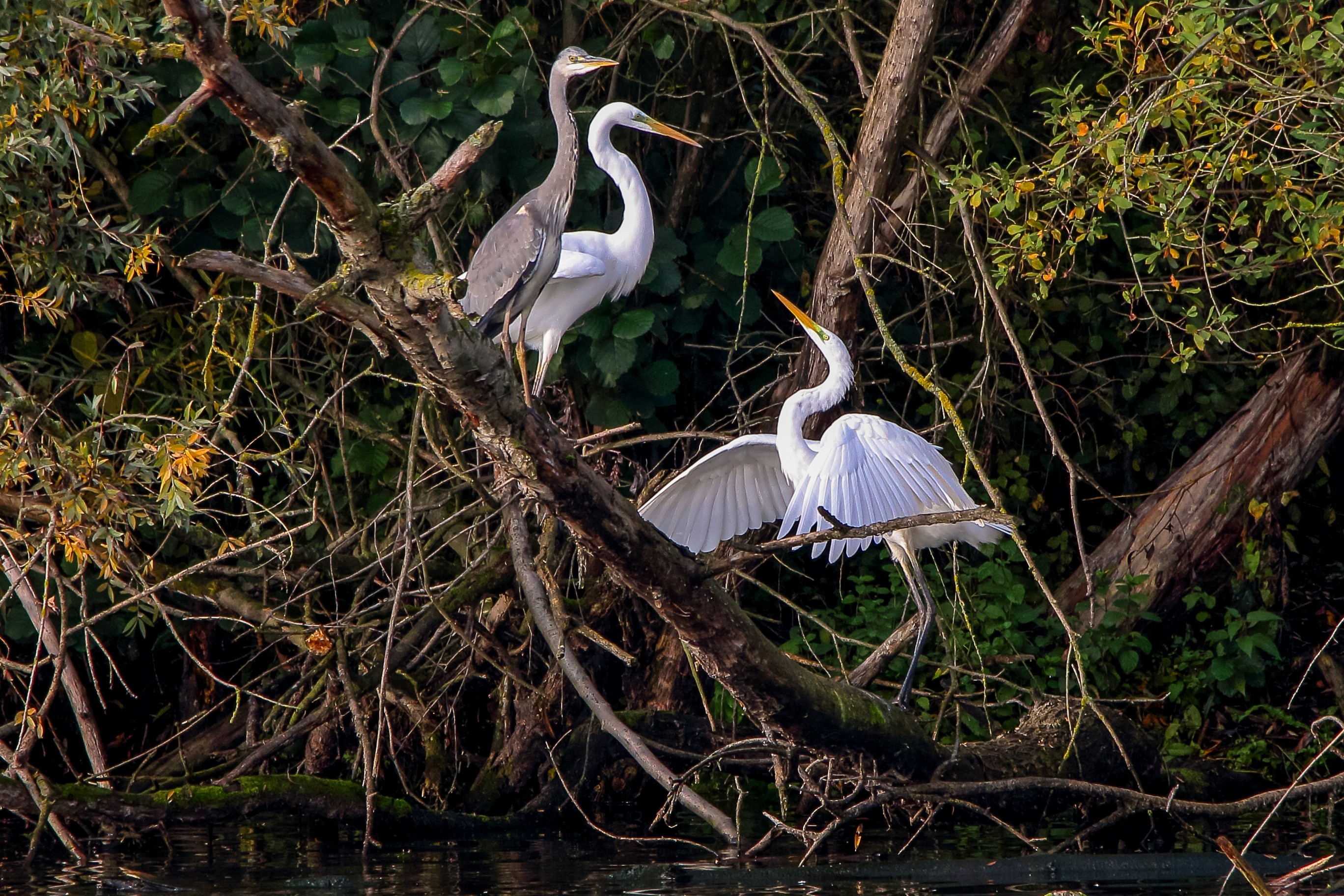 Silberreiher streiten sich um den besten Platz beim Kormoranfischen