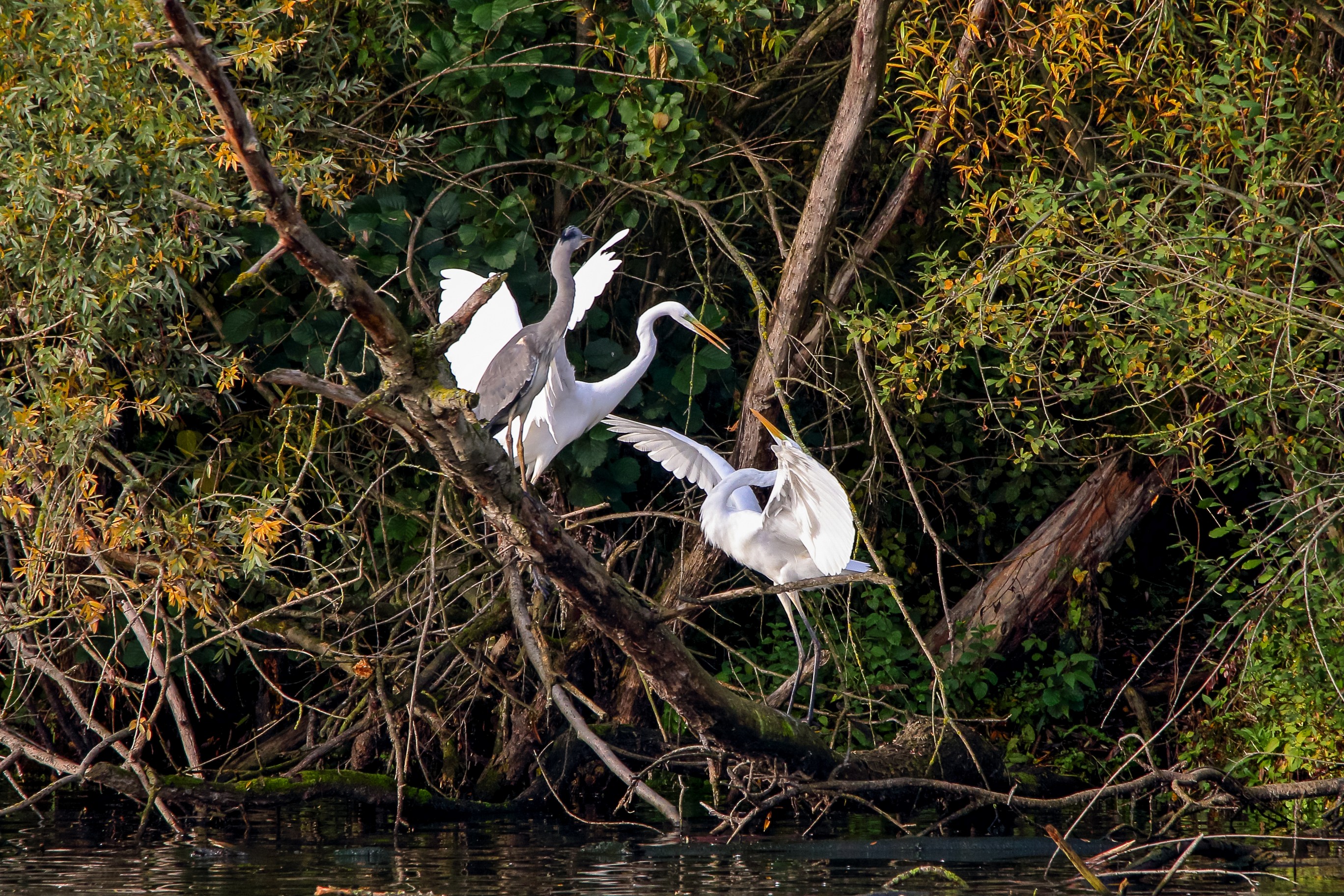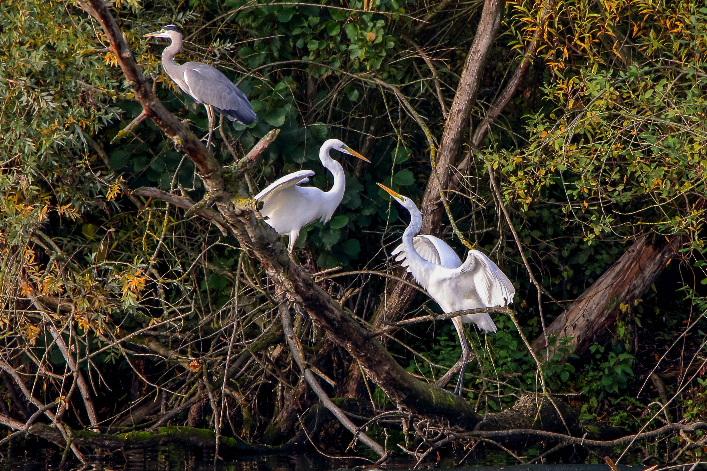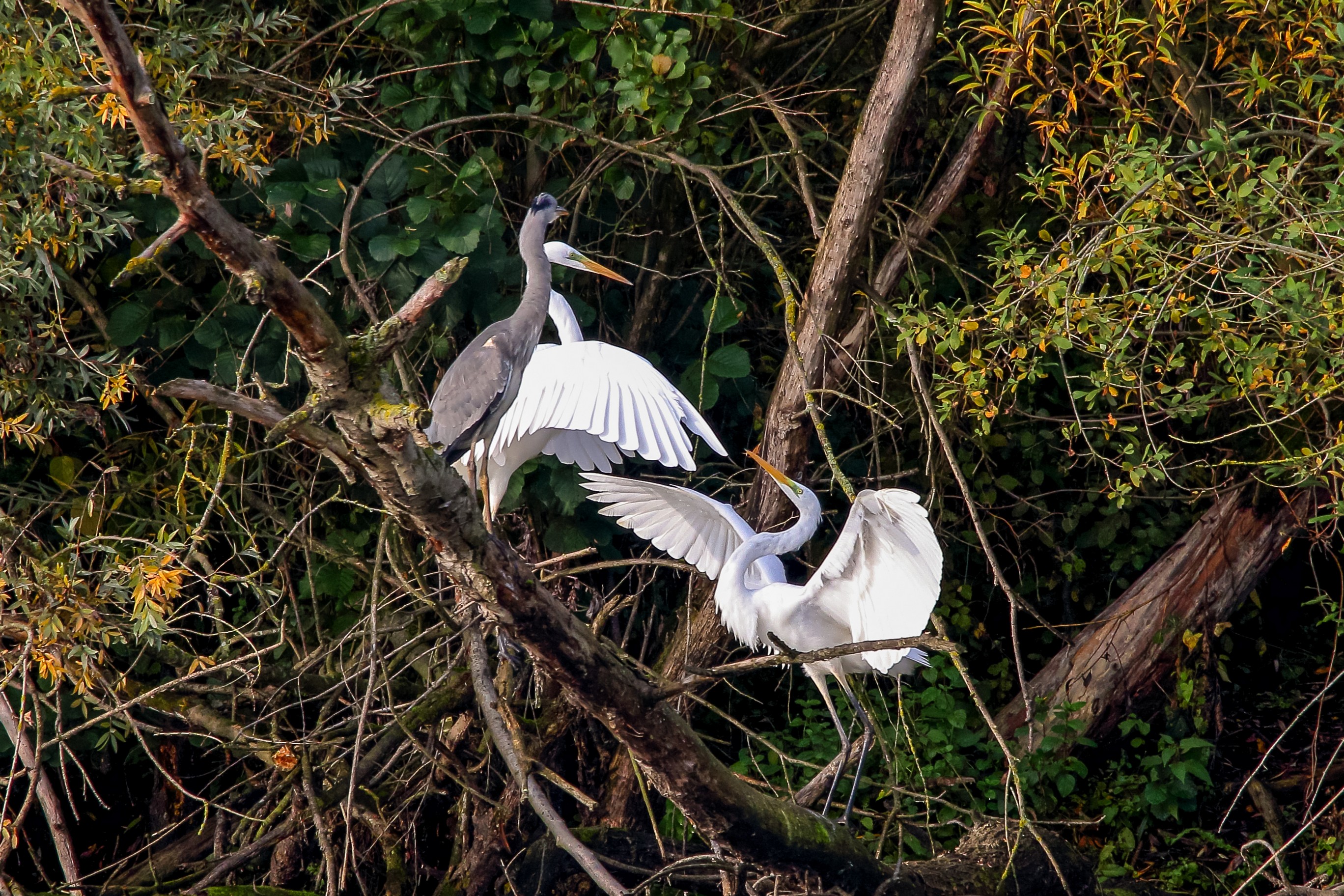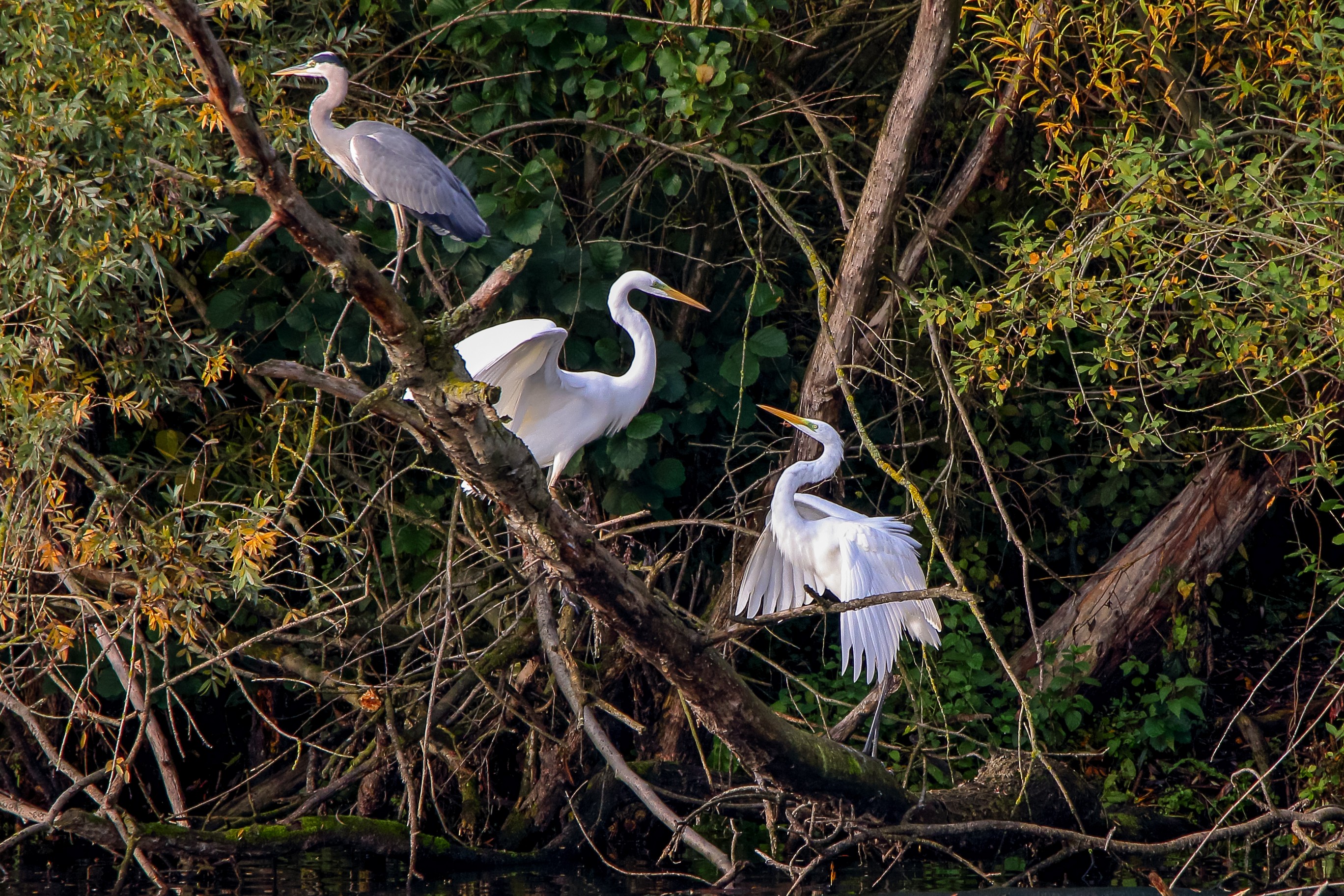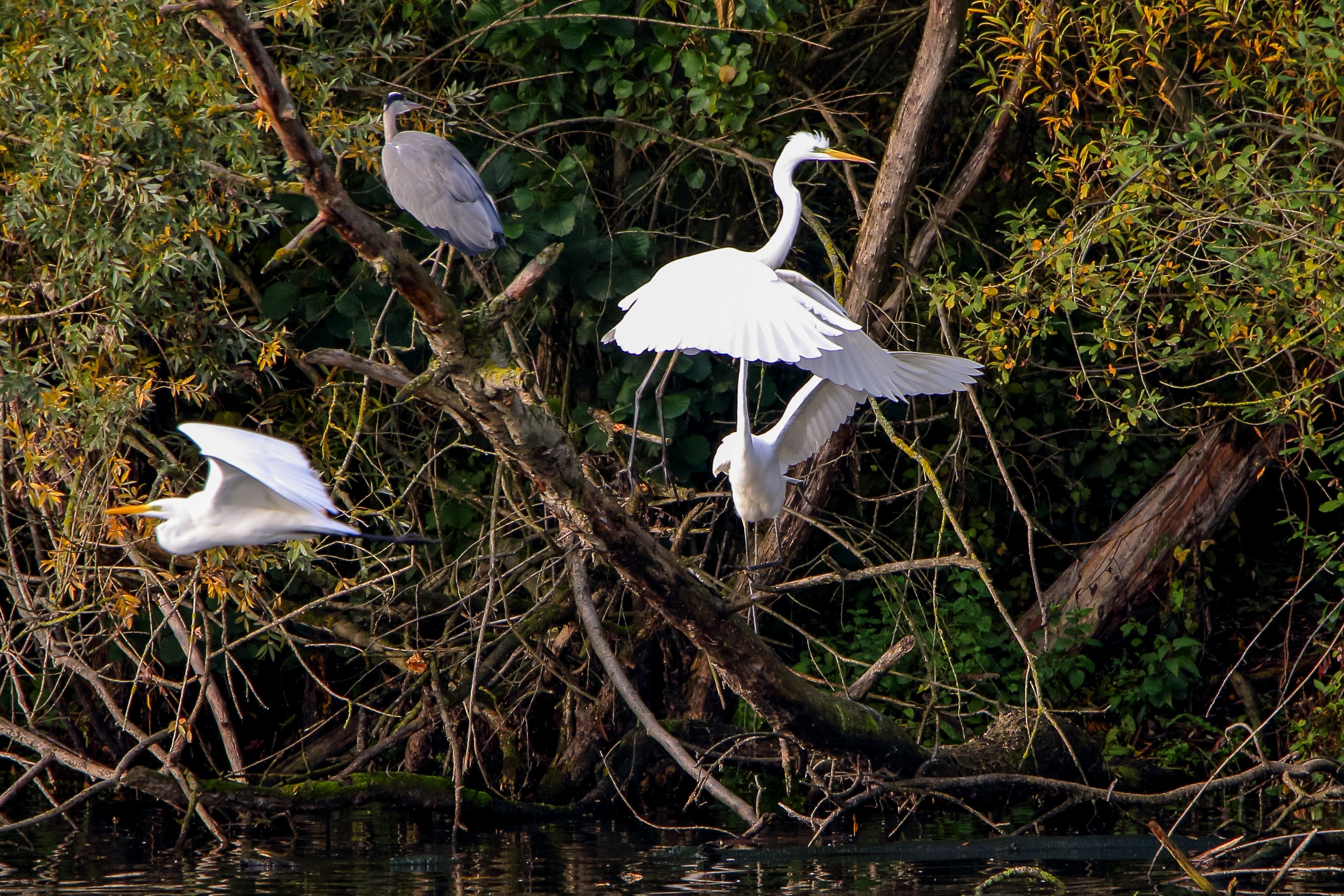 Silberreiher streiten sich um den besten Platz beim Kormoranfischen