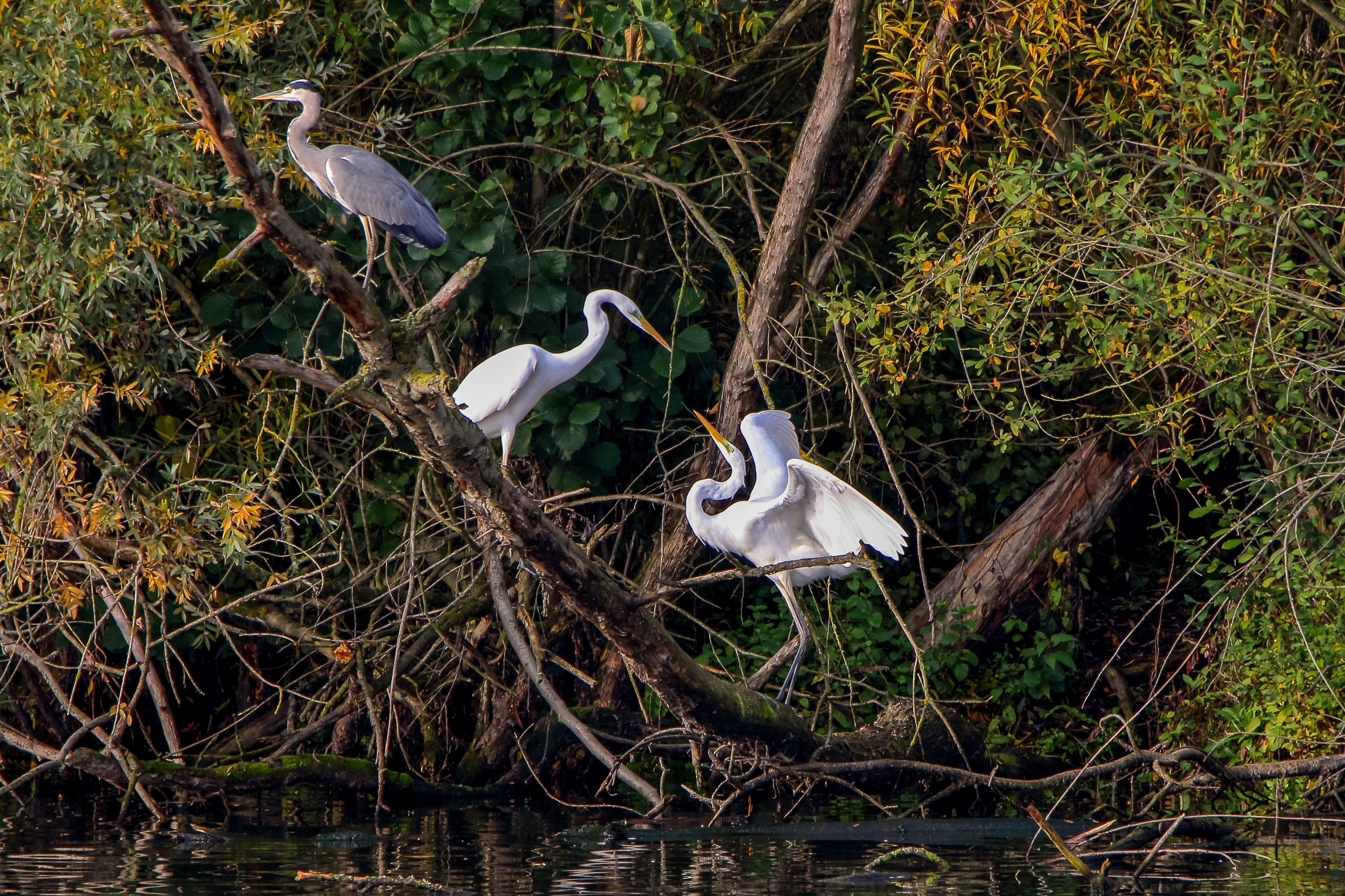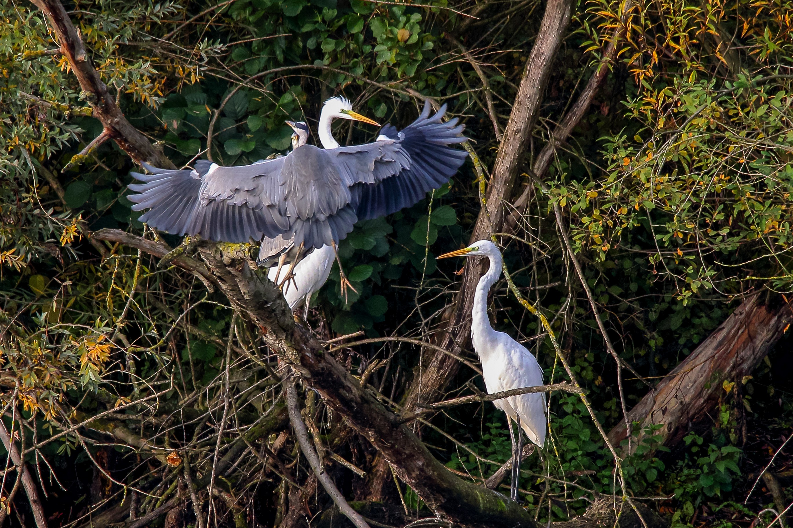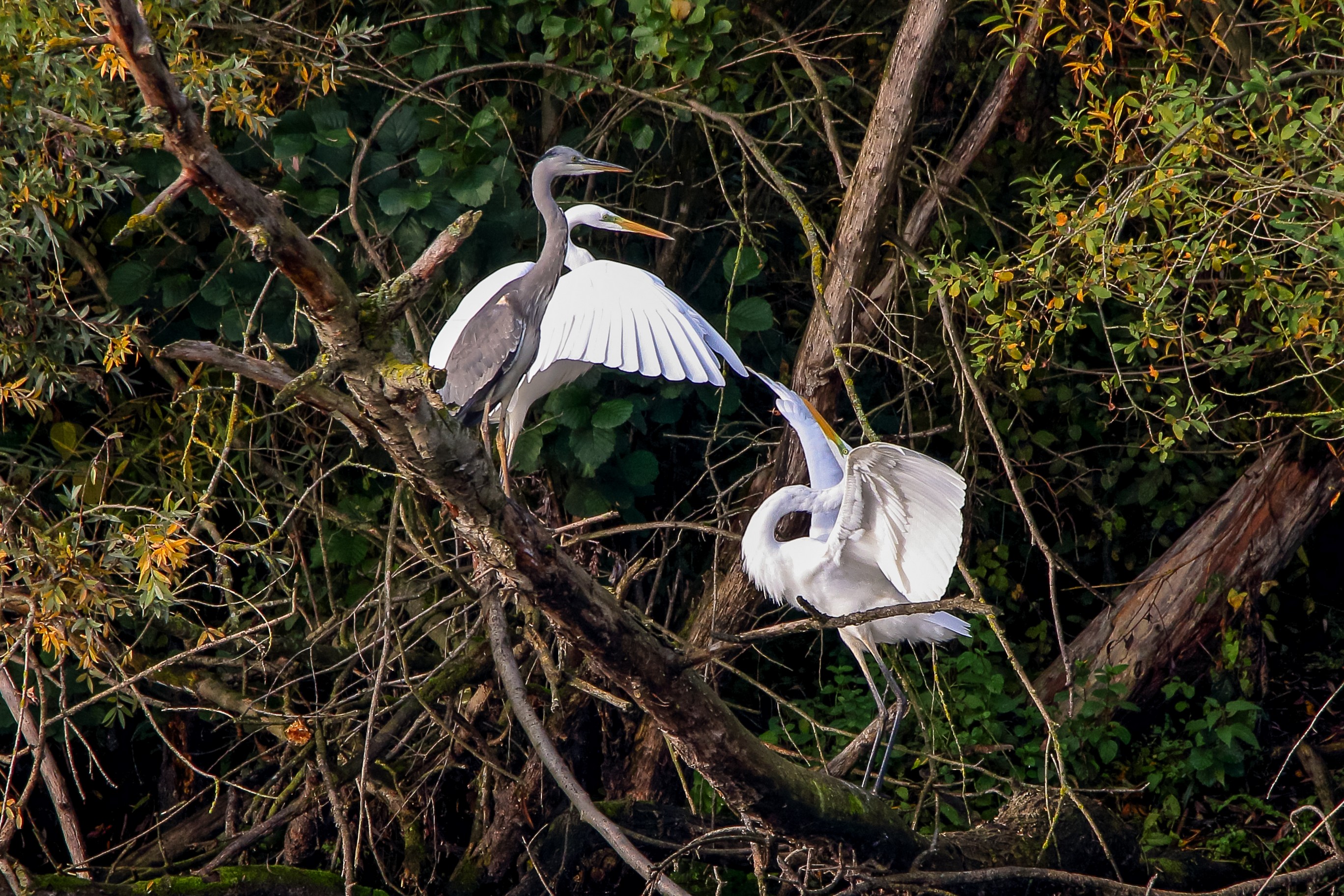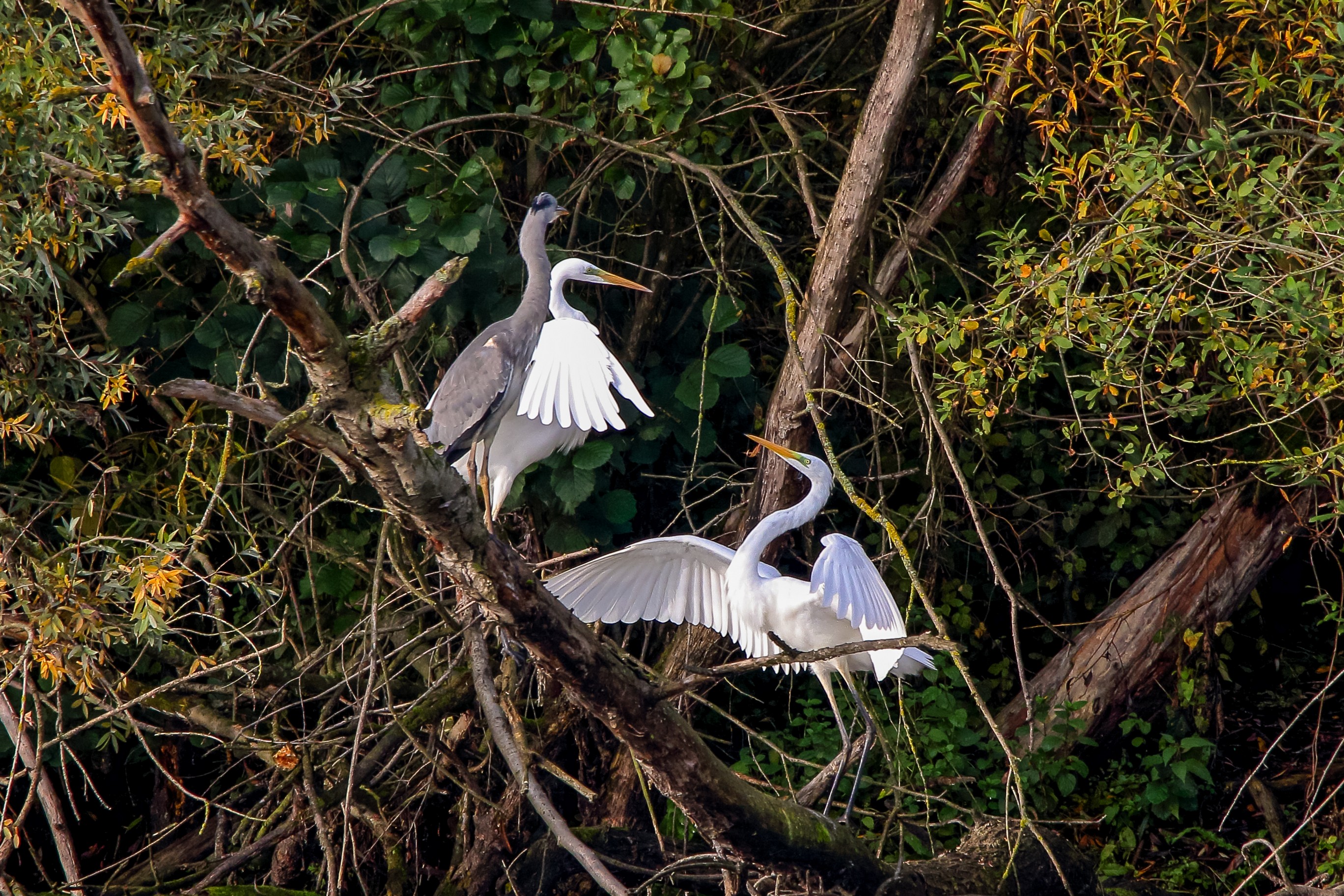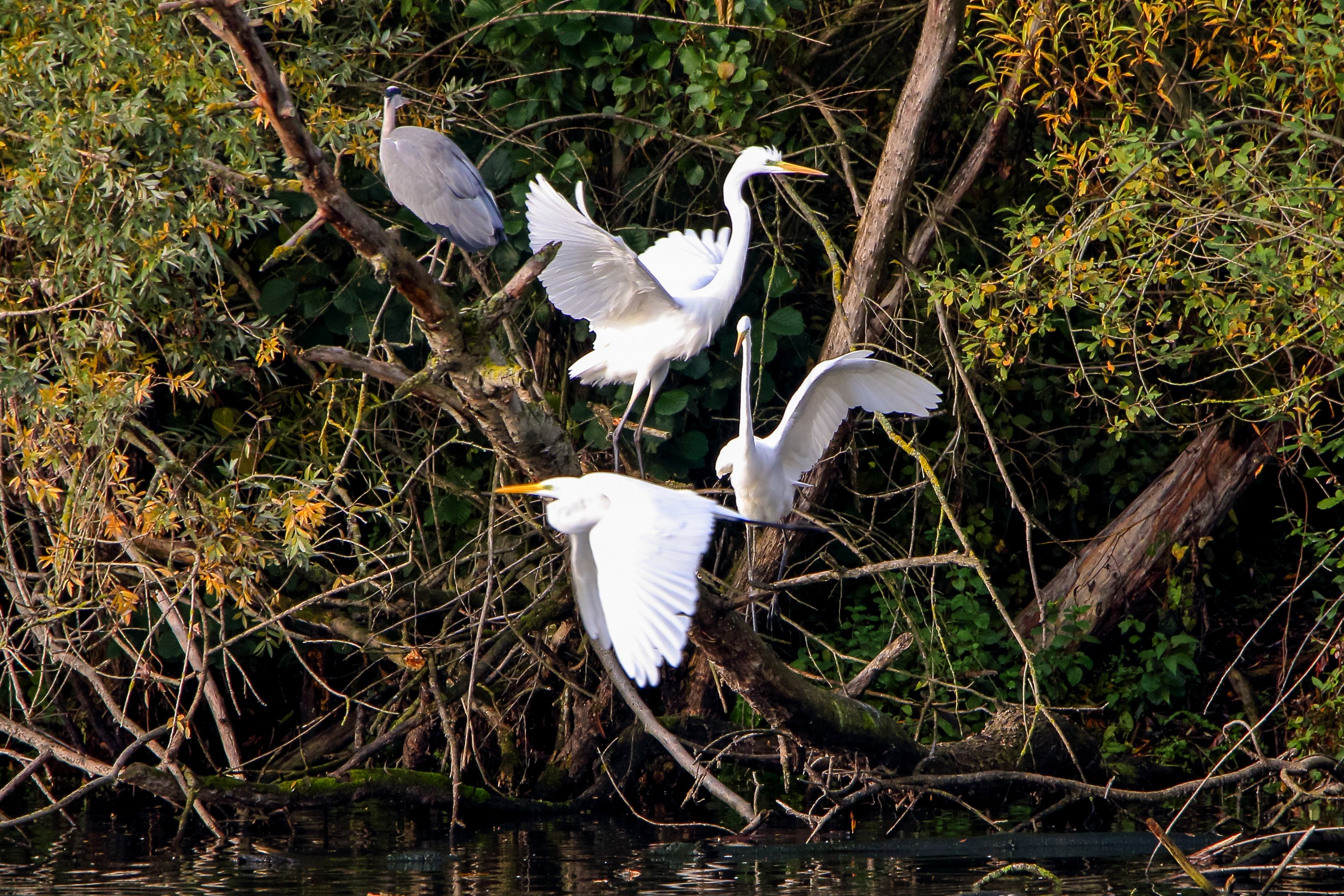 Silberreiher streiten sich um den besten Platz beim Kormoranfischen