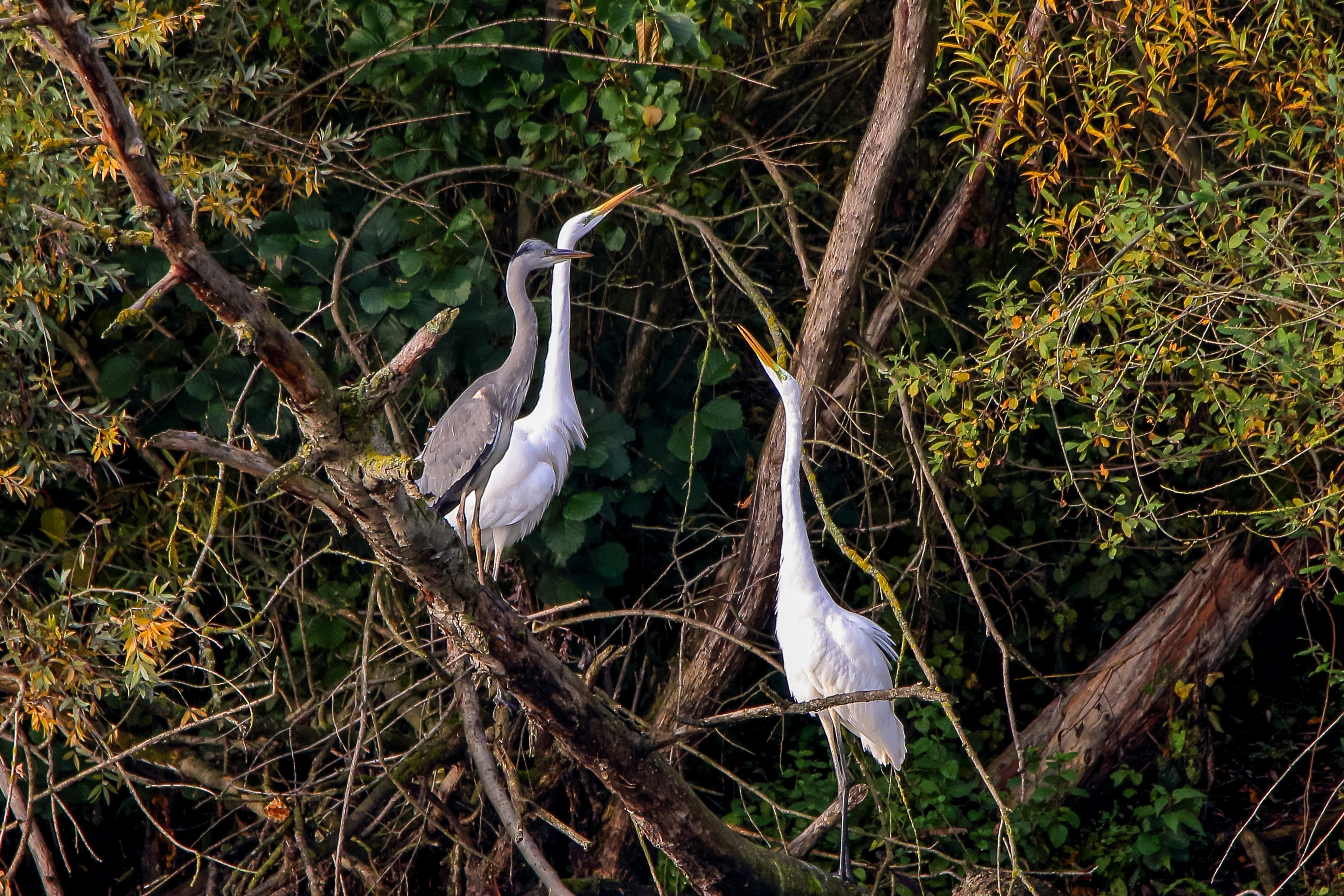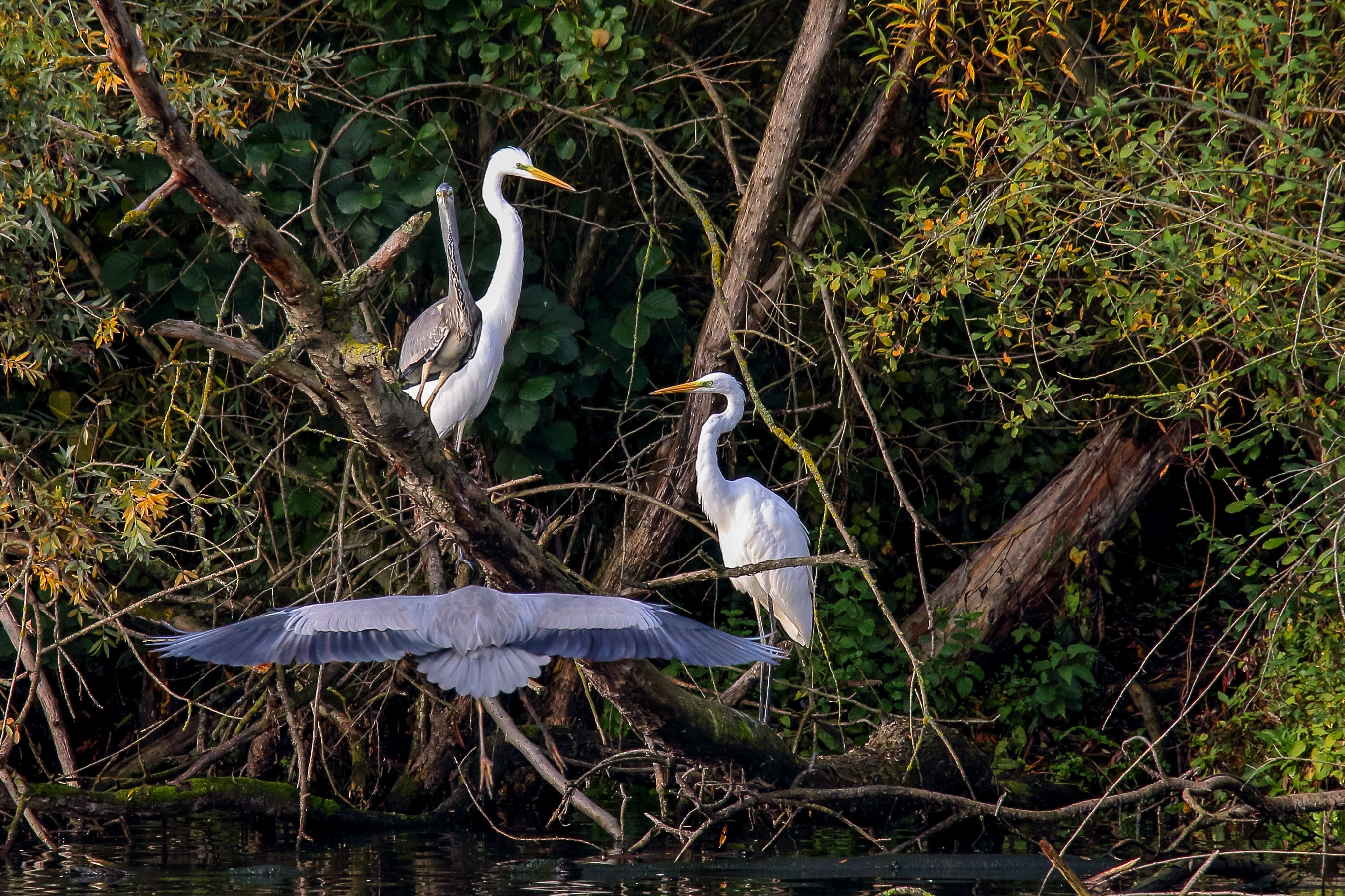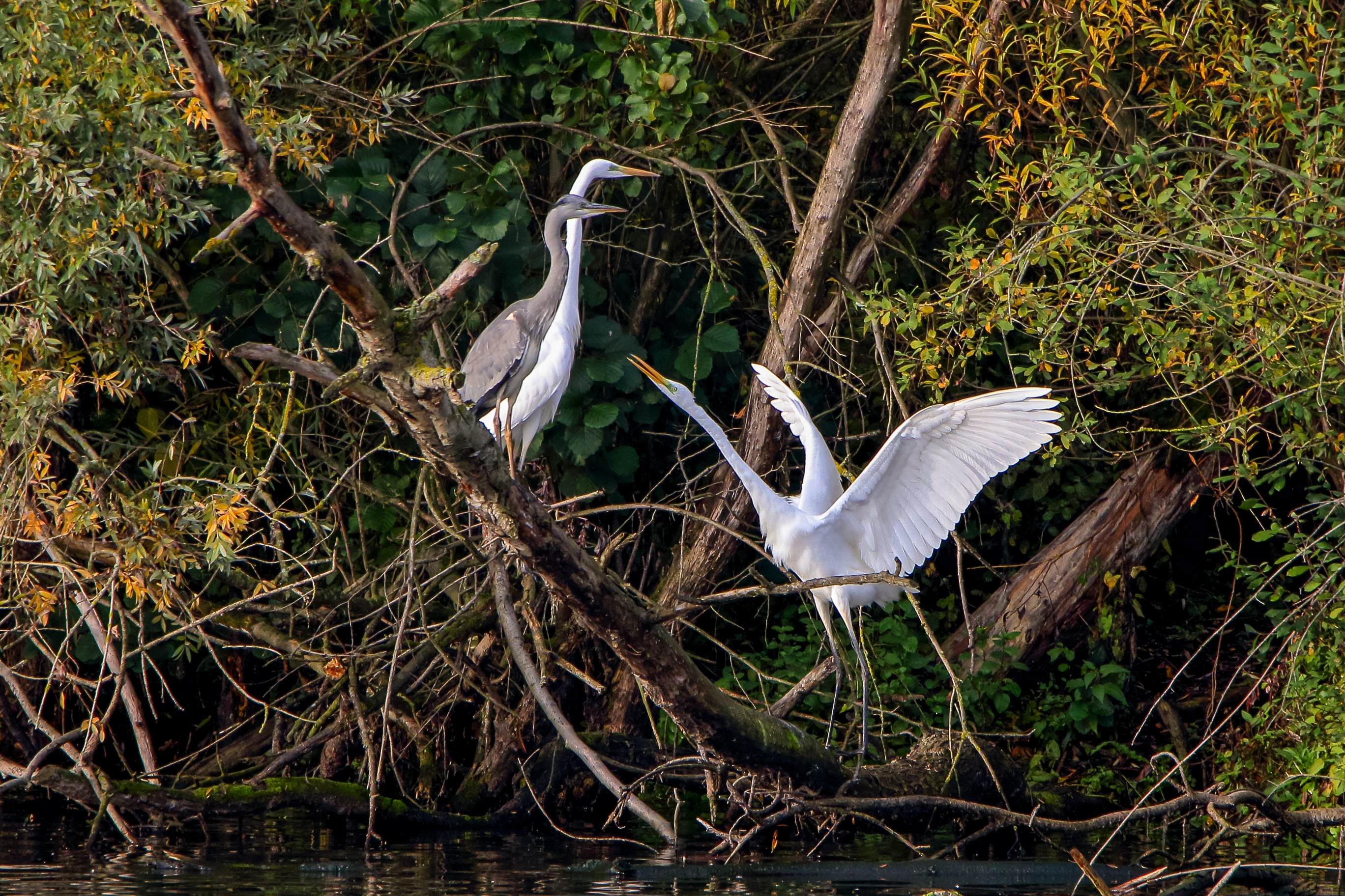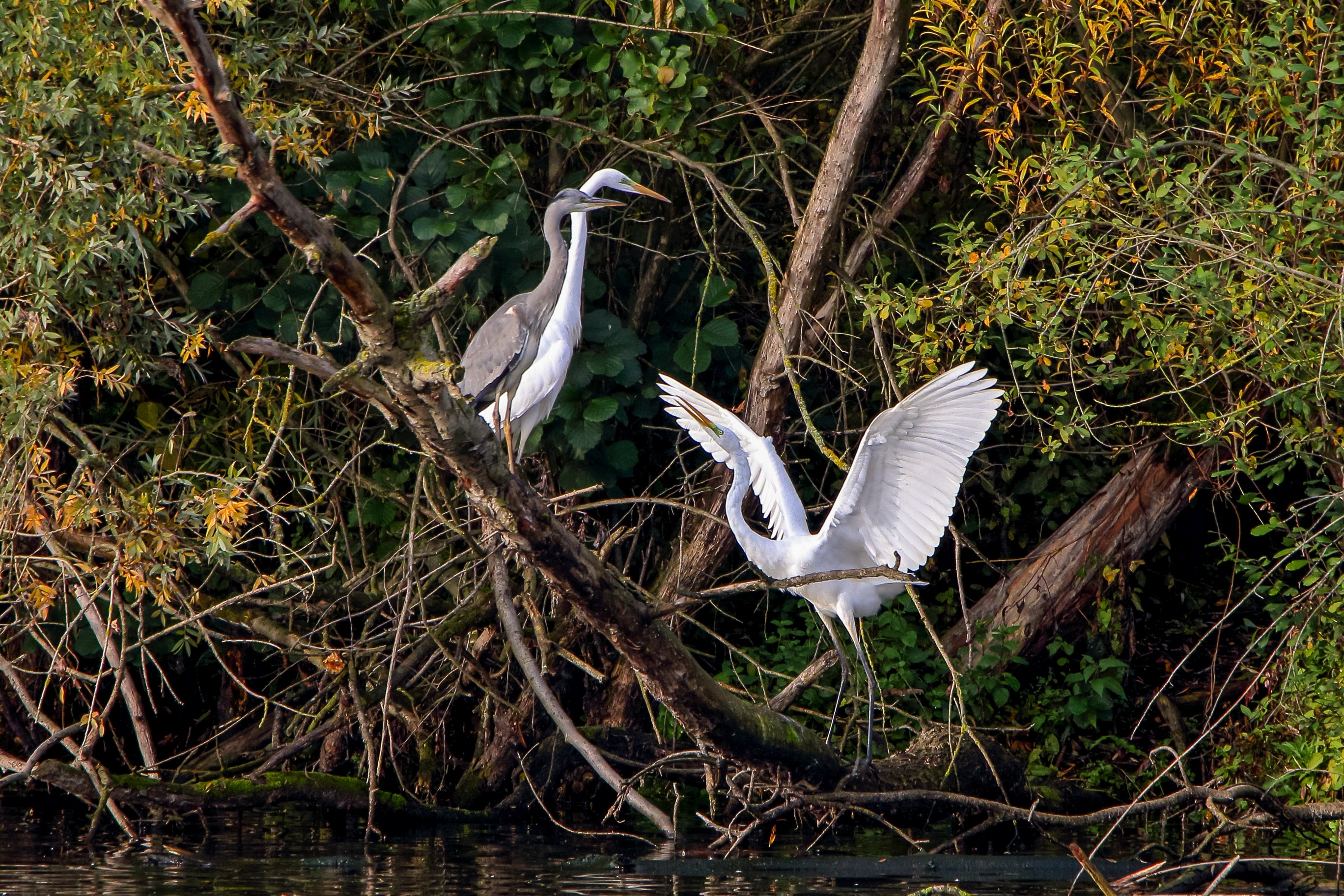 Silberreiher streiten sich um den besten Platz beim Kormoranfischen