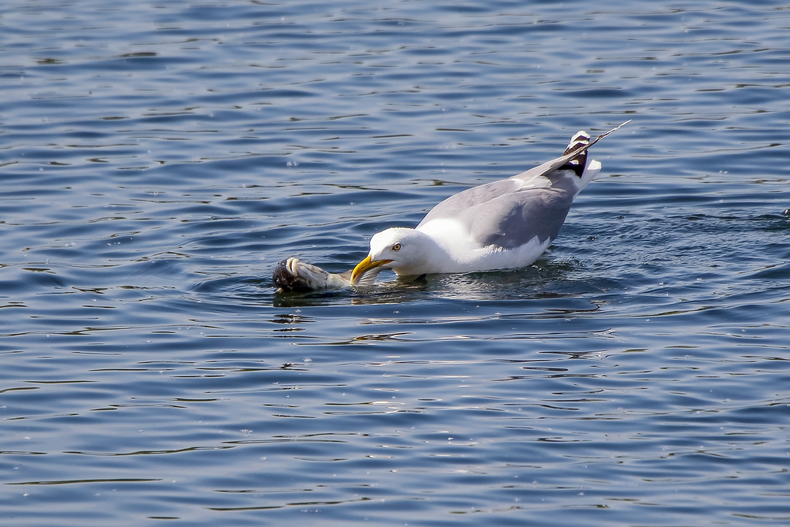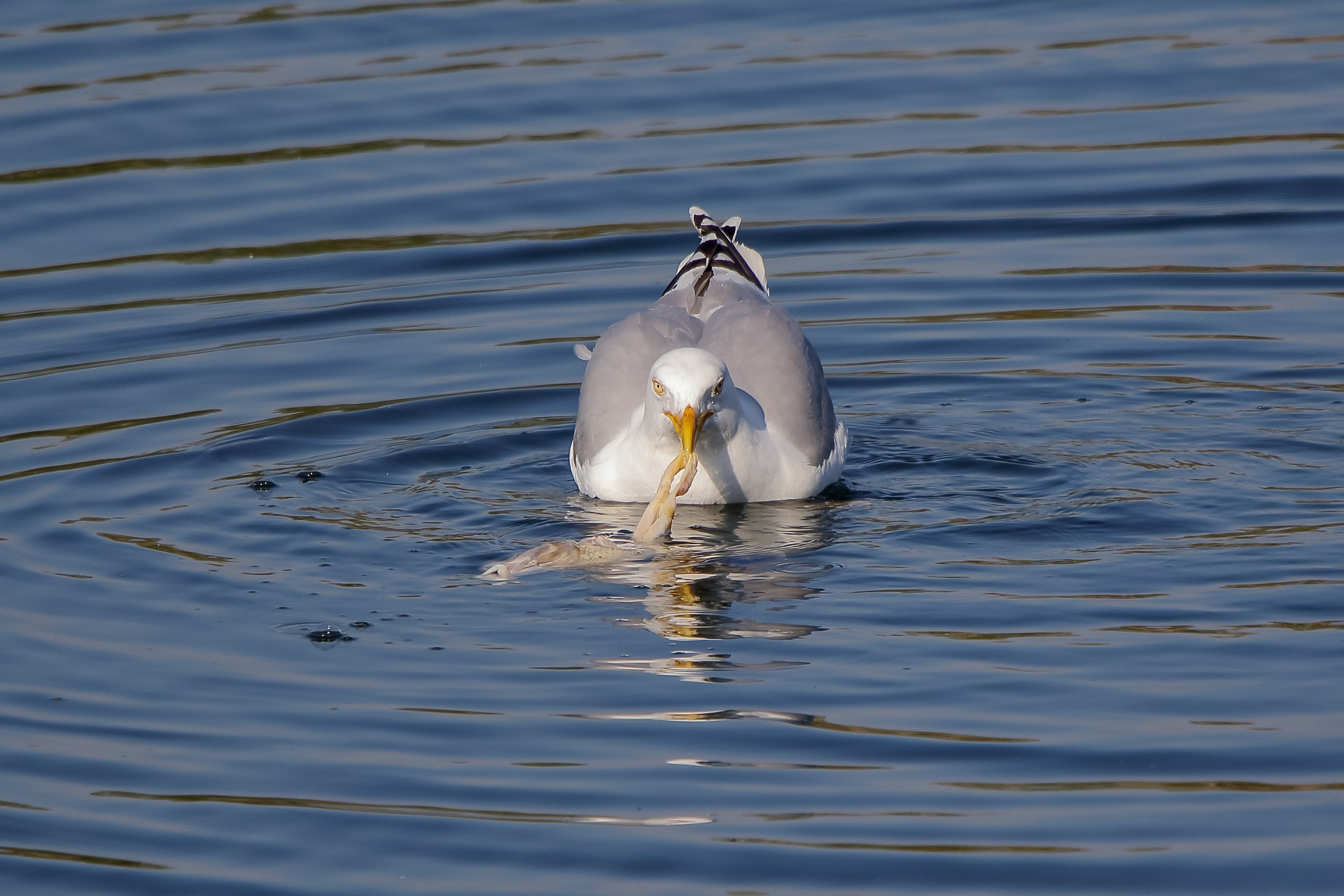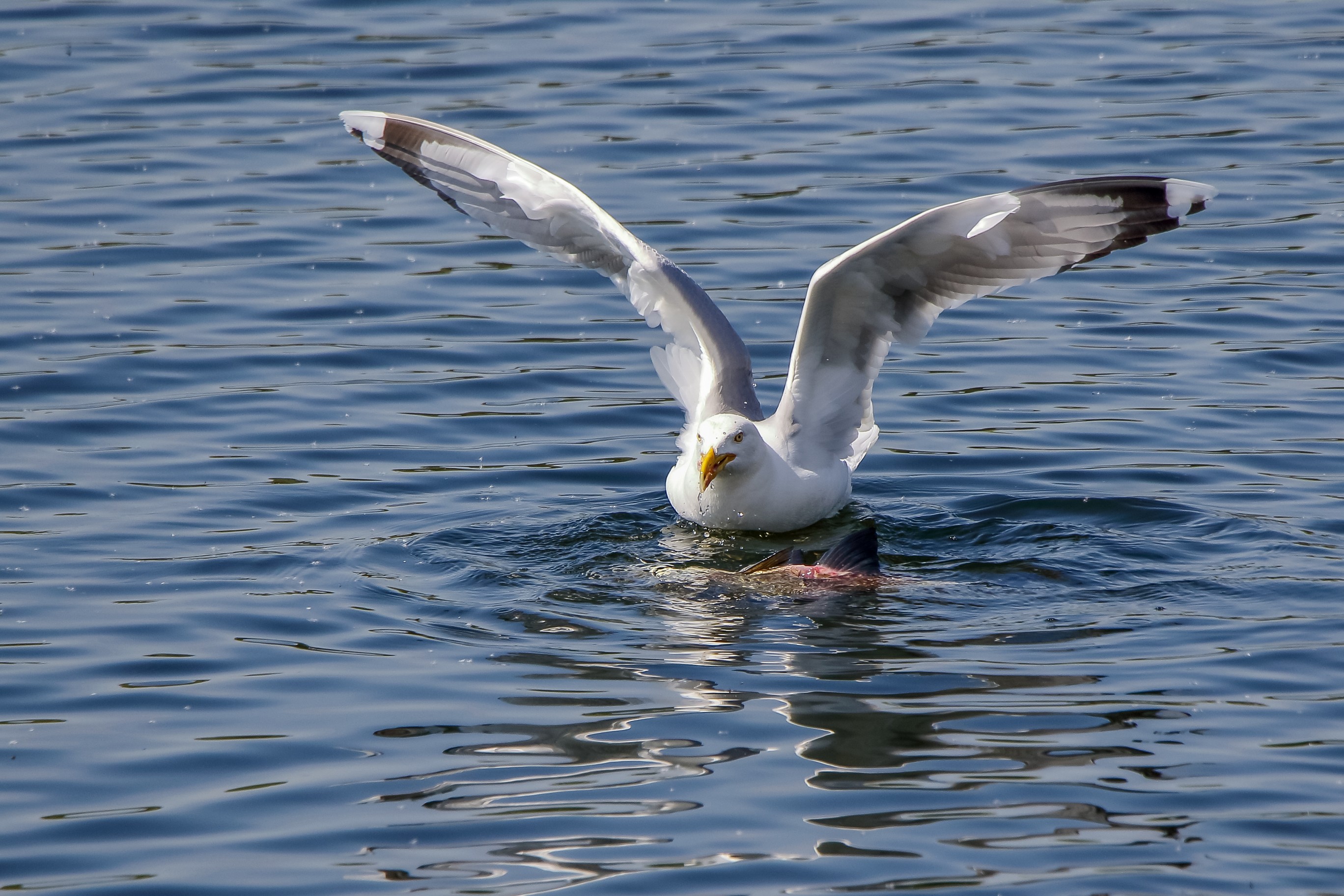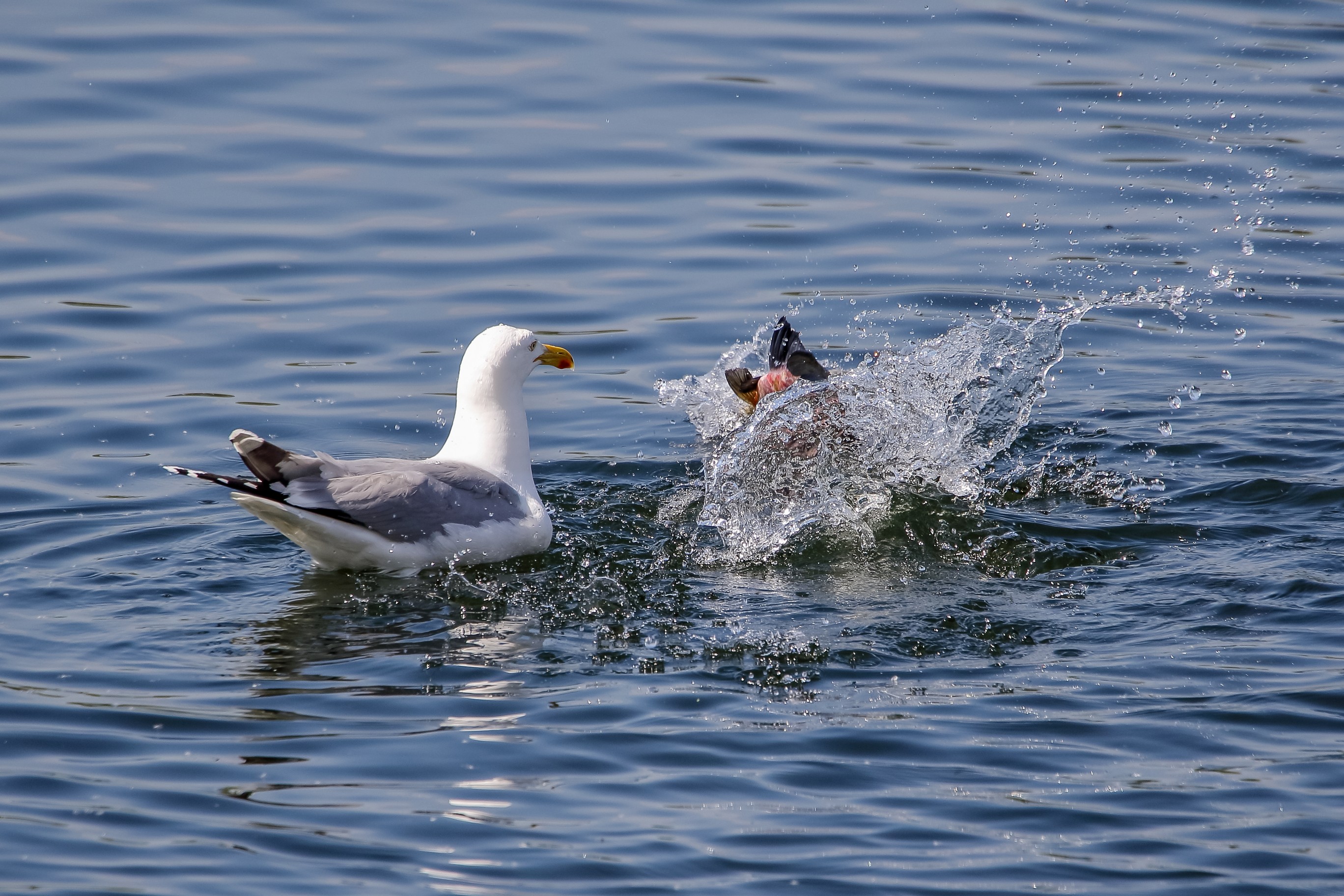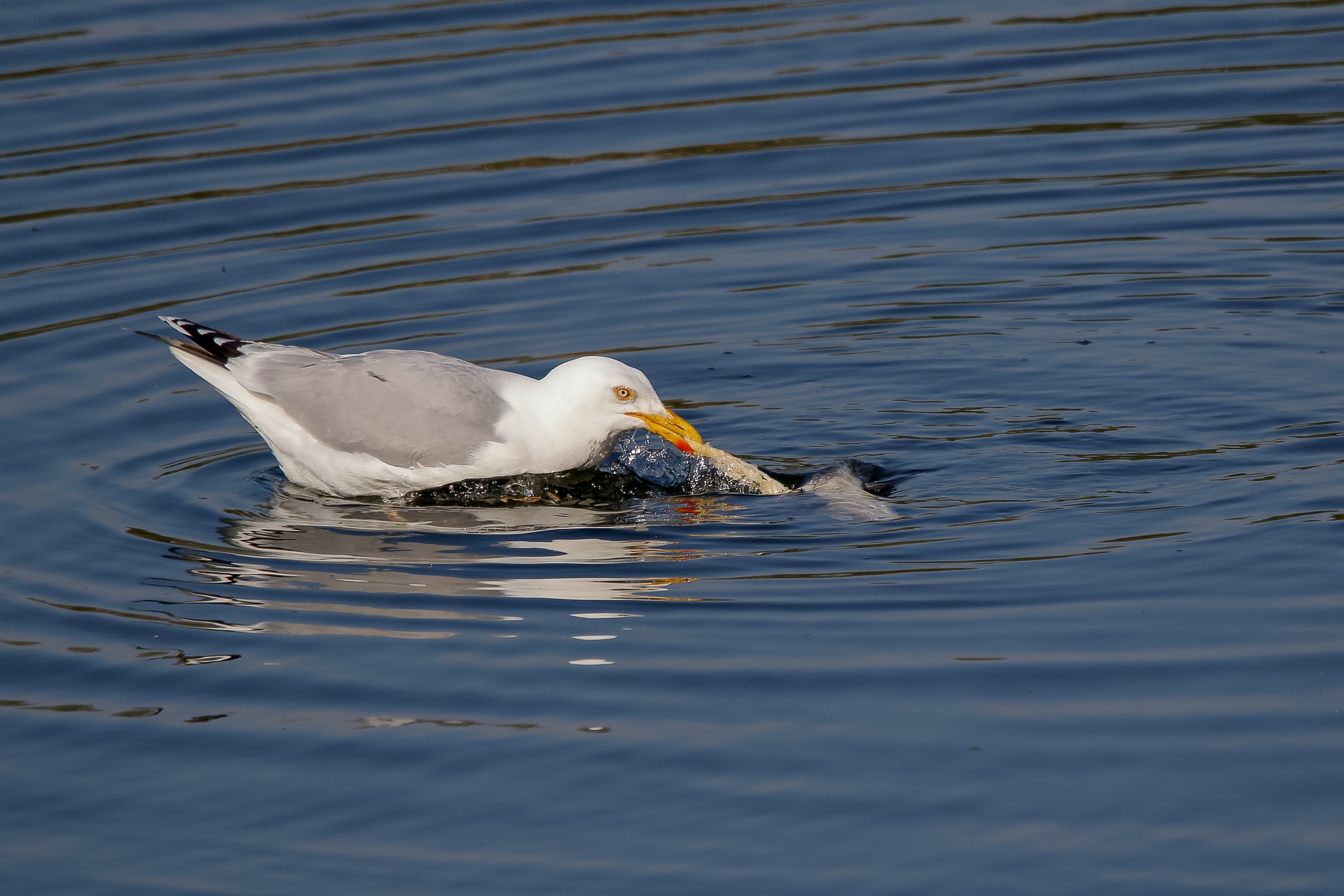 Silbermöwe bemüht sich den Fisch zu zerlegen