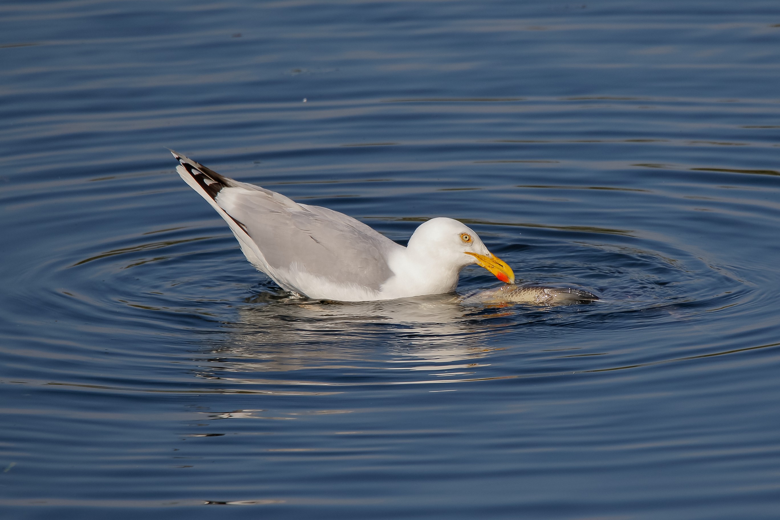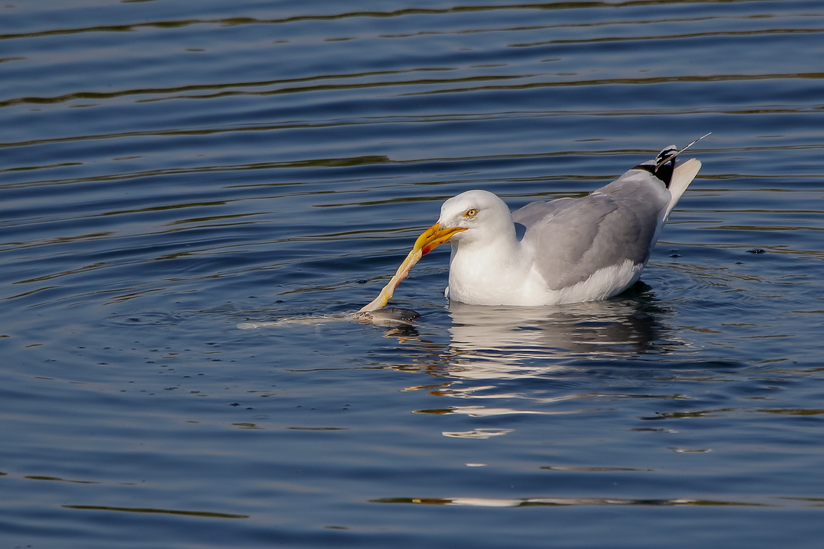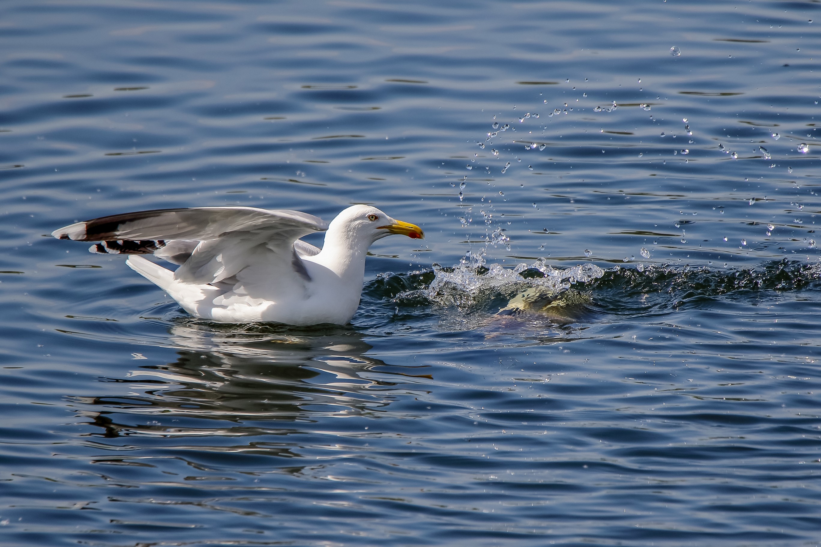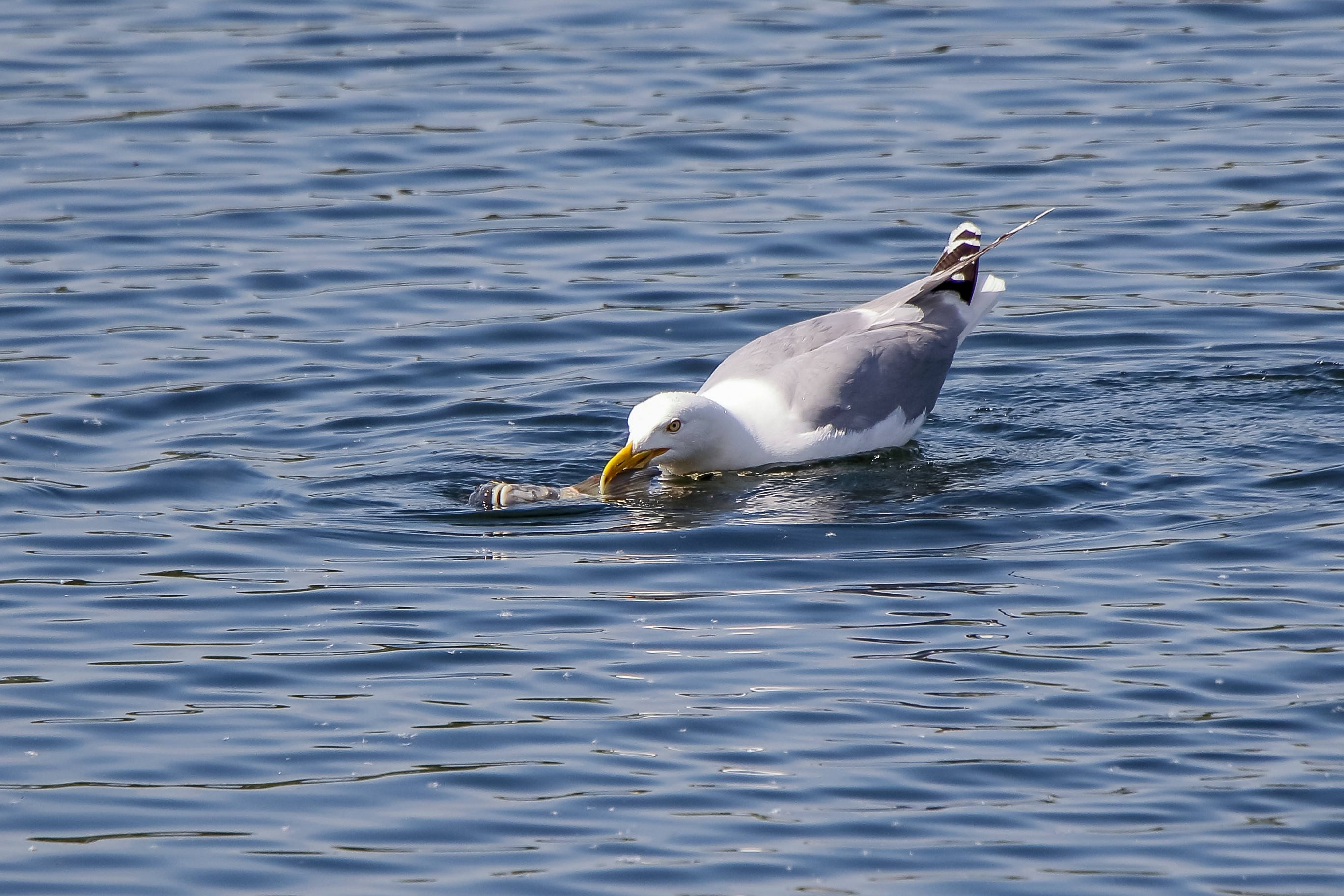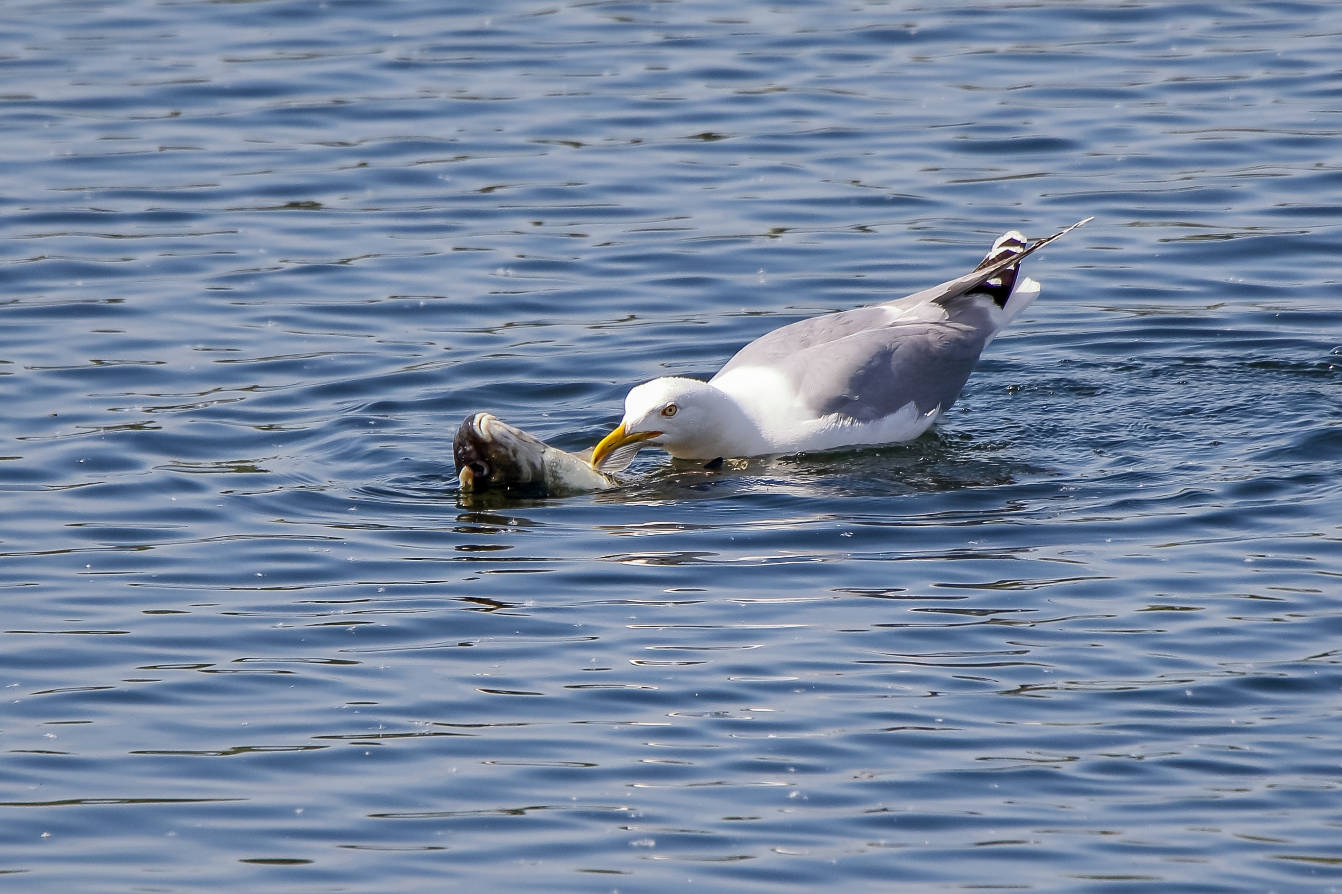 Silbermöwe bemüht sich den Fisch zu zerlegen