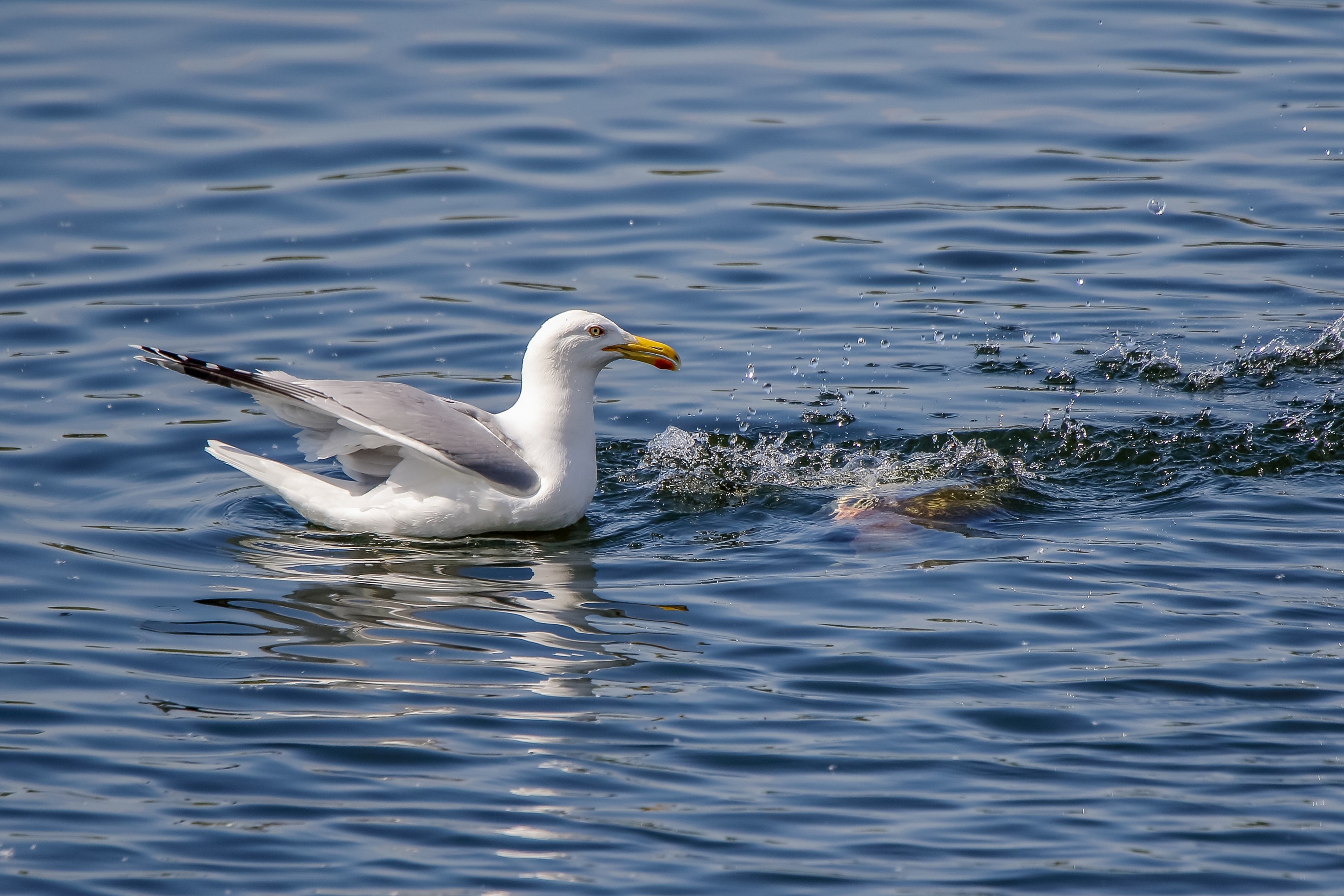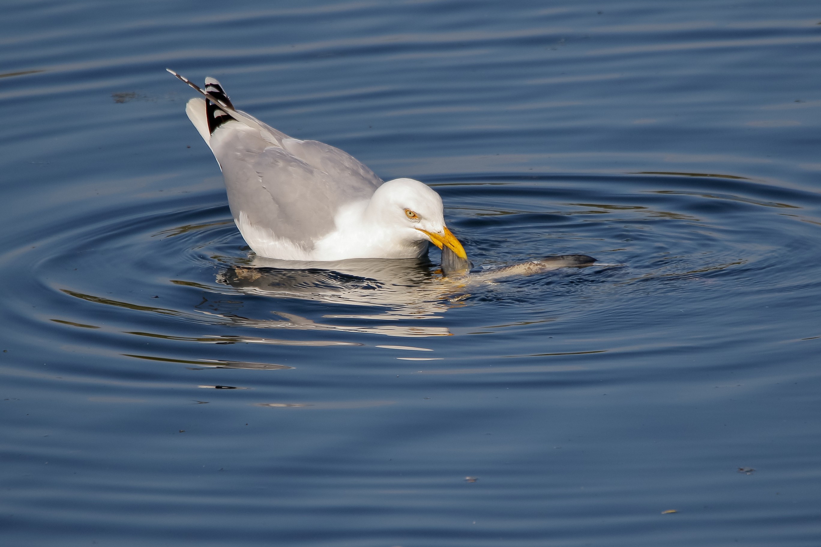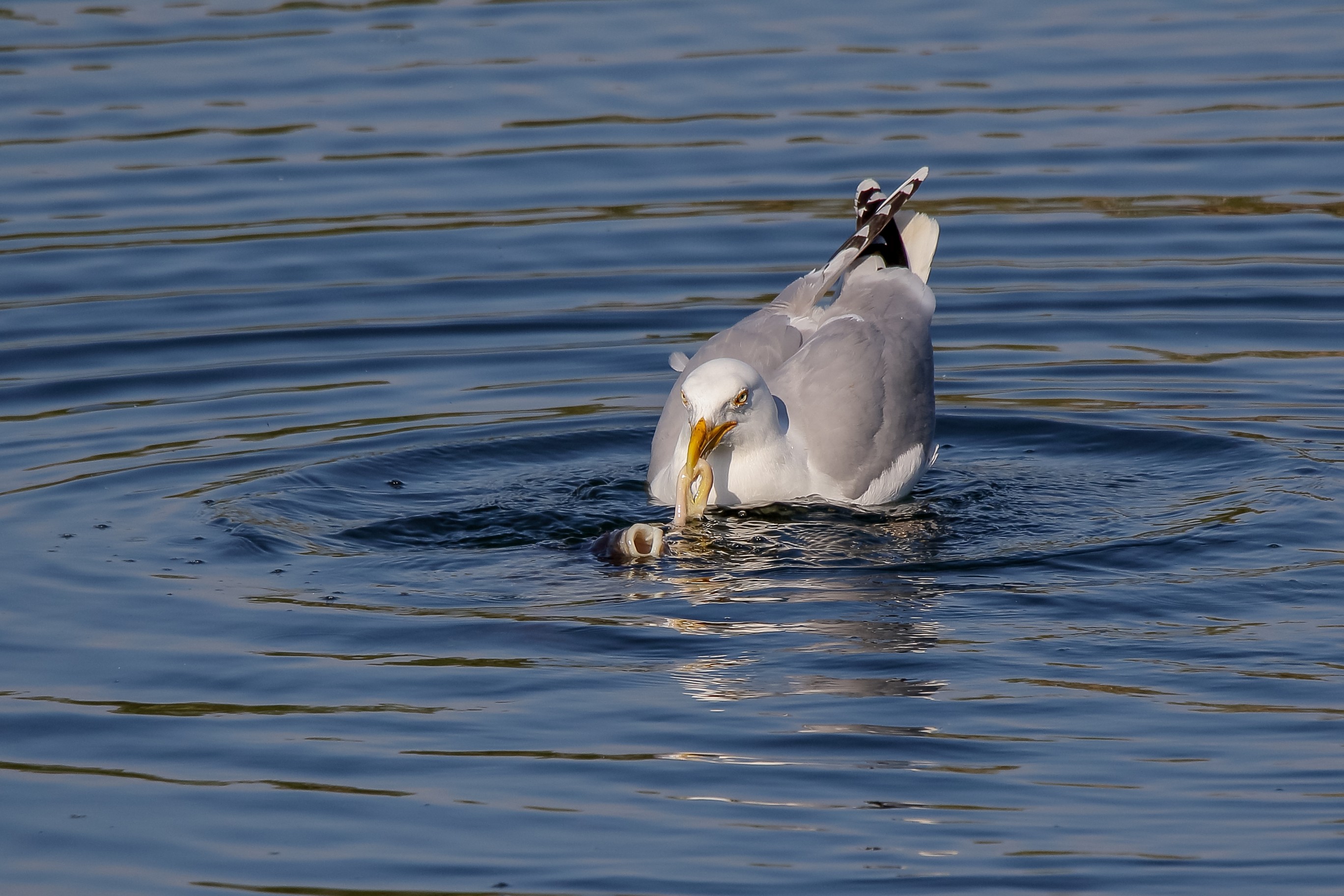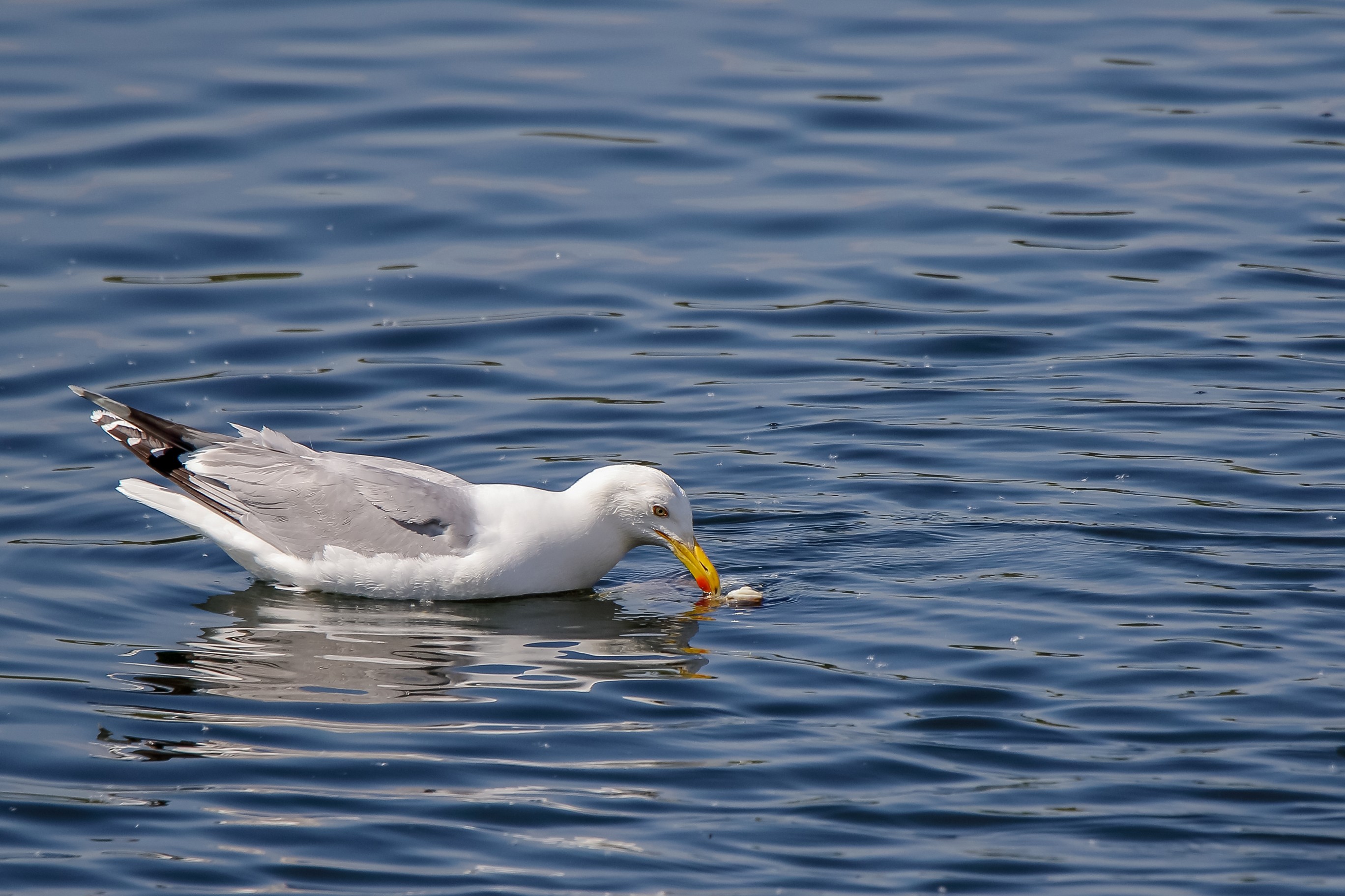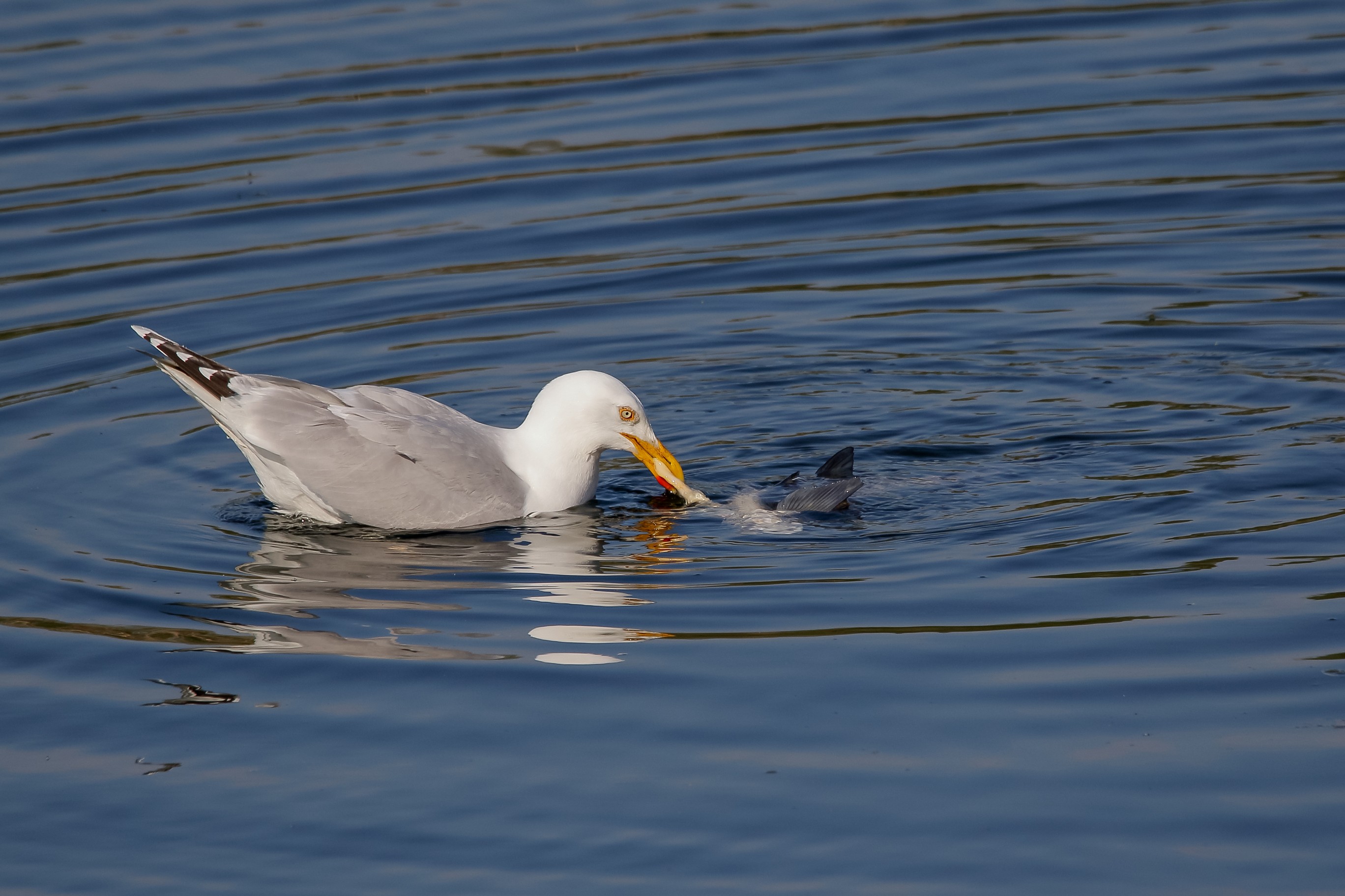Silbermöwe bemüht sich den Fisch zu zerlegen