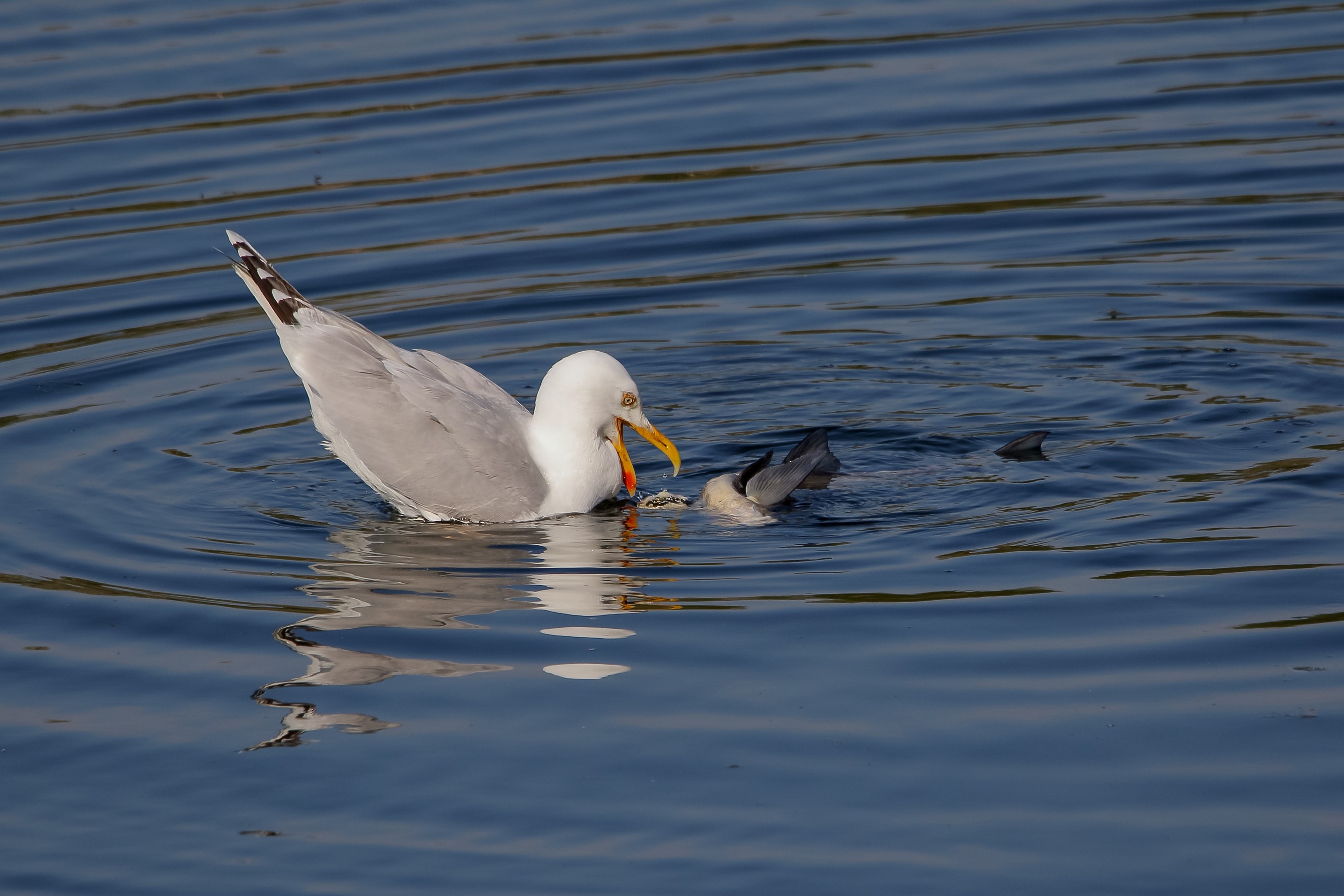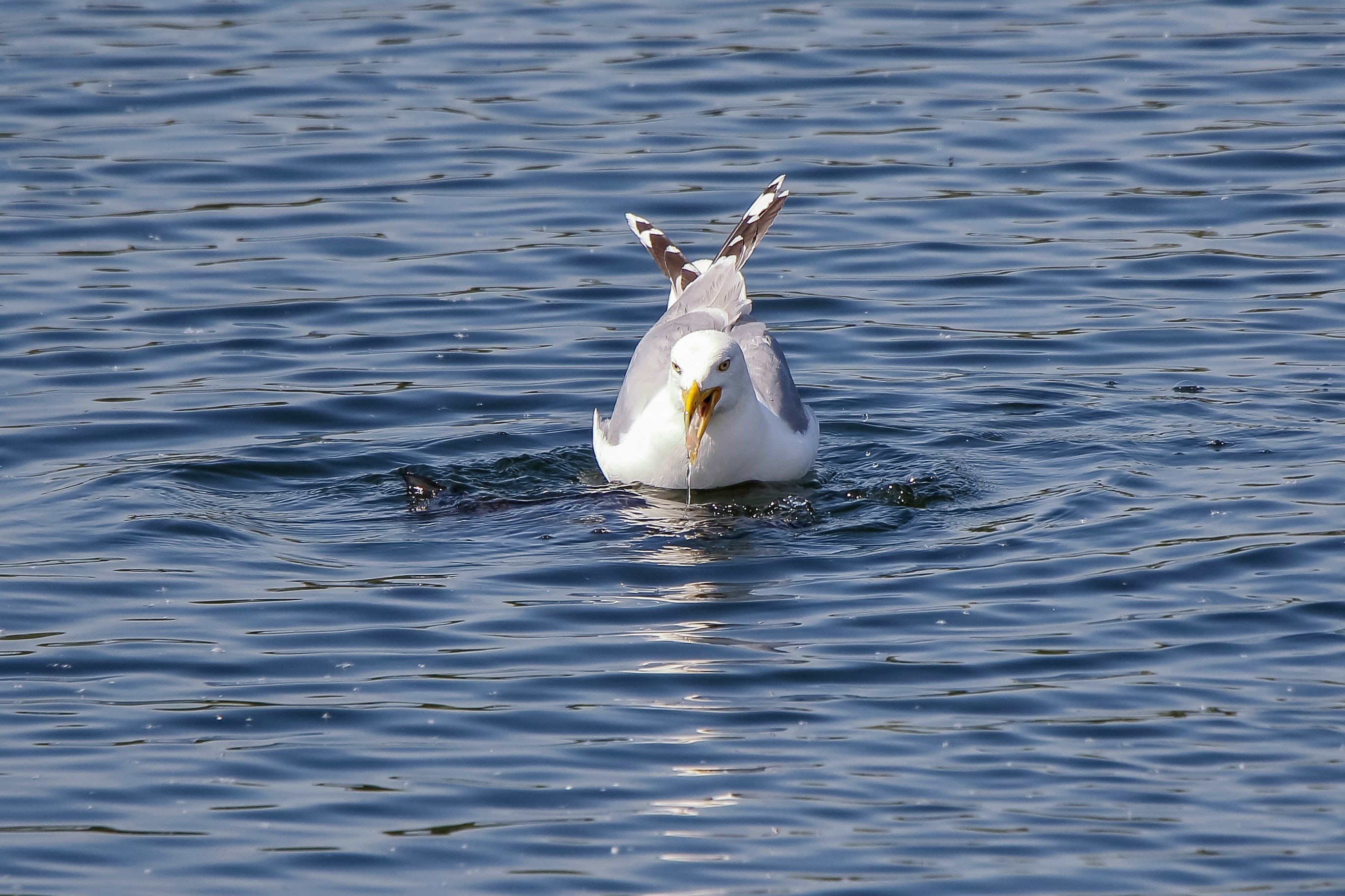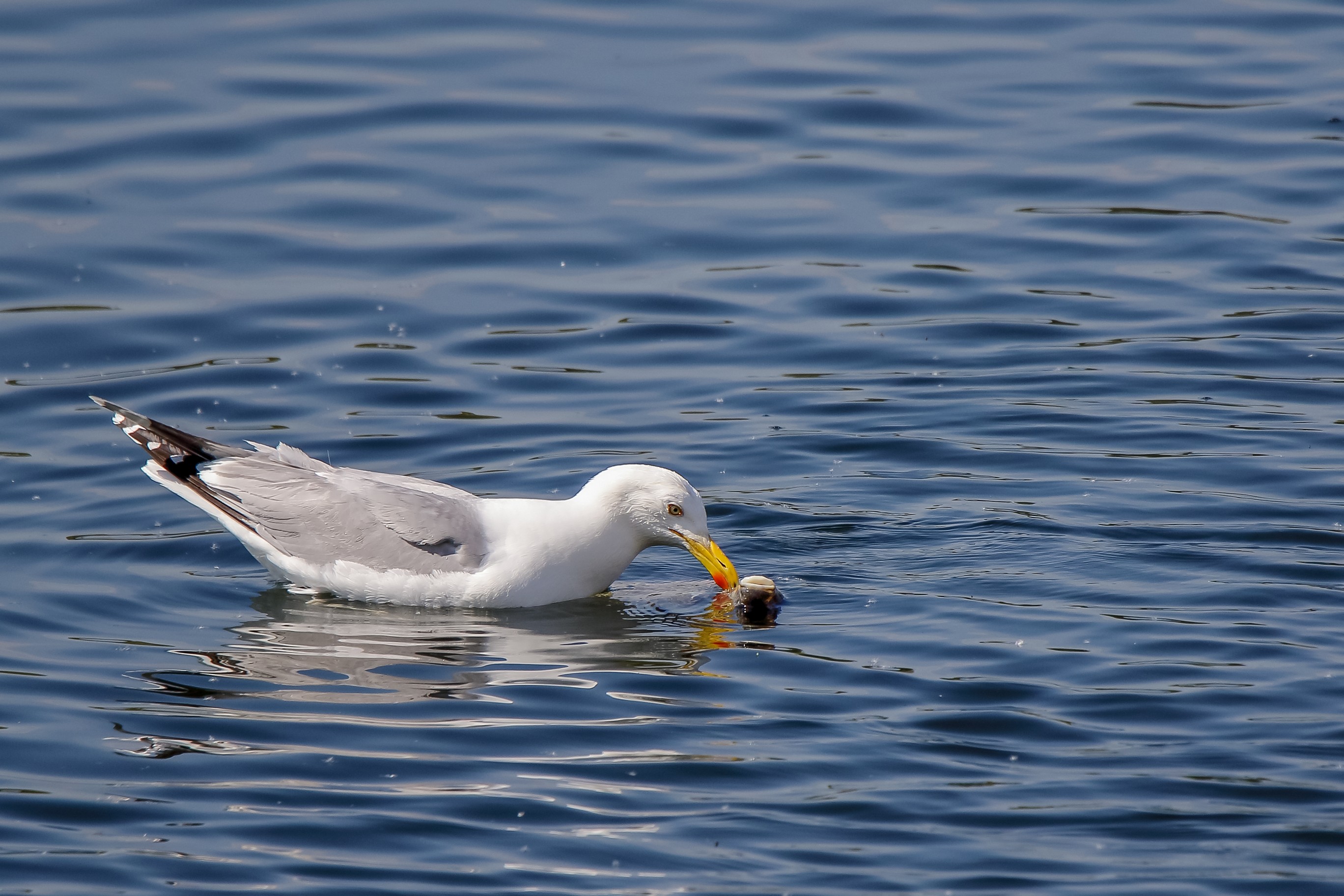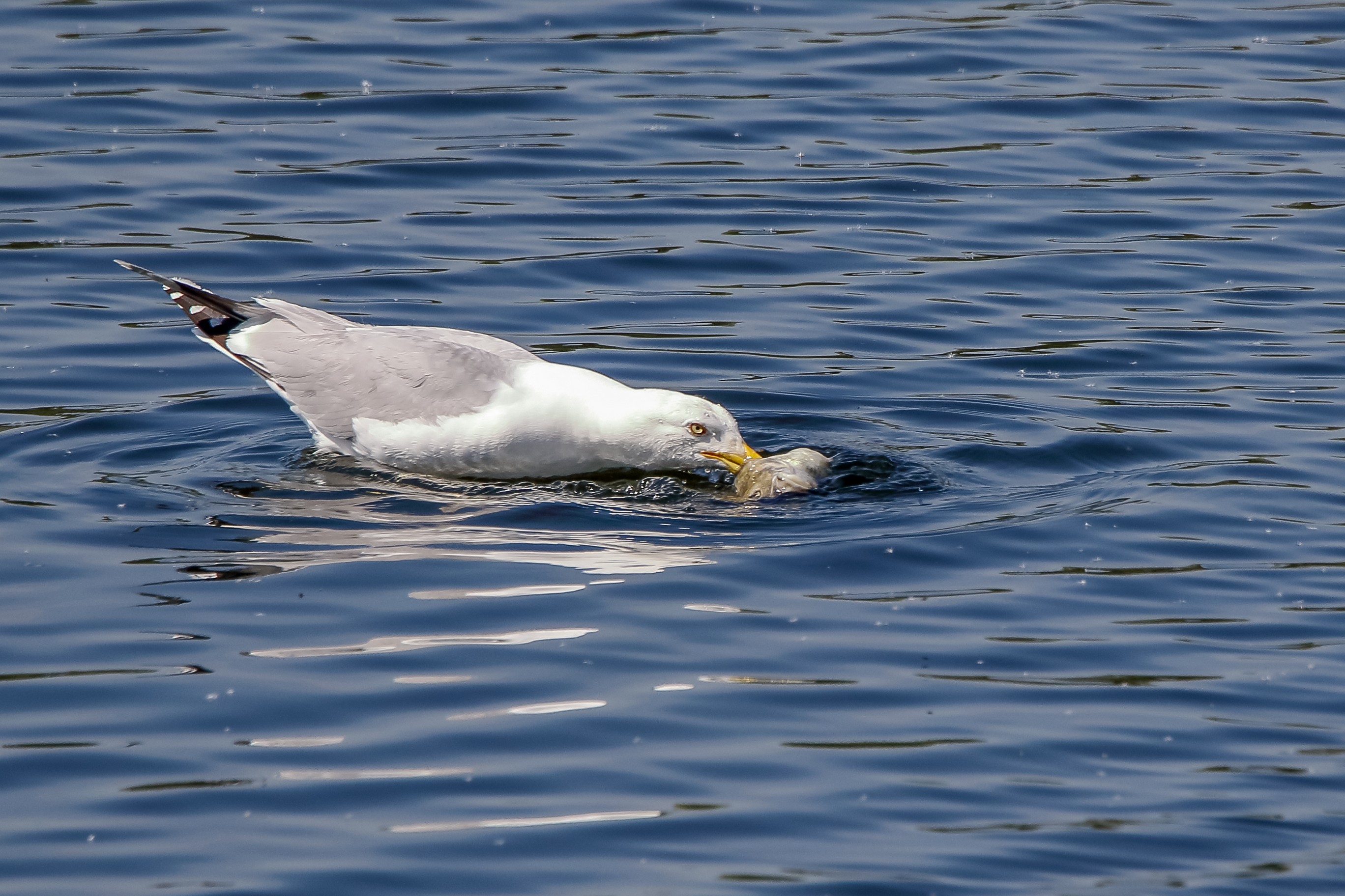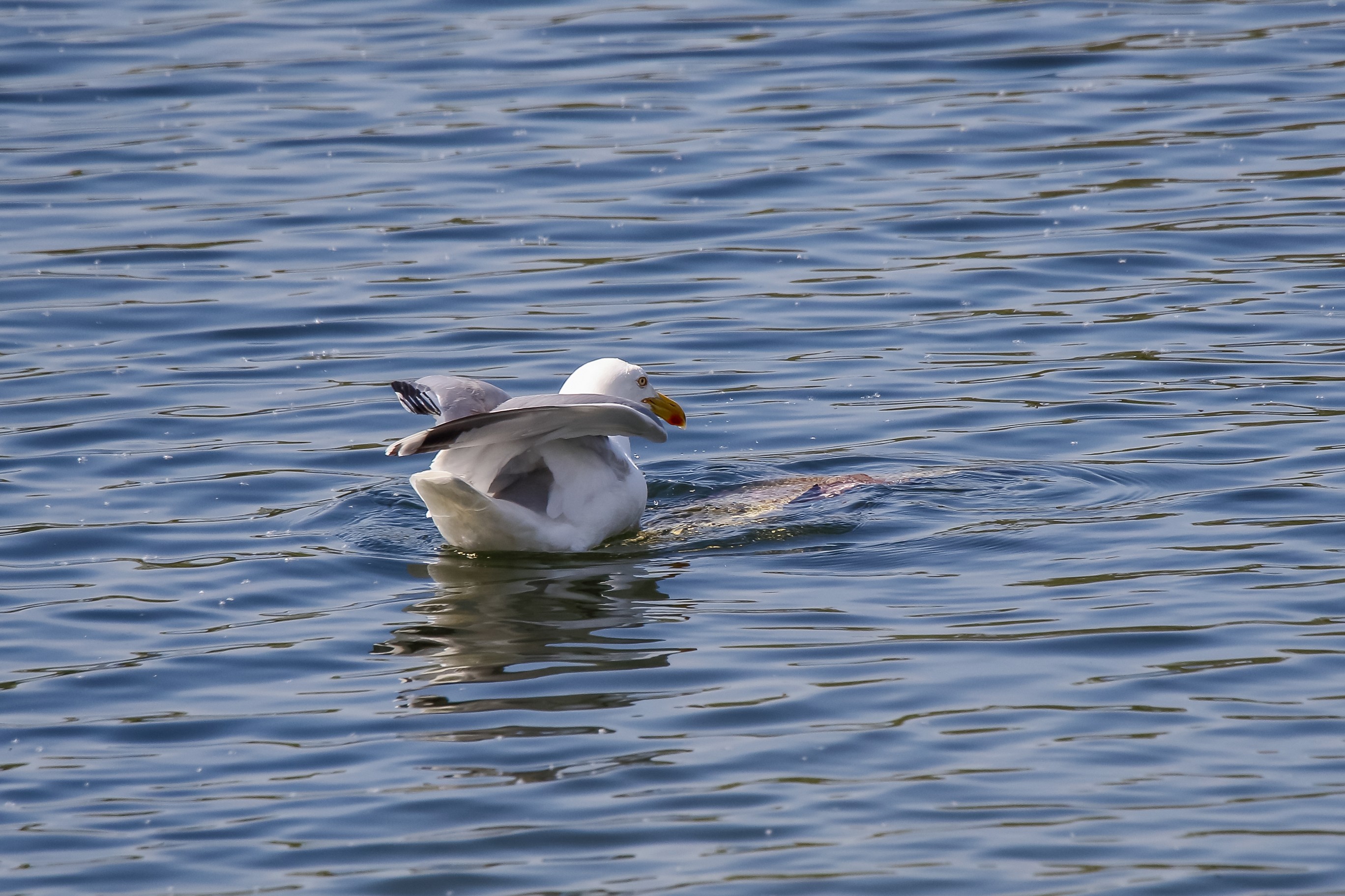 Silbermöwe bemüht sich den Fisch zu zerlegen