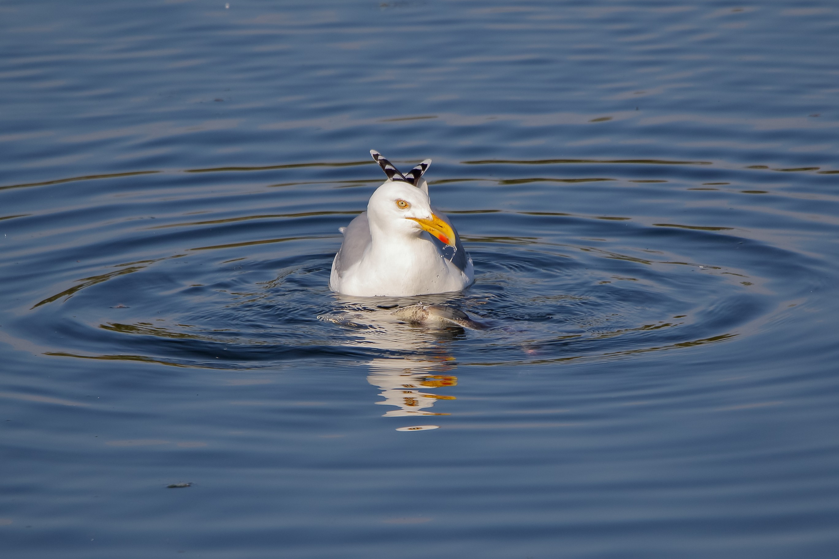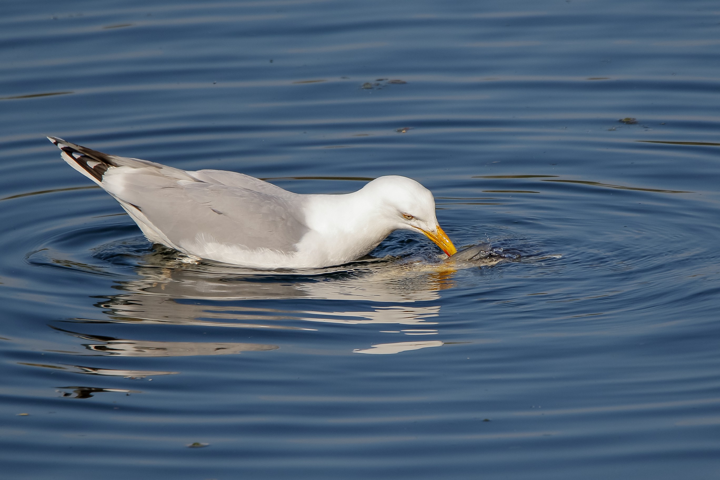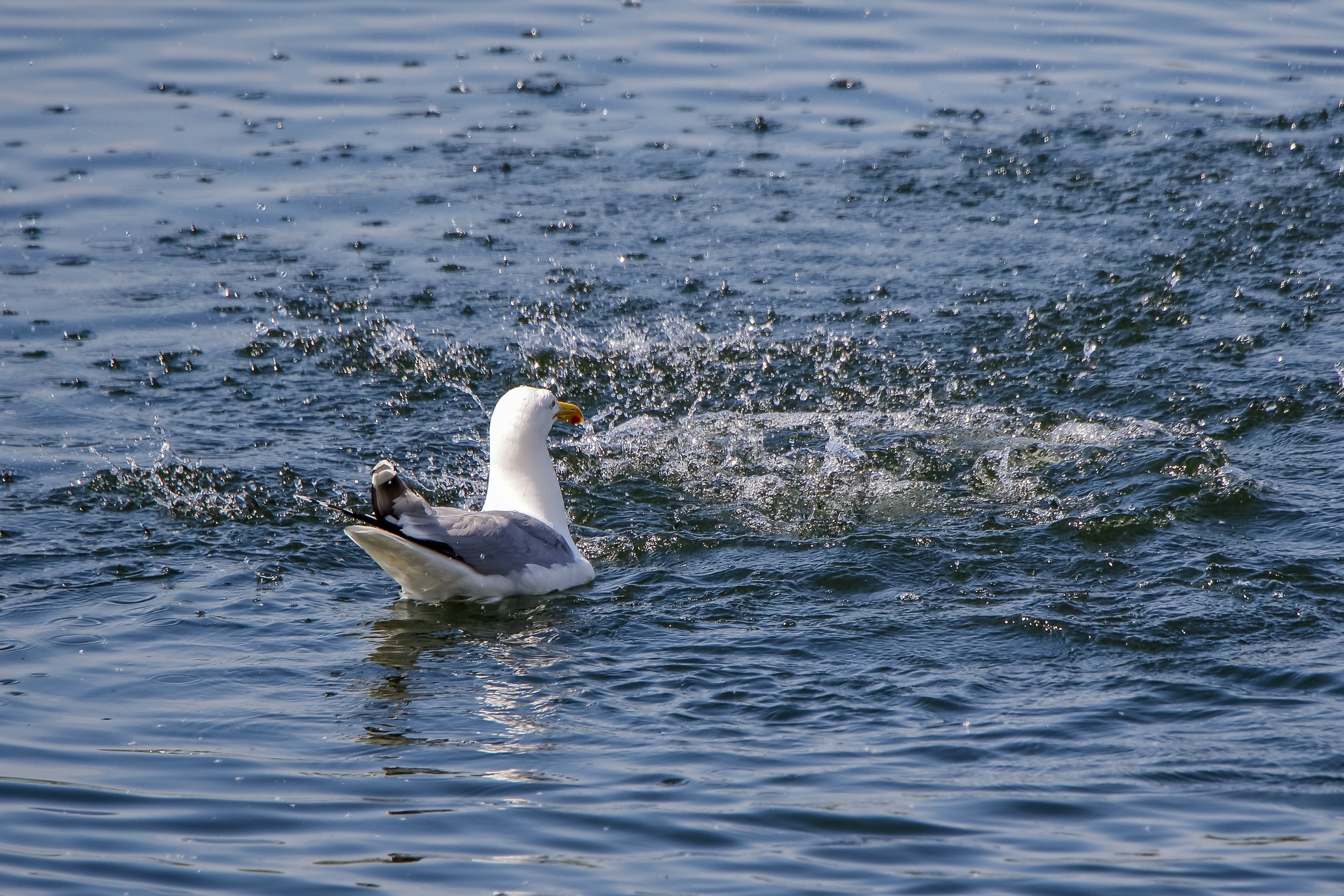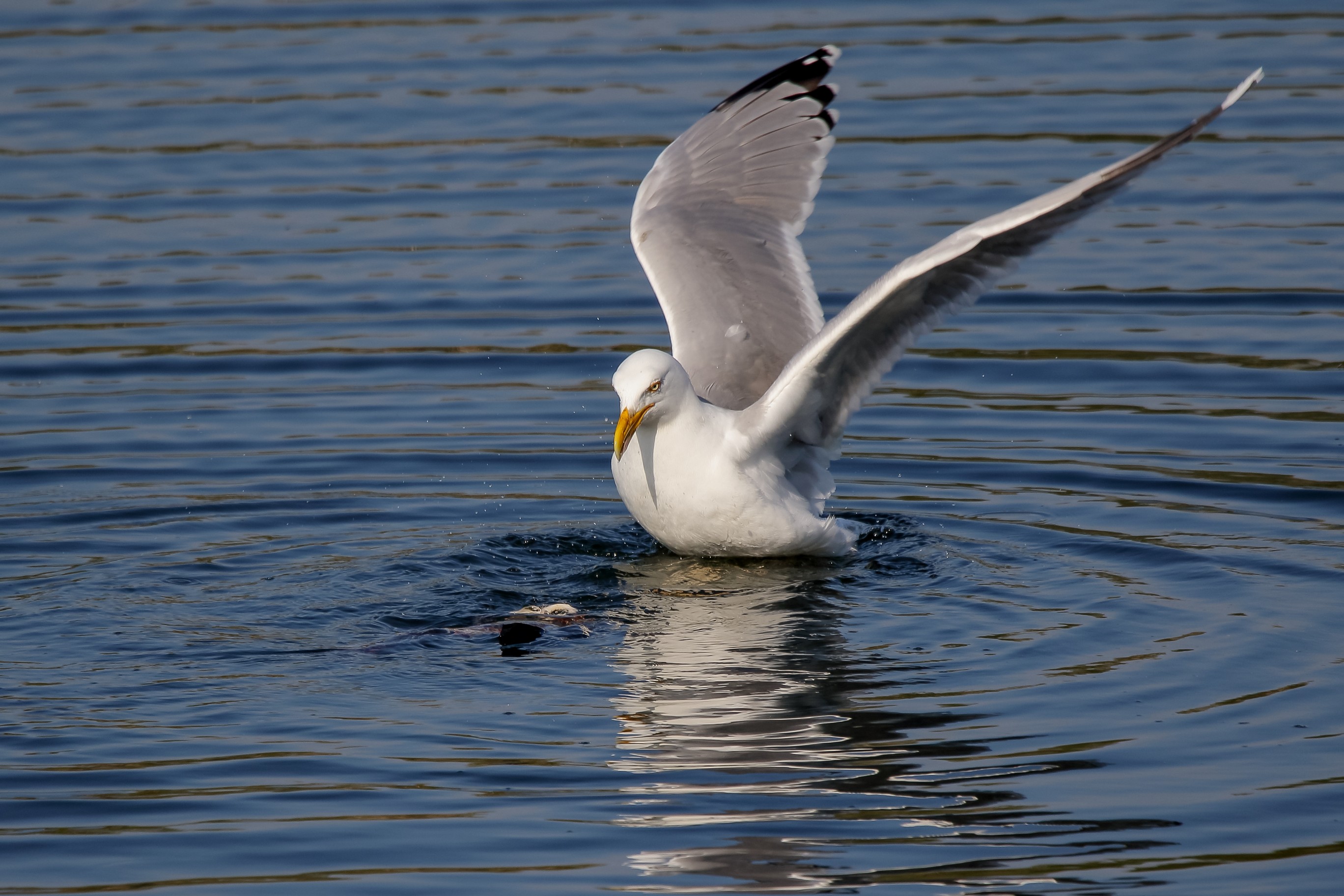 Silbermöwe bemüht sich den Fisch zu zerlegen