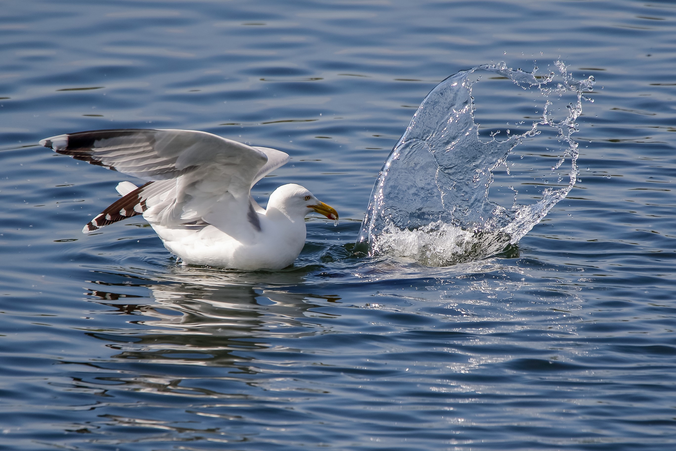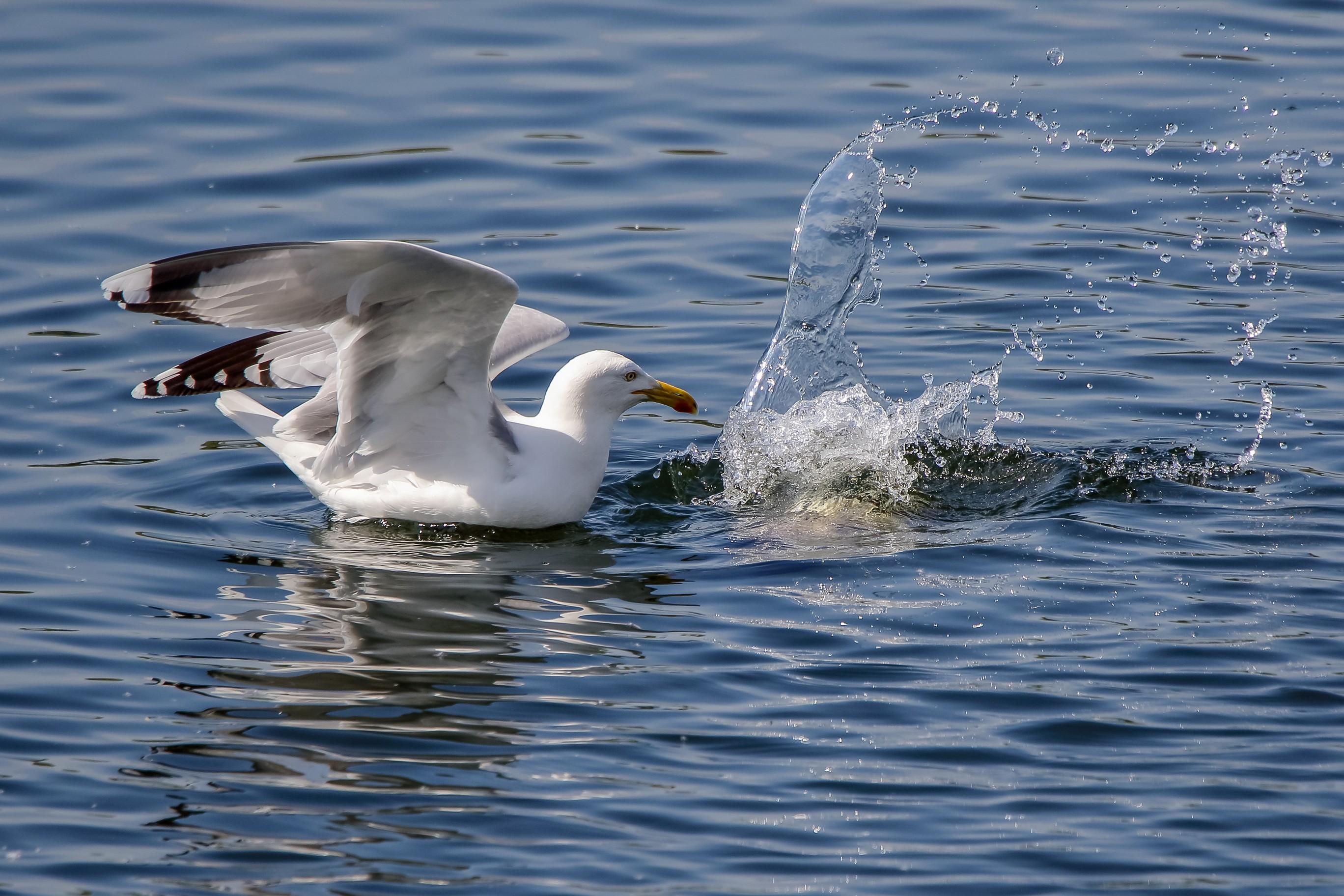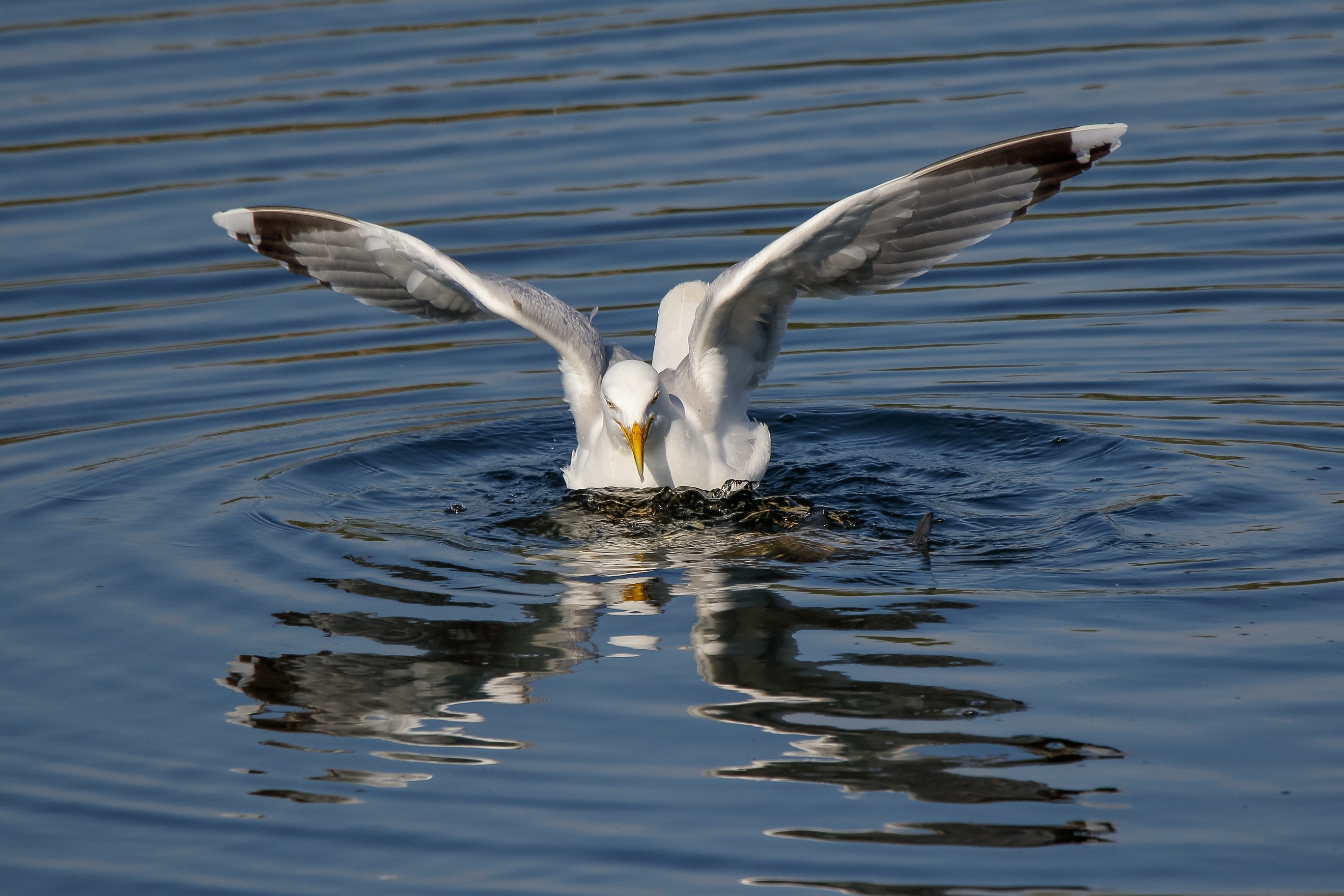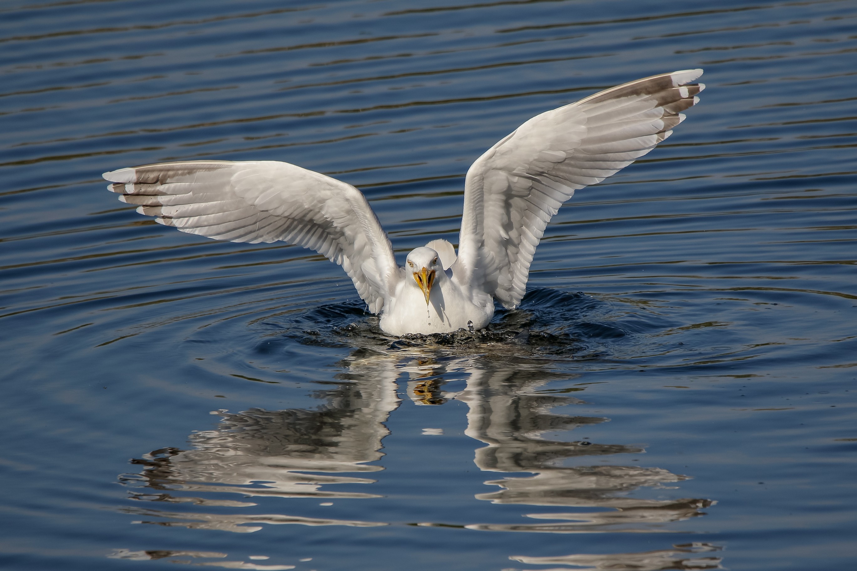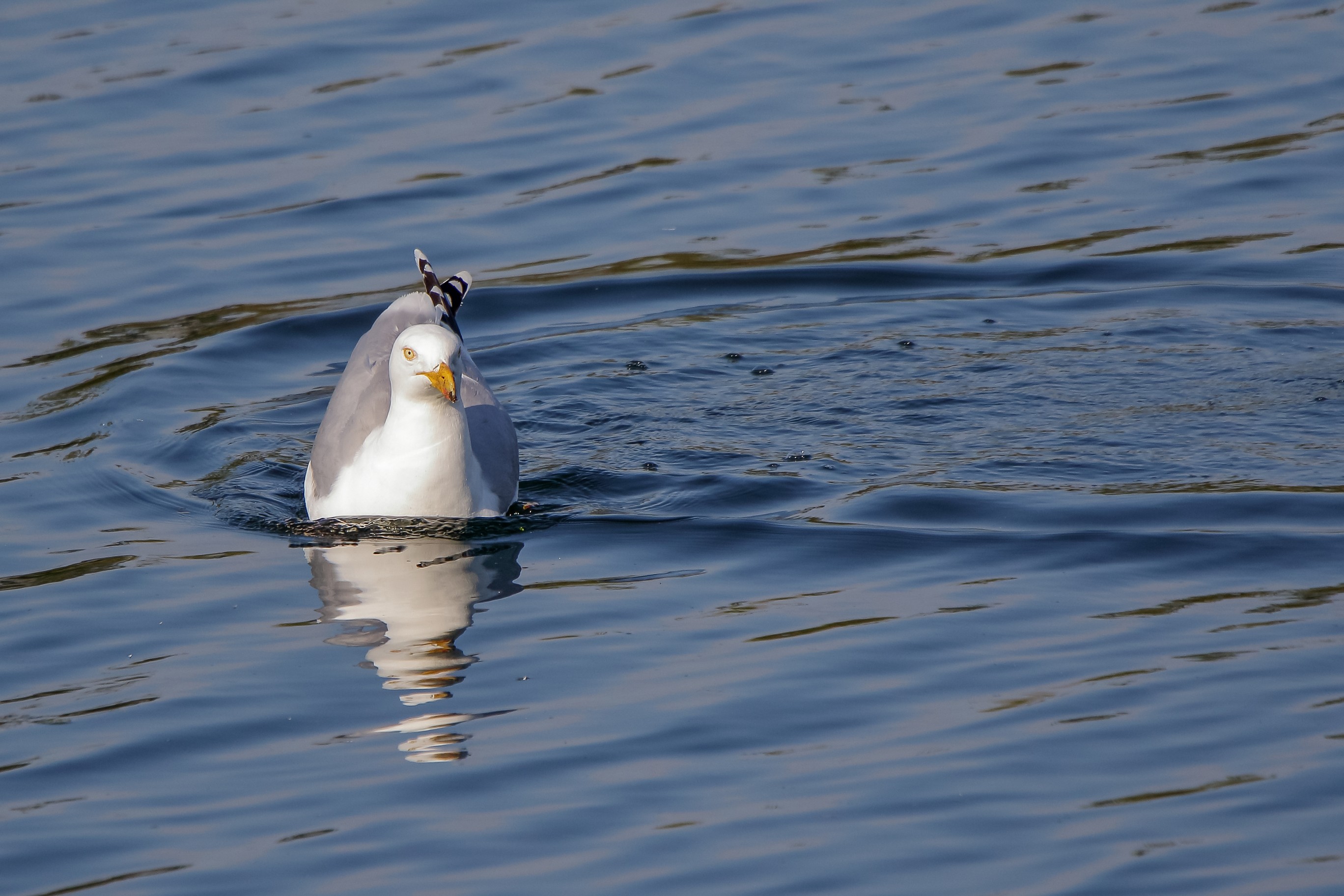 Silbermöwe bemüht sich den Fisch zu zerlegen