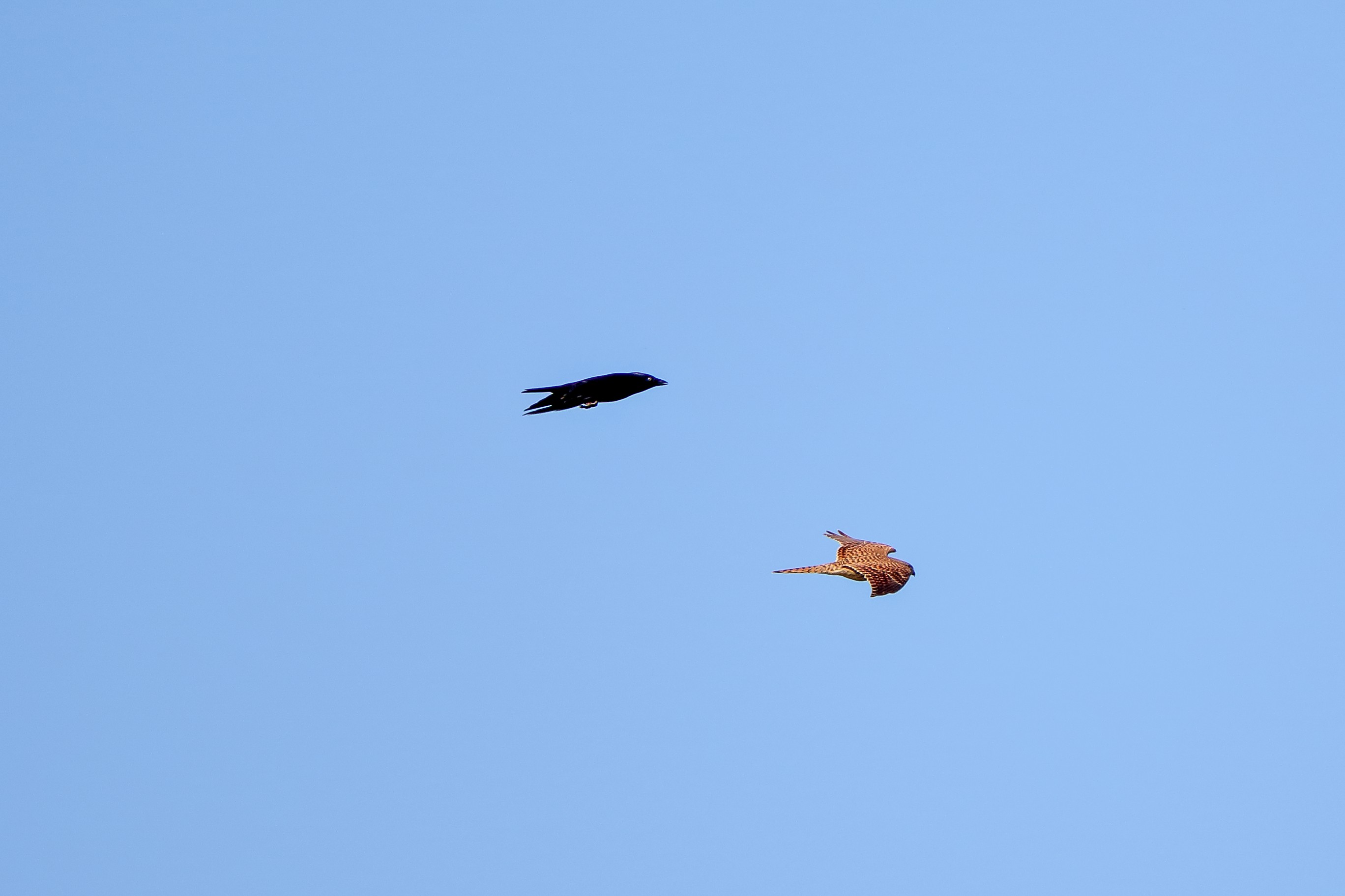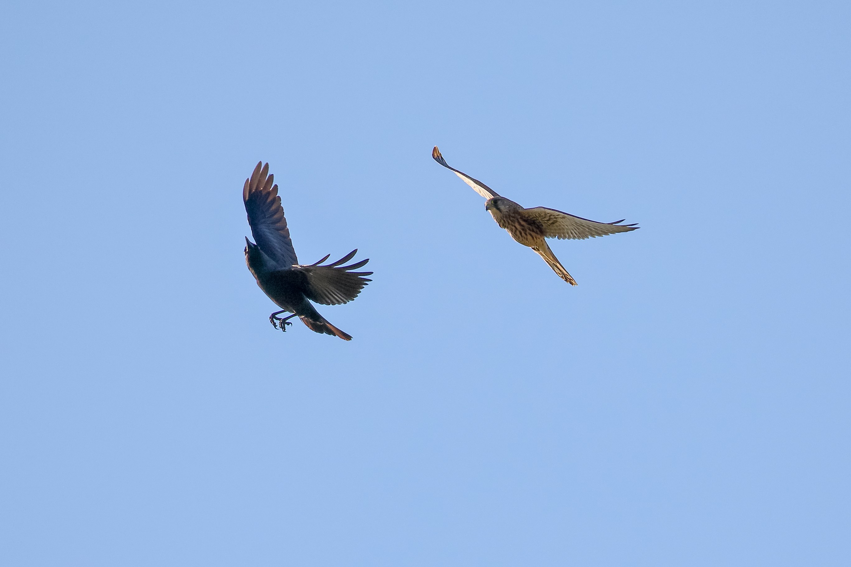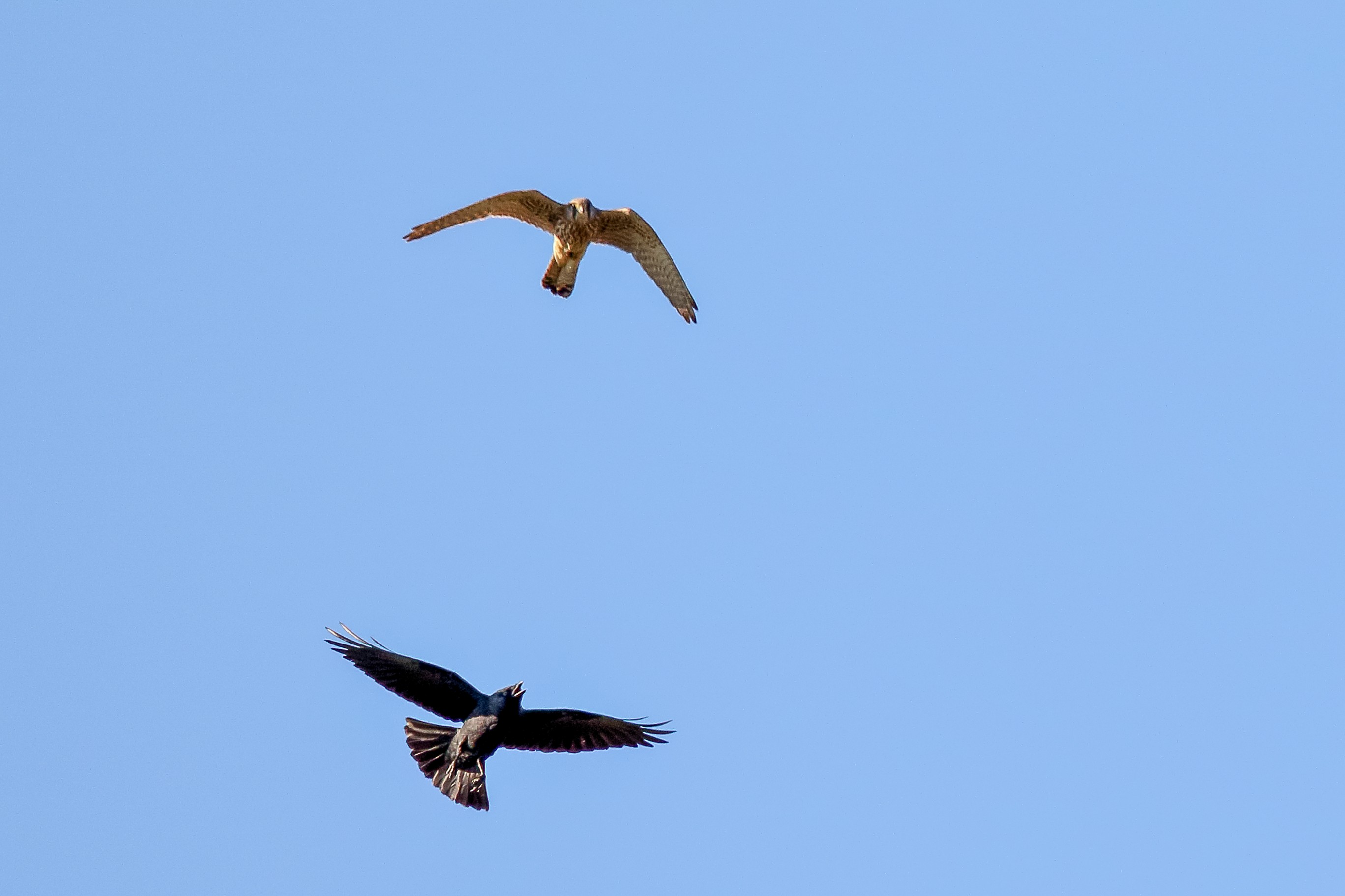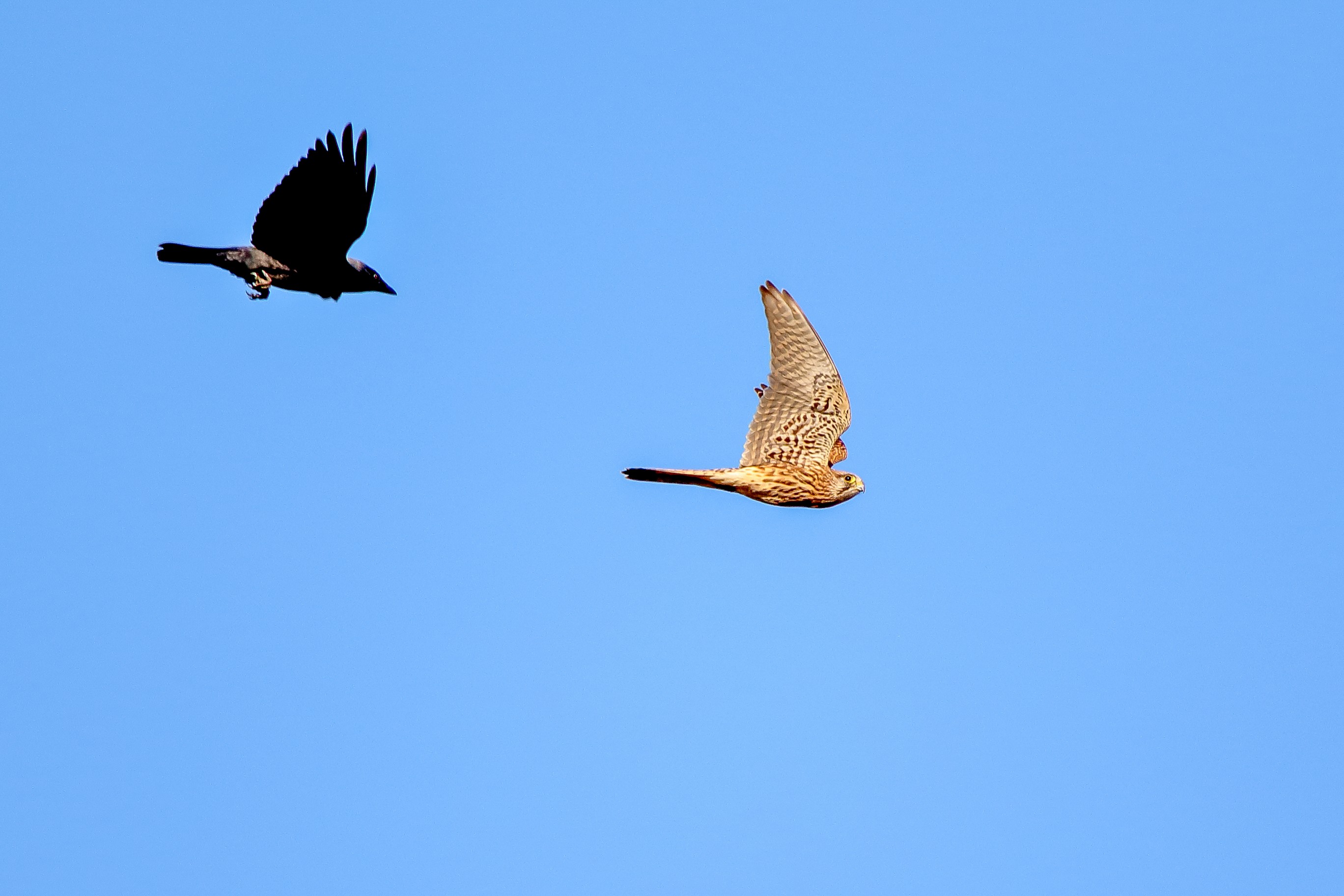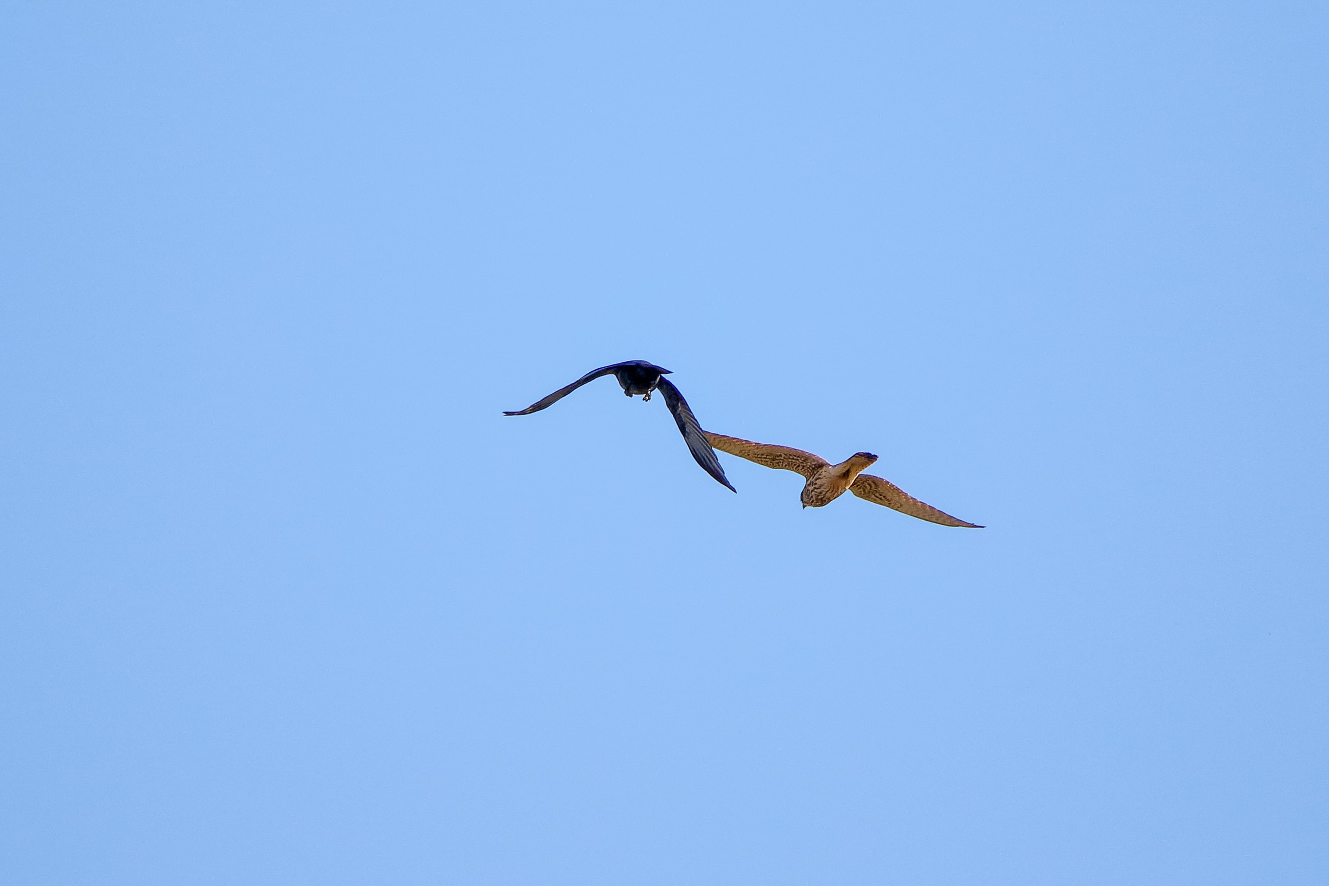 Kleiner Luftkampf zwischen Krähe und Turmfalke