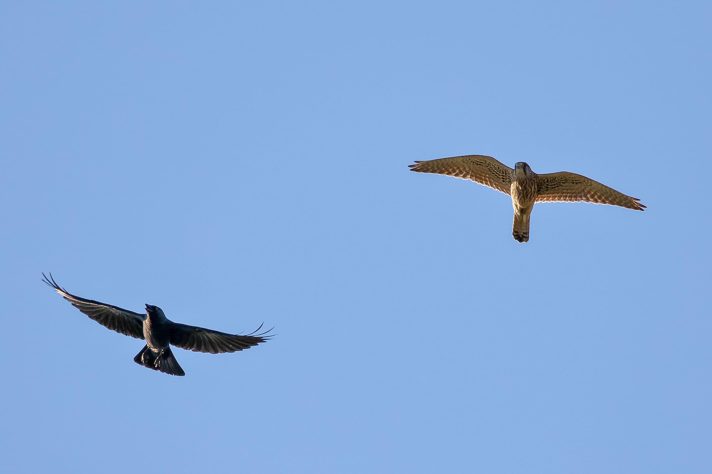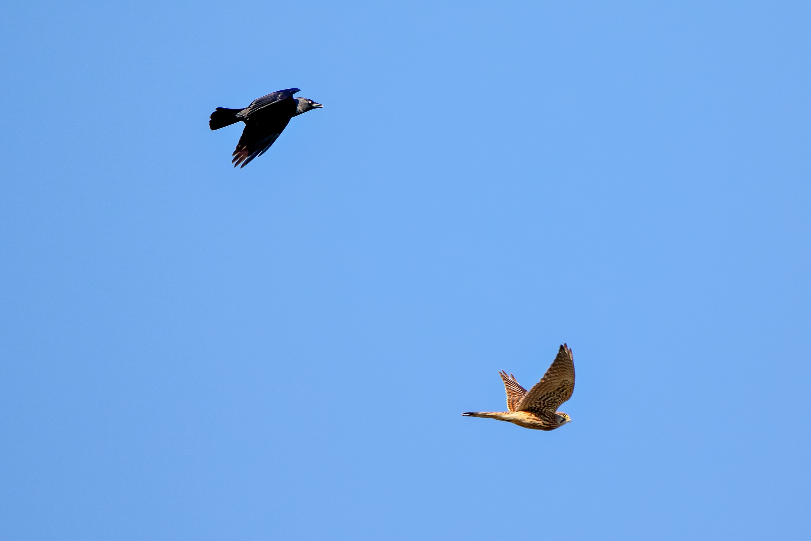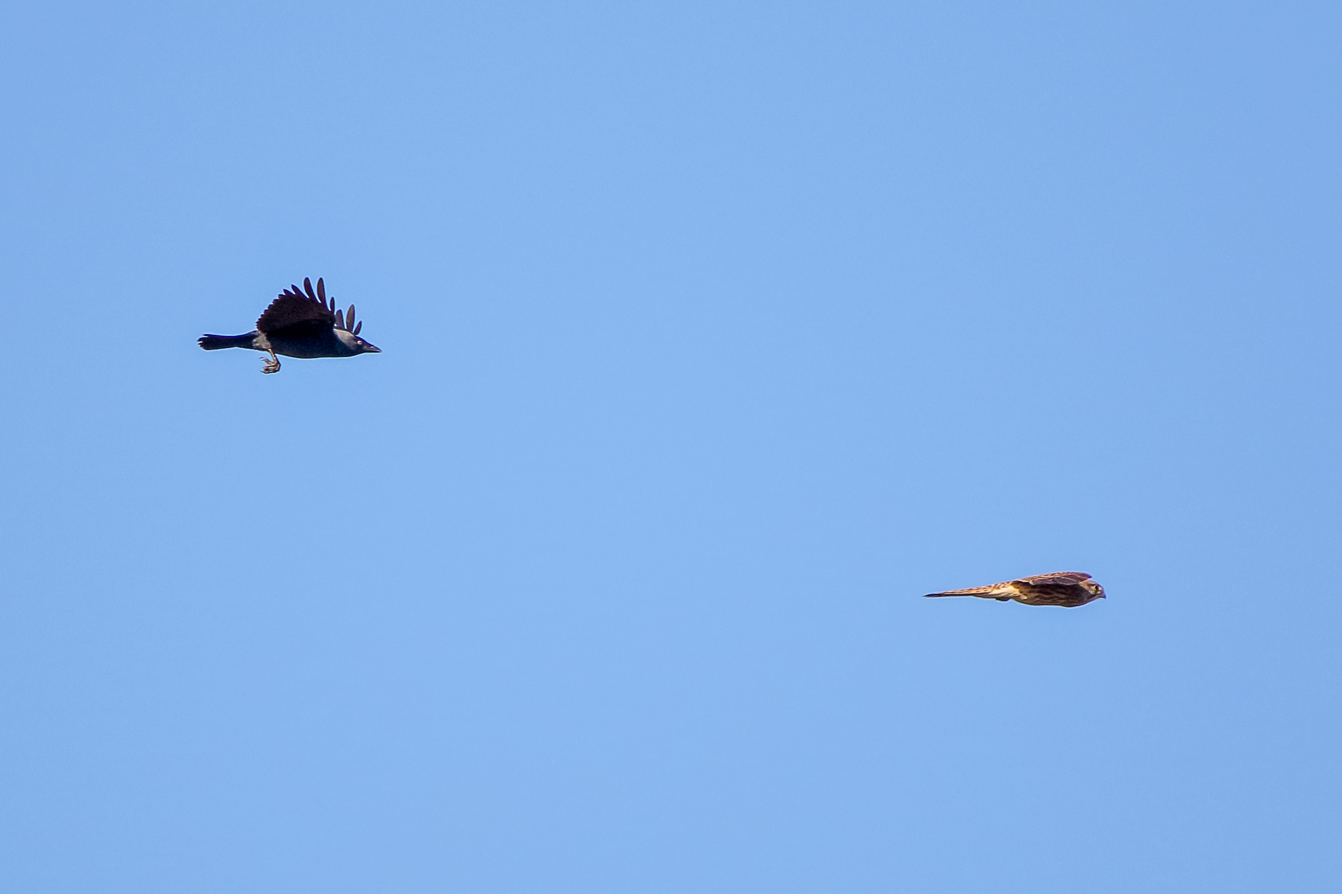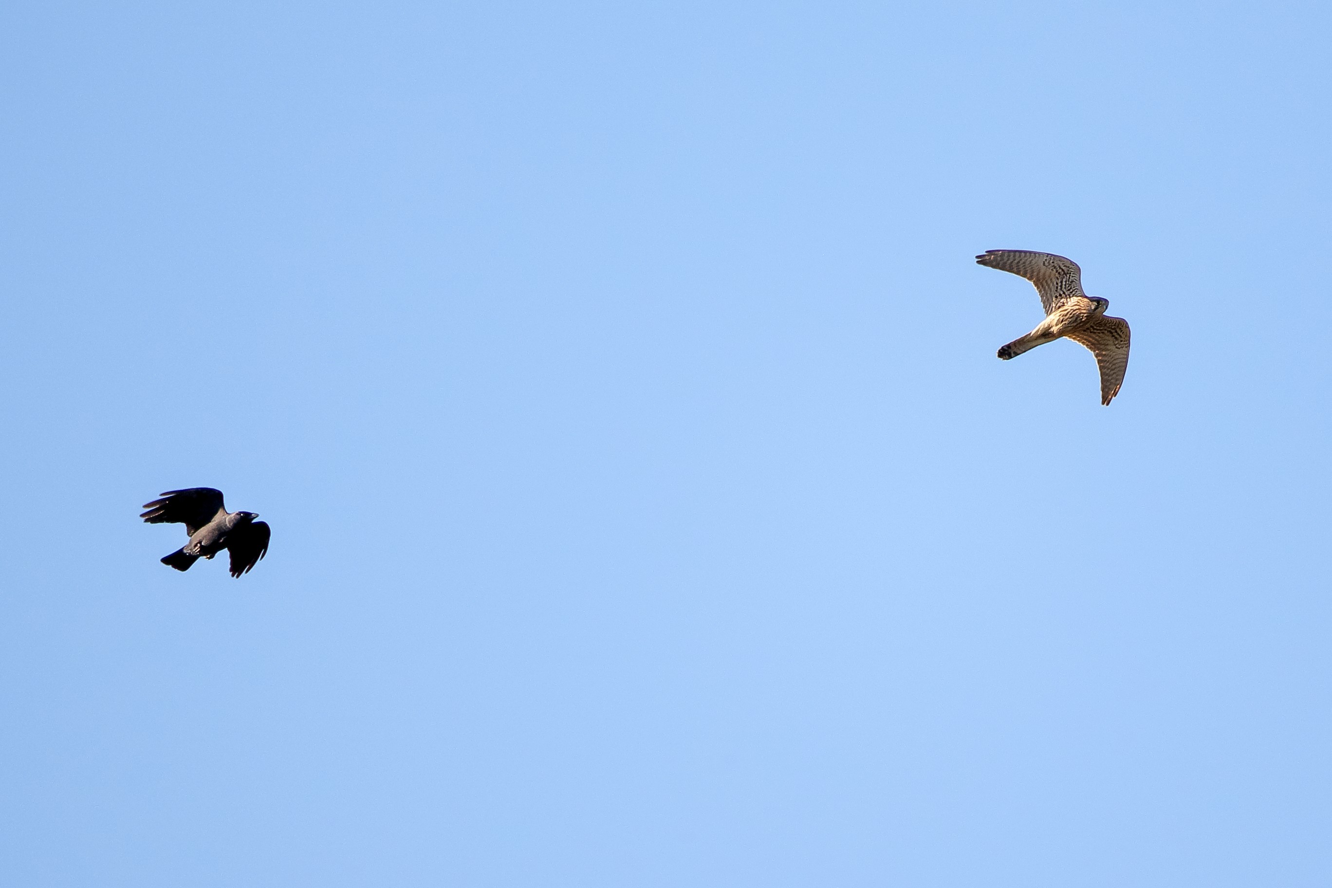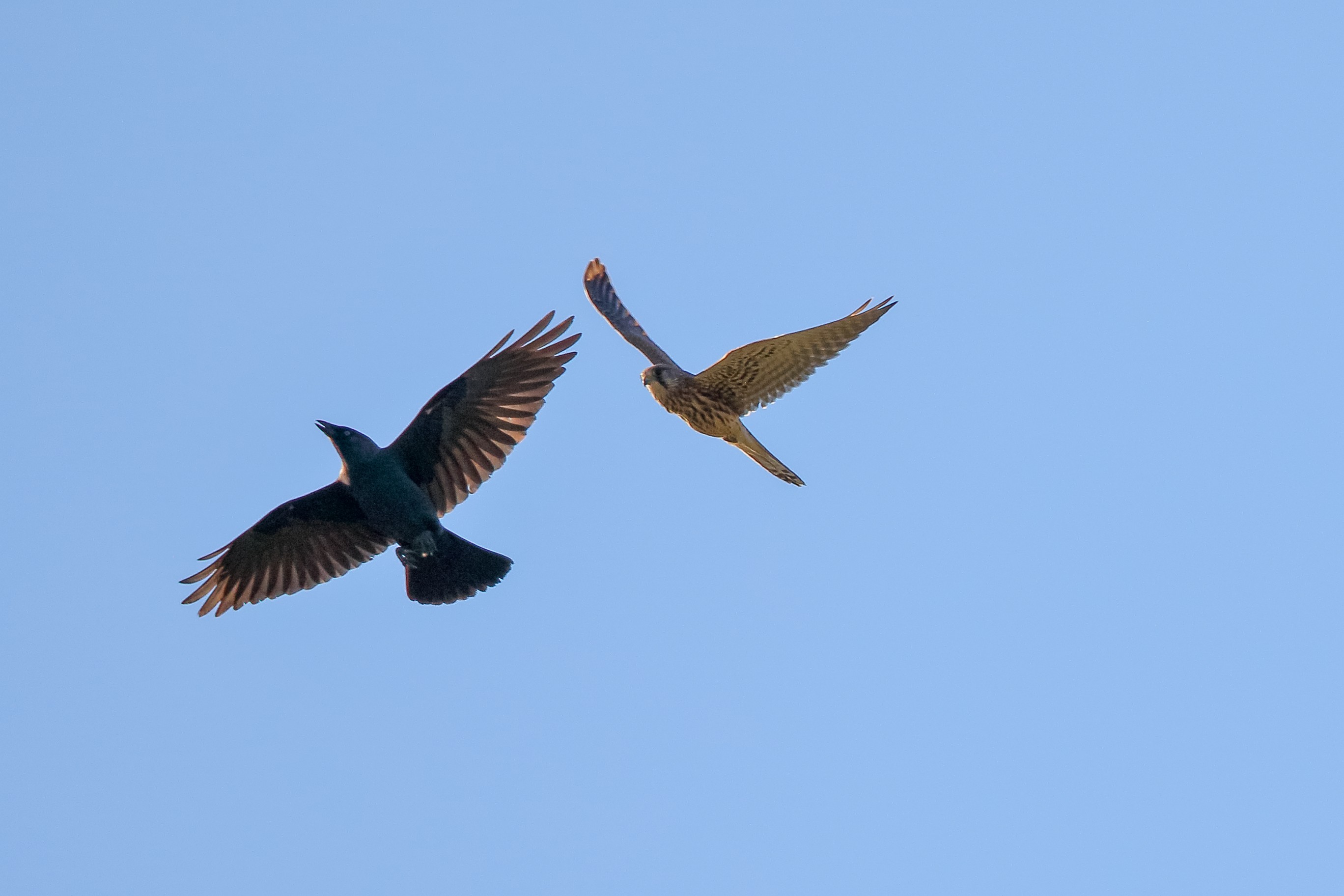 Kleiner Luftkampf zwischen Krähe und Turmfalke