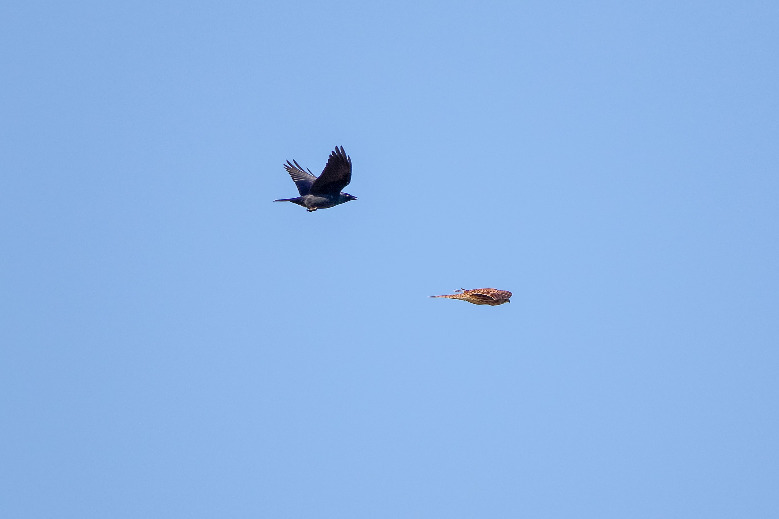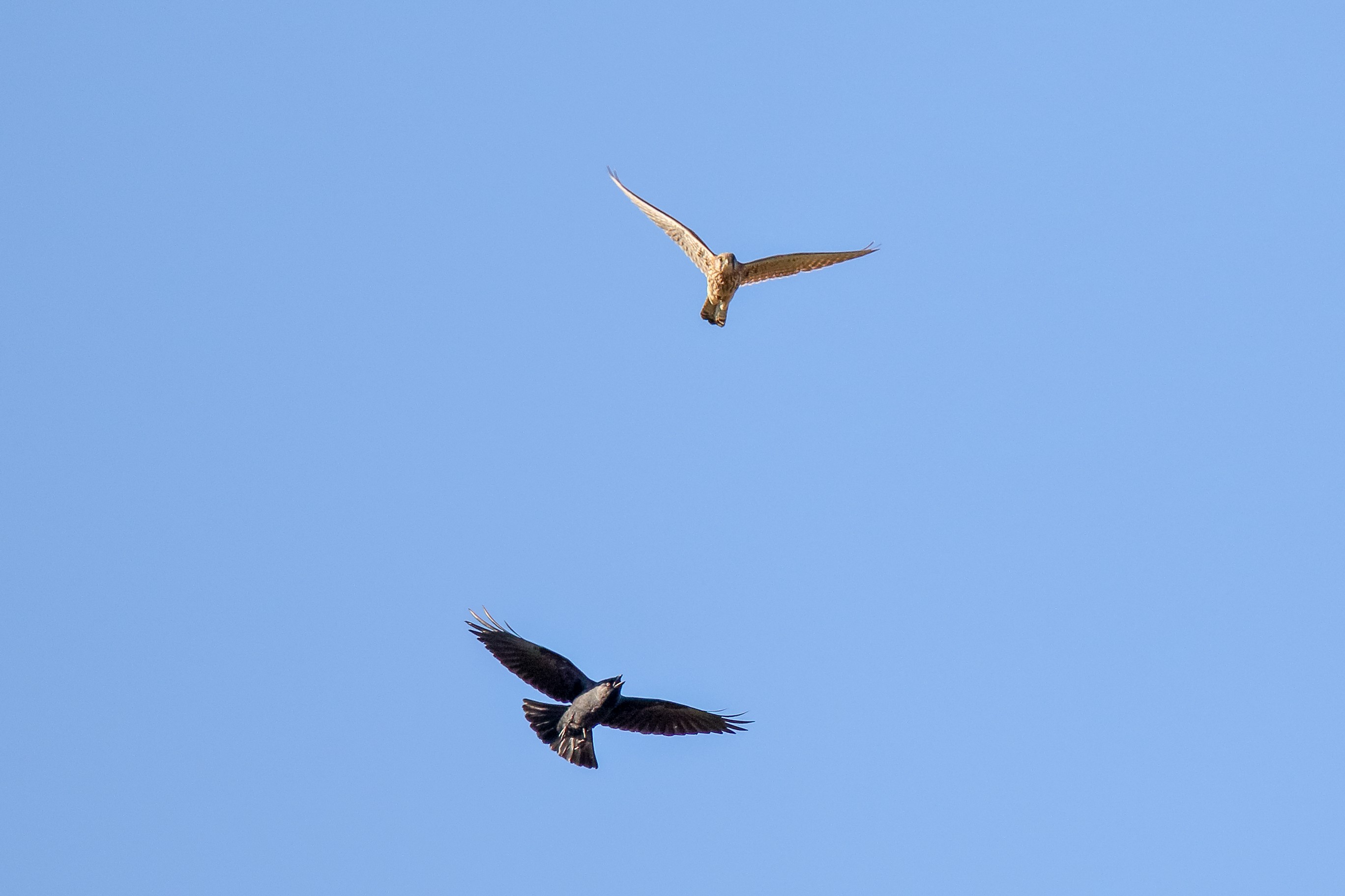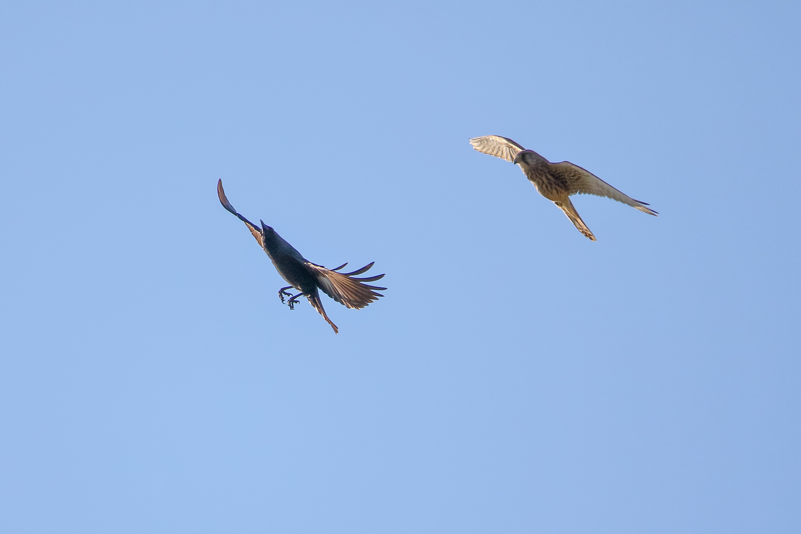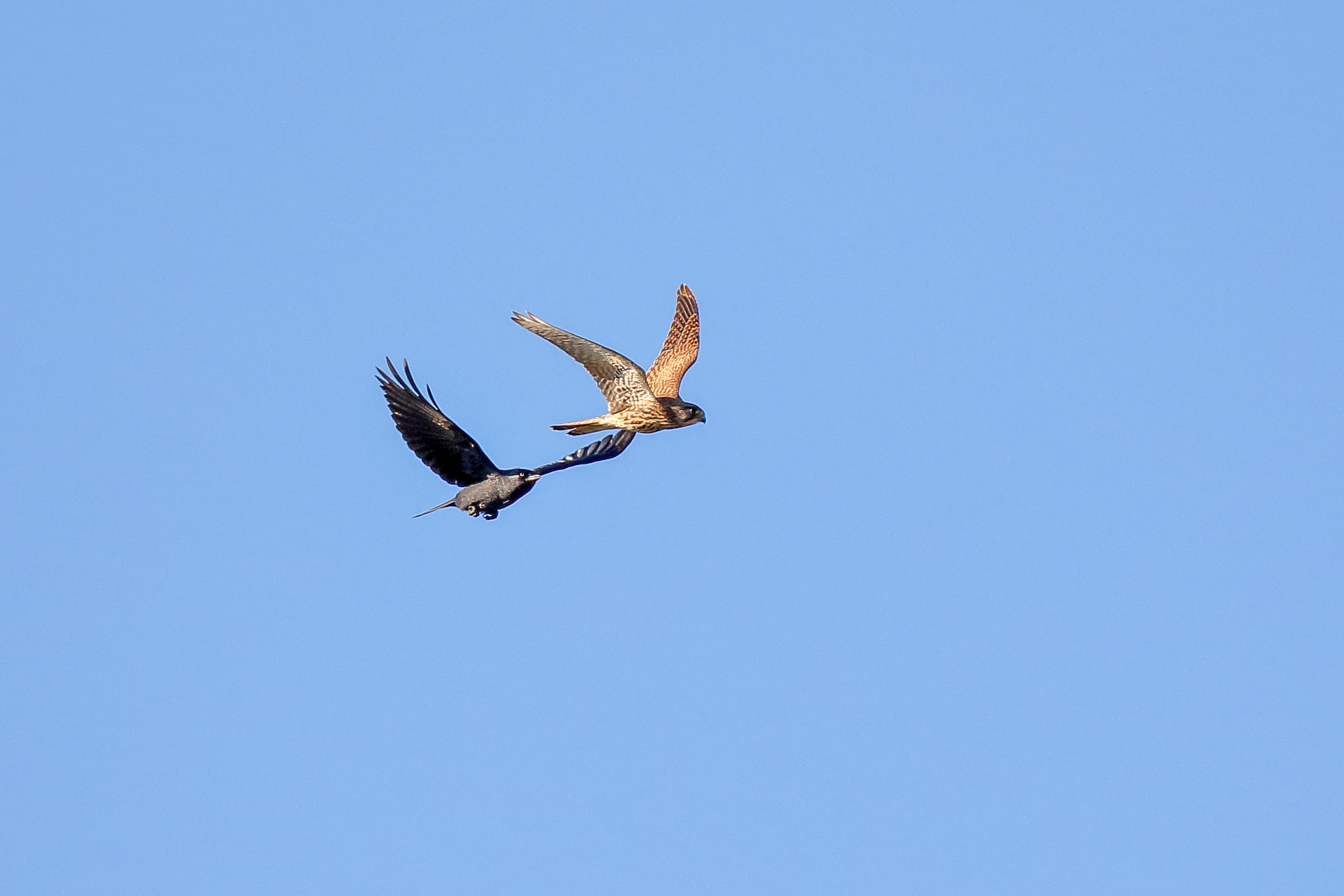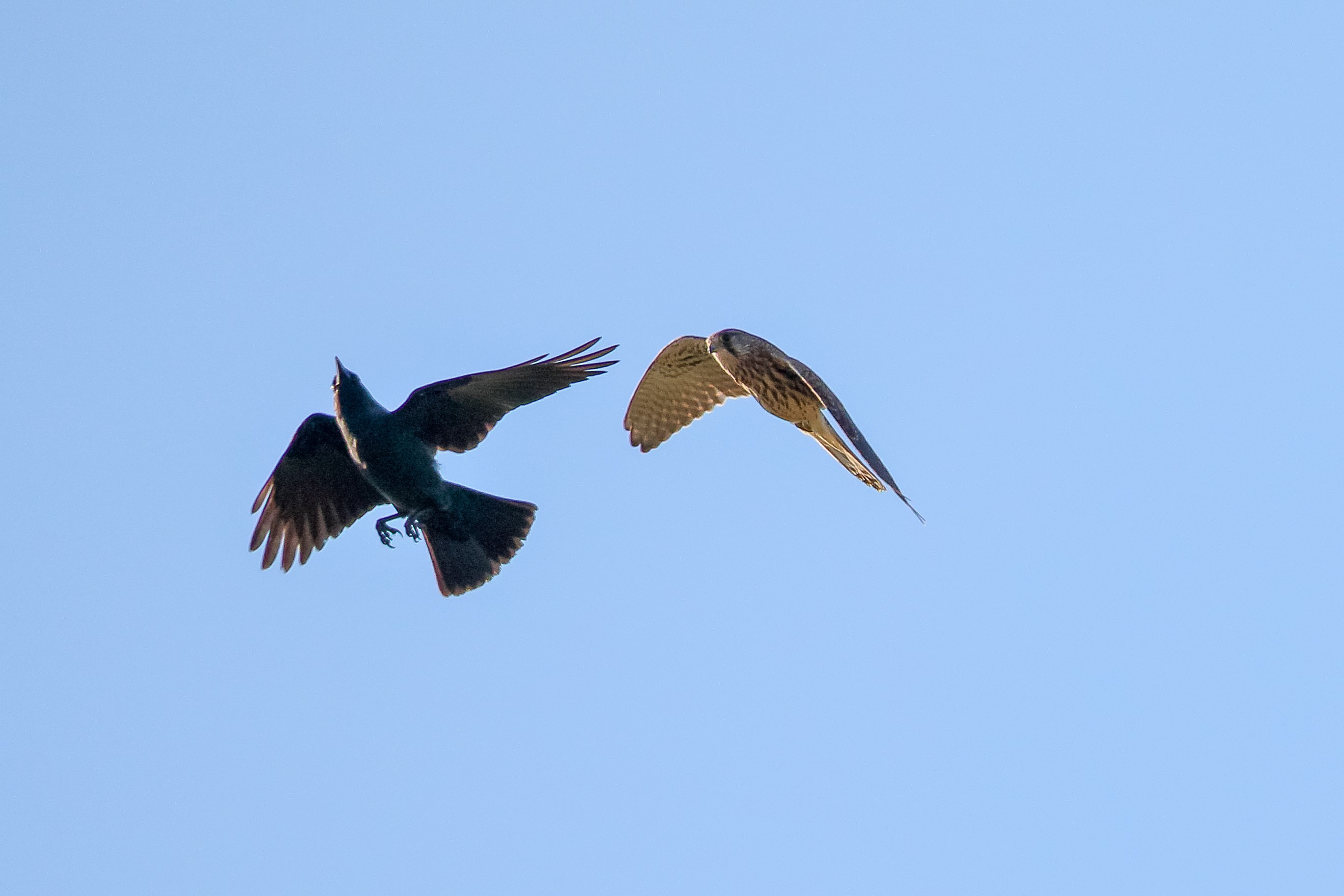 Kleiner Luftkampf zwischen Krähe und Turmfalke