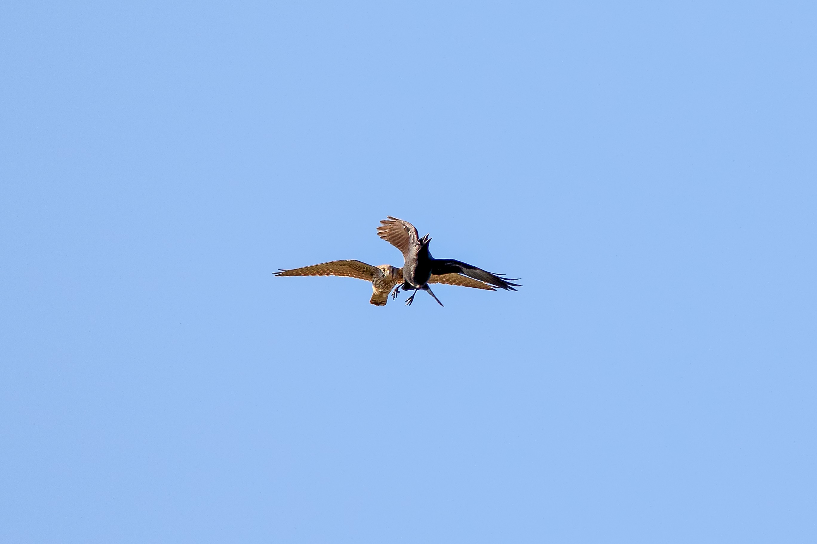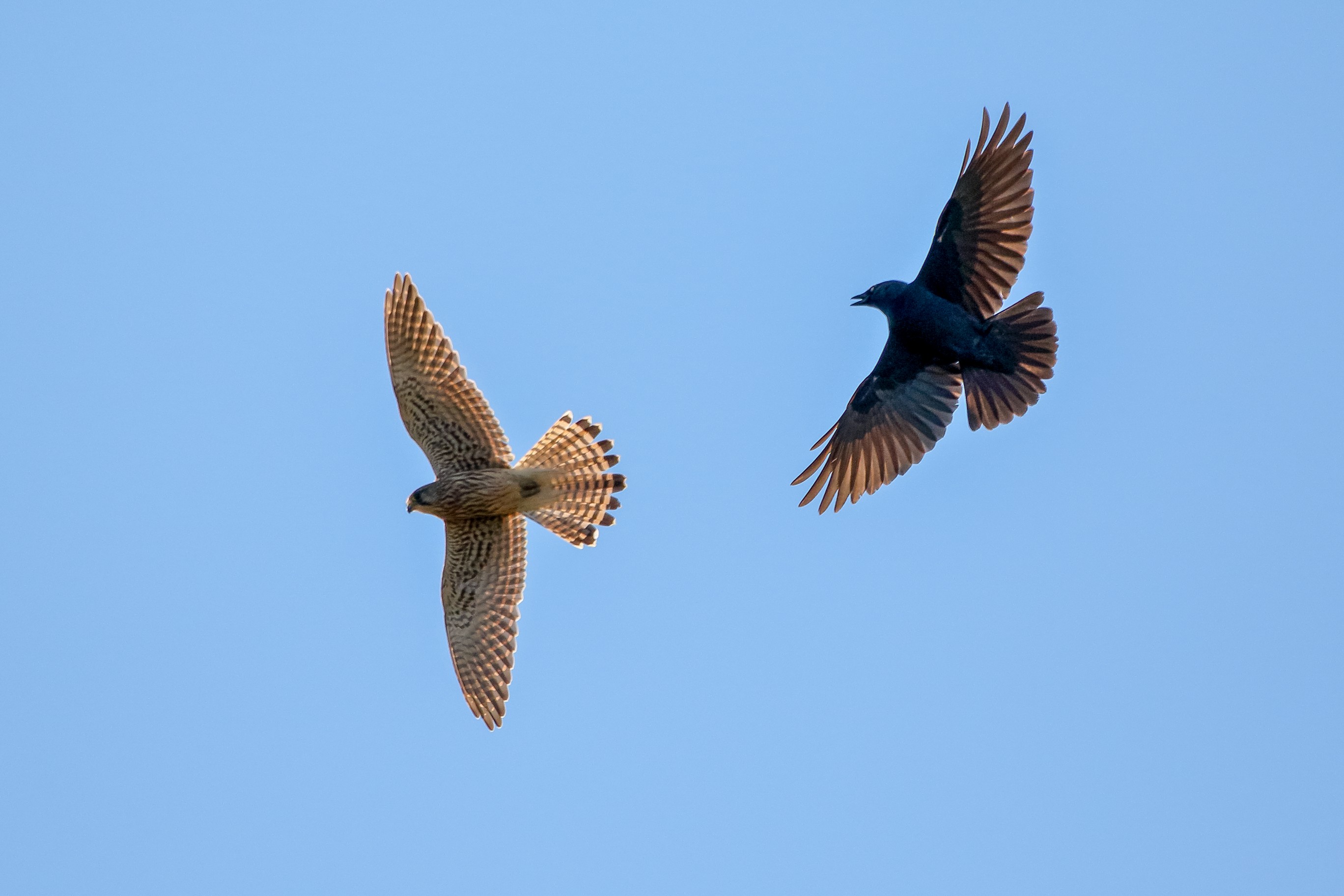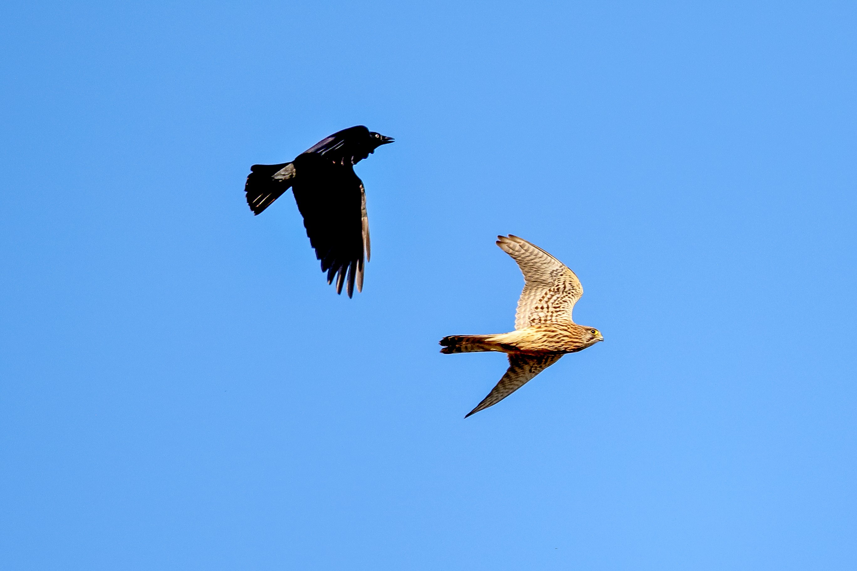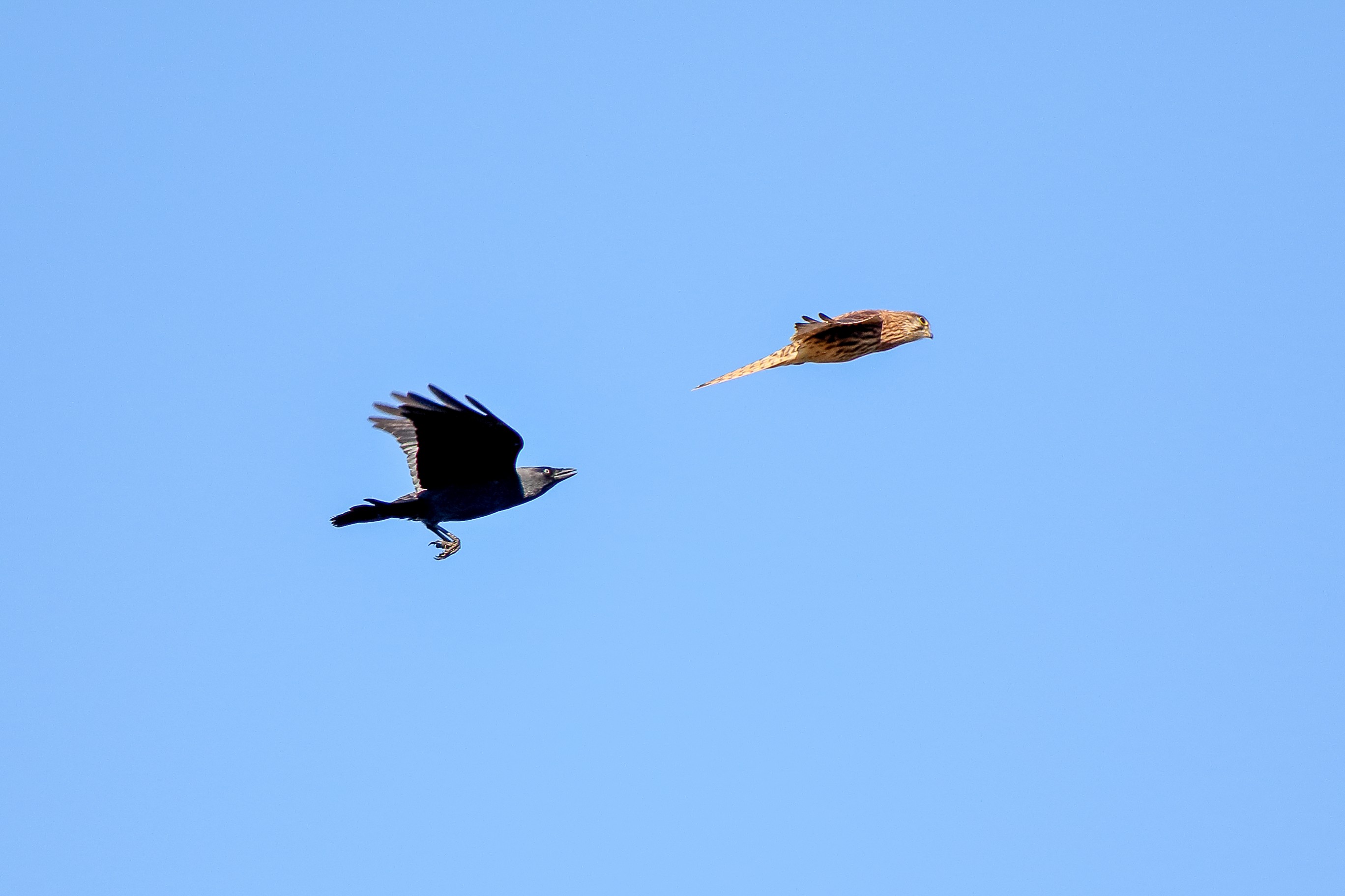 Kleiner Luftkampf zwischen Krähe und Turmfalke