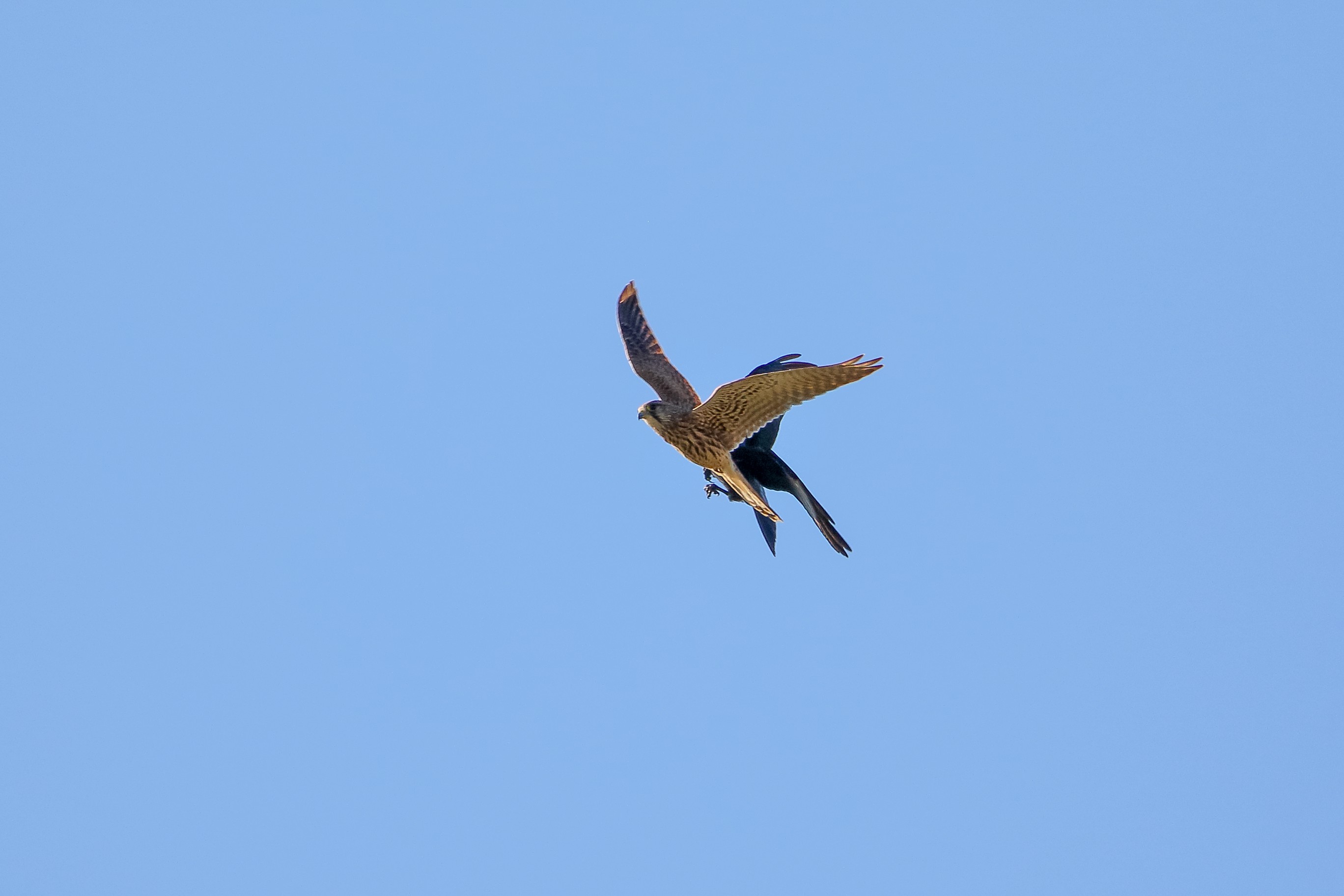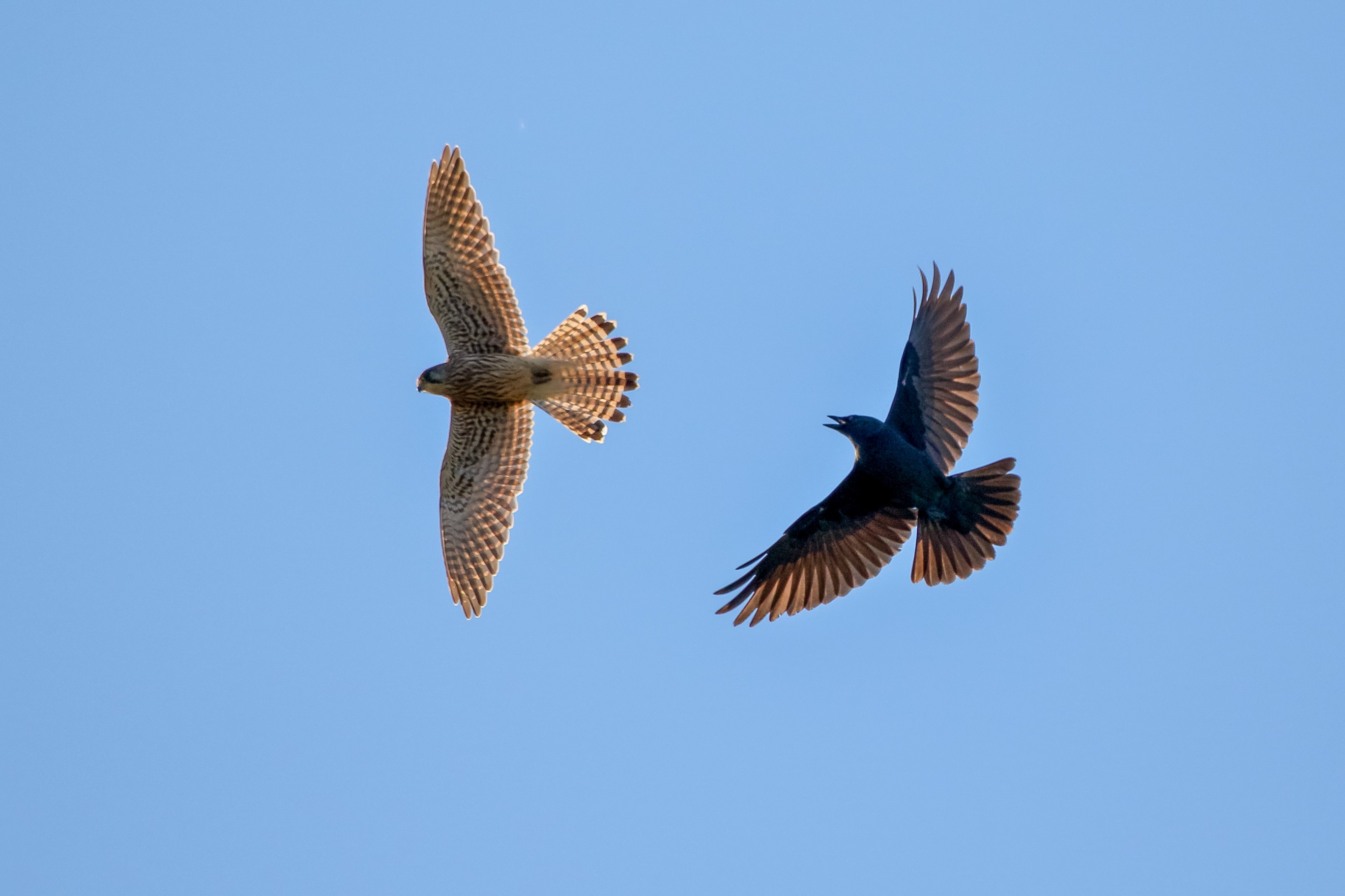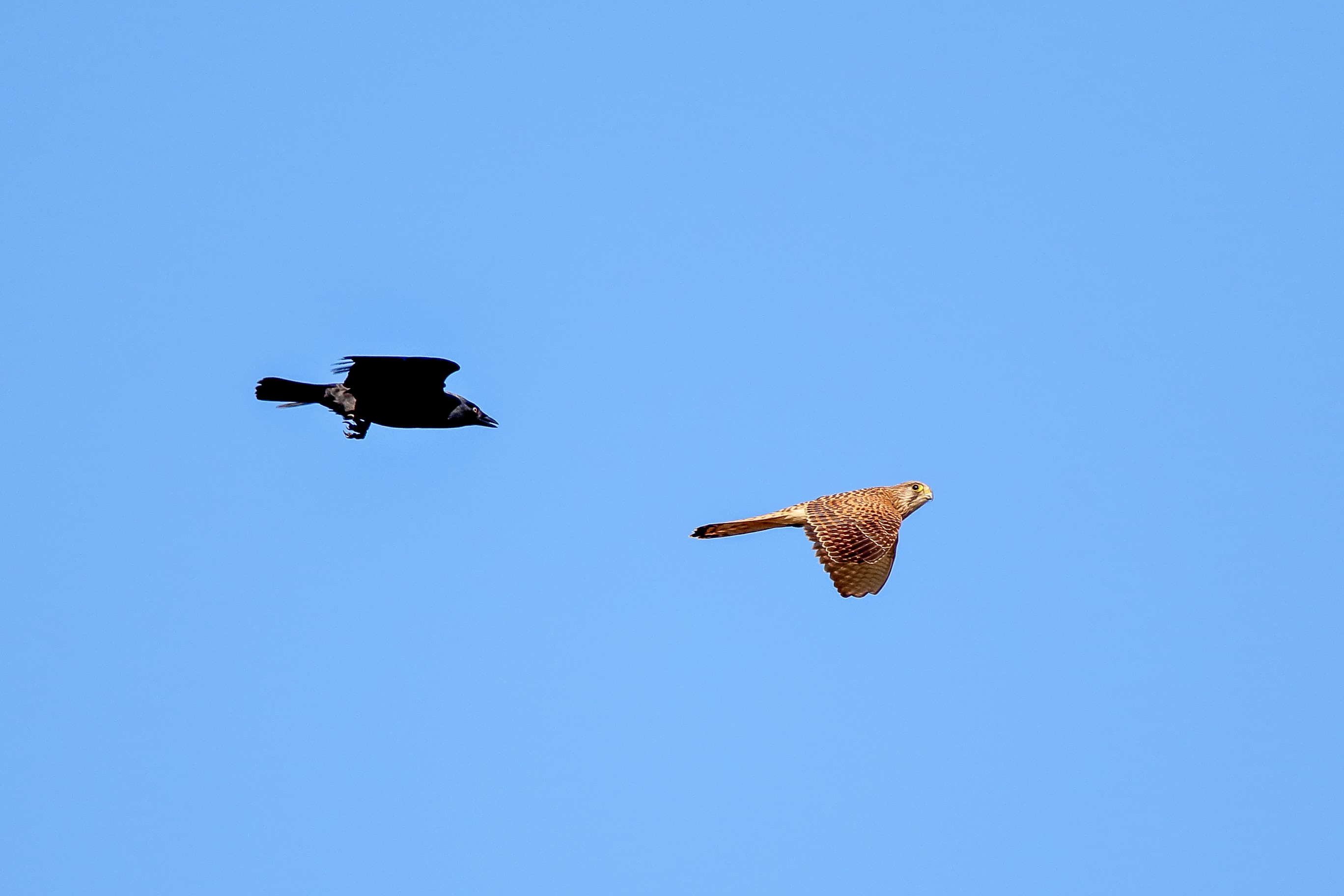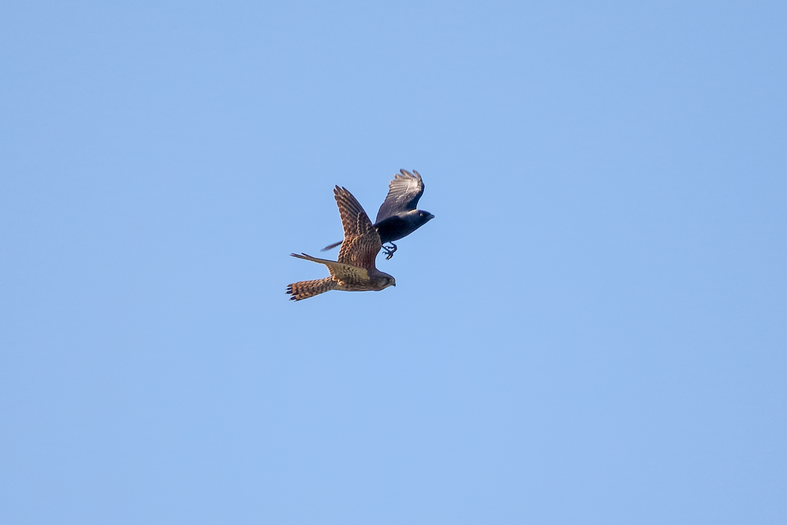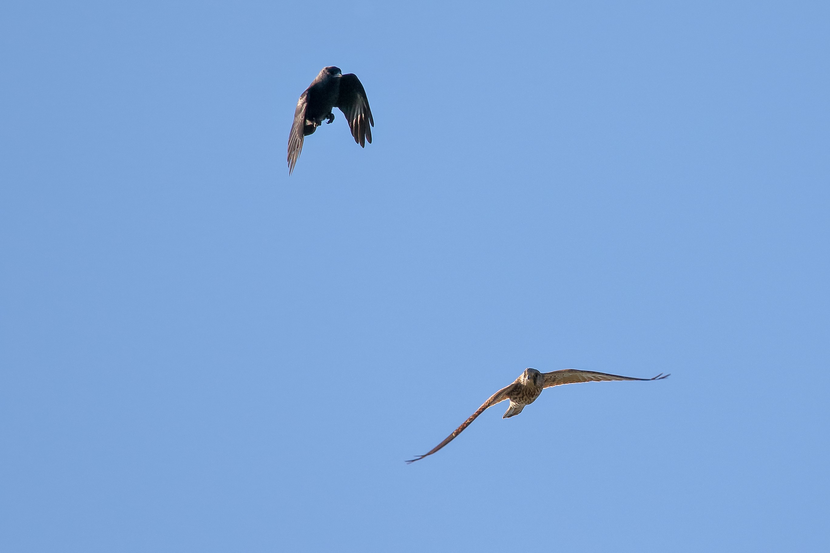 Kleiner Luftkampf zwischen Krähe und Turmfalke