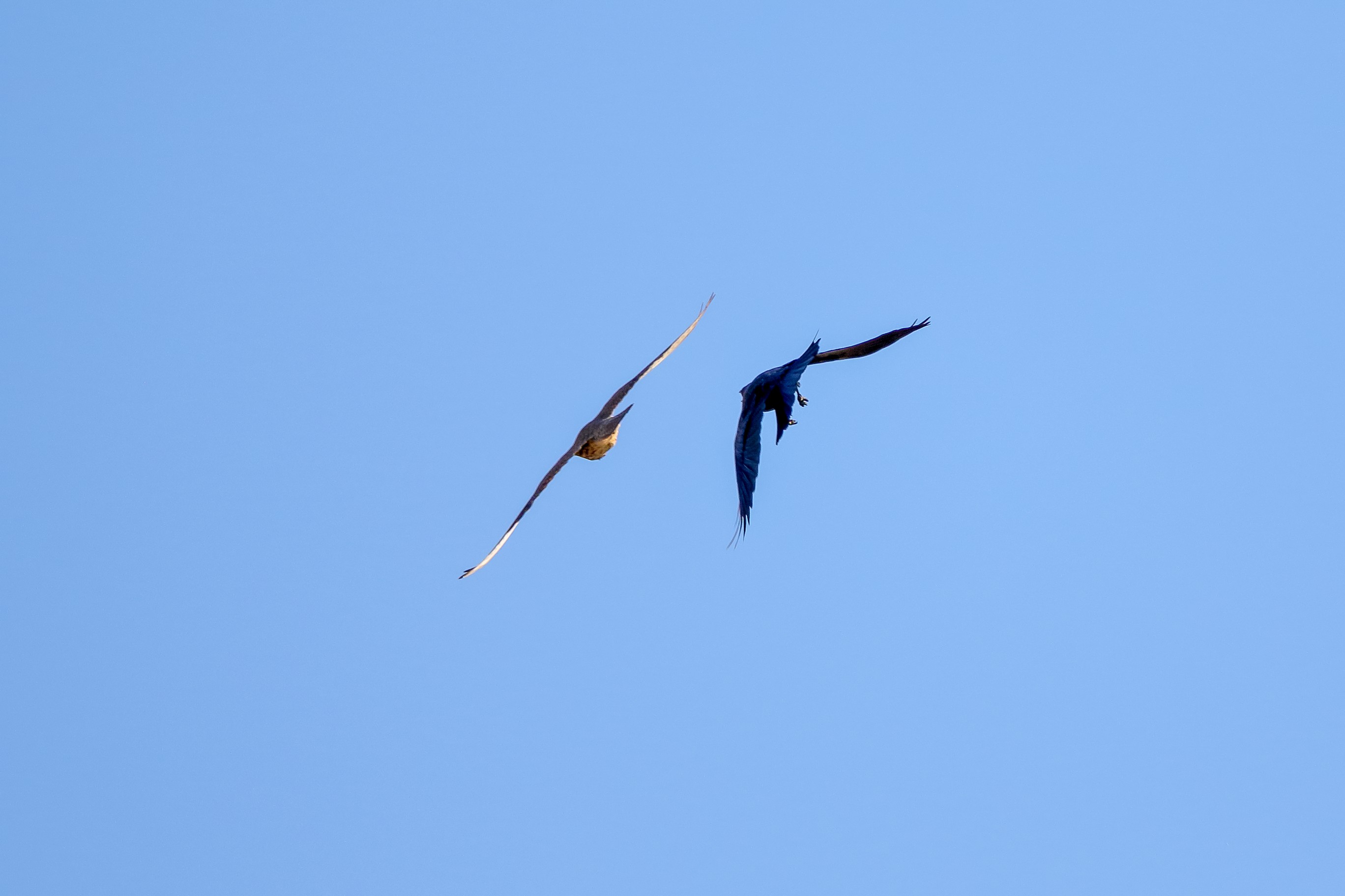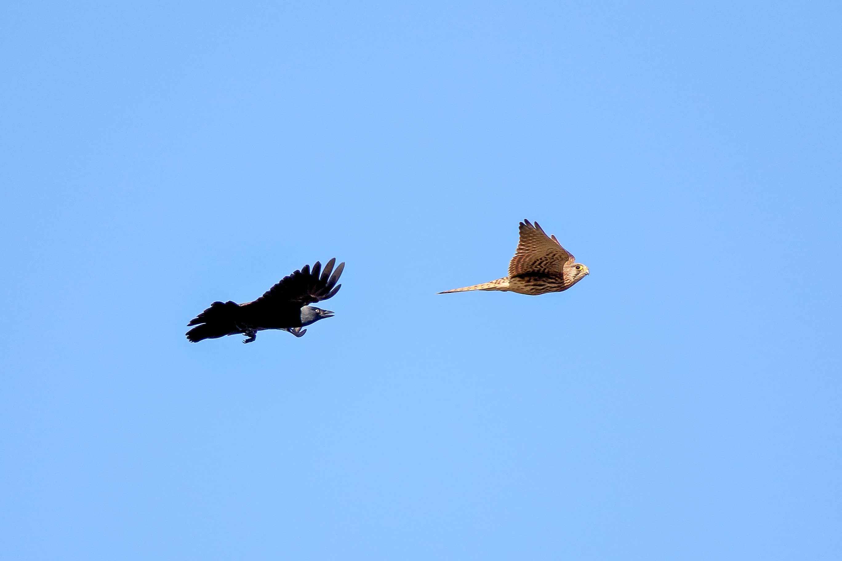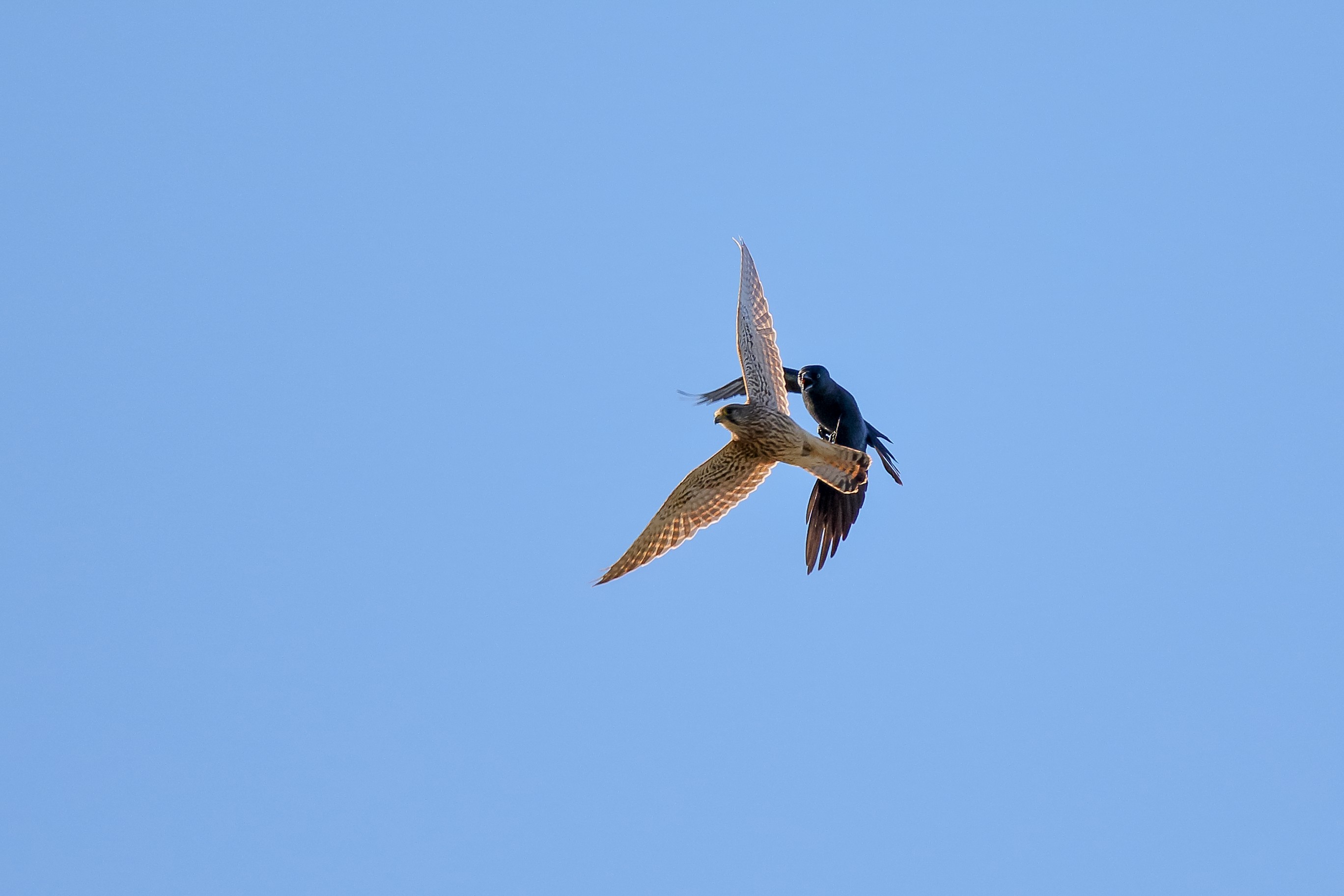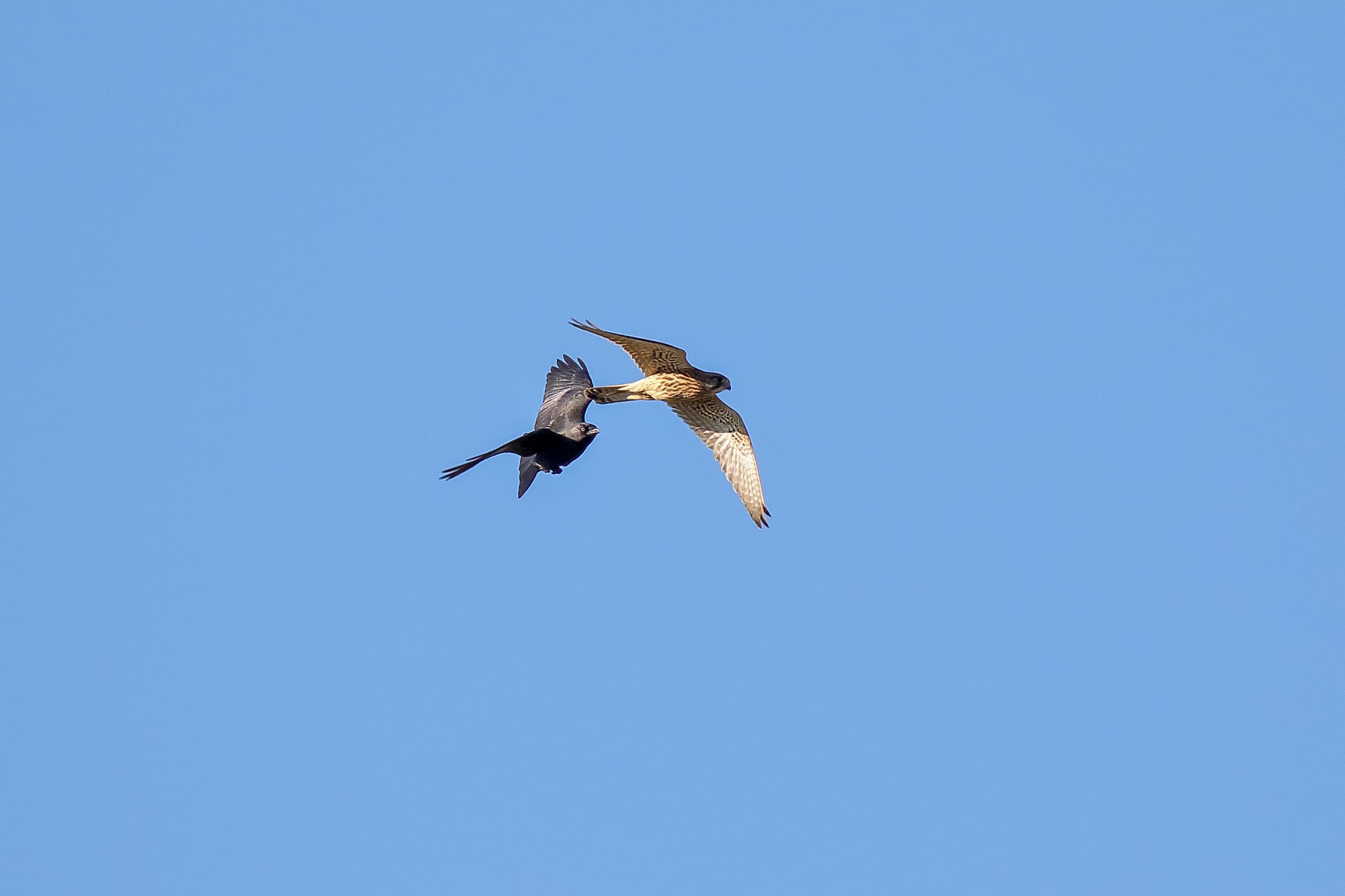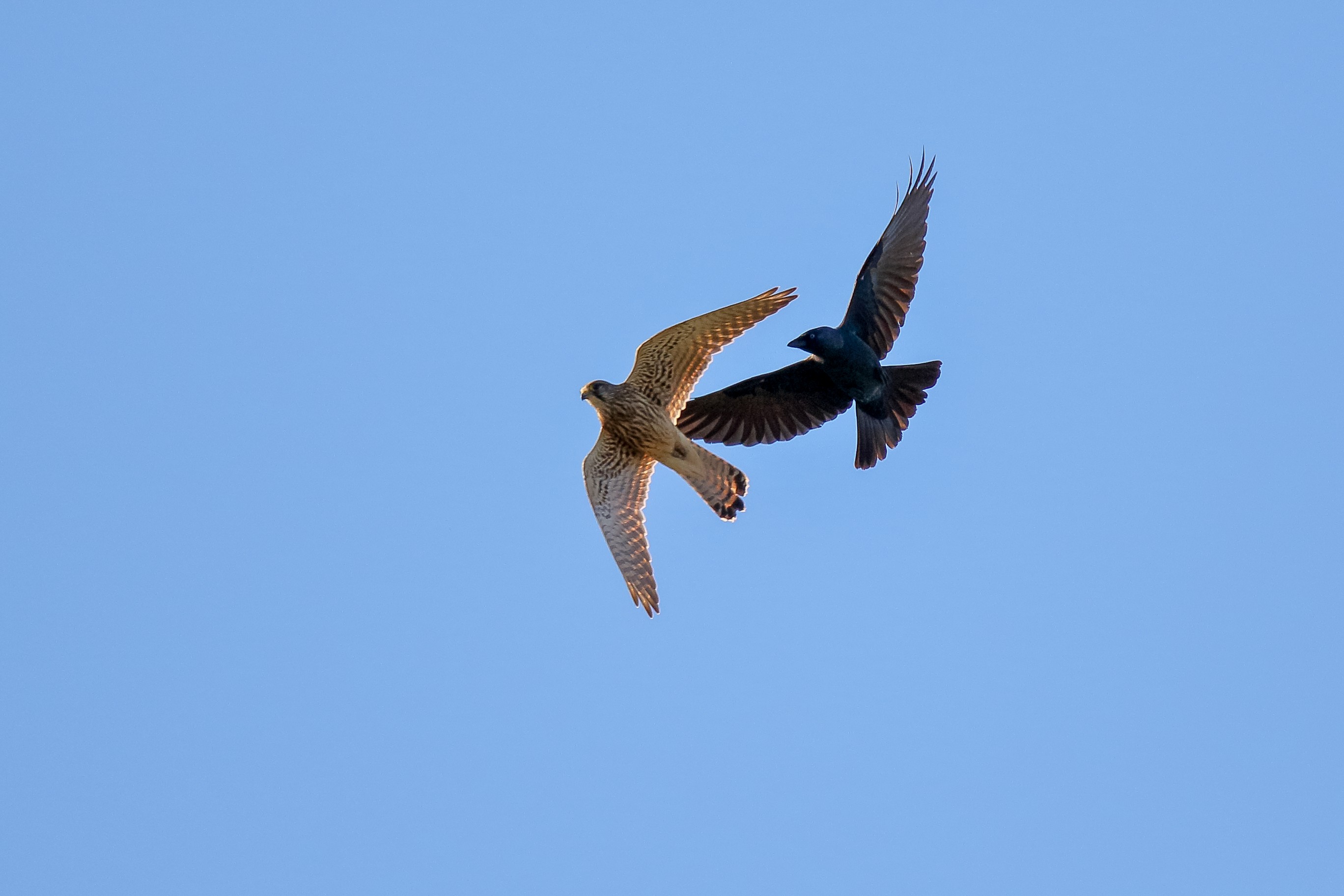 Kleiner Luftkampf zwischen Krähe und Turmfalke