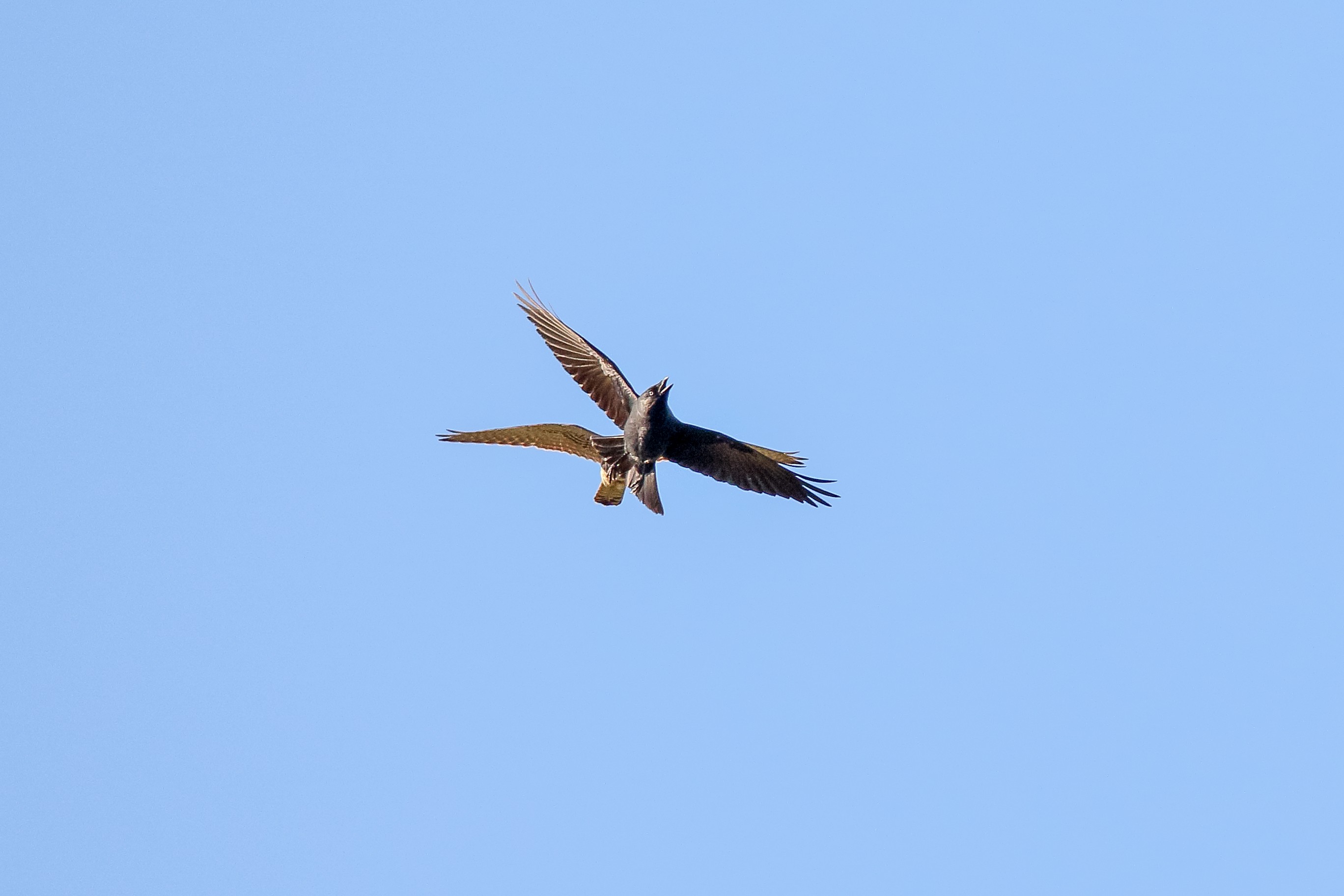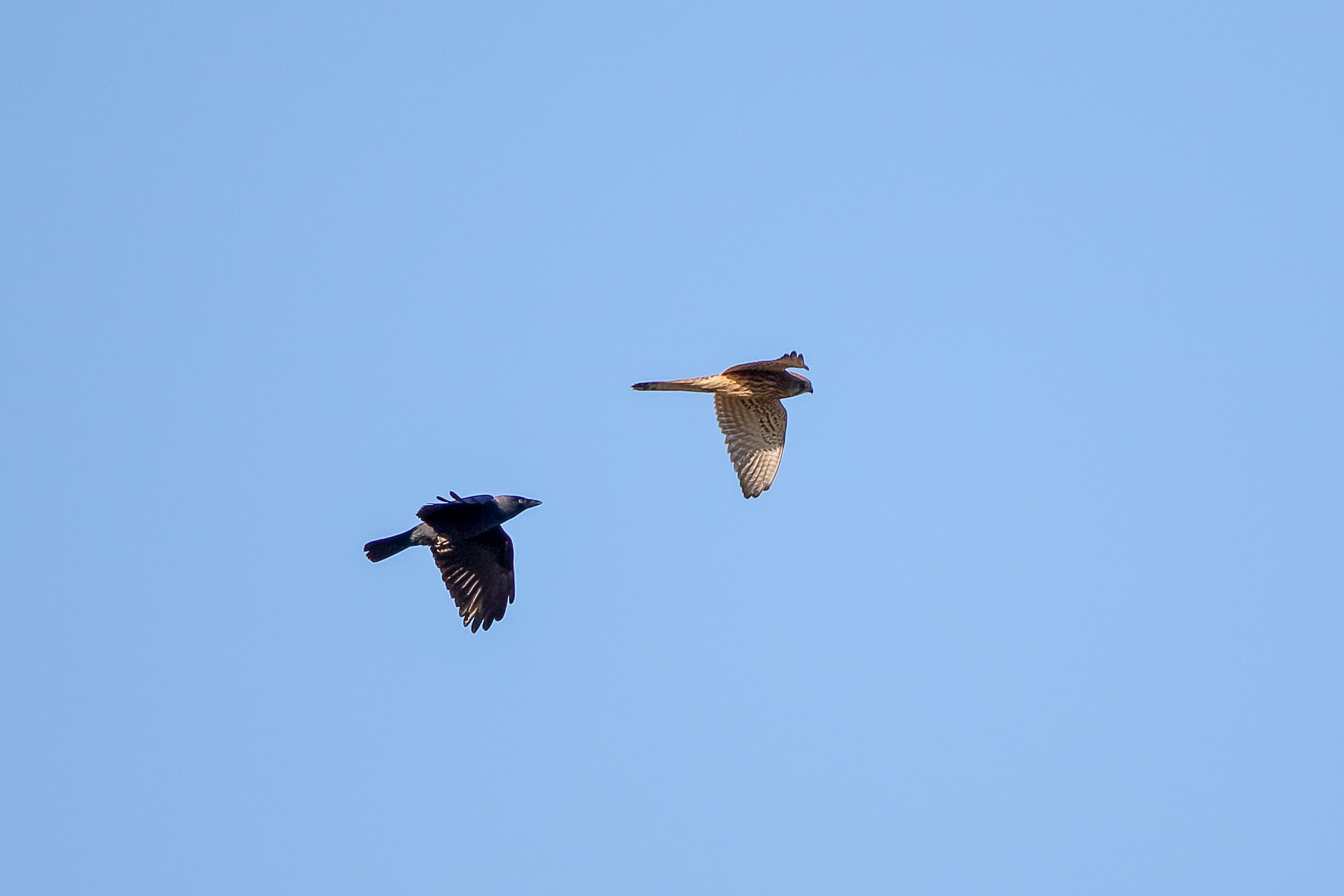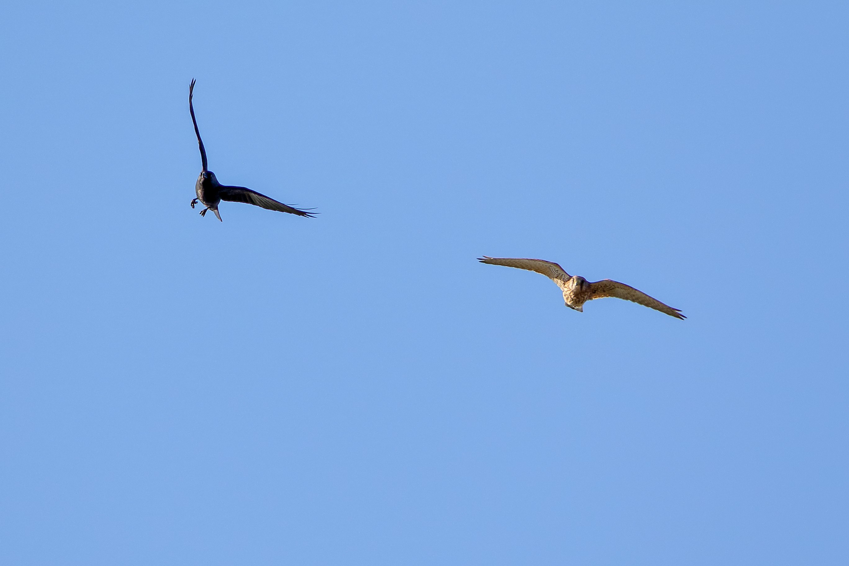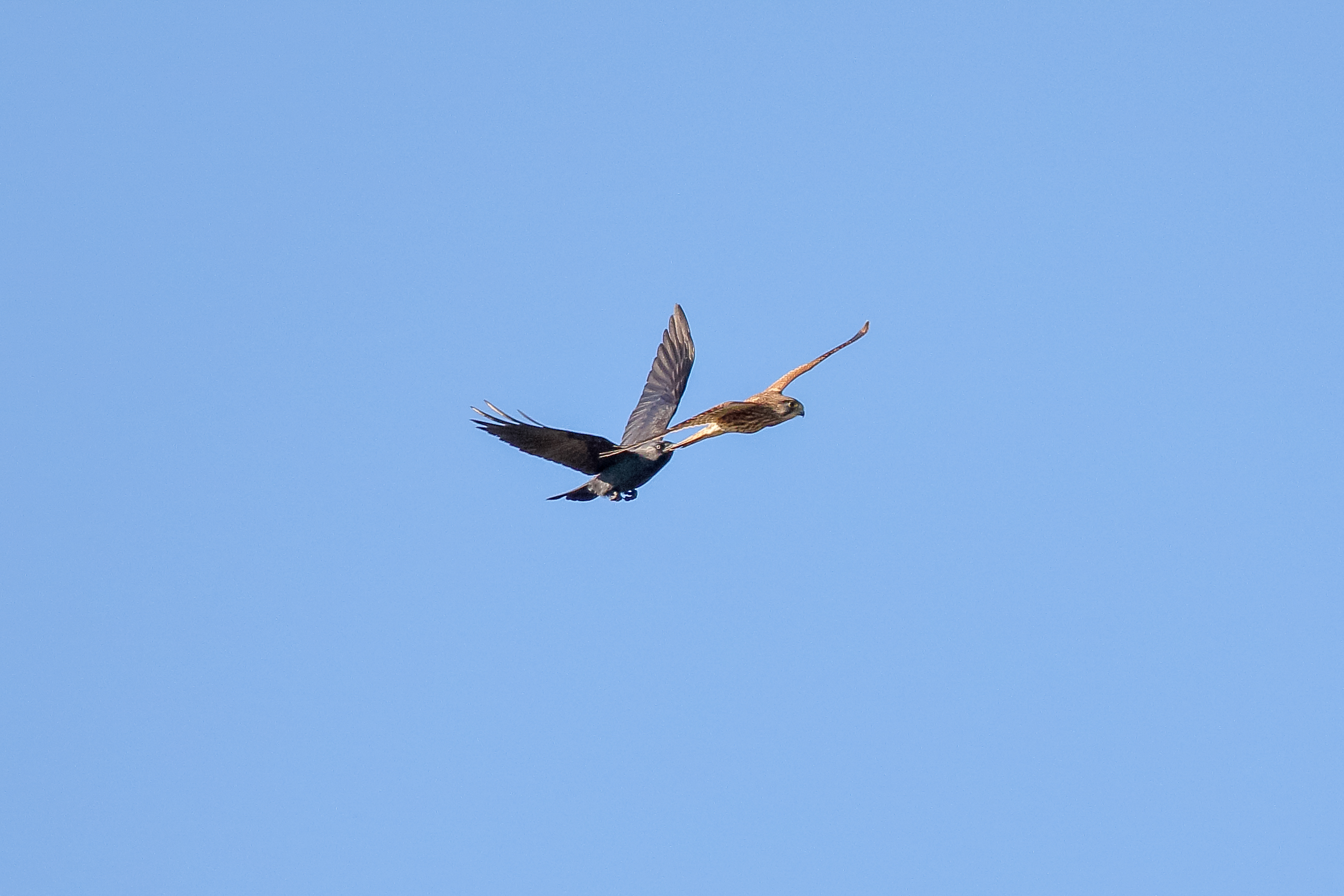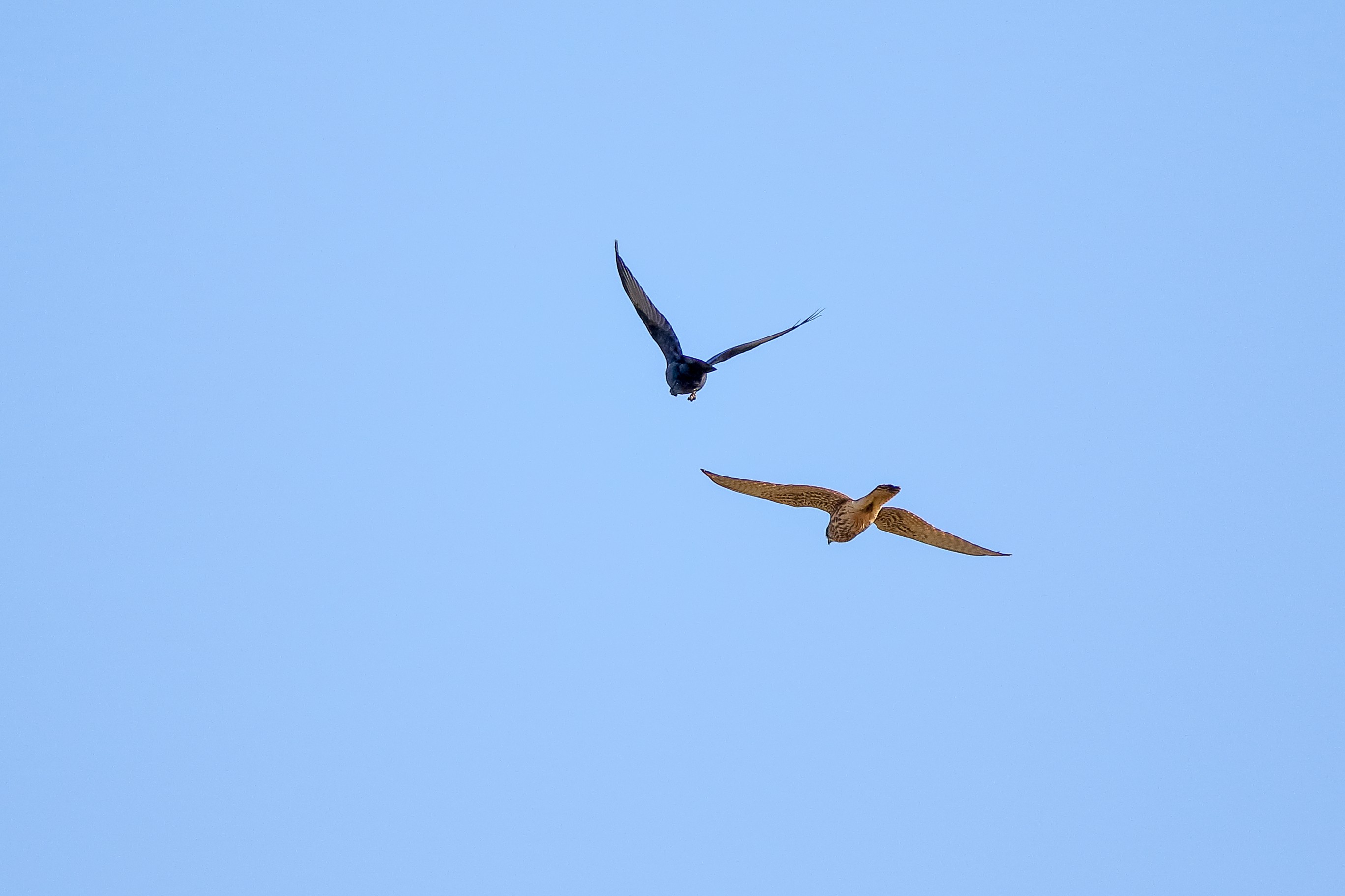 Kleiner Luftkampf zwischen Krähe und Turmfalke
