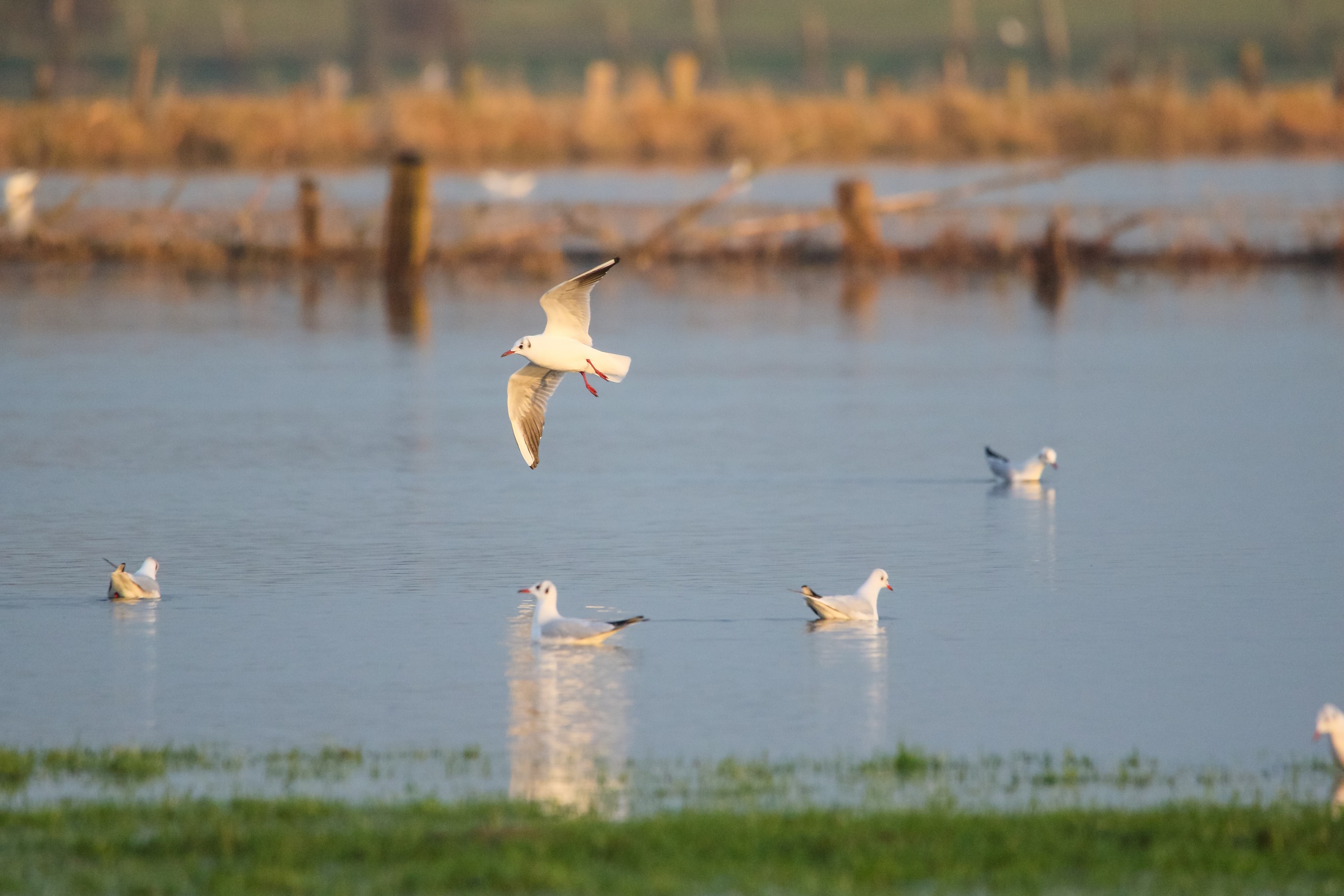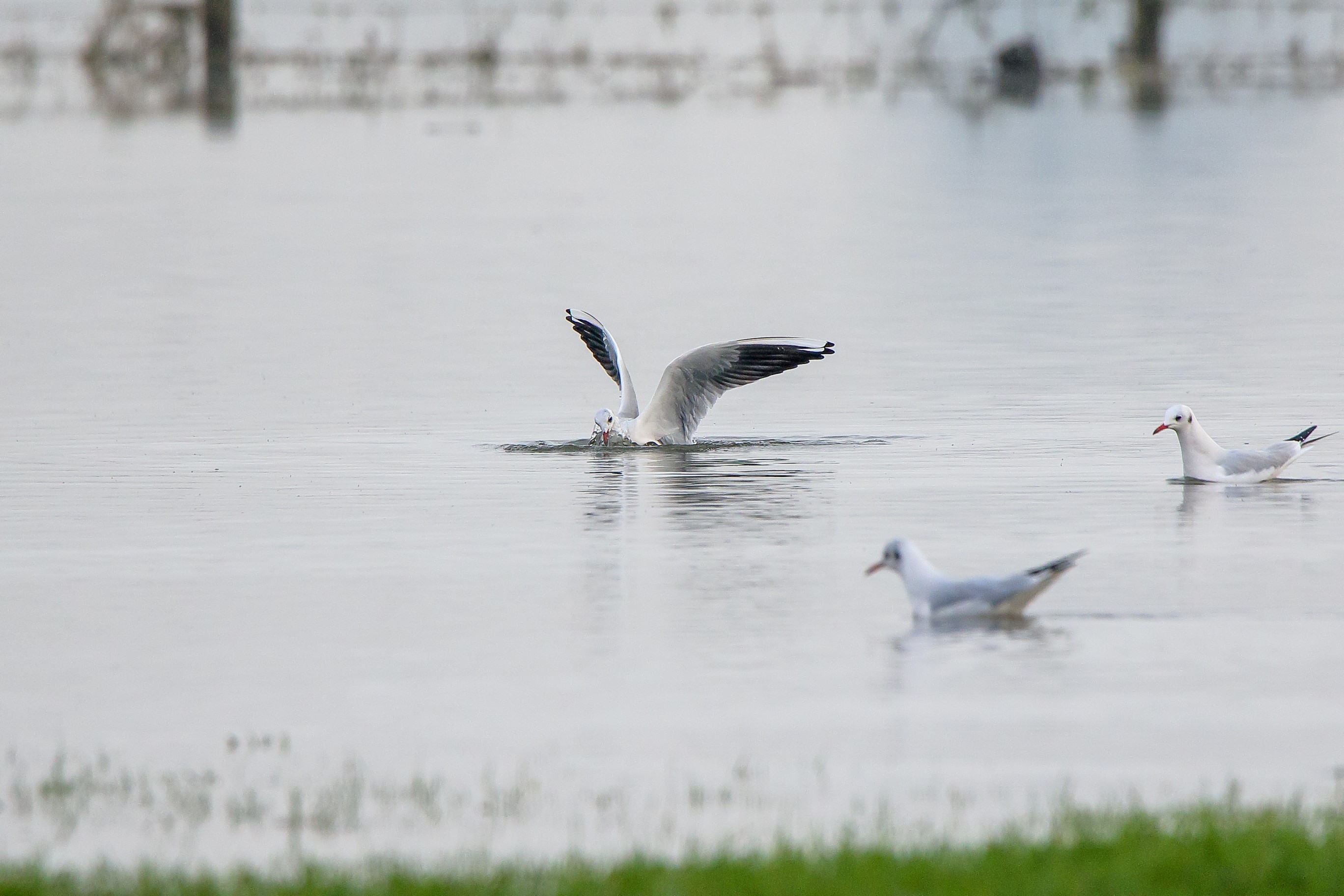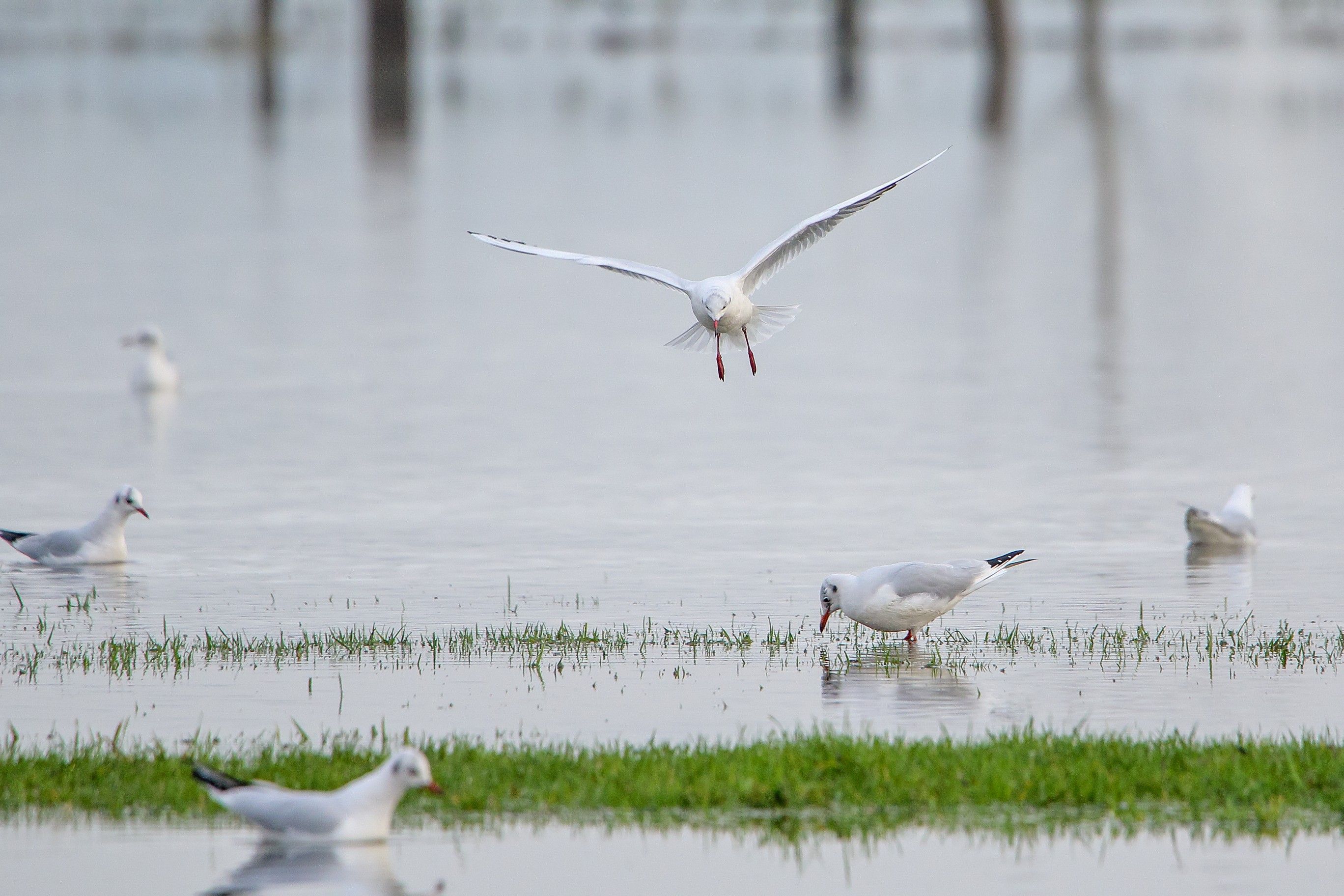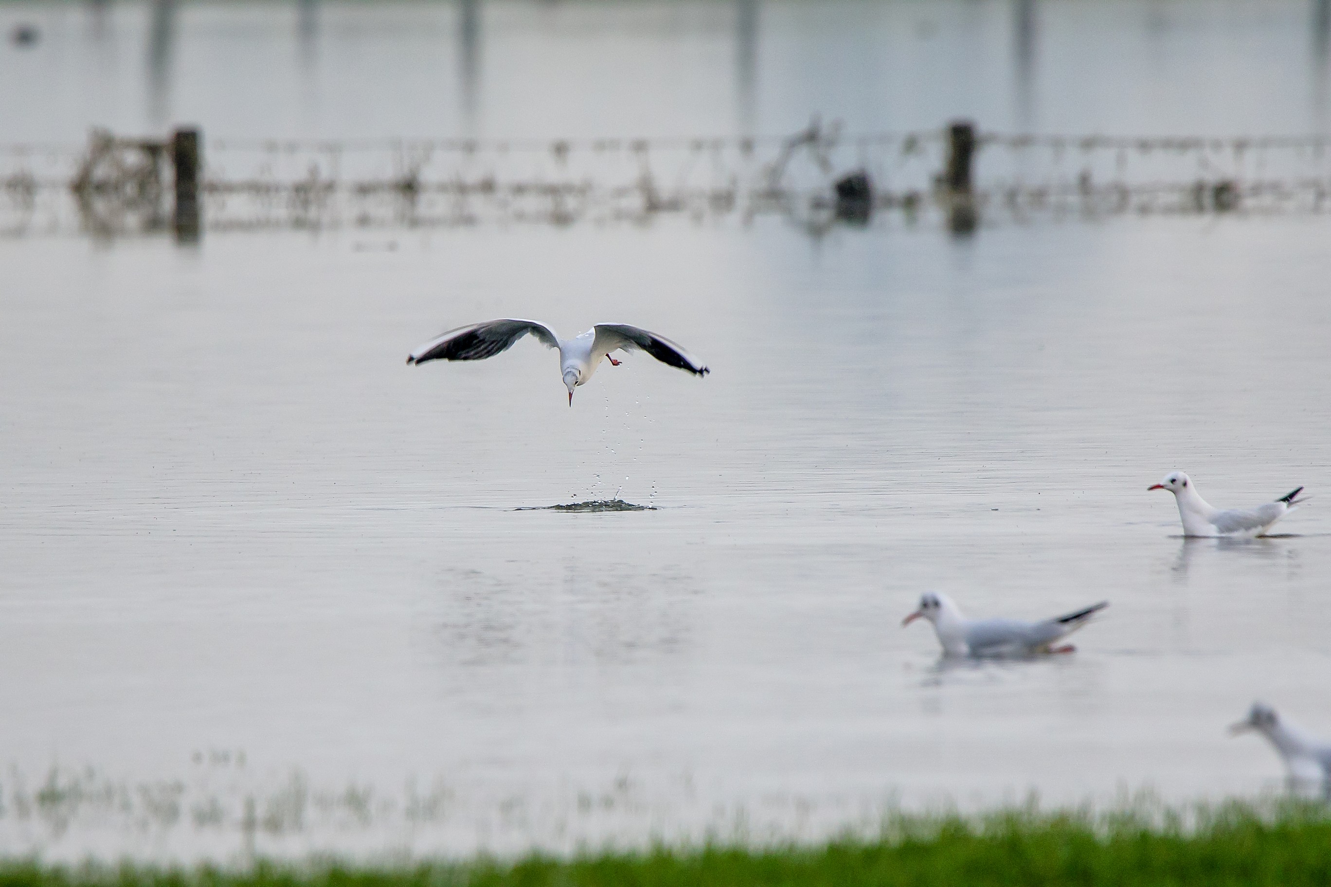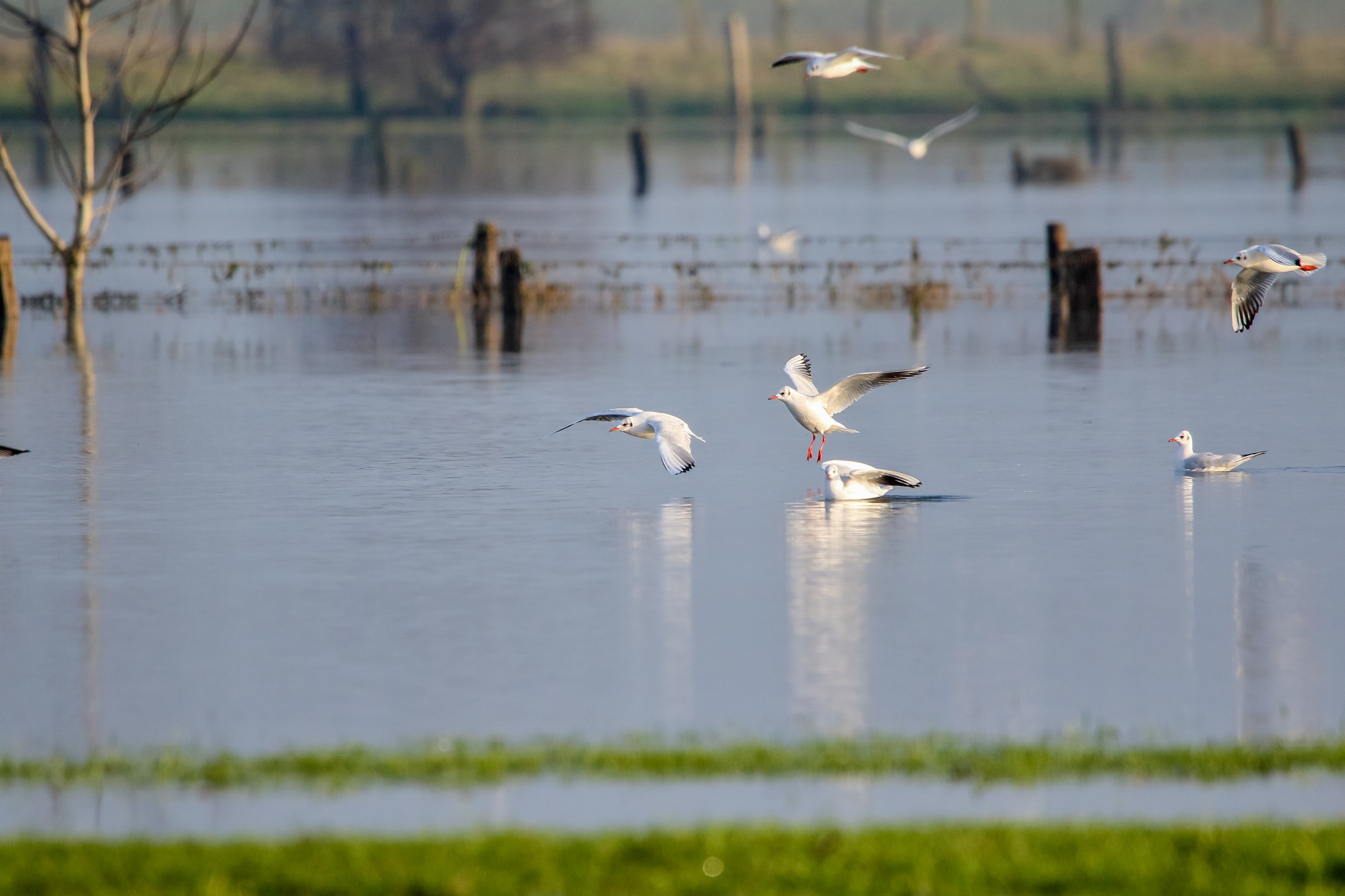 Die jährlich auftretende Hochwassersituation in der Auenlandschaft Bislicher Insel erschwert das Leben vieler Tierarten. Die Möwen erfreuen sich an den überfluteten Wiesen und fischen sich die kleinen Leckerbissen, die im Wasser aufsteigen.
