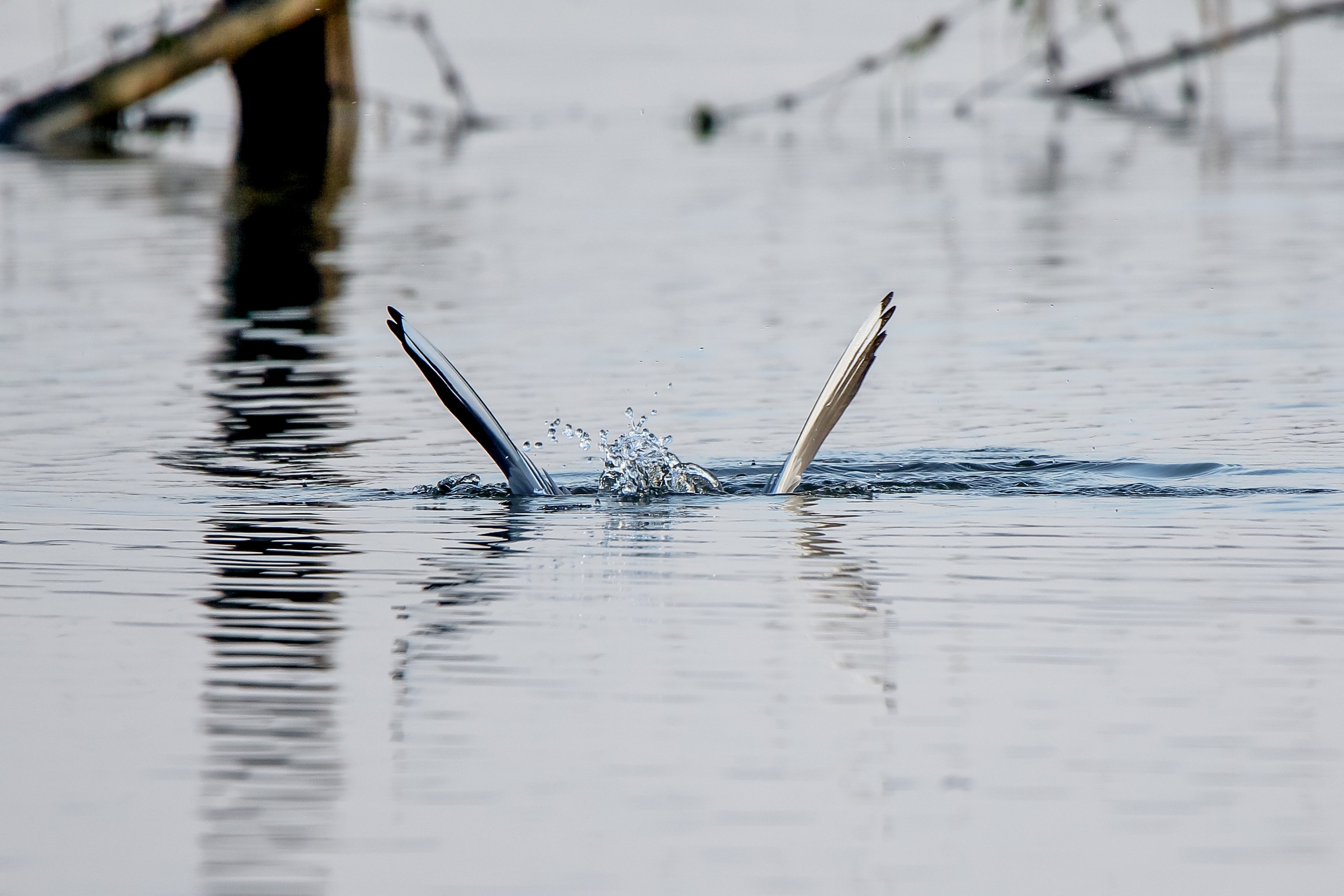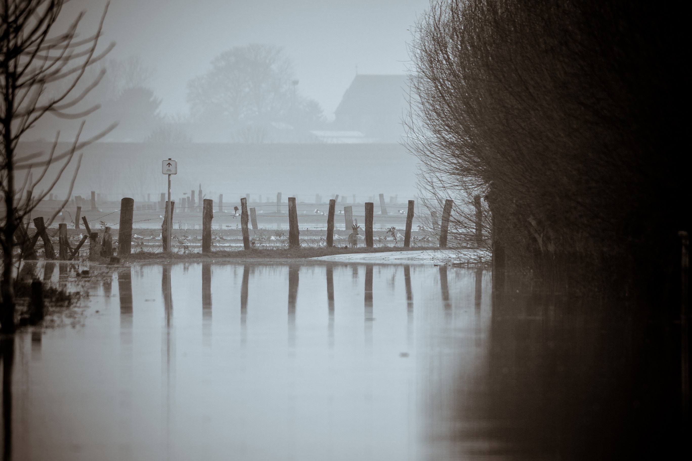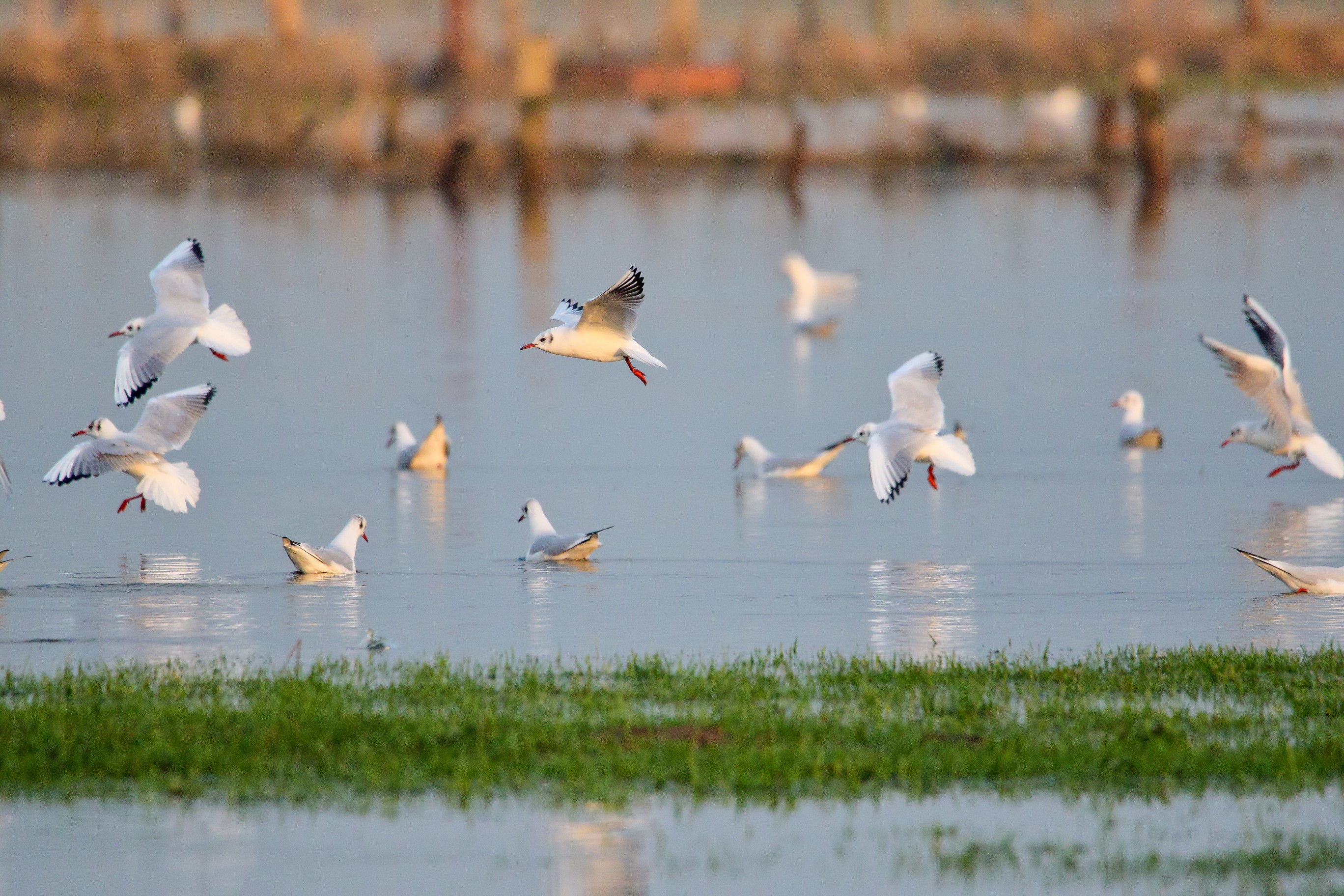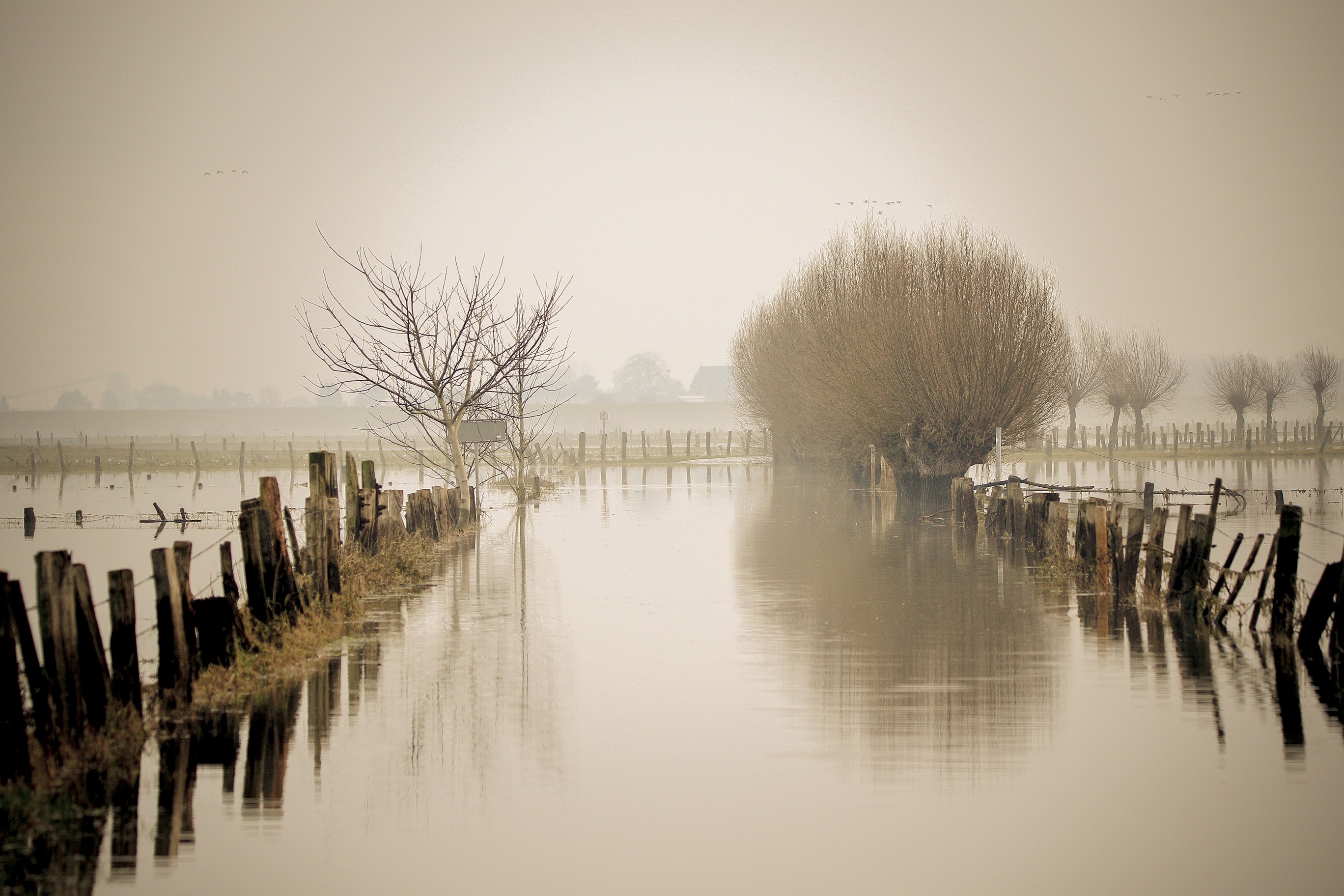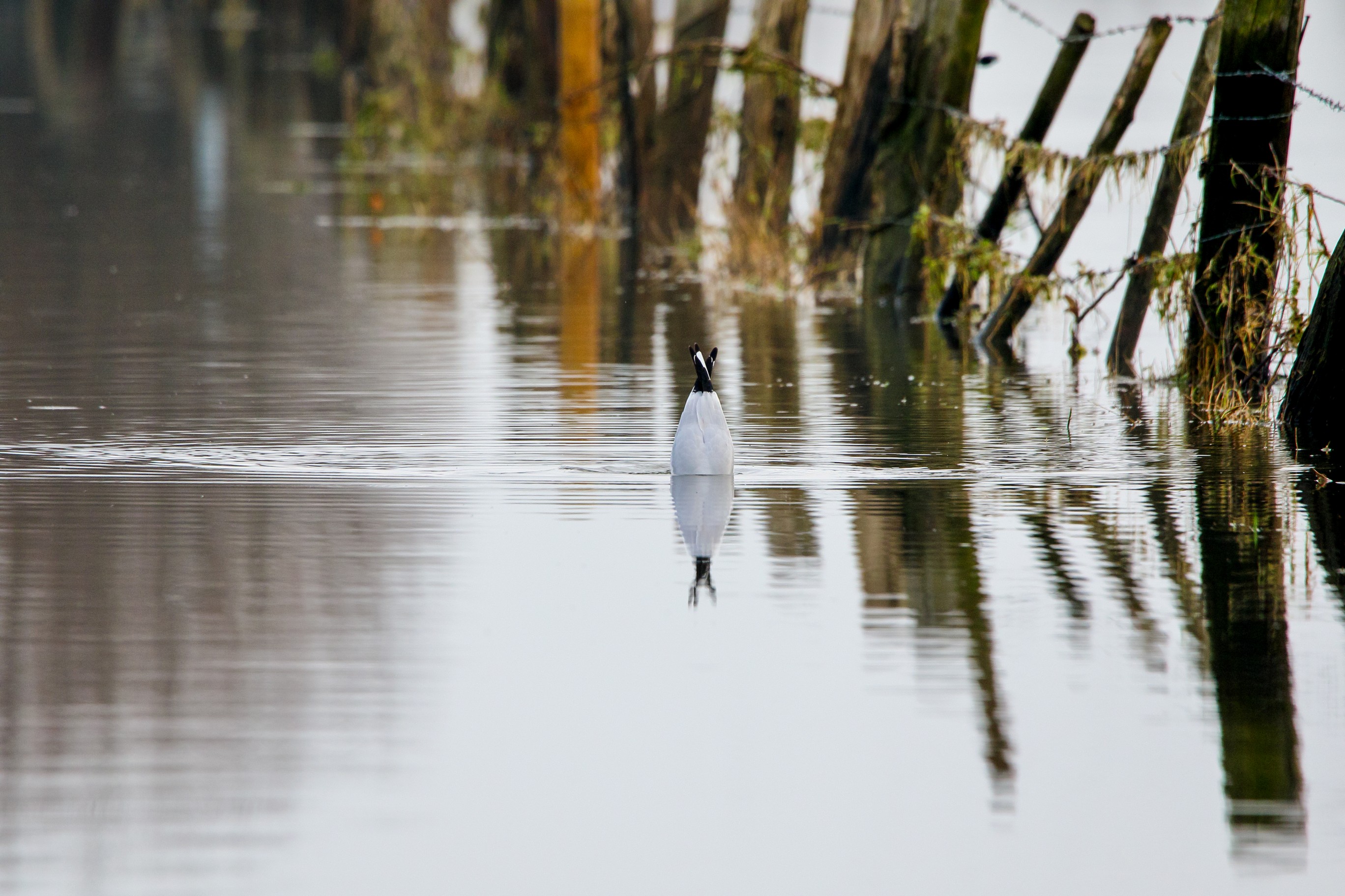 Die jährlich auftretende Hochwassersituation in der Auenlandschaft Bislicher Insel erschwert das Leben vieler Tierarten. Die Möwen erfreuen sich an den überfluteten Wiesen und fischen sich die kleinen Leckerbissen, die im Wasser aufsteigen.