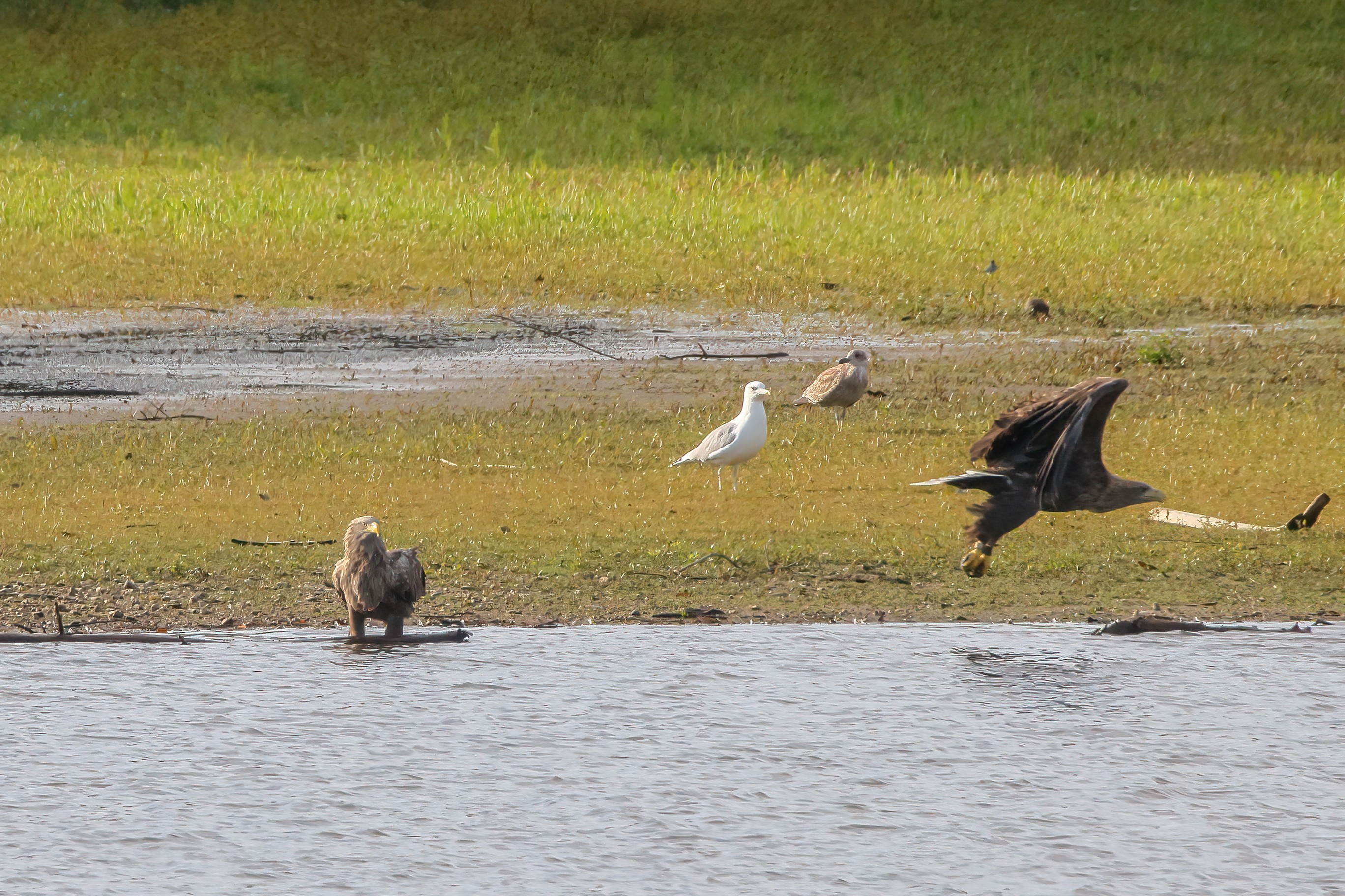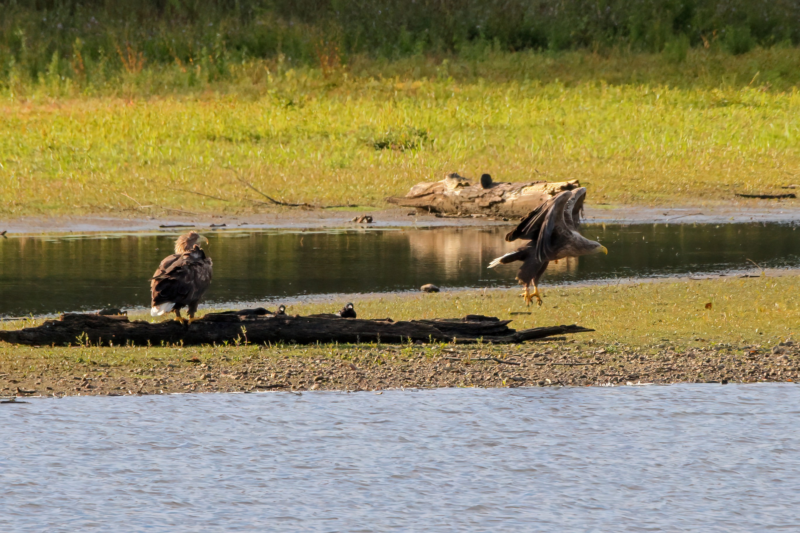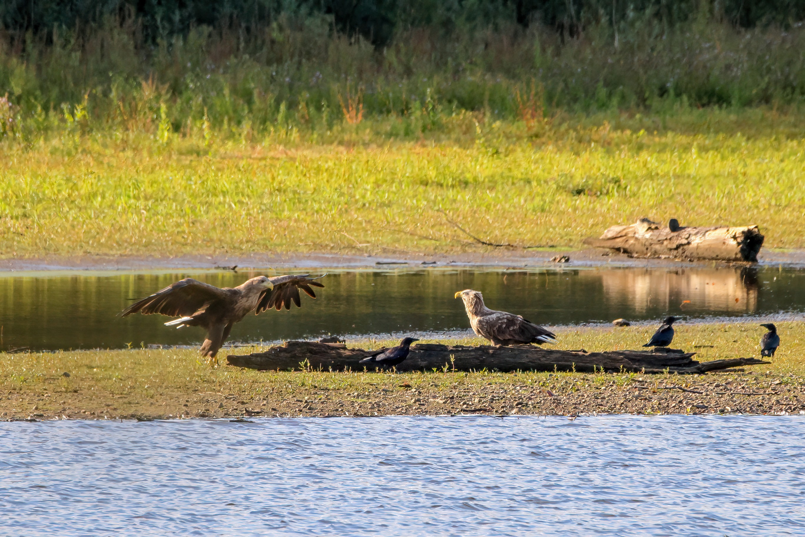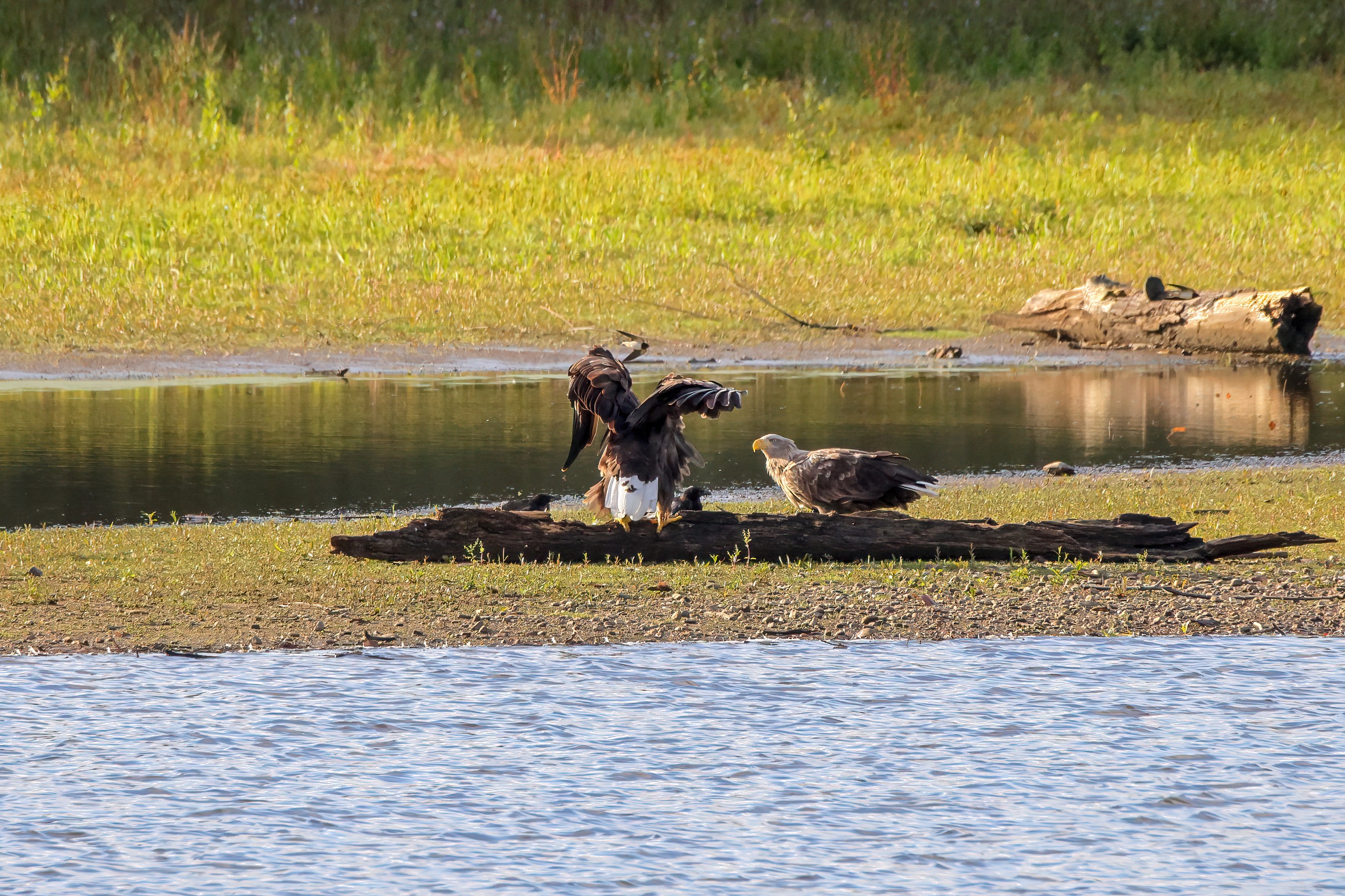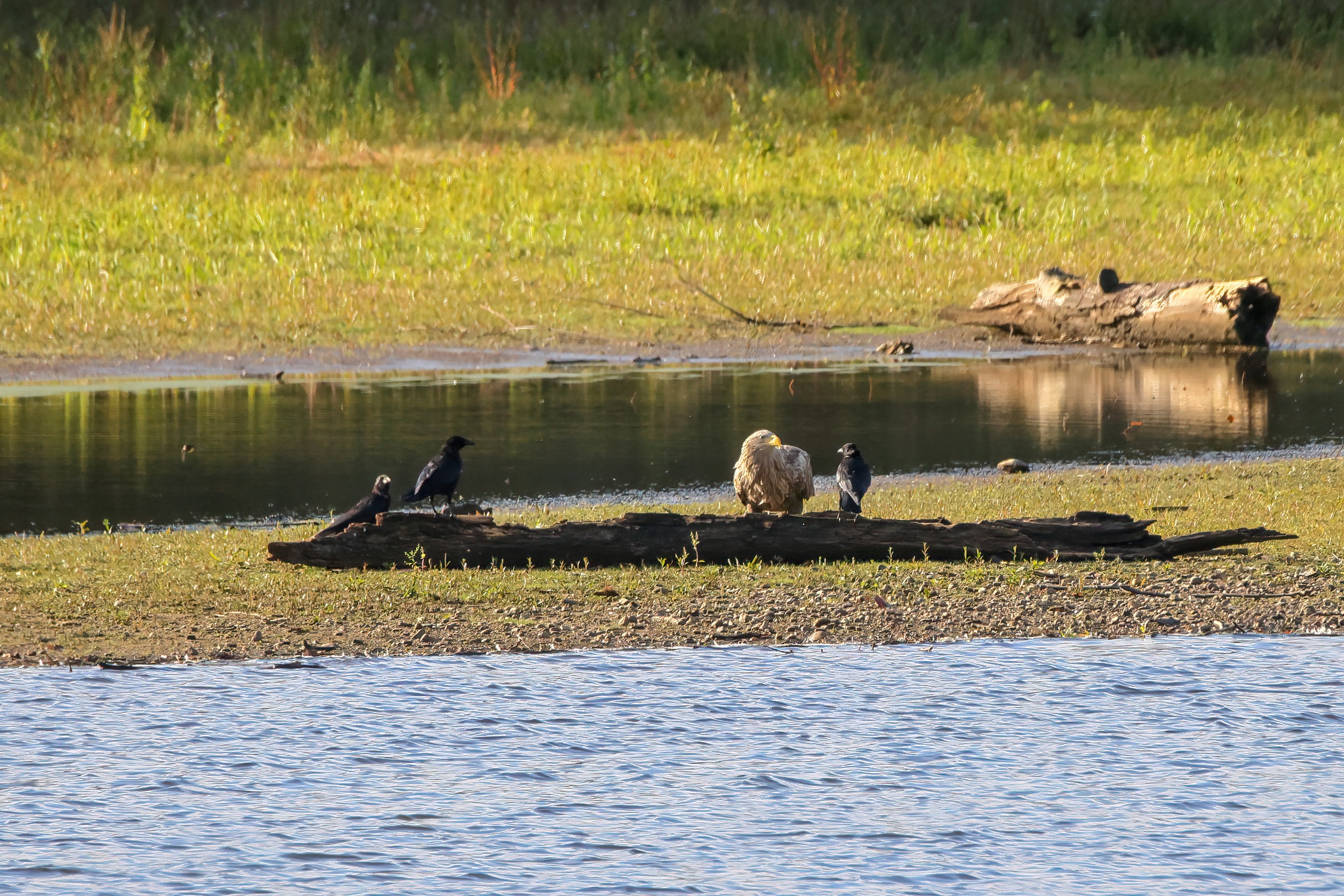 In den vorangegangenen Bildstrecken konnten wir einen Wechsel der Sichtbarkeit des eingedrungenen männlichen Seeadlers sowie des männlichen Habitatsgründers auf der Bislicher Insel nachvollziehen. Am 19. September wurde diese Bildstrecke aus der Beobachtungshütte III aufgenommen, die uns das ursprüngliche Seeadlermännchen in der Gemeinsamkeit mit dem neuen Seeadlerweibchen bei der Nahrungsaufnahme zeigt. Zur Zeit möchte ich keine Prognose über den weiteren Verlauf der hier zu beobachtenden Nähe der beiden Seeadler treffen. Es bleibt abzuwarten wie sich bis zum Jahresende die Seeadler für das kommende Jahr zusammenfinden. Das neue Seeadlerweibchen ist beidseitig beringt, hat dunklere Augen entgegen adulter Artgenossen und verfügt über einen mächtigen Oberkörper. Unser Habitatsgründer ist durch den am rechten Fang befindlichen kupferfarbenen Ring leicht erkennbar.