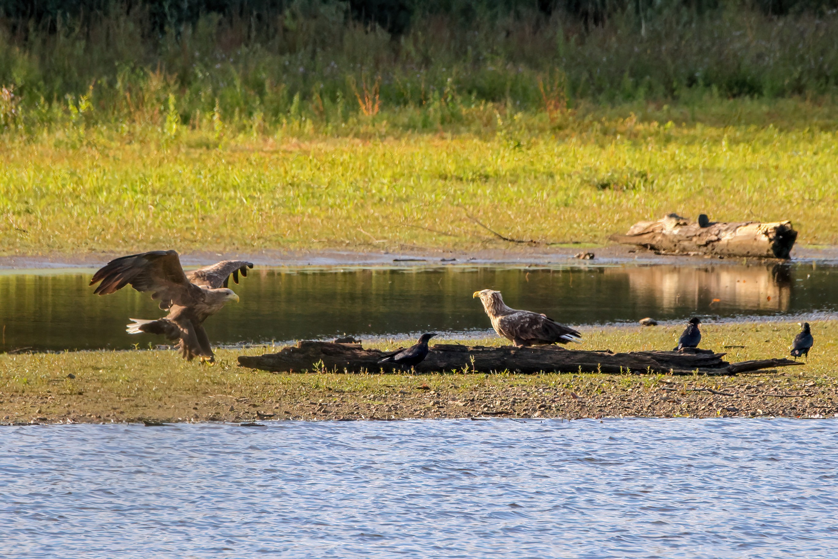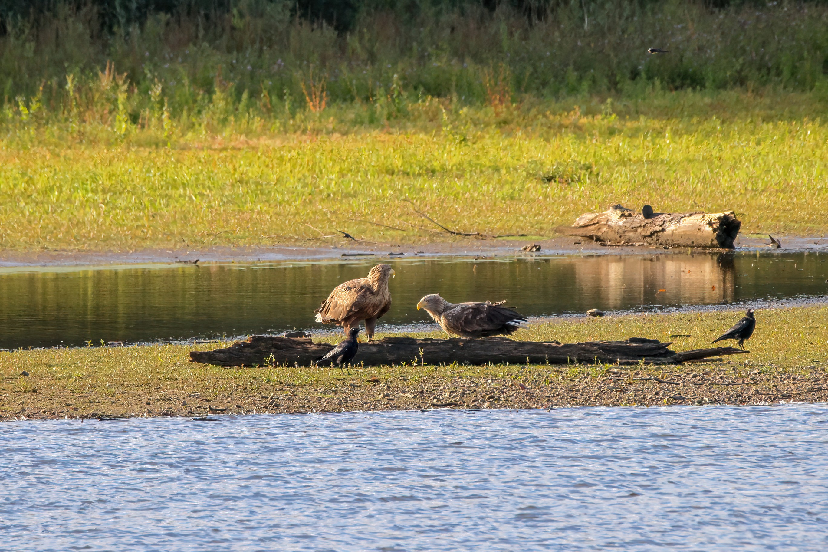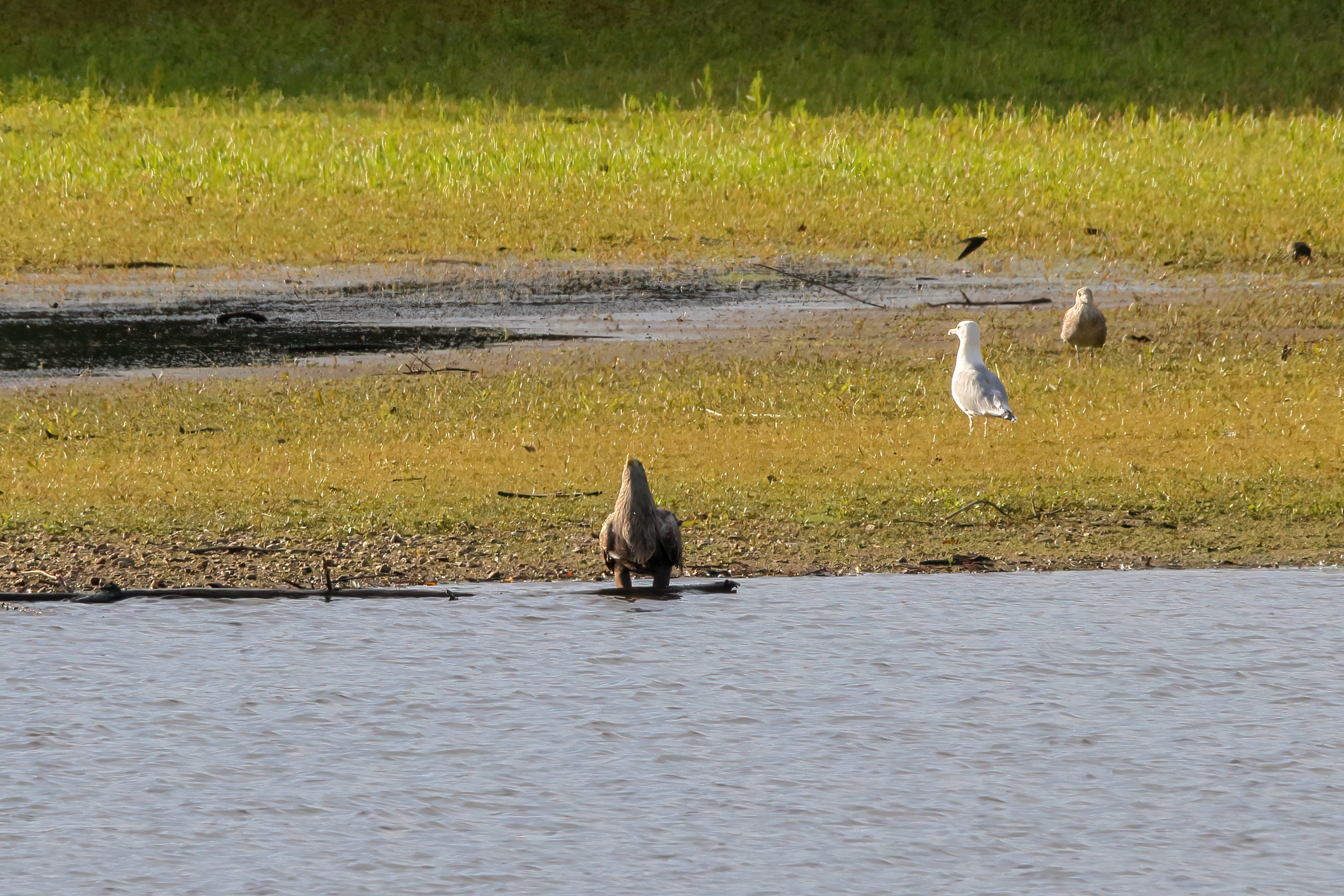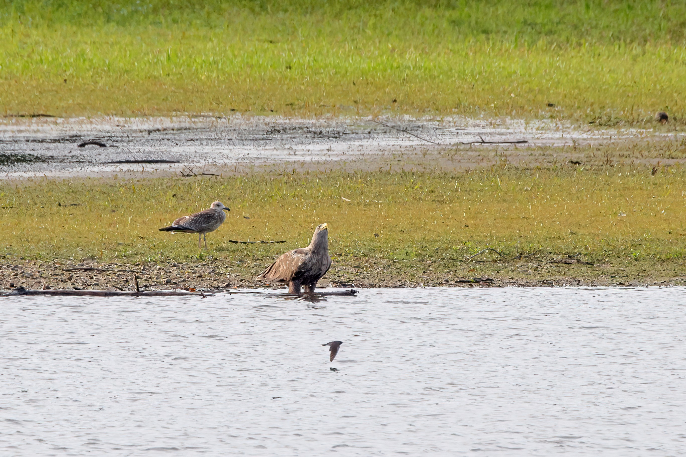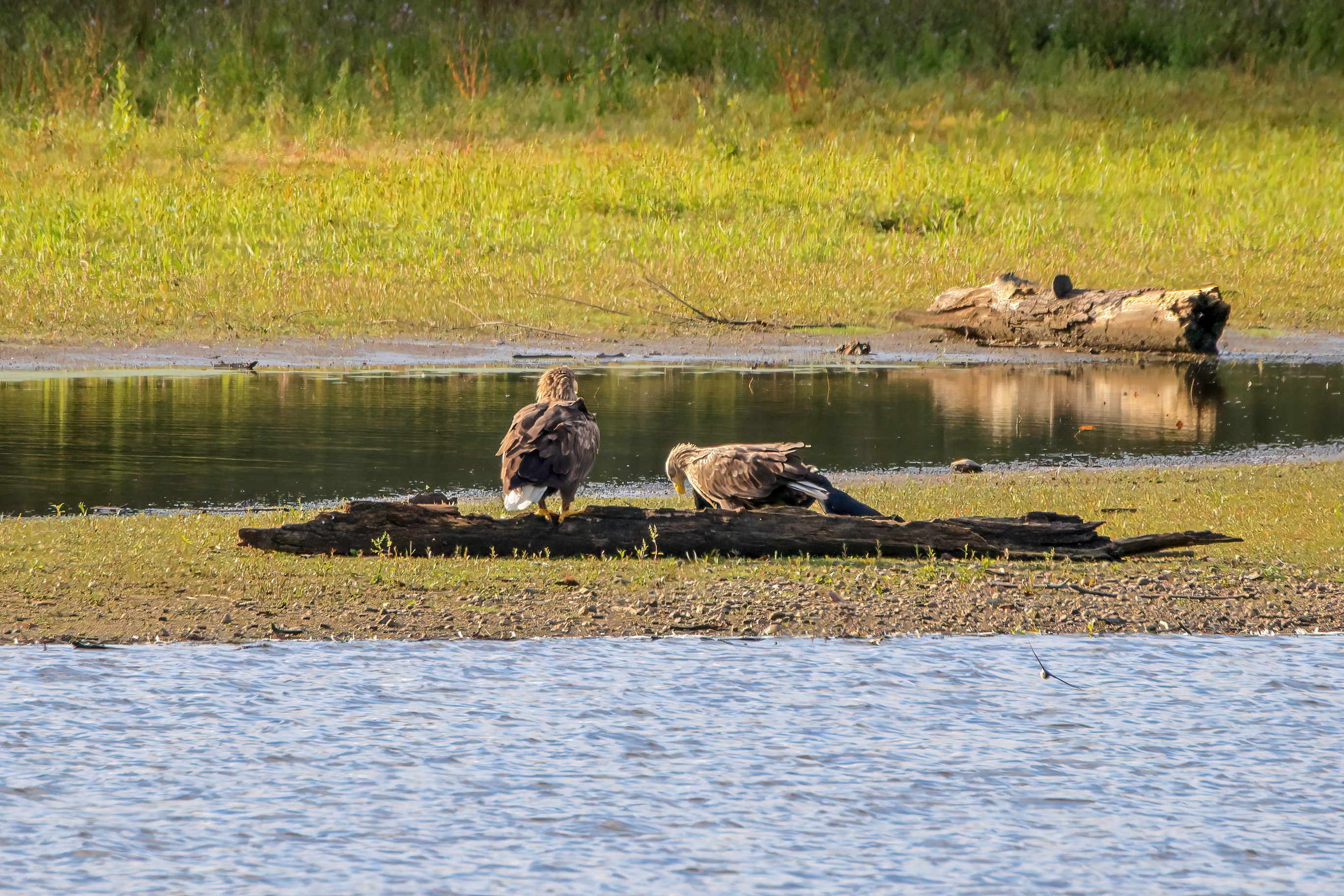 In den vorangegangenen Bildstrecken konnten wir einen Wechsel der Sichtbarkeit des eingedrungenen männlichen Seeadlers sowie des männlichen Habitatsgründers auf der Bislicher Insel nachvollziehen. Am 19. September wurde diese Bildstrecke aus der Beobachtungshütte III aufgenommen, die uns das ursprüngliche Seeadlermännchen in der Gemeinsamkeit mit dem neuen Seeadlerweibchen bei der Nahrungsaufnahme zeigt. Zur Zeit möchte ich keine Prognose über den weiteren Verlauf der hier zu beobachtenden Nähe der beiden Seeadler treffen. Es bleibt abzuwarten wie sich bis zum Jahresende die Seeadler für das kommende Jahr zusammenfinden. Das neue Seeadlerweibchen ist beidseitig beringt, hat dunklere Augen entgegen adulter Artgenossen und verfügt über einen mächtigen Oberkörper. Unser Habitatsgründer ist durch den am rechten Fang befindlichen kupferfarbenen Ring leicht erkennbar.