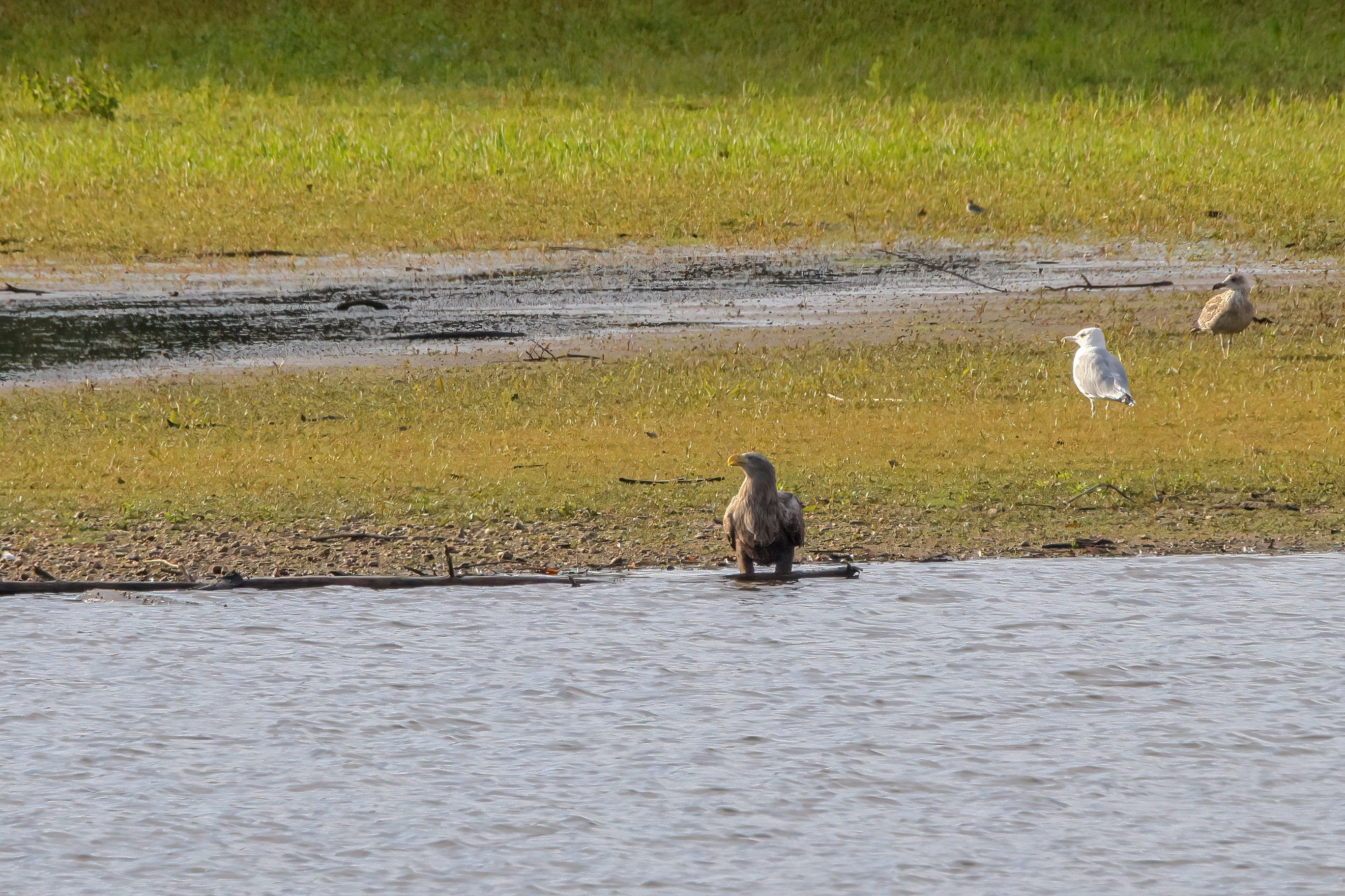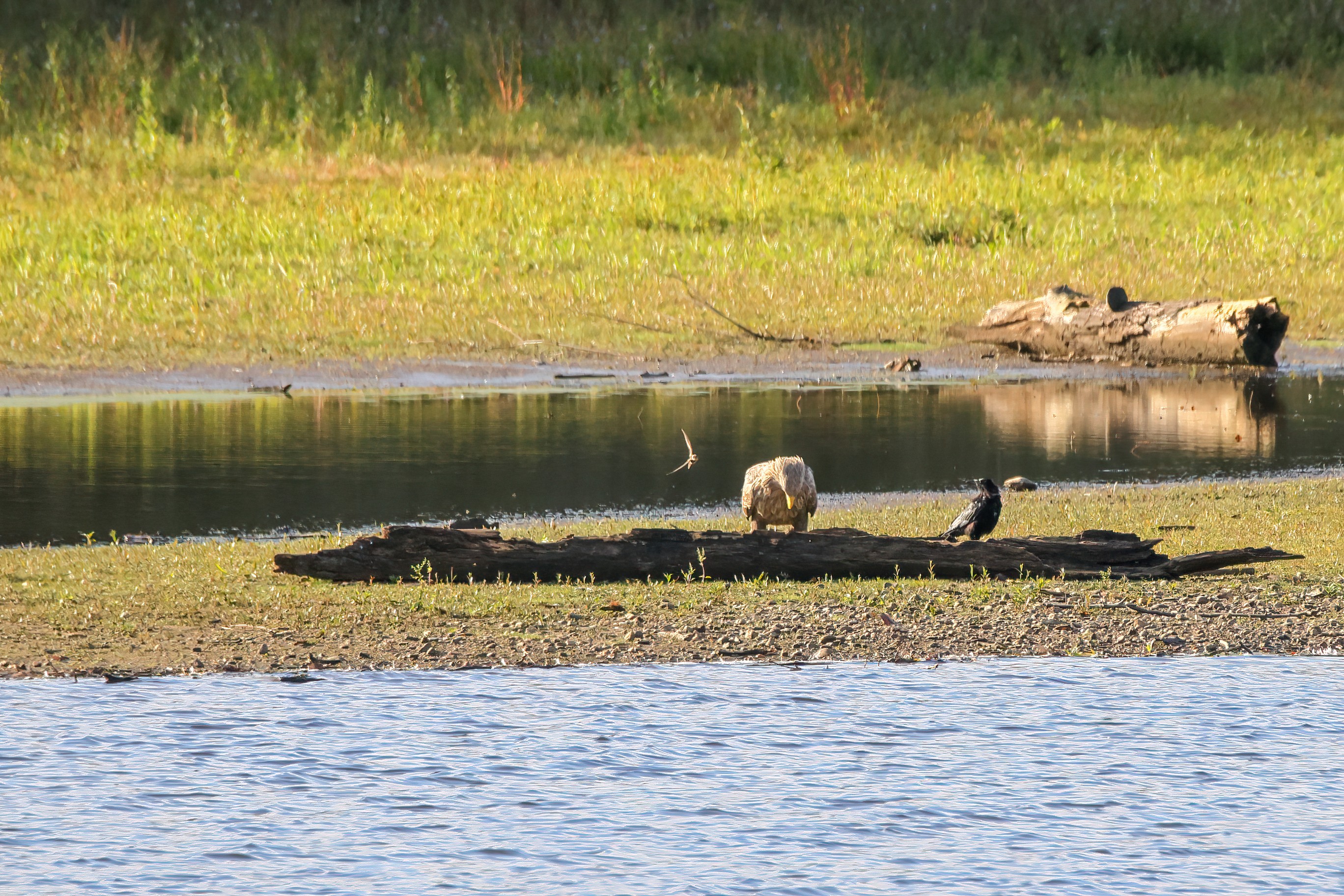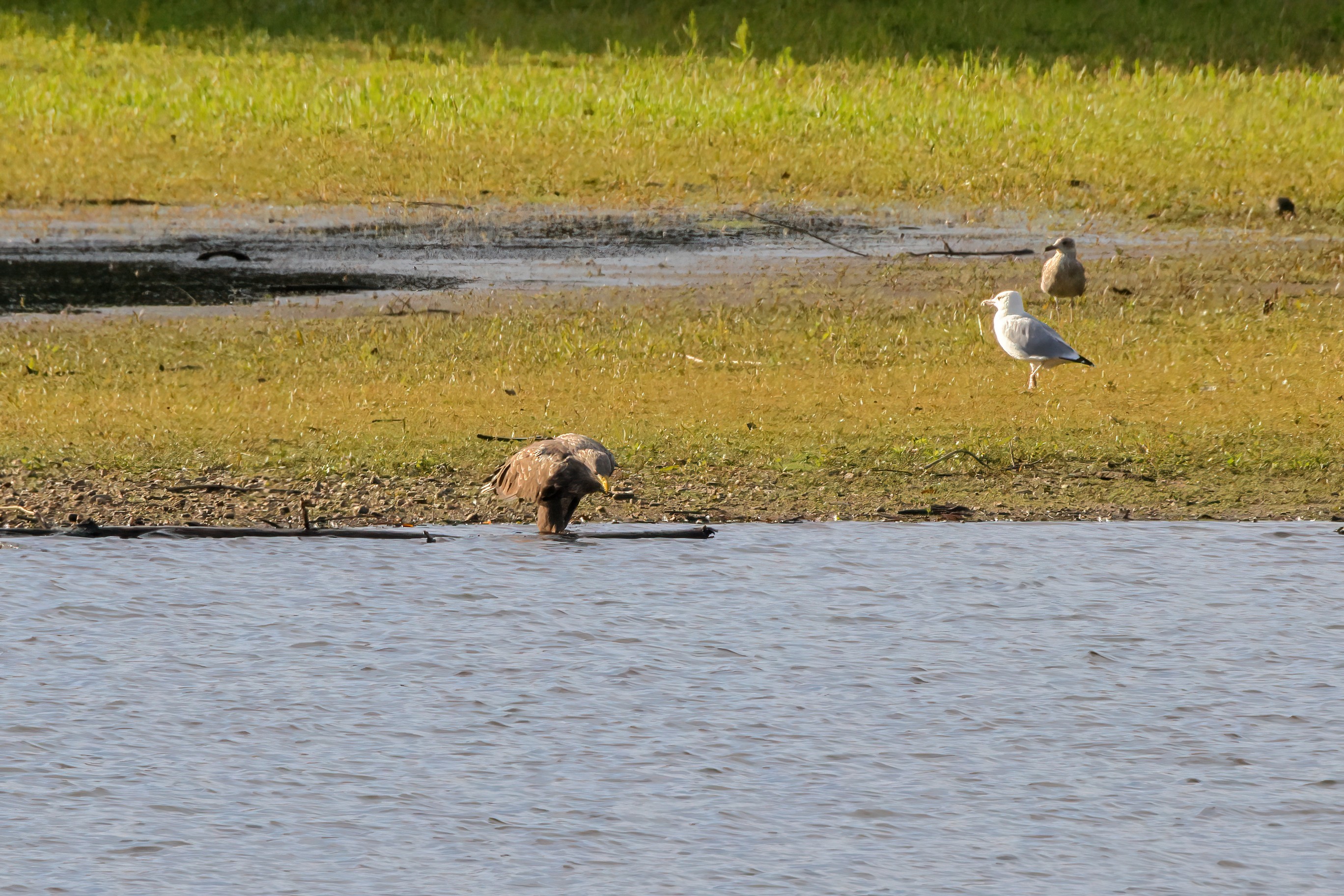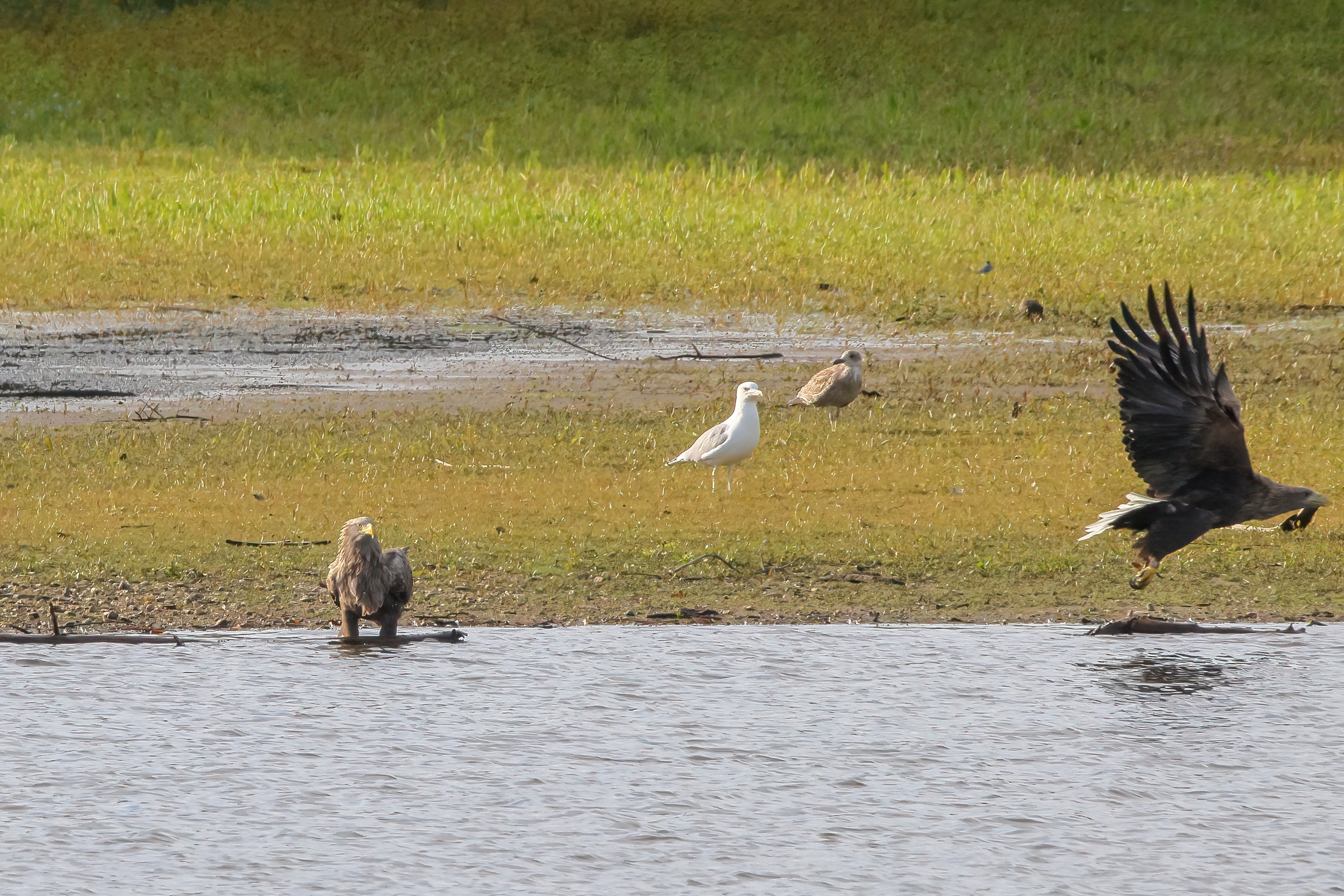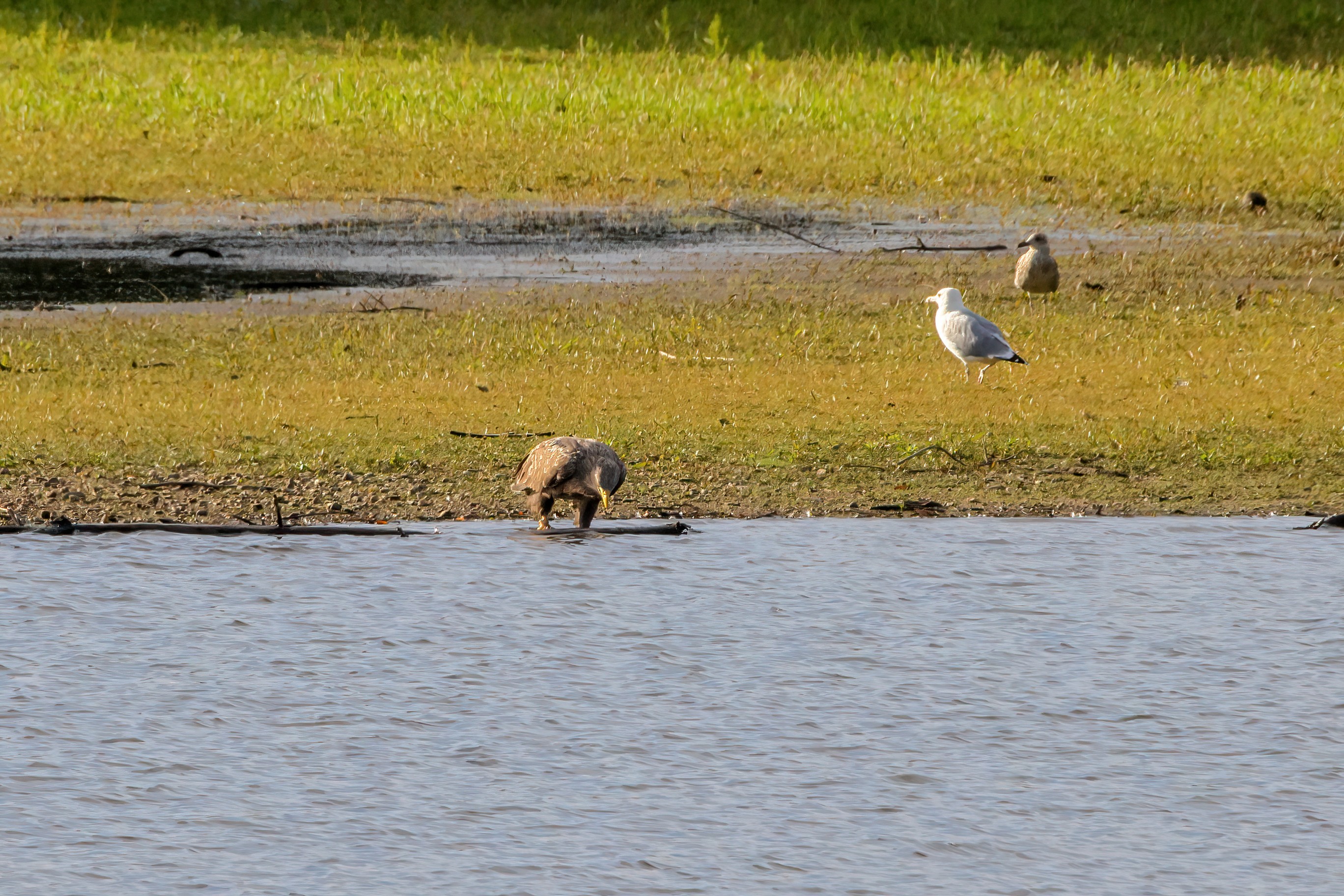 In den vorangegangenen Bildstrecken konnten wir einen Wechsel der Sichtbarkeit des eingedrungenen männlichen Seeadlers sowie des männlichen Habitatsgründers auf der Bislicher Insel nachvollziehen. Am 19. September wurde diese Bildstrecke aus der Beobachtungshütte III aufgenommen, die uns das ursprüngliche Seeadlermännchen in der Gemeinsamkeit mit dem neuen Seeadlerweibchen bei der Nahrungsaufnahme zeigt. Zur Zeit möchte ich keine Prognose über den weiteren Verlauf der hier zu beobachtenden Nähe der beiden Seeadler treffen. Es bleibt abzuwarten wie sich bis zum Jahresende die Seeadler für das kommende Jahr zusammenfinden. Das neue Seeadlerweibchen ist beidseitig beringt, hat dunklere Augen entgegen adulter Artgenossen und verfügt über einen mächtigen Oberkörper. Unser Habitatsgründer ist durch den am rechten Fang befindlichen kupferfarbenen Ring leicht erkennbar.