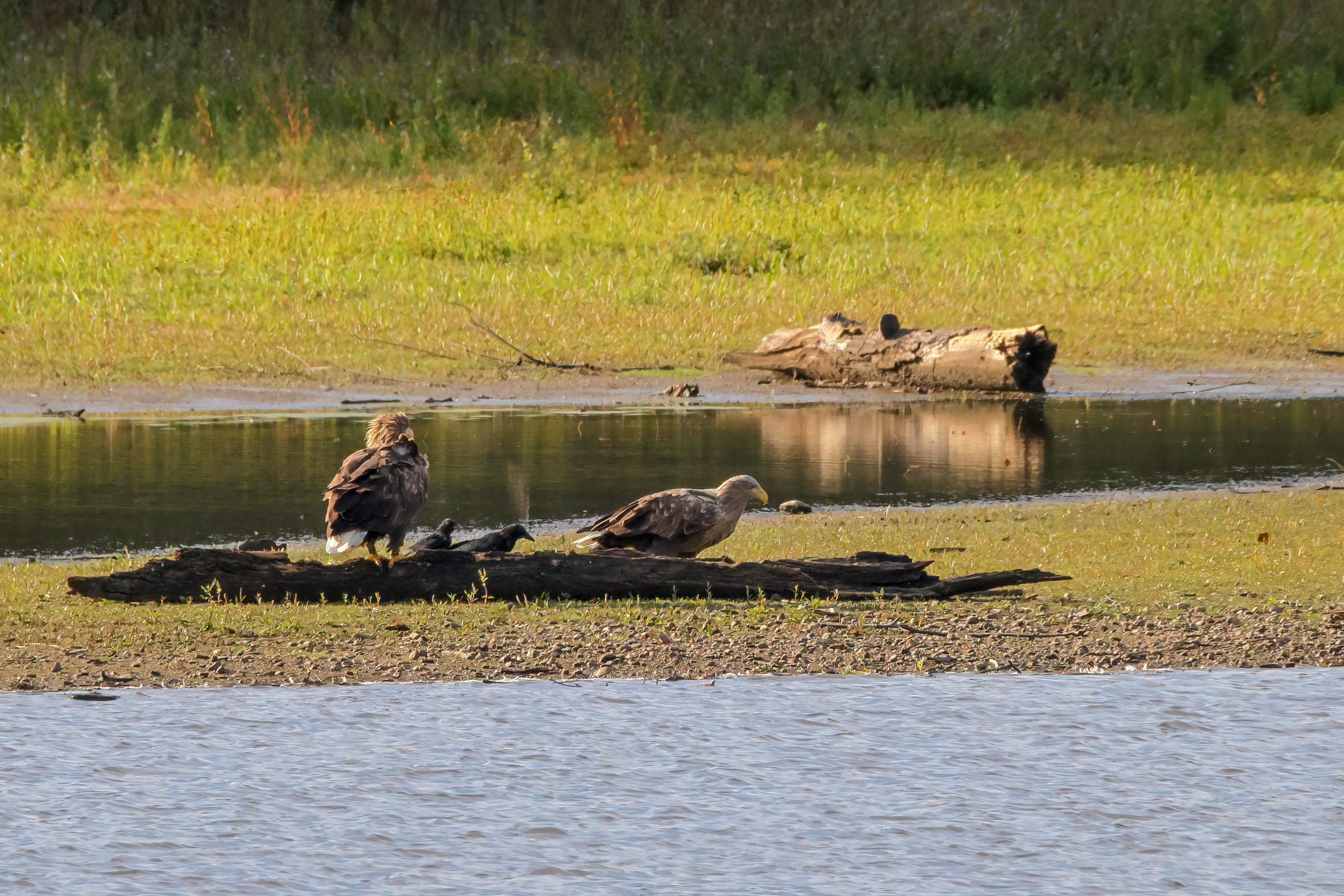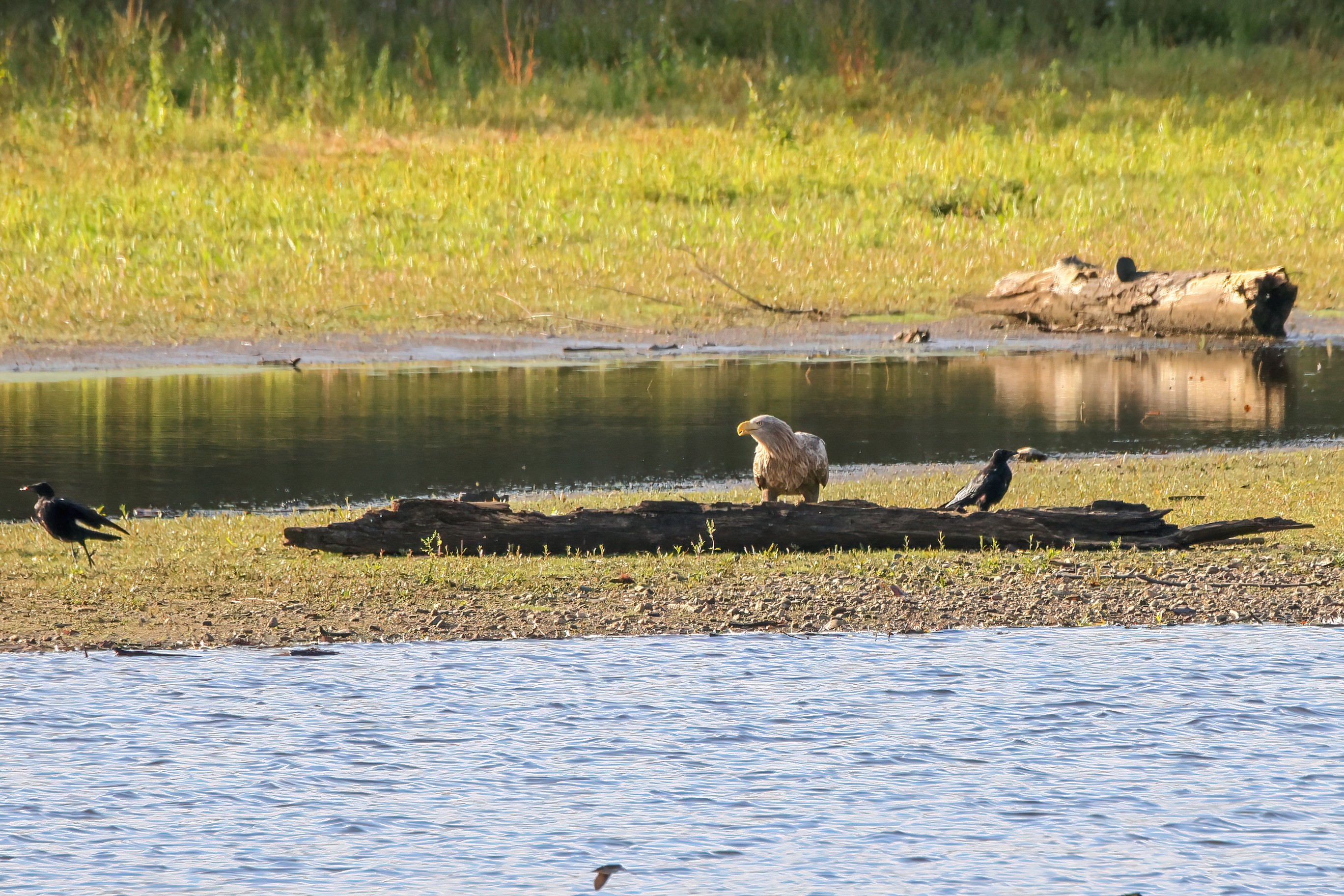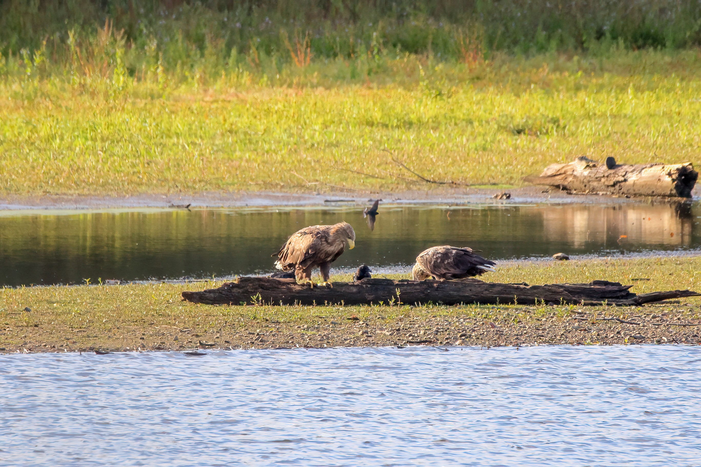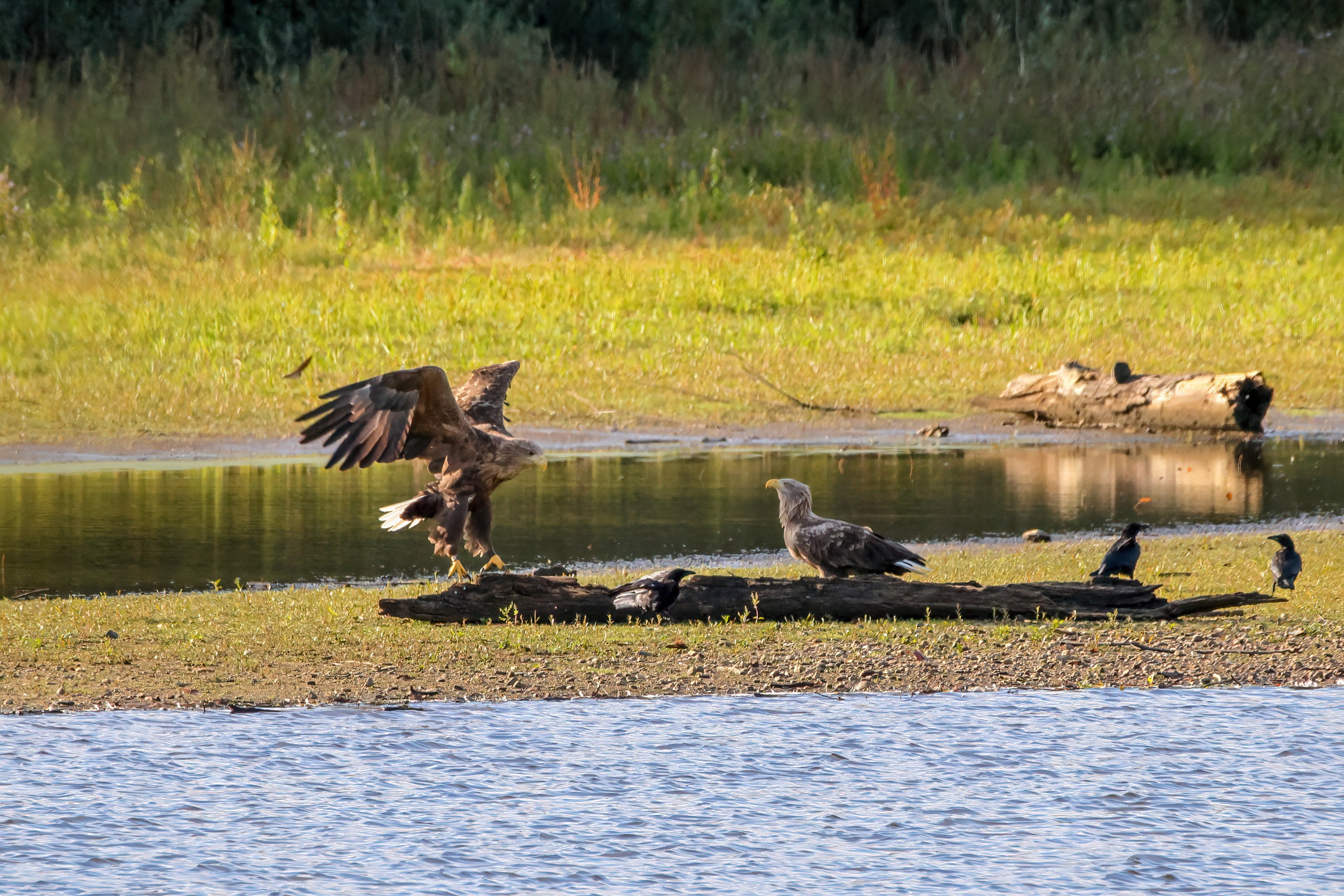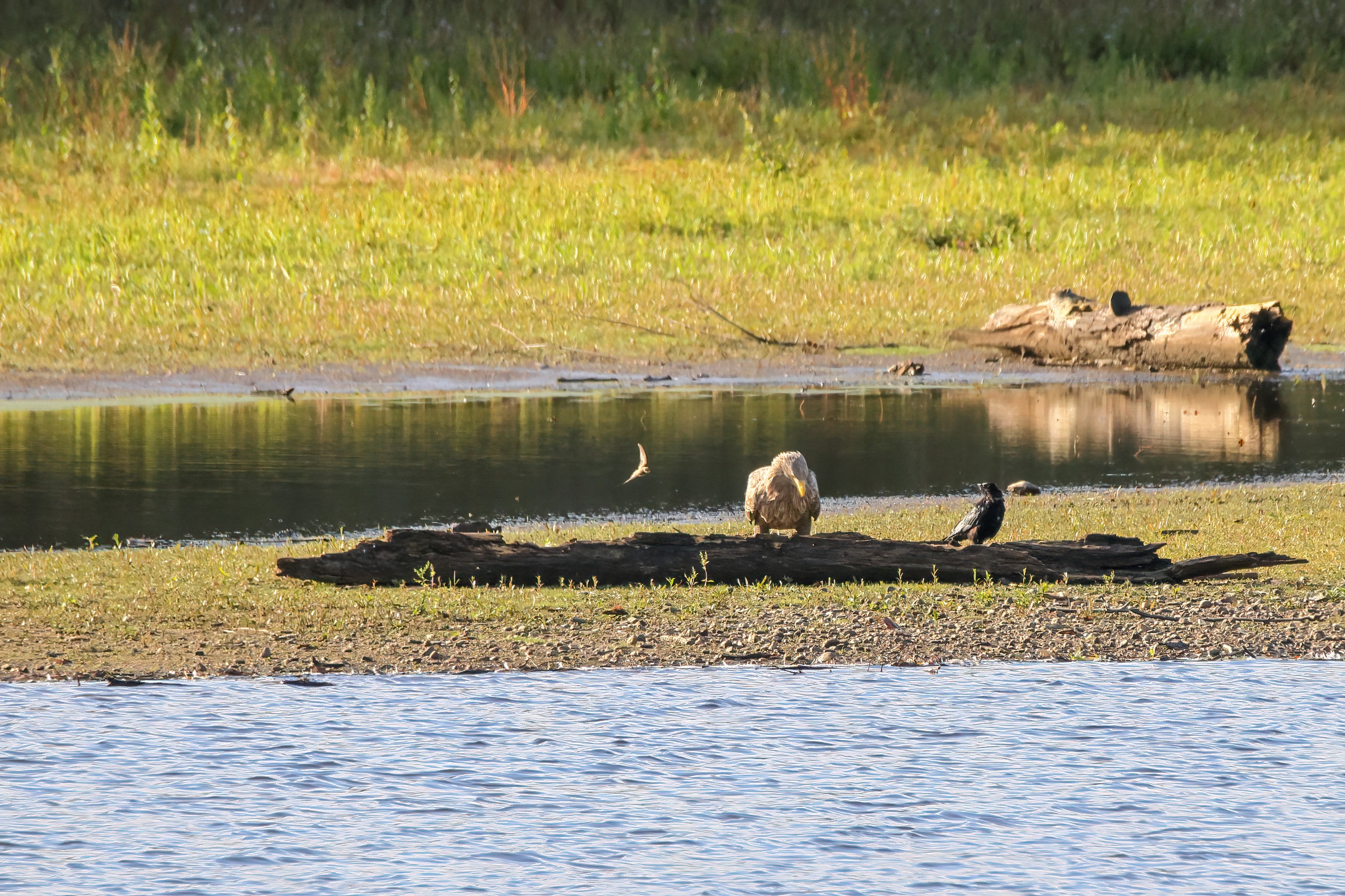 In den vorangegangenen Bildstrecken konnten wir einen Wechsel der Sichtbarkeit des eingedrungenen männlichen Seeadlers sowie des männlichen Habitatsgründers auf der Bislicher Insel nachvollziehen. Am 19. September wurde diese Bildstrecke aus der Beobachtungshütte III aufgenommen, die uns das ursprüngliche Seeadlermännchen in der Gemeinsamkeit mit dem neuen Seeadlerweibchen bei der Nahrungsaufnahme zeigt. Zur Zeit möchte ich keine Prognose über den weiteren Verlauf der hier zu beobachtenden Nähe der beiden Seeadler treffen. Es bleibt abzuwarten wie sich bis zum Jahresende die Seeadler für das kommende Jahr zusammenfinden. Das neue Seeadlerweibchen ist beidseitig beringt, hat dunklere Augen entgegen adulter Artgenossen und verfügt über einen mächtigen Oberkörper. Unser Habitatsgründer ist durch den am rechten Fang befindlichen kupferfarbenen Ring leicht erkennbar.