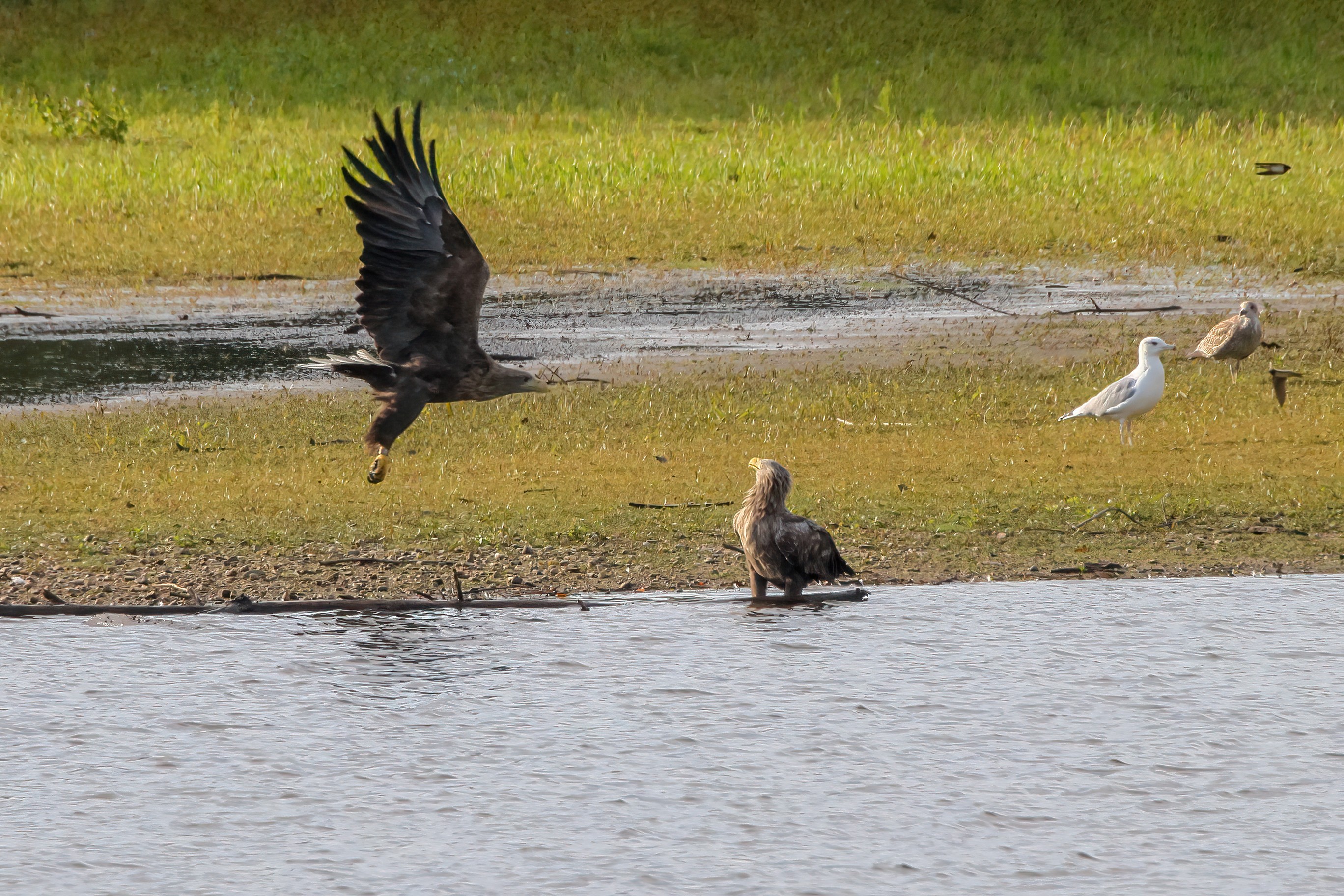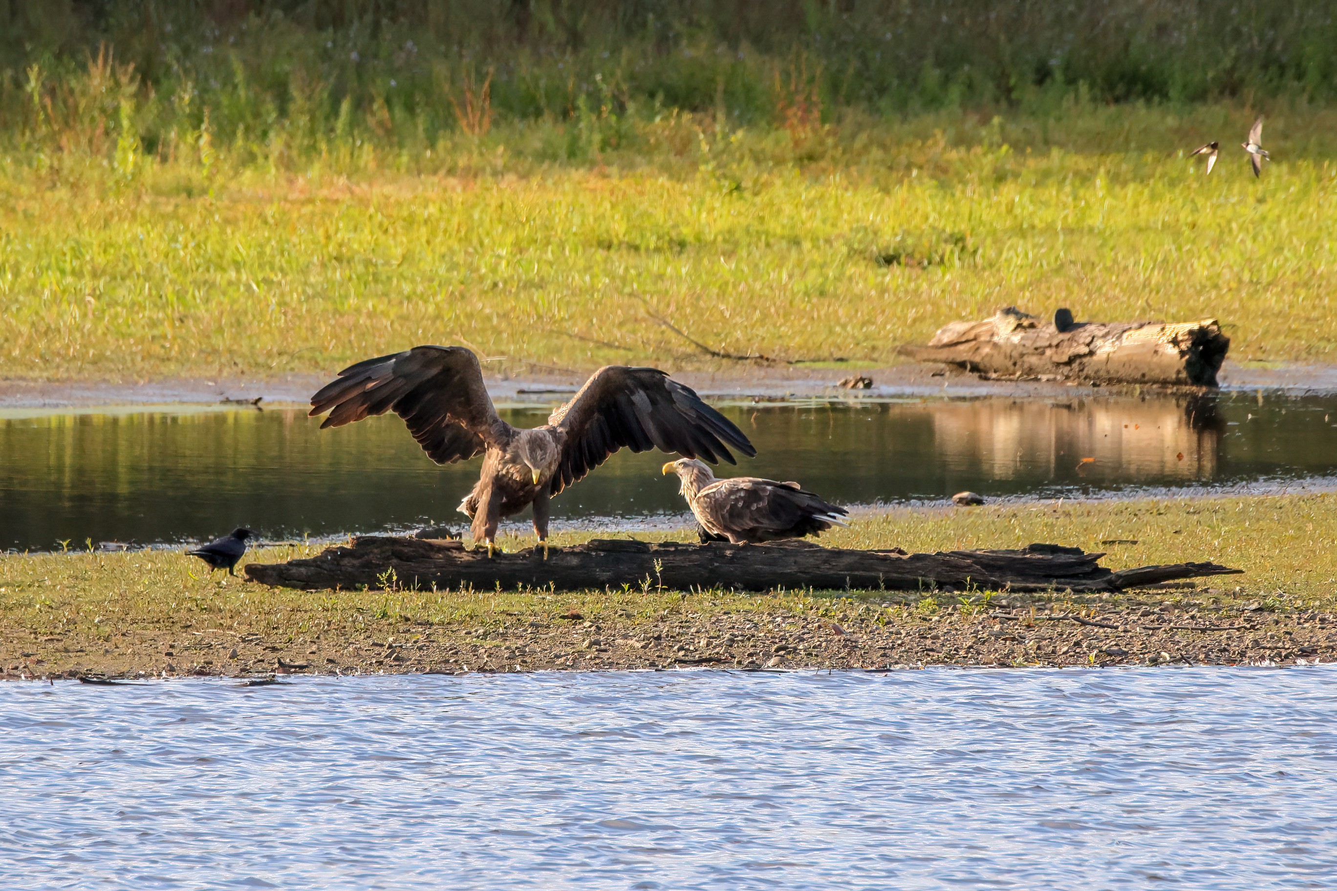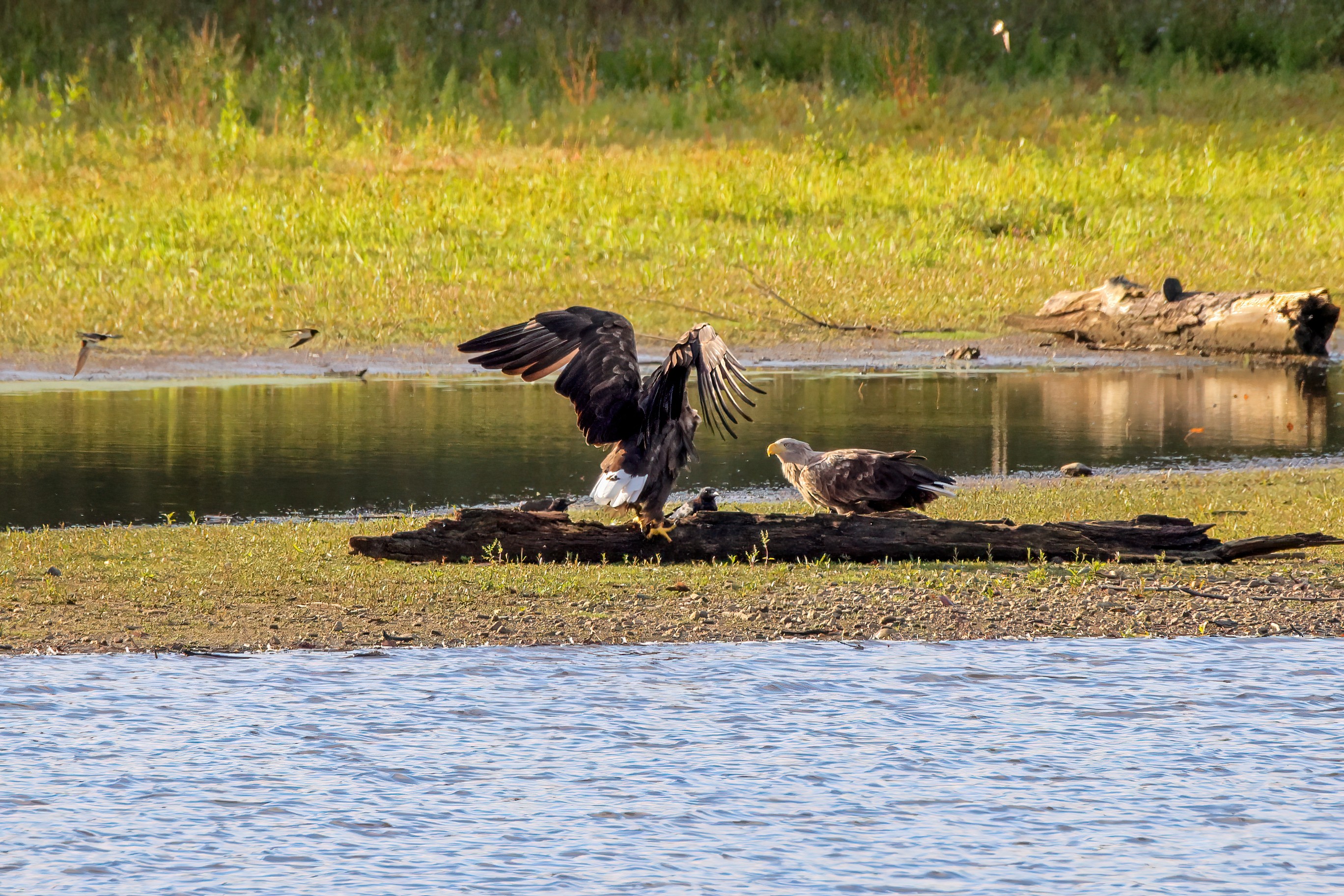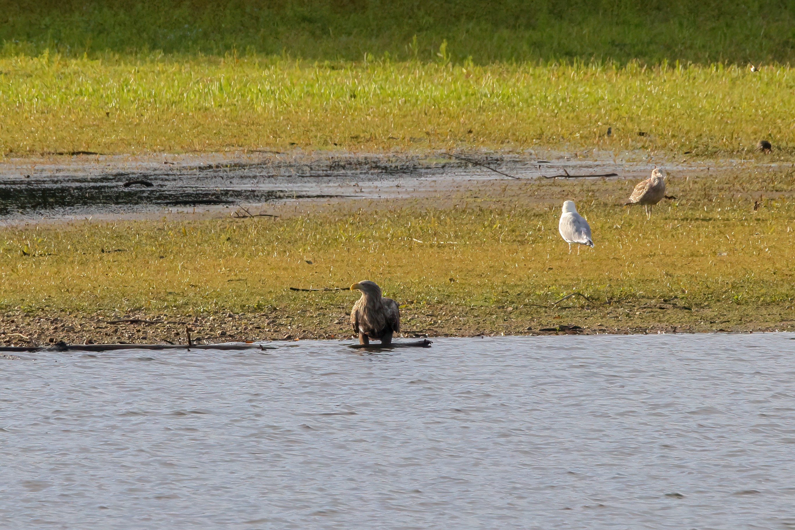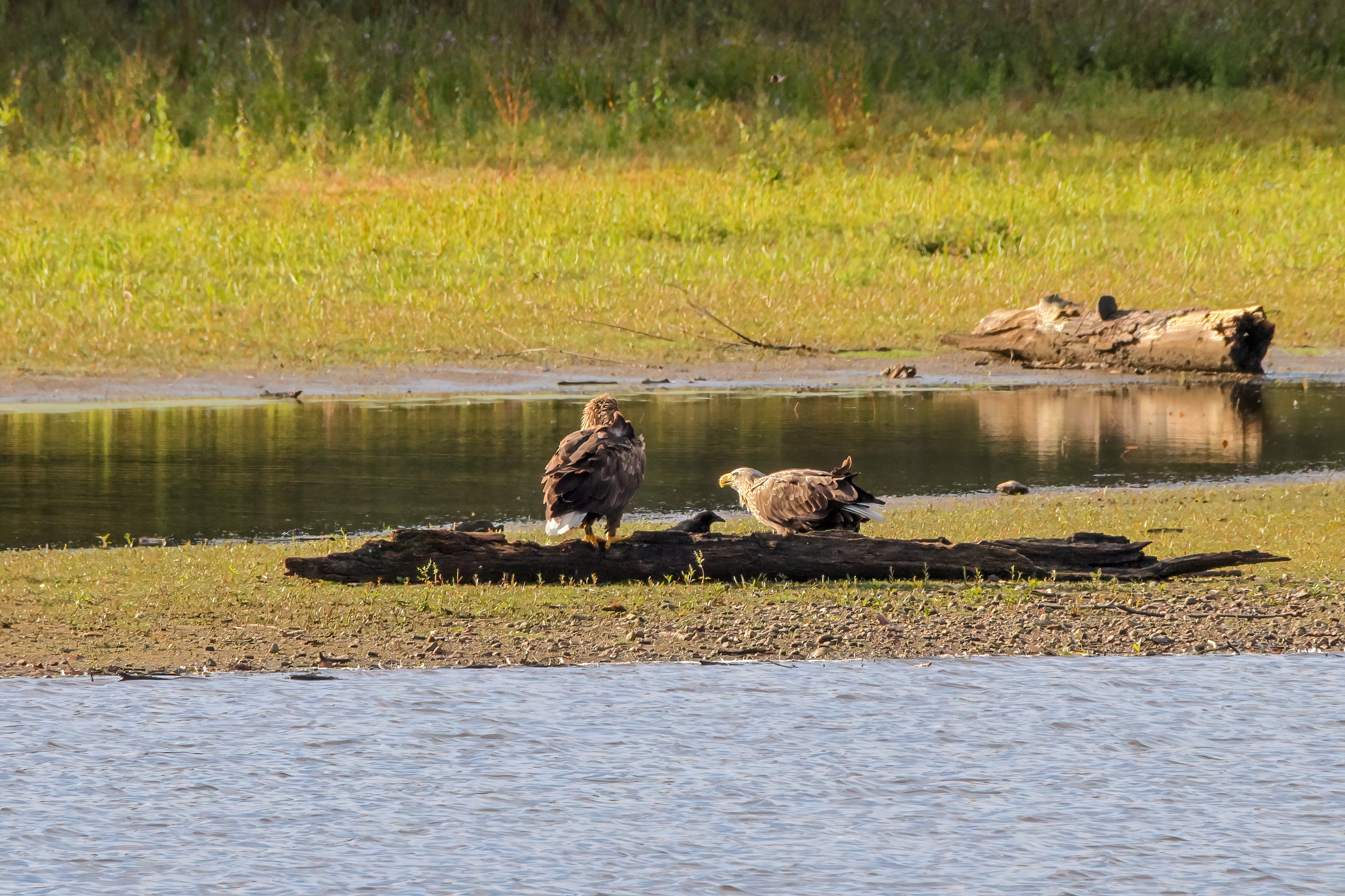 In den vorangegangenen Bildstrecken konnten wir einen Wechsel der Sichtbarkeit des eingedrungenen männlichen Seeadlers sowie des männlichen Habitatsgründers auf der Bislicher Insel nachvollziehen. Am 19. September wurde diese Bildstrecke aus der Beobachtungshütte III aufgenommen, die uns das ursprüngliche Seeadlermännchen in der Gemeinsamkeit mit dem neuen Seeadlerweibchen bei der Nahrungsaufnahme zeigt. Zur Zeit möchte ich keine Prognose über den weiteren Verlauf der hier zu beobachtenden Nähe der beiden Seeadler treffen. Es bleibt abzuwarten wie sich bis zum Jahresende die Seeadler für das kommende Jahr zusammenfinden. Das neue Seeadlerweibchen ist beidseitig beringt, hat dunklere Augen entgegen adulter Artgenossen und verfügt über einen mächtigen Oberkörper. Unser Habitatsgründer ist durch den am rechten Fang befindlichen kupferfarbenen Ring leicht erkennbar.