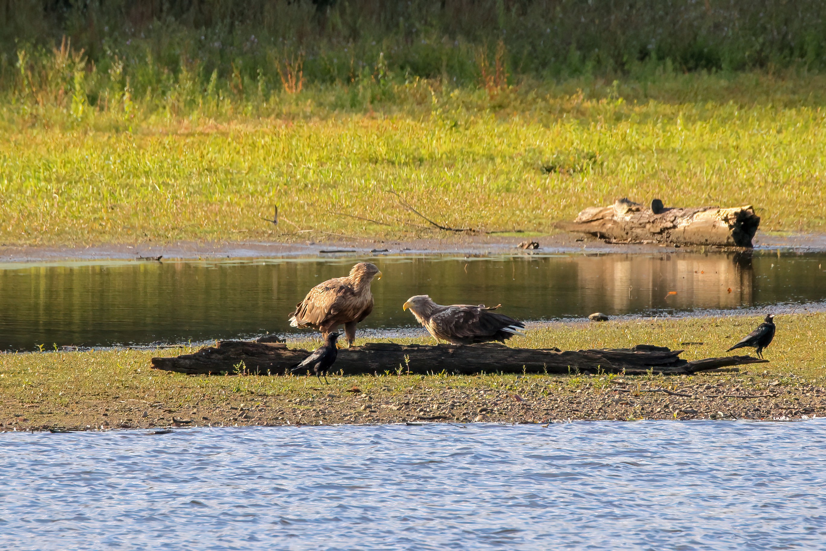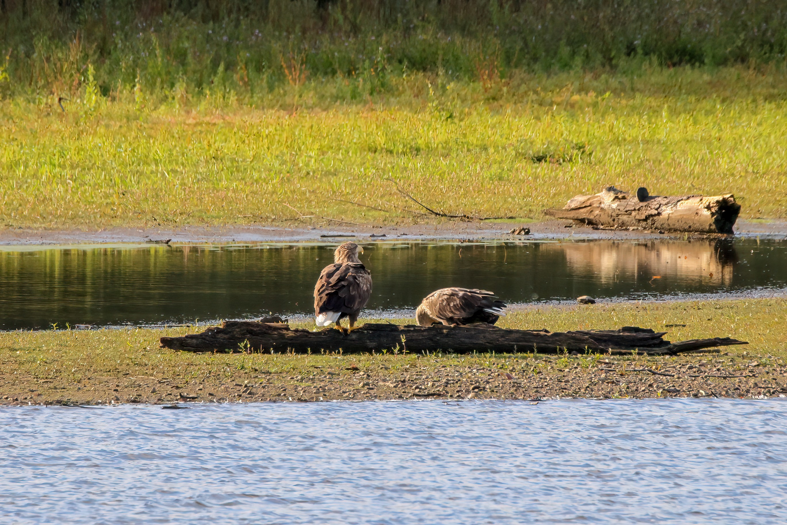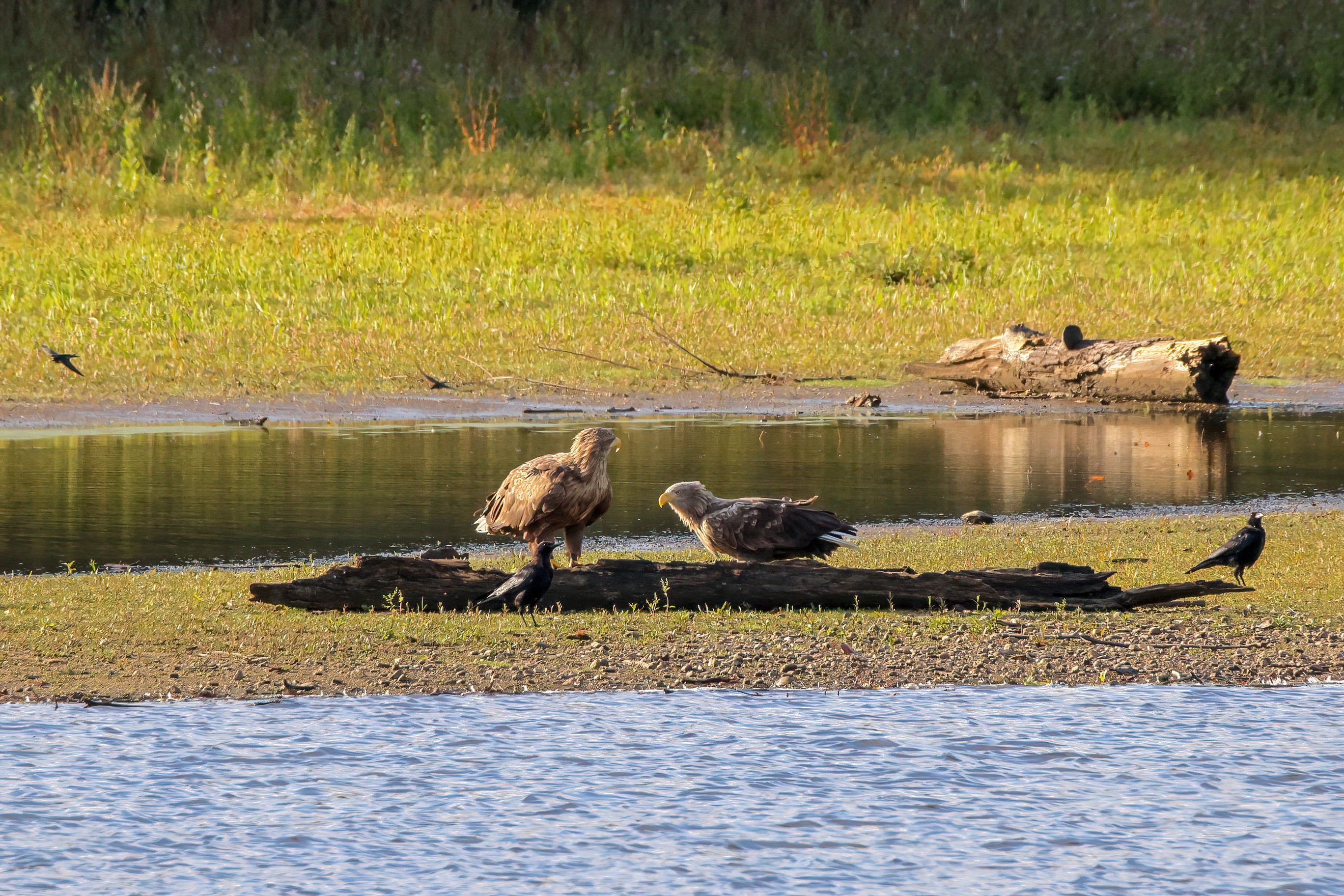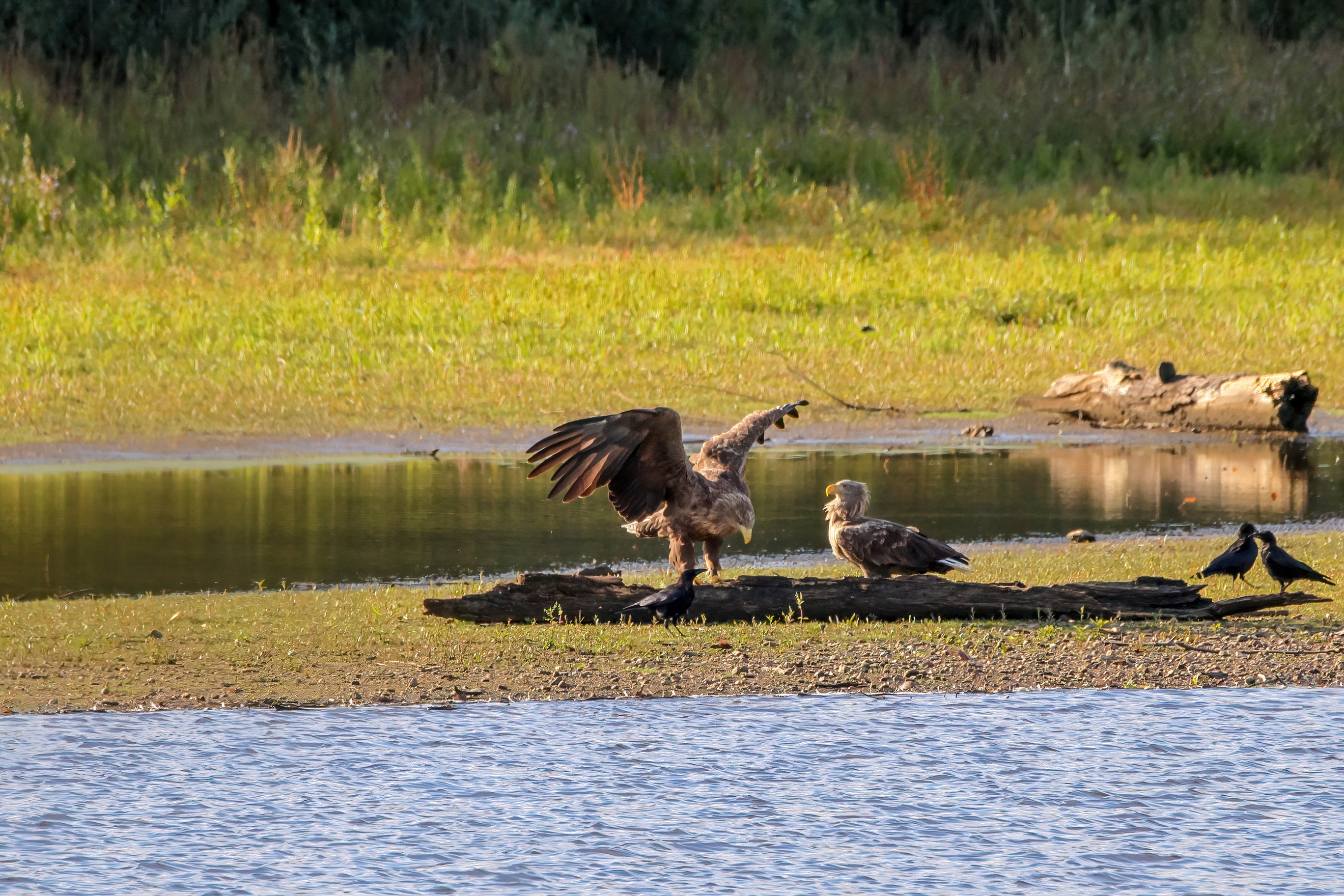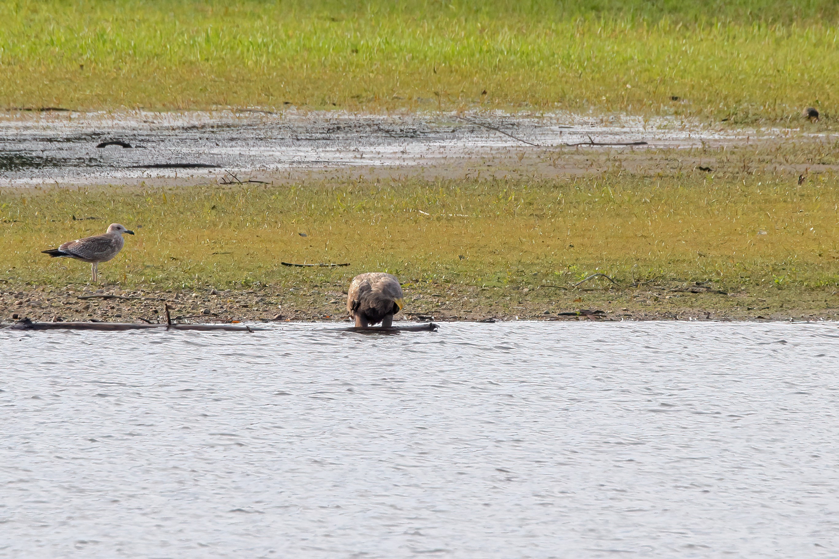 In den vorangegangenen Bildstrecken konnten wir einen Wechsel der Sichtbarkeit des eingedrungenen männlichen Seeadlers sowie des männlichen Habitatsgründers auf der Bislicher Insel nachvollziehen. Am 19. September wurde diese Bildstrecke aus der Beobachtungshütte III aufgenommen, die uns das ursprüngliche Seeadlermännchen in der Gemeinsamkeit mit dem neuen Seeadlerweibchen bei der Nahrungsaufnahme zeigt. Zur Zeit möchte ich keine Prognose über den weiteren Verlauf der hier zu beobachtenden Nähe der beiden Seeadler treffen. Es bleibt abzuwarten wie sich bis zum Jahresende die Seeadler für das kommende Jahr zusammenfinden. Das neue Seeadlerweibchen ist beidseitig beringt, hat dunklere Augen entgegen adulter Artgenossen und verfügt über einen mächtigen Oberkörper. Unser Habitatsgründer ist durch den am rechten Fang befindlichen kupferfarbenen Ring leicht erkennbar.