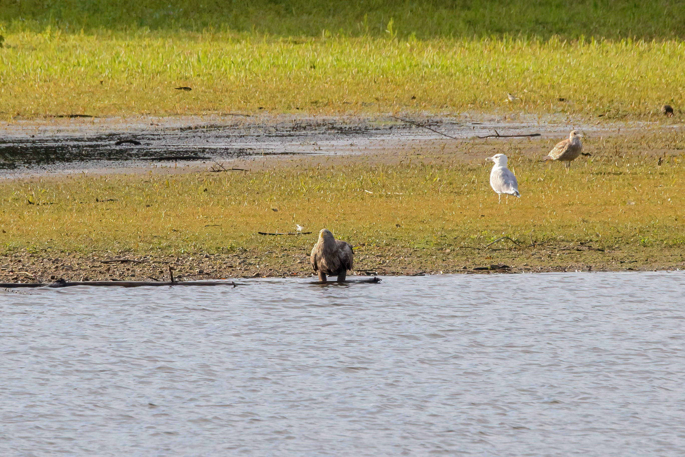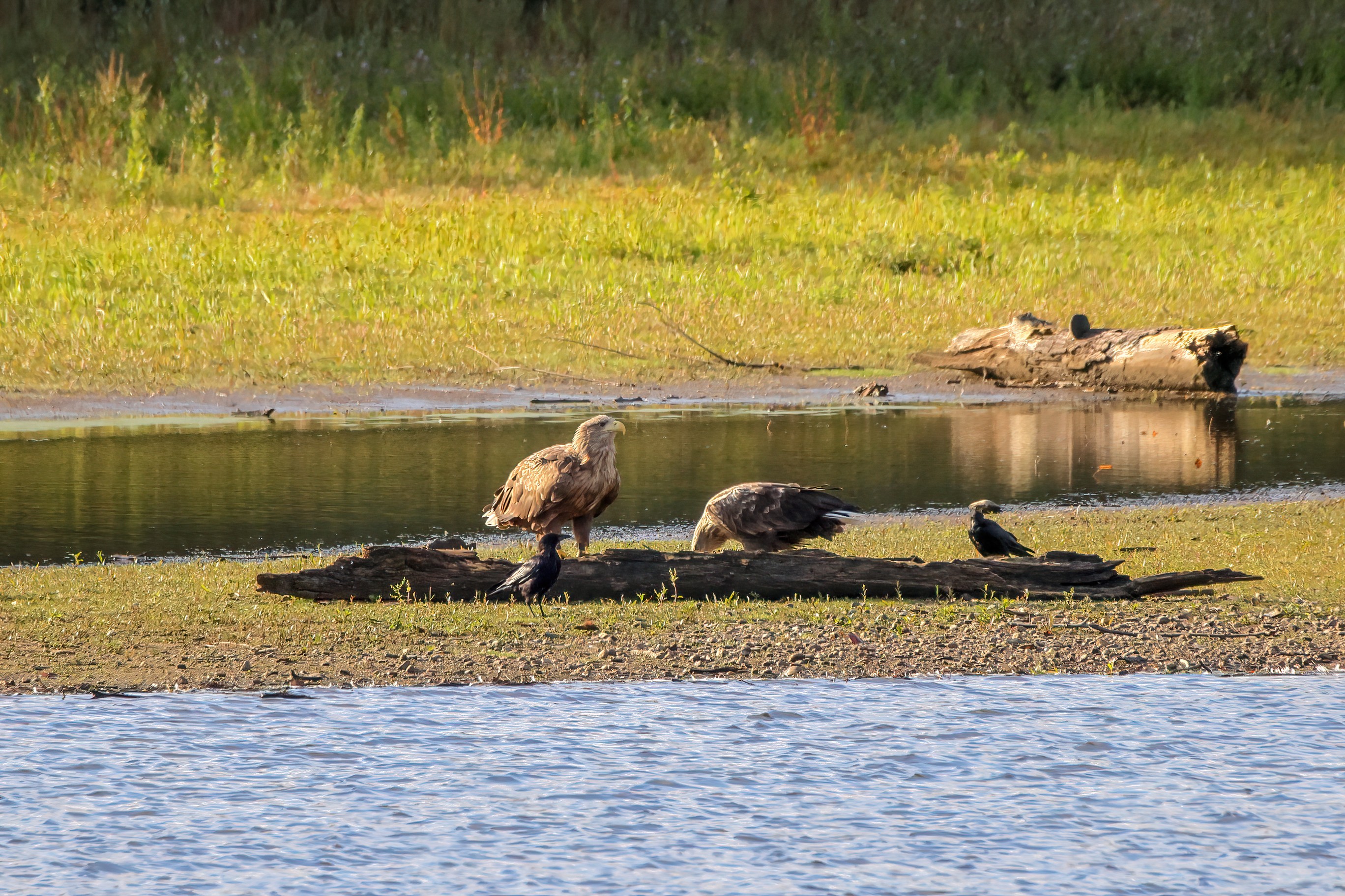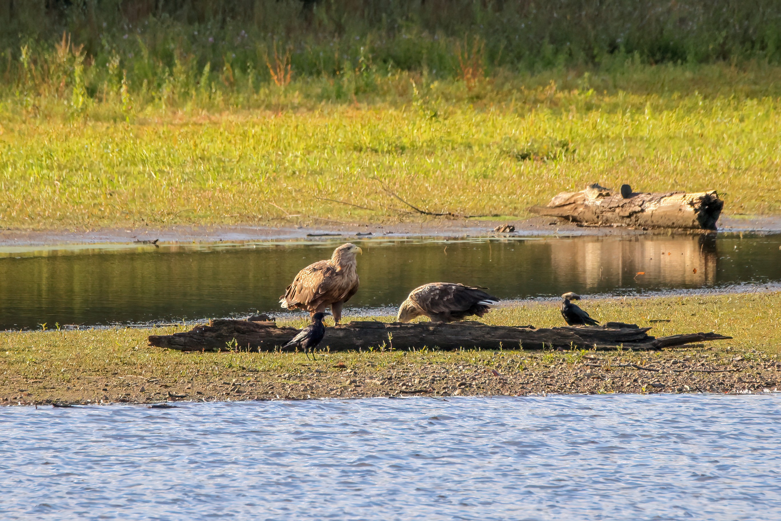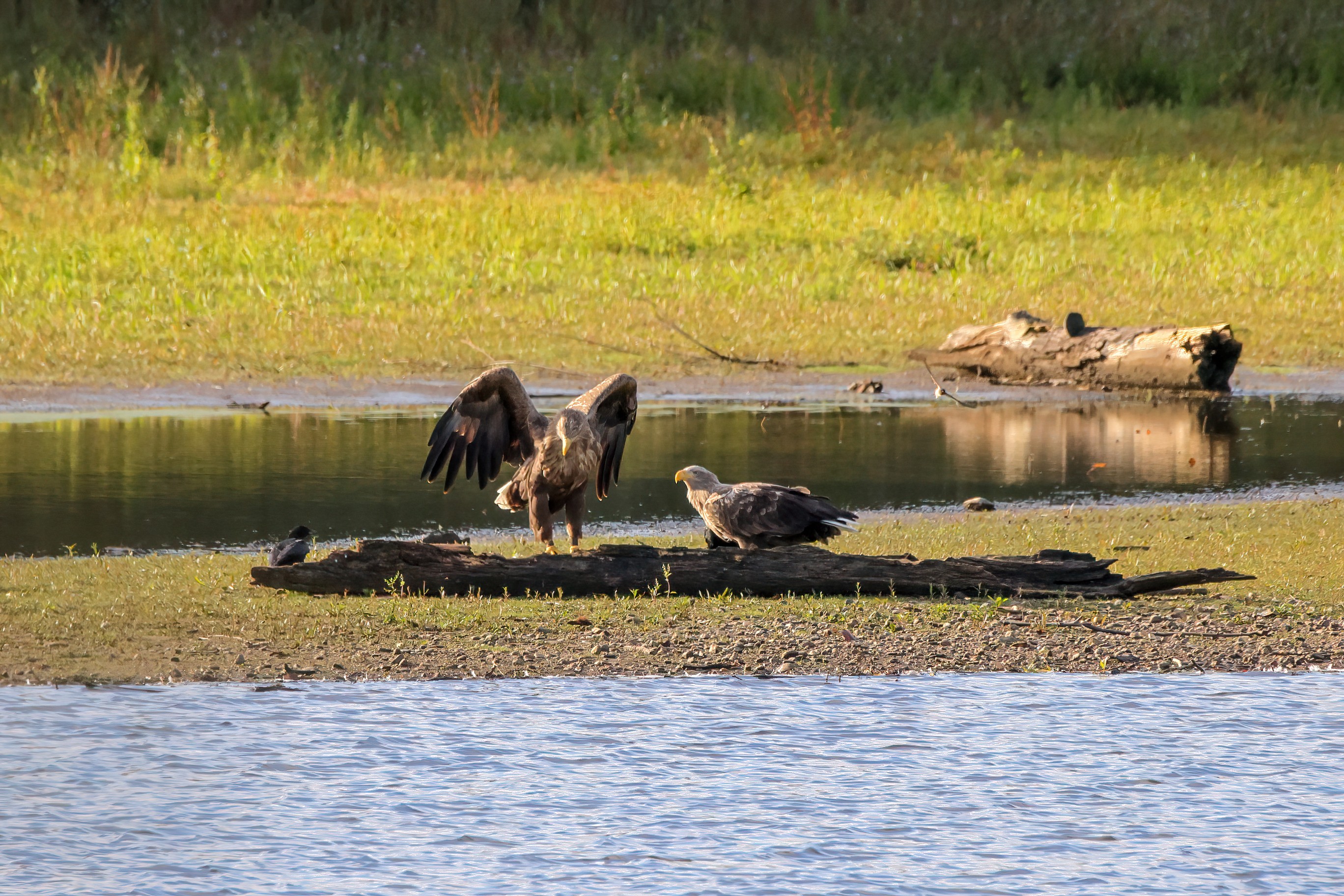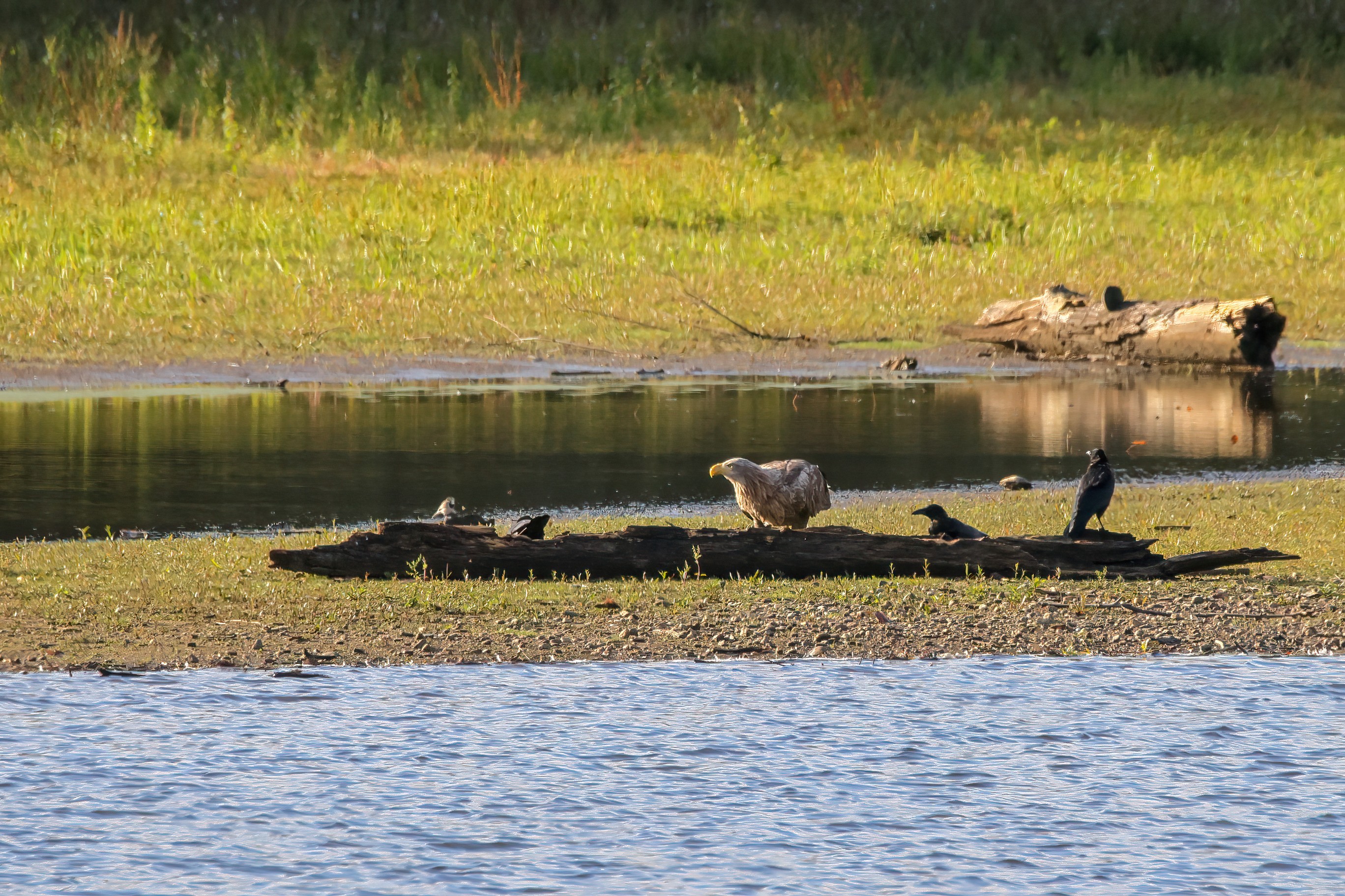 In den vorangegangenen Bildstrecken konnten wir einen Wechsel der Sichtbarkeit des eingedrungenen männlichen Seeadlers sowie des männlichen Habitatsgründers auf der Bislicher Insel nachvollziehen. Am 19. September wurde diese Bildstrecke aus der Beobachtungshütte III aufgenommen, die uns das ursprüngliche Seeadlermännchen in der Gemeinsamkeit mit dem neuen Seeadlerweibchen bei der Nahrungsaufnahme zeigt. Zur Zeit möchte ich keine Prognose über den weiteren Verlauf der hier zu beobachtenden Nähe der beiden Seeadler treffen. Es bleibt abzuwarten wie sich bis zum Jahresende die Seeadler für das kommende Jahr zusammenfinden. Das neue Seeadlerweibchen ist beidseitig beringt, hat dunklere Augen entgegen adulter Artgenossen und verfügt über einen mächtigen Oberkörper. Unser Habitatsgründer ist durch den am rechten Fang befindlichen kupferfarbenen Ring leicht erkennbar.