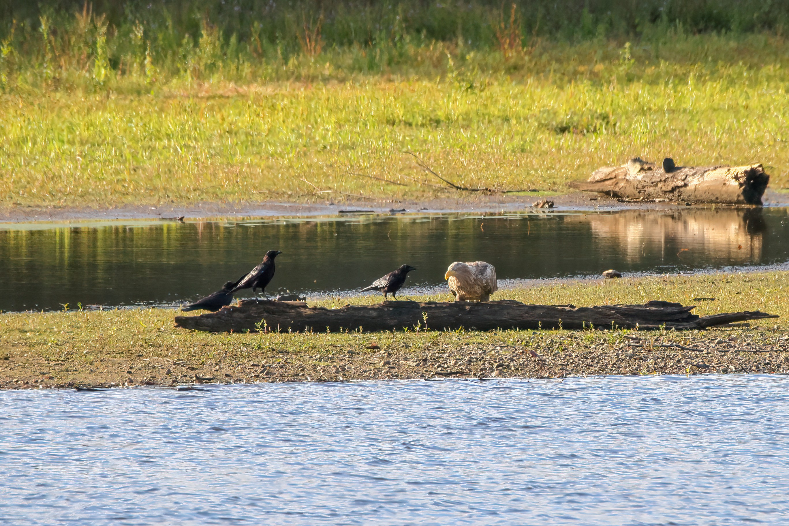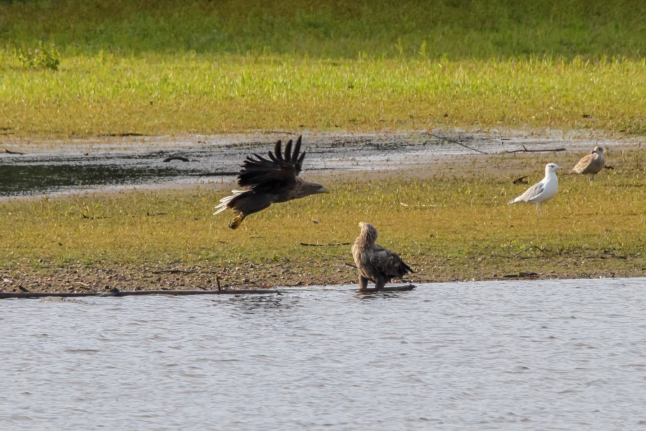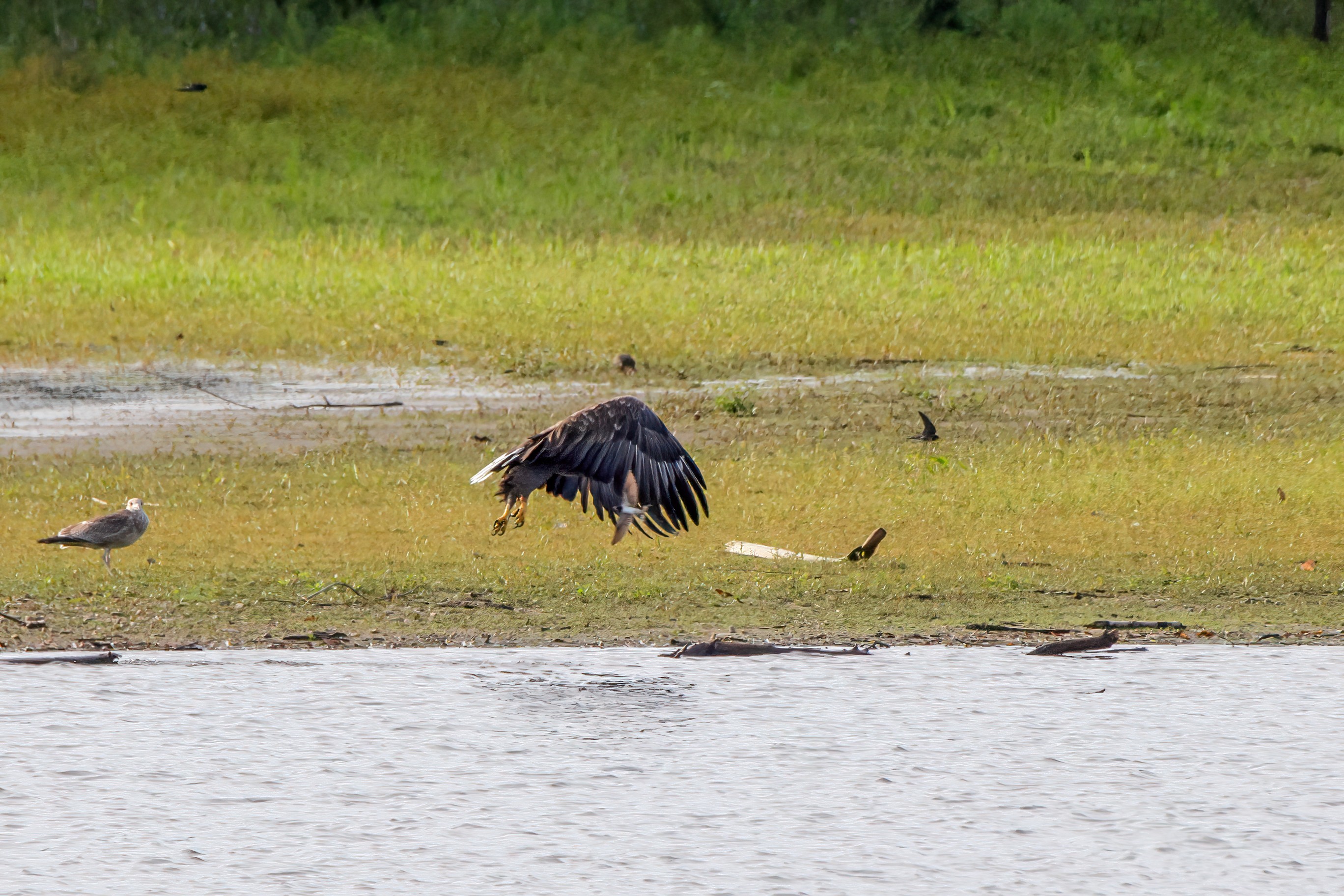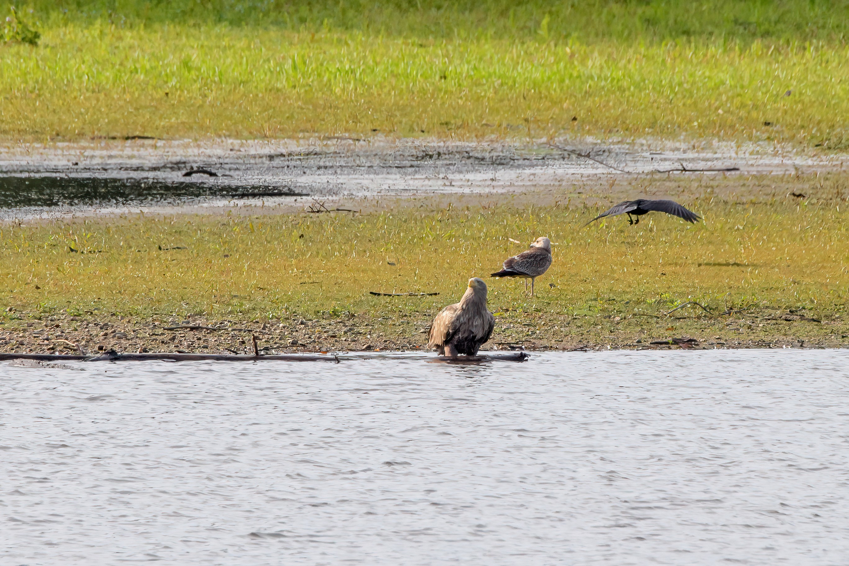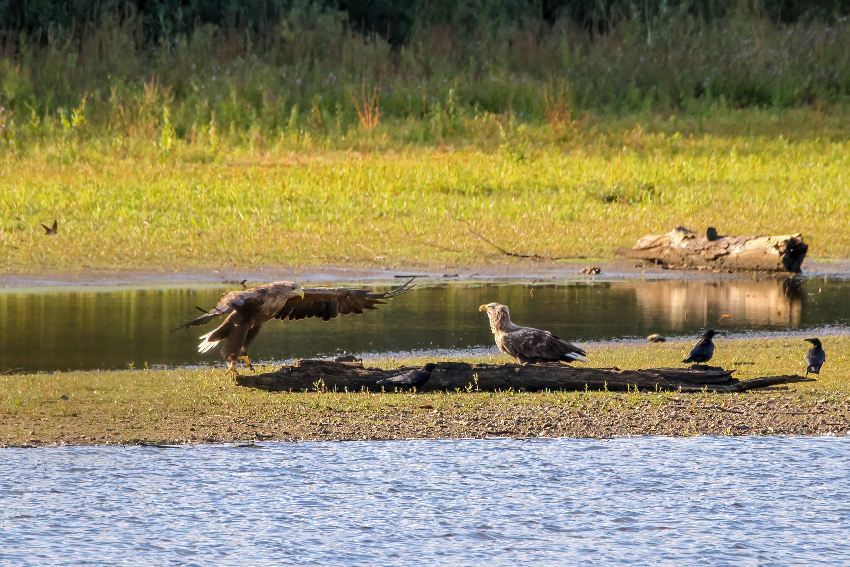 In den vorangegangenen Bildstrecken konnten wir einen Wechsel der Sichtbarkeit des eingedrungenen männlichen Seeadlers sowie des männlichen Habitatsgründers auf der Bislicher Insel nachvollziehen. Am 19. September wurde diese Bildstrecke aus der Beobachtungshütte III aufgenommen, die uns das ursprüngliche Seeadlermännchen in der Gemeinsamkeit mit dem neuen Seeadlerweibchen bei der Nahrungsaufnahme zeigt. Zur Zeit möchte ich keine Prognose über den weiteren Verlauf der hier zu beobachtenden Nähe der beiden Seeadler treffen. Es bleibt abzuwarten wie sich bis zum Jahresende die Seeadler für das kommende Jahr zusammenfinden. Das neue Seeadlerweibchen ist beidseitig beringt, hat dunklere Augen entgegen adulter Artgenossen und verfügt über einen mächtigen Oberkörper. Unser Habitatsgründer ist durch den am rechten Fang befindlichen kupferfarbenen Ring leicht erkennbar.
