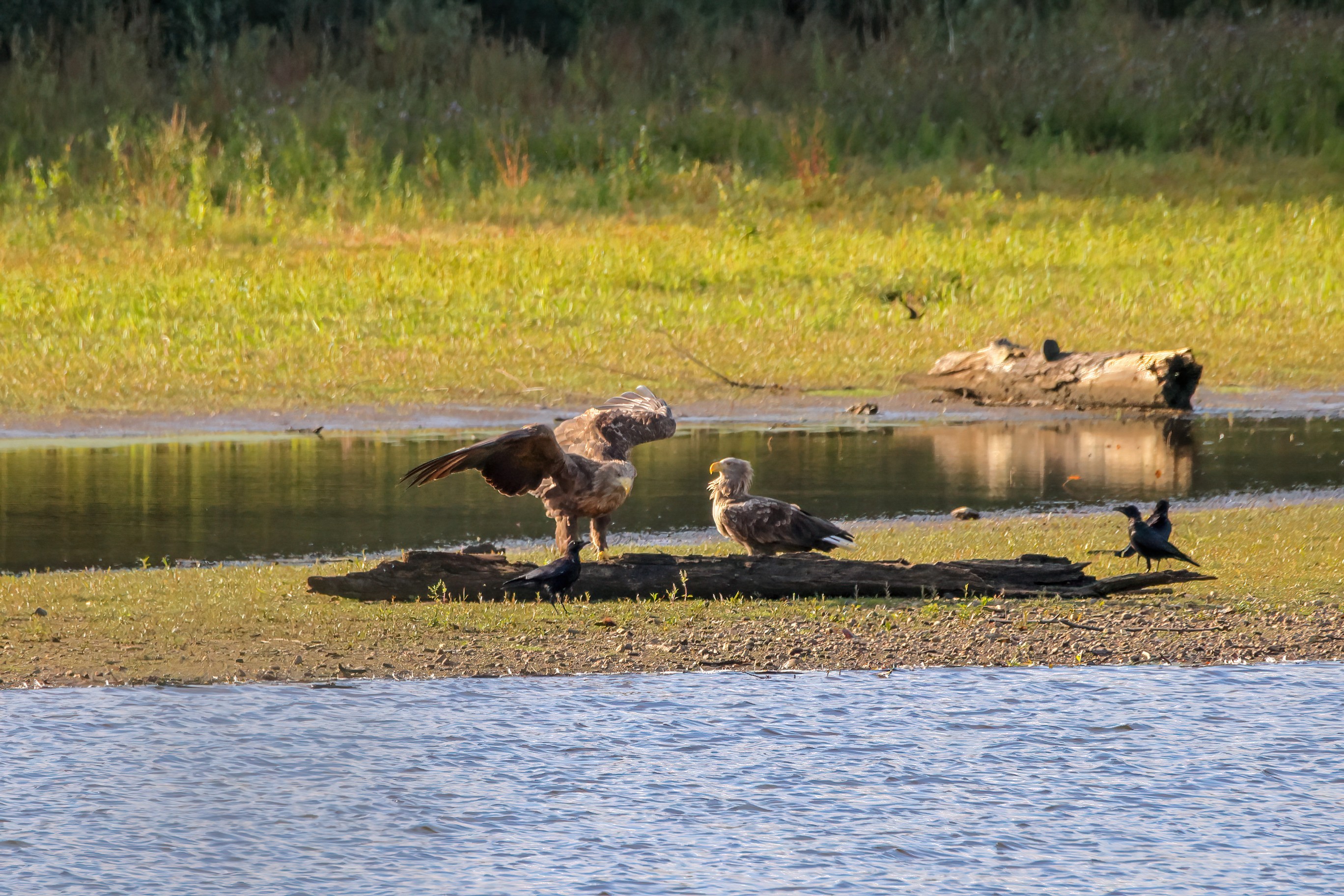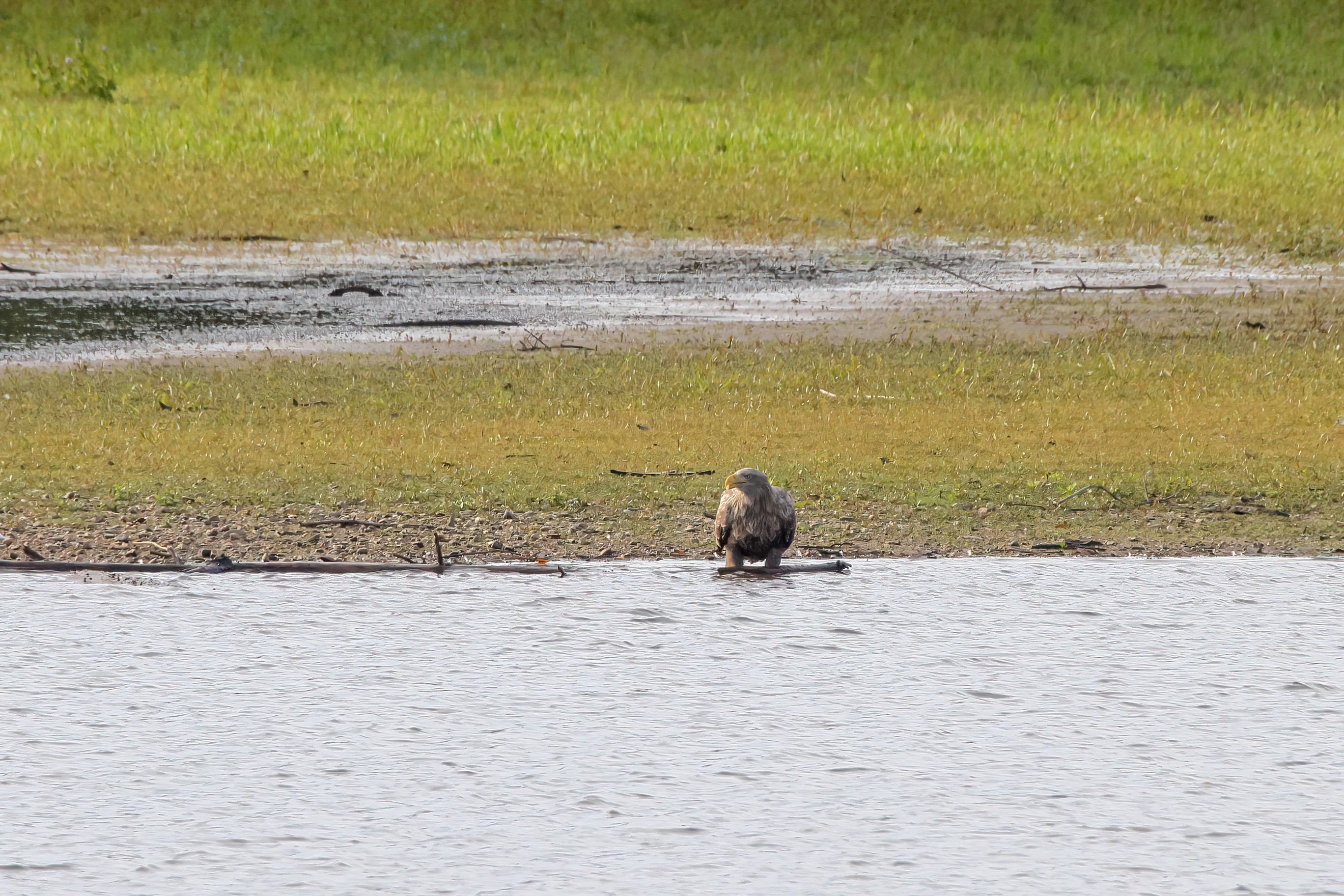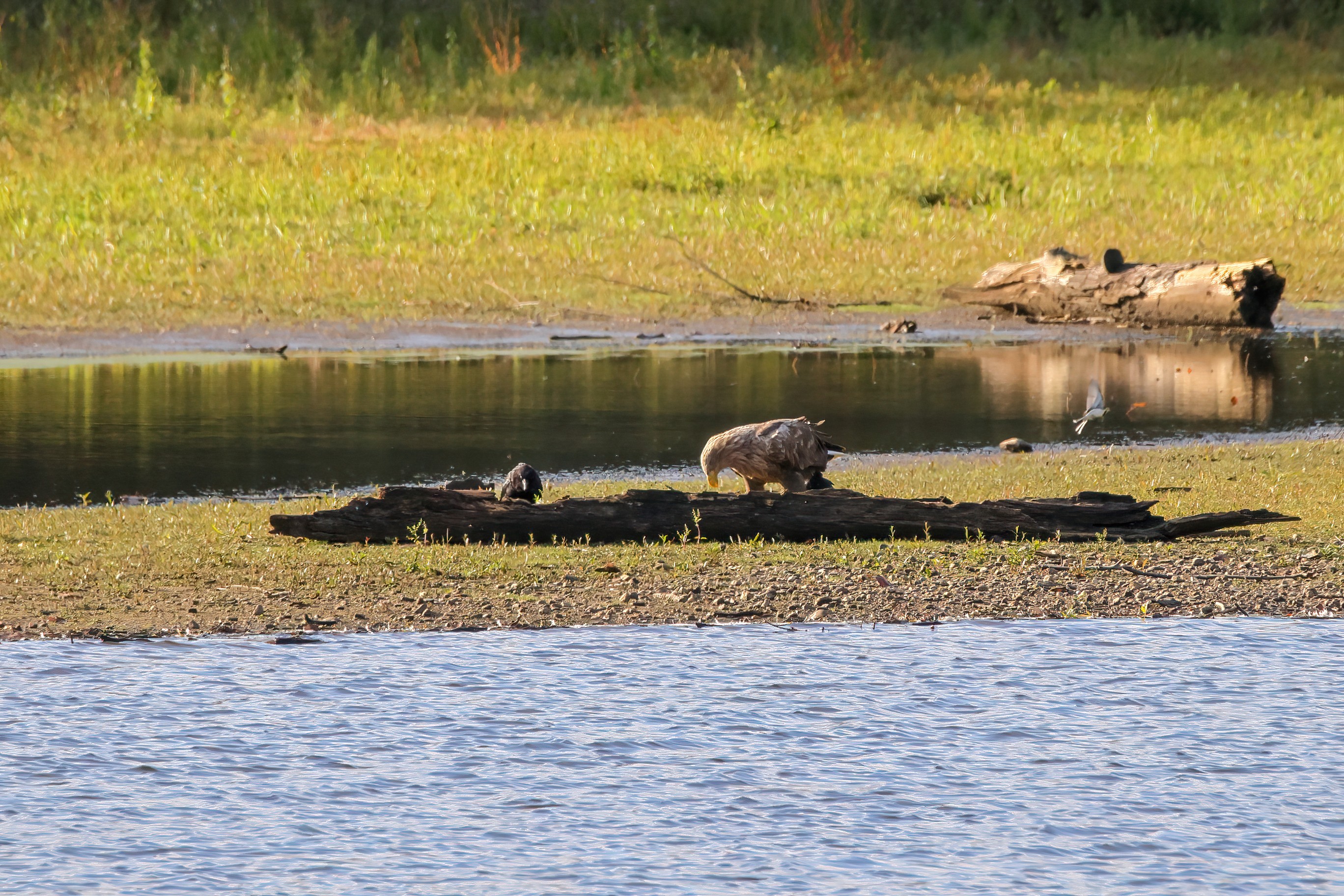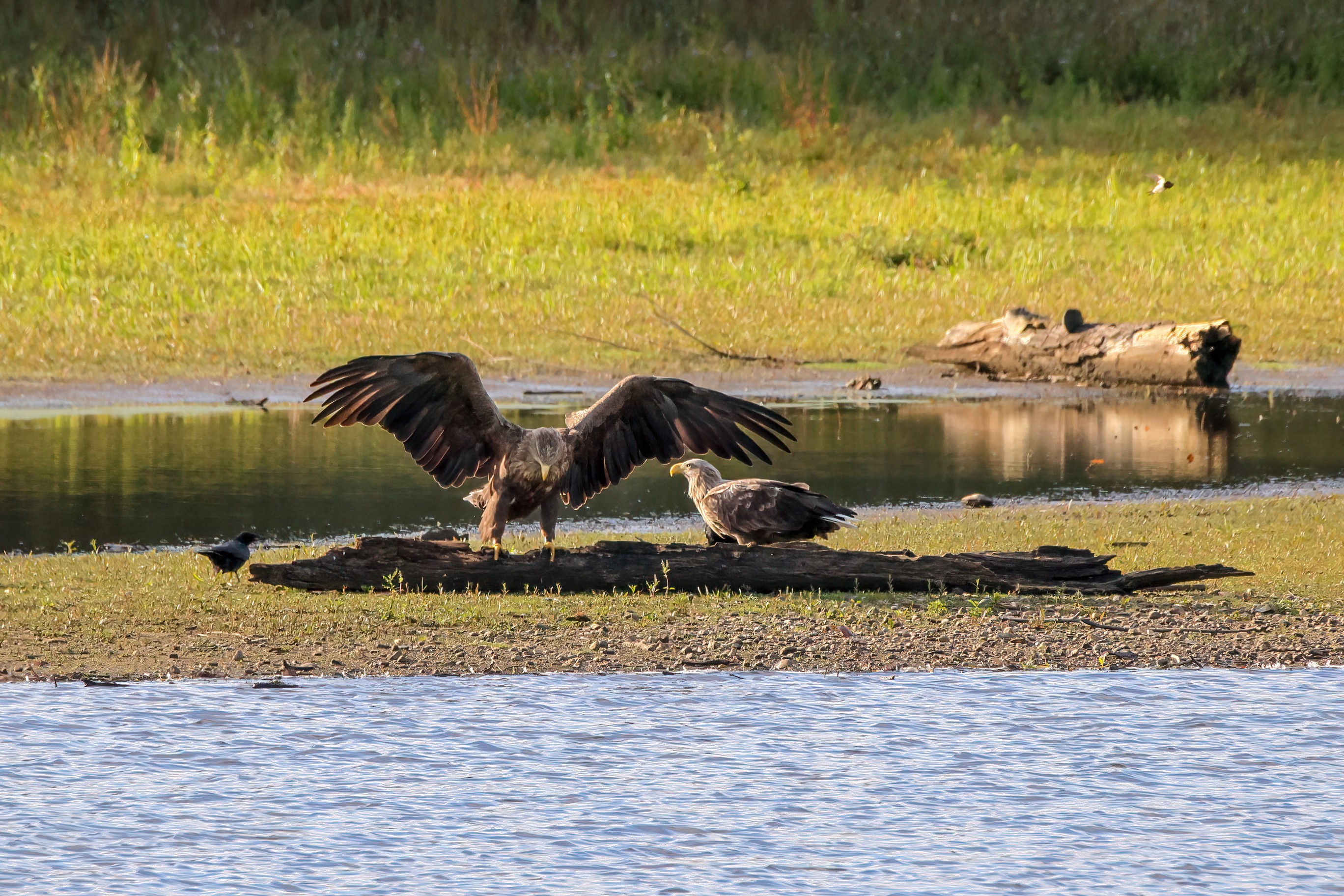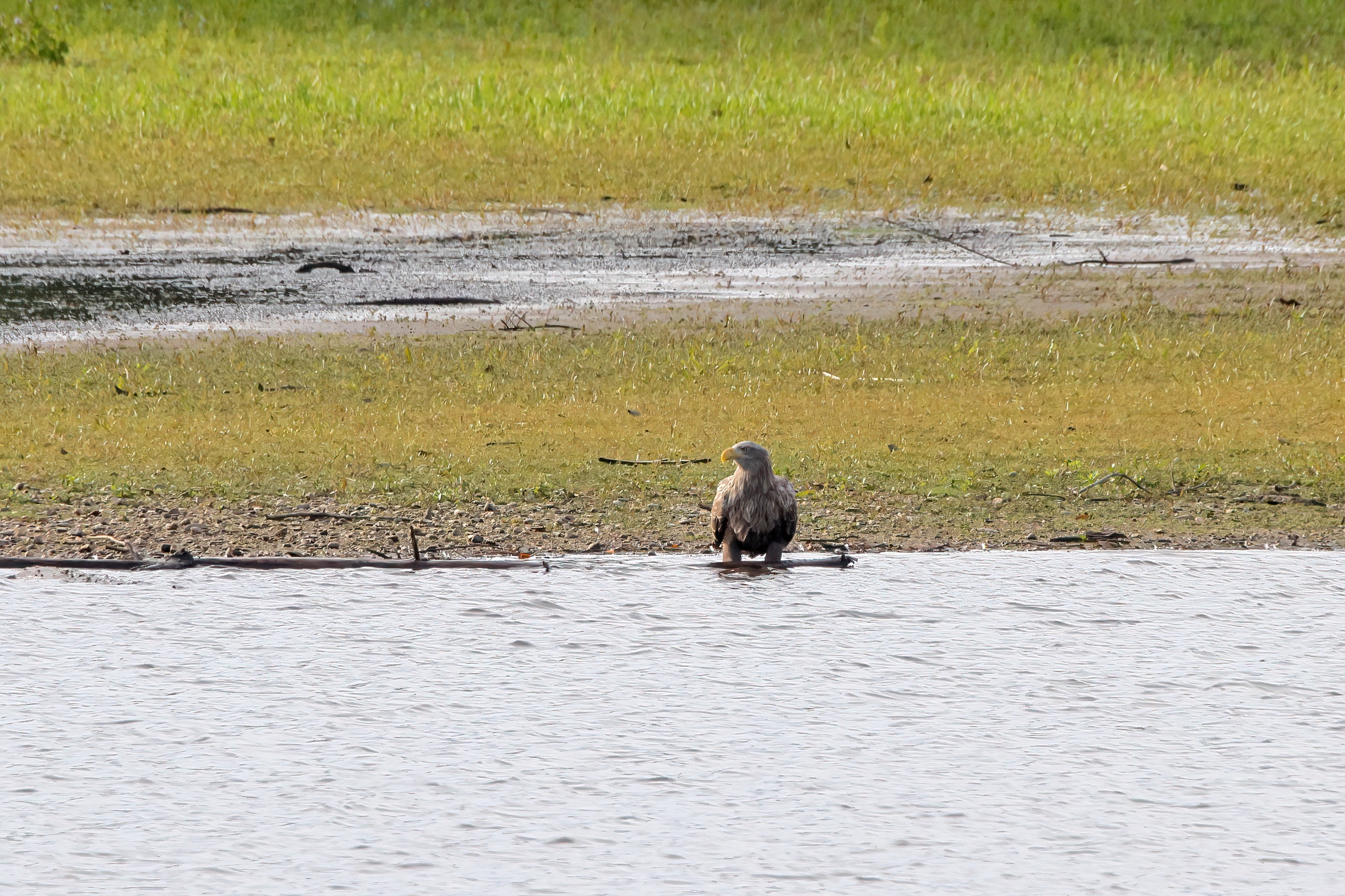 In den vorangegangenen Bildstrecken konnten wir einen Wechsel der Sichtbarkeit des eingedrungenen männlichen Seeadlers sowie des männlichen Habitatsgründers auf der Bislicher Insel nachvollziehen. Am 19. September wurde diese Bildstrecke aus der Beobachtungshütte III aufgenommen, die uns das ursprüngliche Seeadlermännchen in der Gemeinsamkeit mit dem neuen Seeadlerweibchen bei der Nahrungsaufnahme zeigt. Zur Zeit möchte ich keine Prognose über den weiteren Verlauf der hier zu beobachtenden Nähe der beiden Seeadler treffen. Es bleibt abzuwarten wie sich bis zum Jahresende die Seeadler für das kommende Jahr zusammenfinden. Das neue Seeadlerweibchen ist beidseitig beringt, hat dunklere Augen entgegen adulter Artgenossen und verfügt über einen mächtigen Oberkörper. Unser Habitatsgründer ist durch den am rechten Fang befindlichen kupferfarbenen Ring leicht erkennbar.