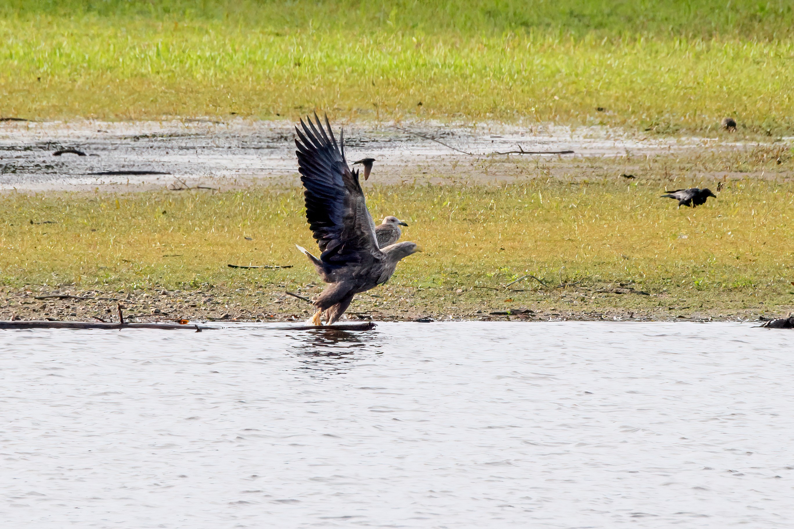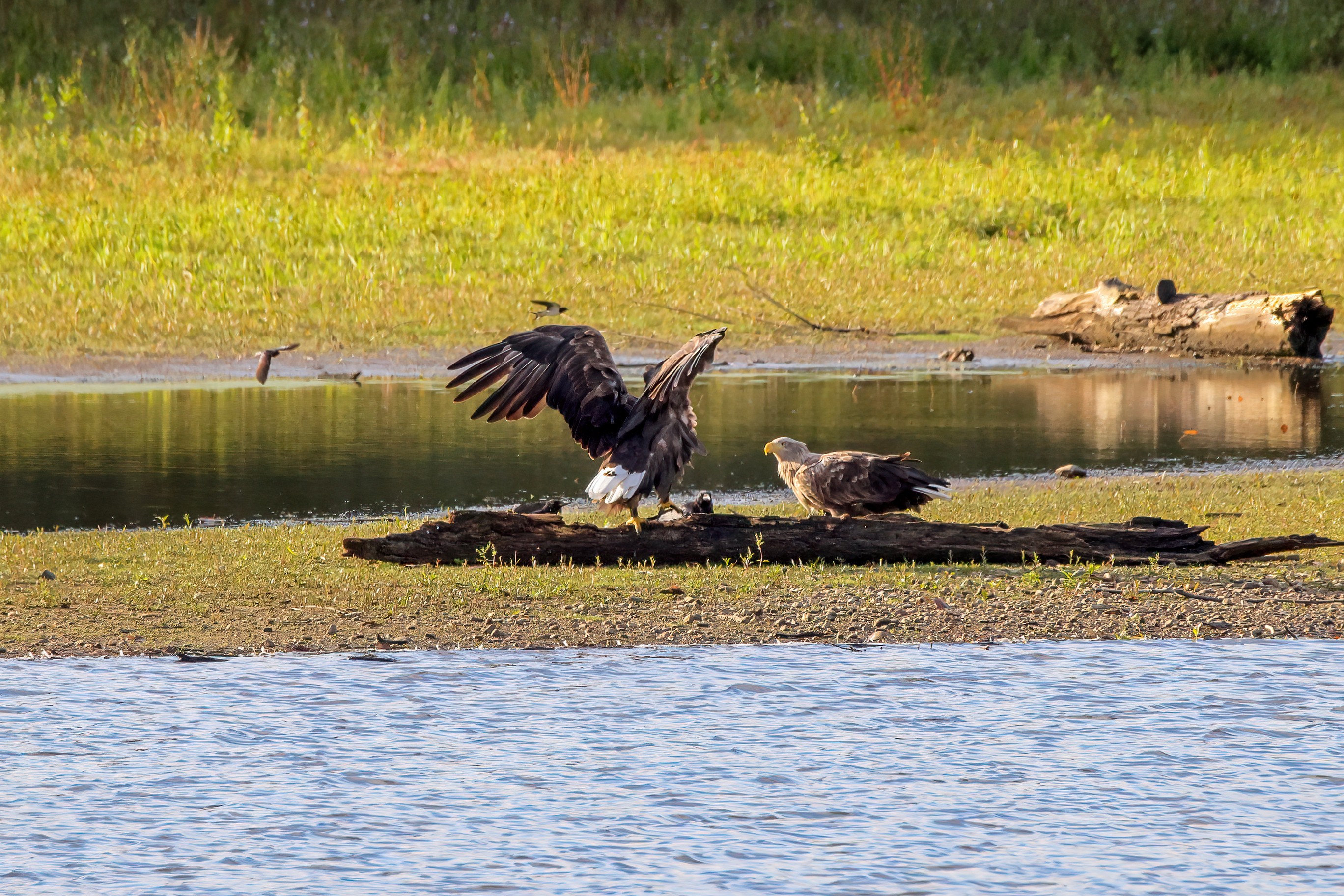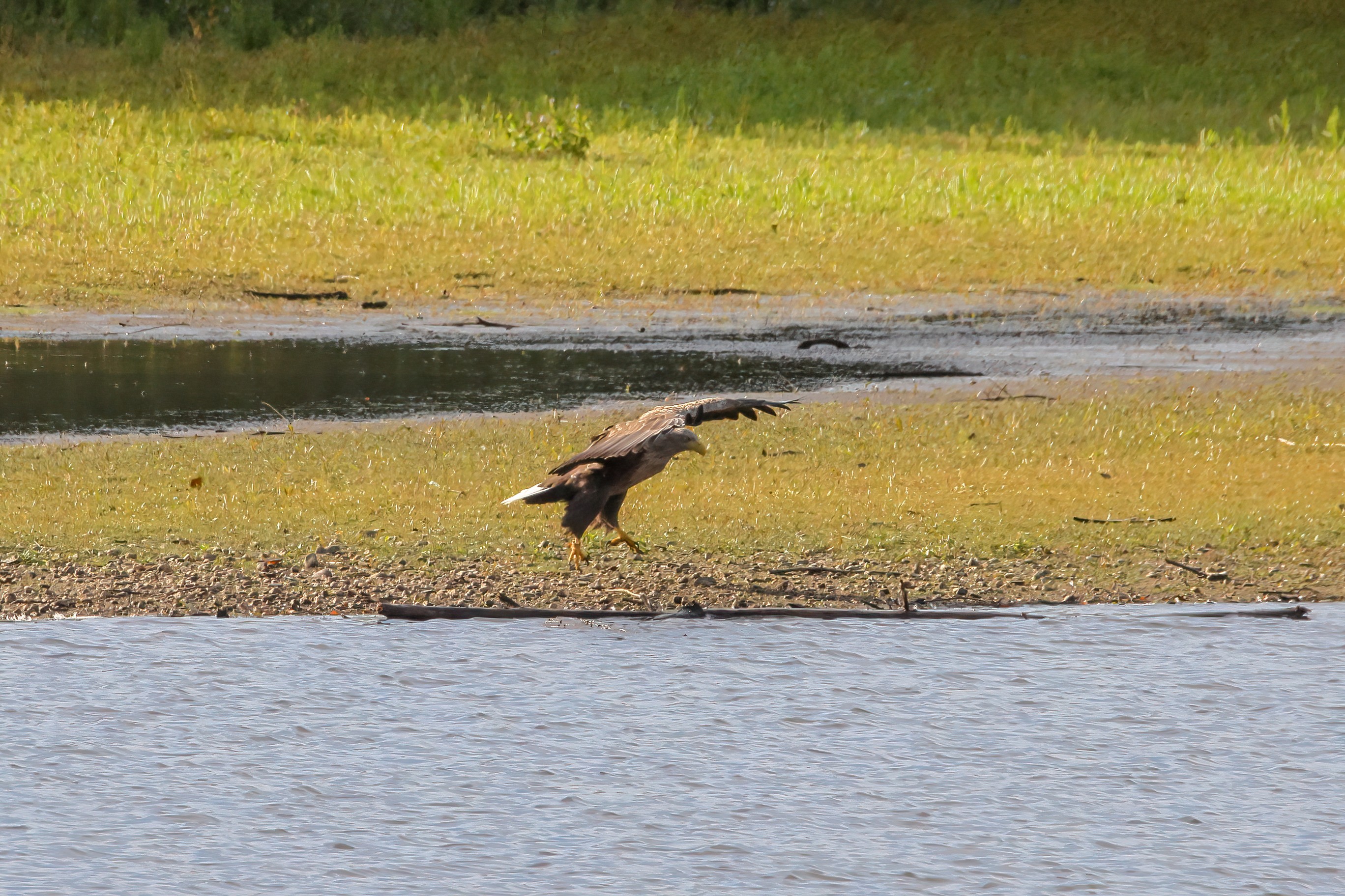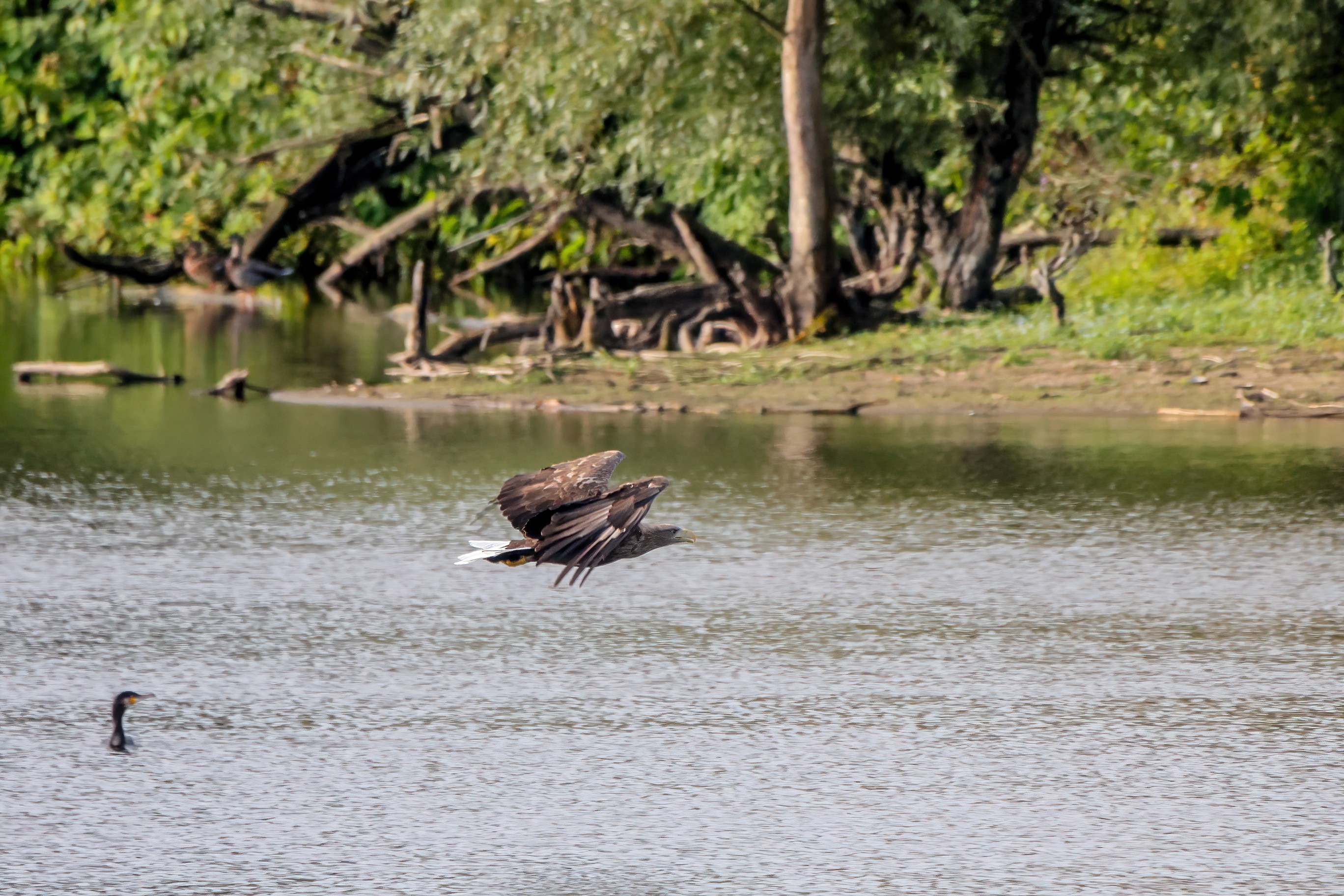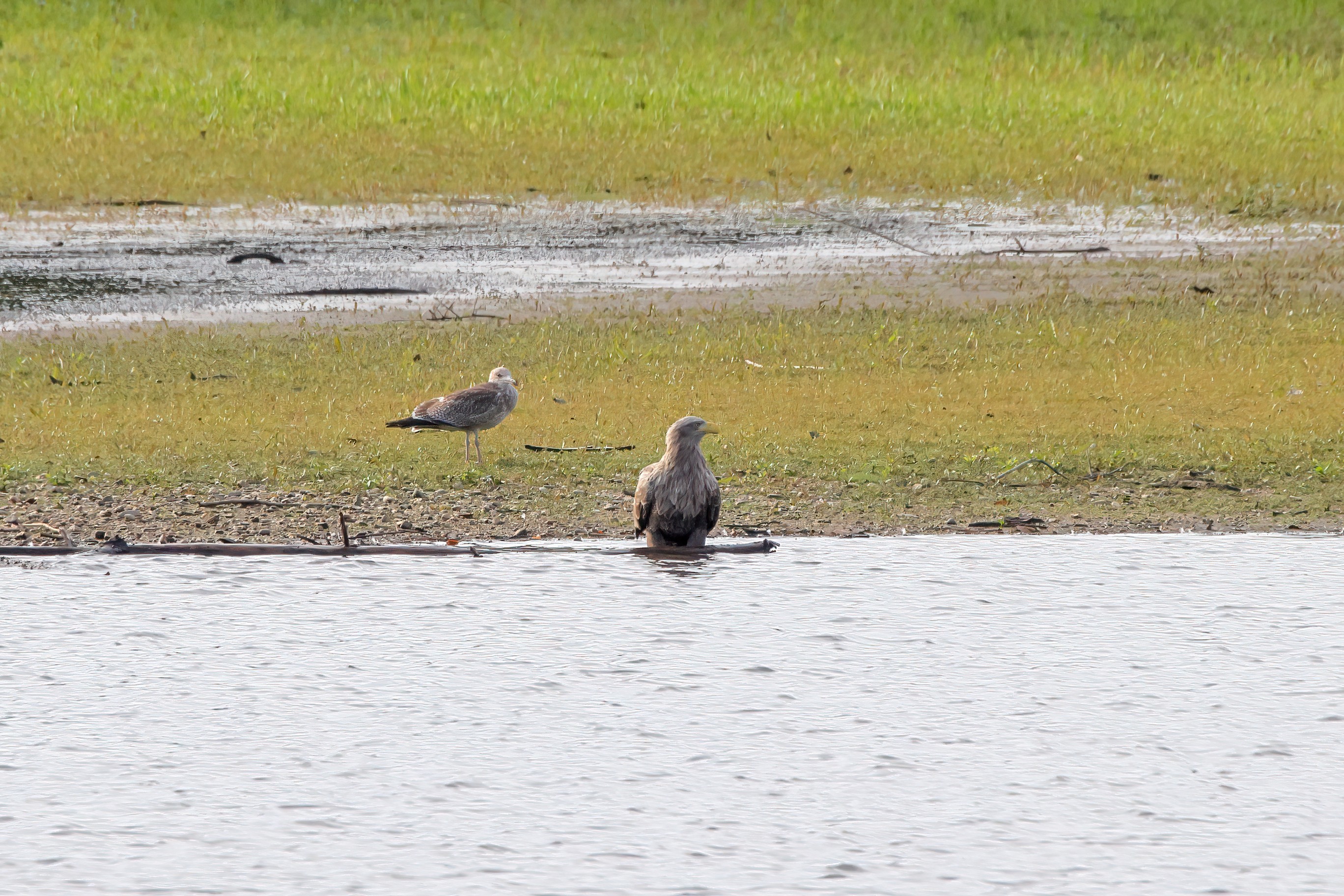In den vorangegangenen Bildstrecken konnten wir einen Wechsel der Sichtbarkeit des eingedrungenen männlichen Seeadlers sowie des männlichen Habitatsgründers auf der Bislicher Insel nachvollziehen. Am 19. September wurde diese Bildstrecke aus der Beobachtungshütte III aufgenommen, die uns das ursprüngliche Seeadlermännchen in der Gemeinsamkeit mit dem neuen Seeadlerweibchen bei der Nahrungsaufnahme zeigt. Zur Zeit möchte ich keine Prognose über den weiteren Verlauf der hier zu beobachtenden Nähe der beiden Seeadler treffen. Es bleibt abzuwarten wie sich bis zum Jahresende die Seeadler für das kommende Jahr zusammenfinden. Das neue Seeadlerweibchen ist beidseitig beringt, hat dunklere Augen entgegen adulter Artgenossen und verfügt über einen mächtigen Oberkörper. Unser Habitatsgründer ist durch den am rechten Fang befindlichen kupferfarbenen Ring leicht erkennbar.