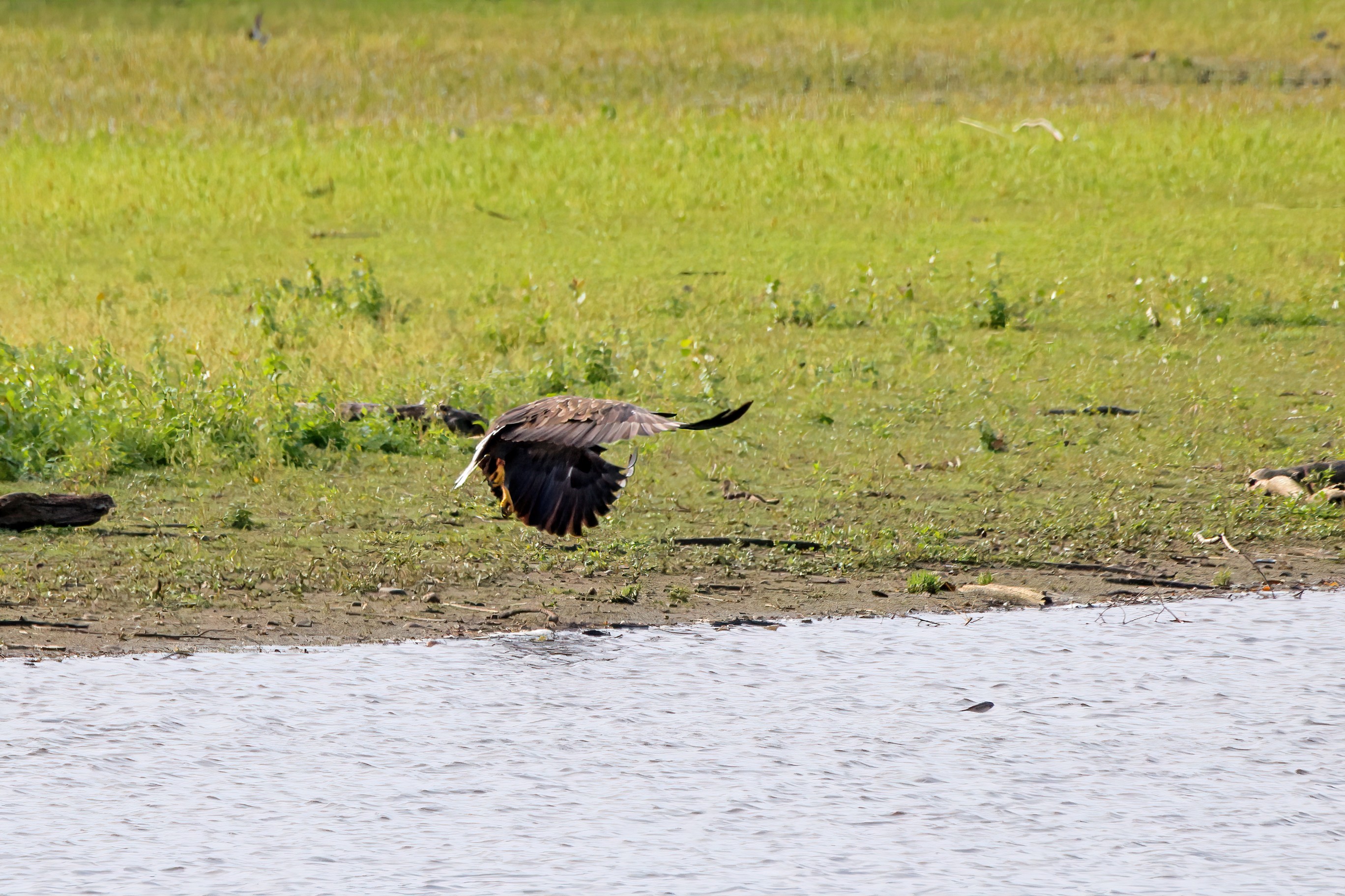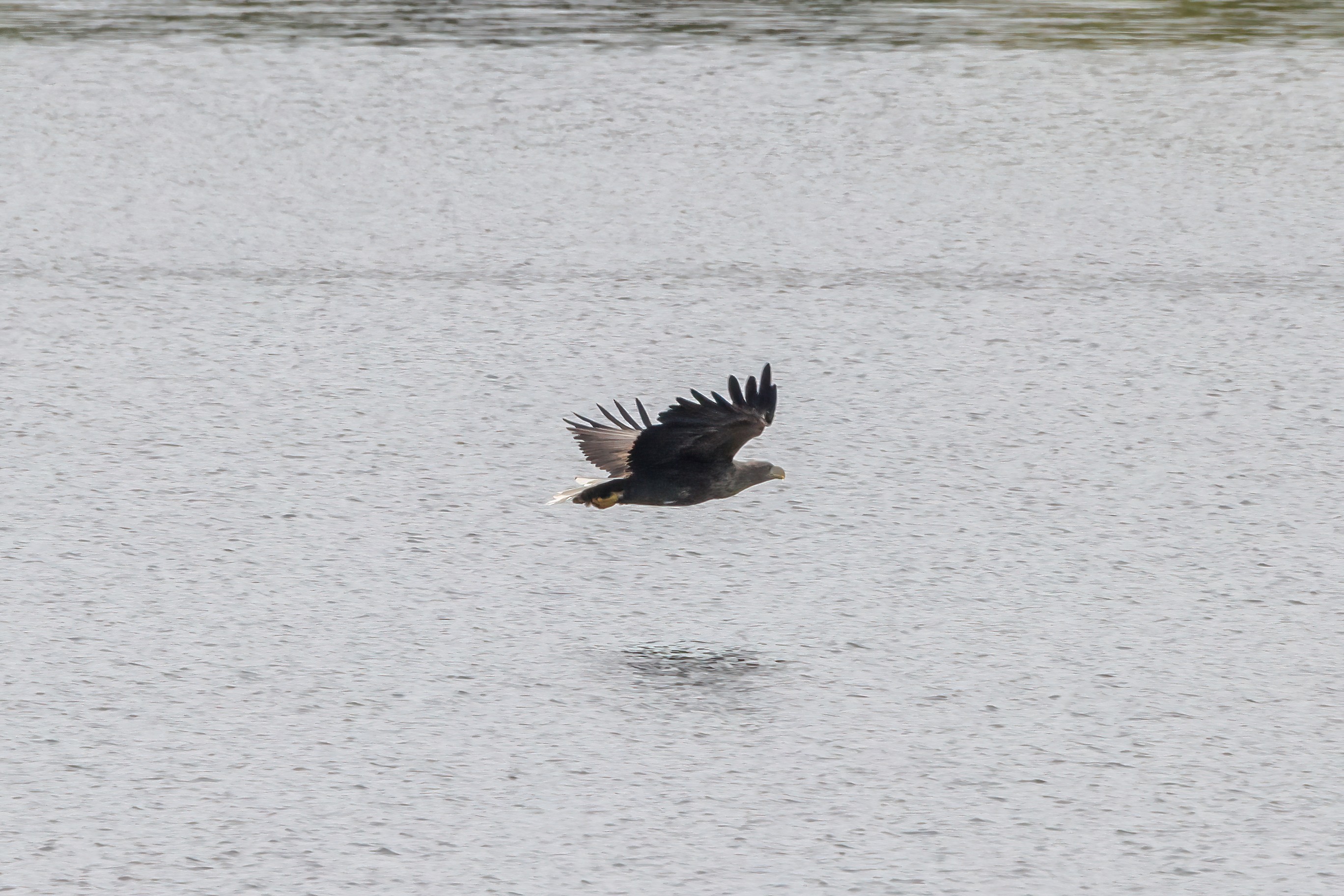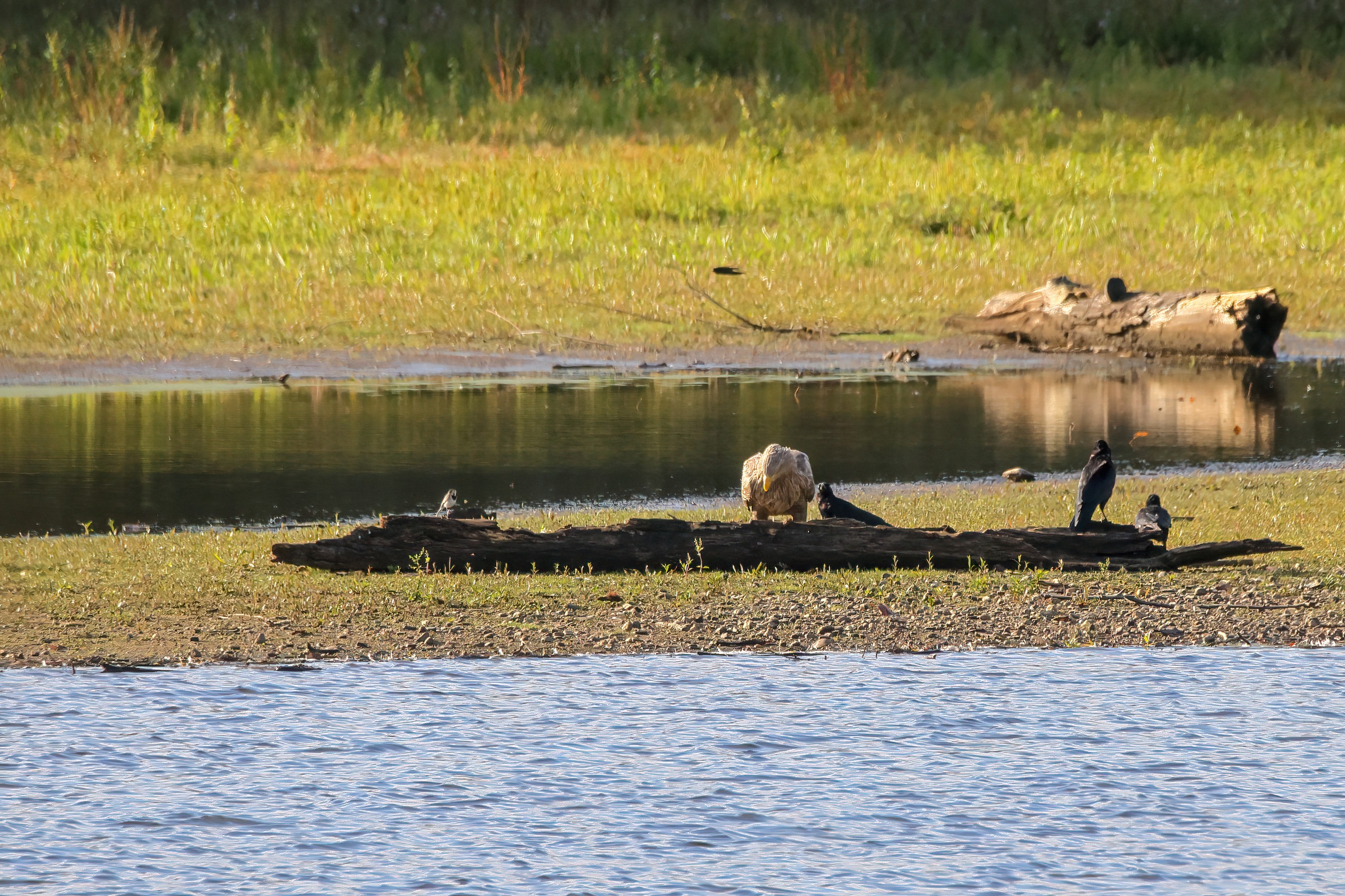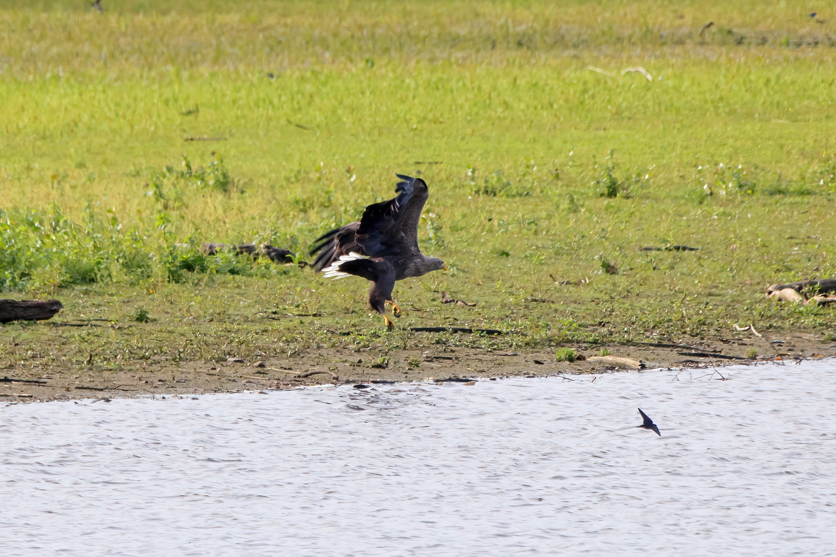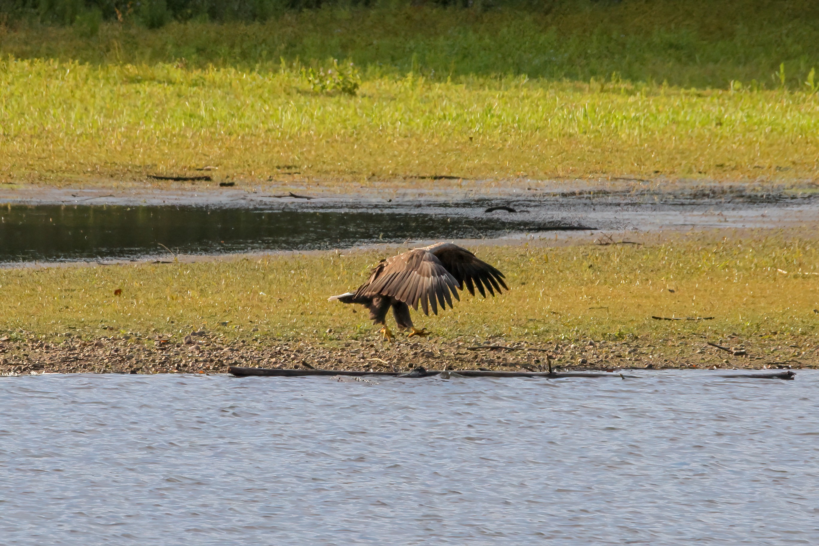 In den vorangegangenen Bildstrecken konnten wir einen Wechsel der Sichtbarkeit des eingedrungenen männlichen Seeadlers sowie des männlichen Habitatsgründers auf der Bislicher Insel nachvollziehen. Am 19. September wurde diese Bildstrecke aus der Beobachtungshütte III aufgenommen, die uns das ursprüngliche Seeadlermännchen in der Gemeinsamkeit mit dem neuen Seeadlerweibchen bei der Nahrungsaufnahme zeigt. Zur Zeit möchte ich keine Prognose über den weiteren Verlauf der hier zu beobachtenden Nähe der beiden Seeadler treffen. Es bleibt abzuwarten wie sich bis zum Jahresende die Seeadler für das kommende Jahr zusammenfinden. Das neue Seeadlerweibchen ist beidseitig beringt, hat dunklere Augen entgegen adulter Artgenossen und verfügt über einen mächtigen Oberkörper. Unser Habitatsgründer ist durch den am rechten Fang befindlichen kupferfarbenen Ring leicht erkennbar.