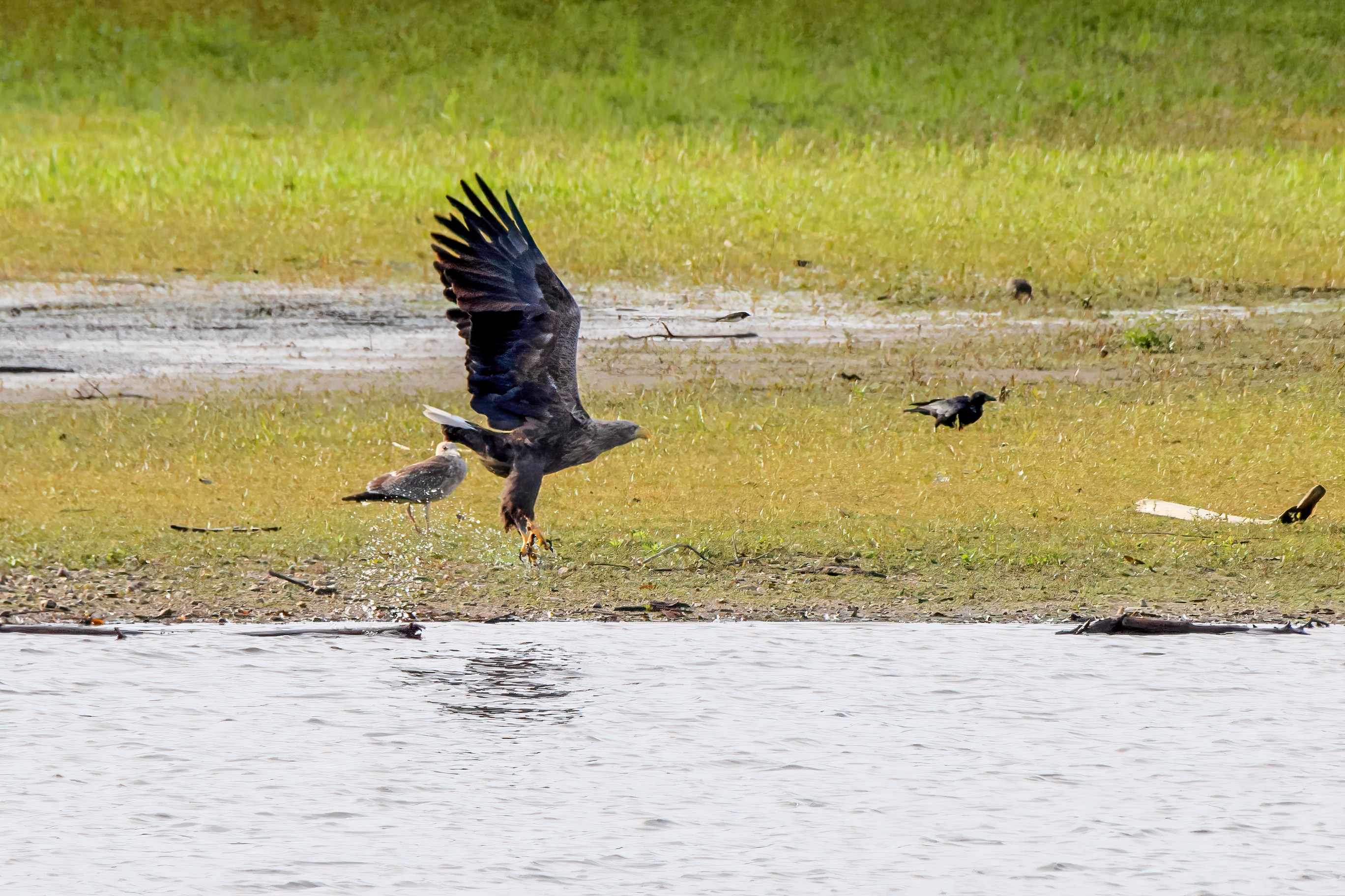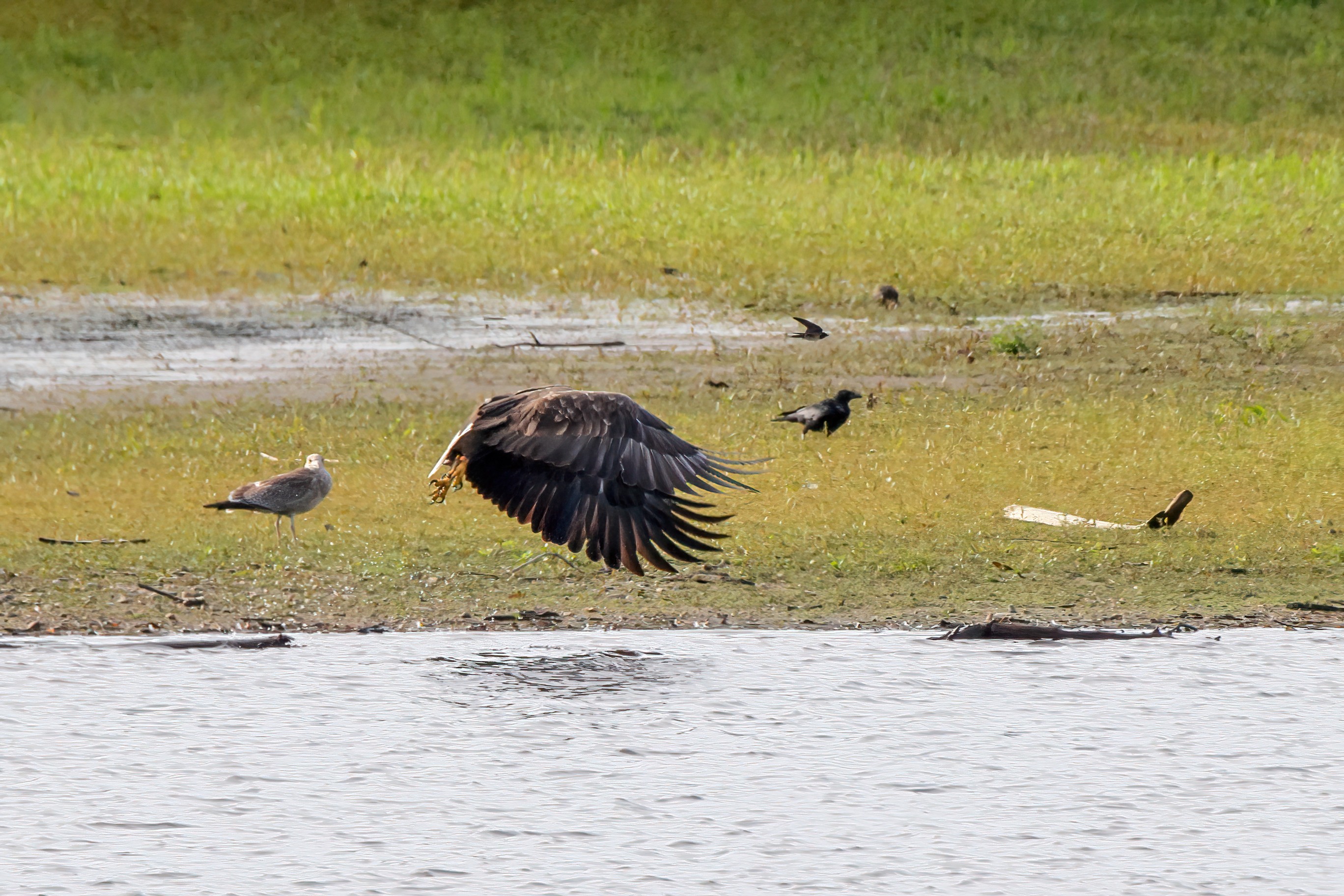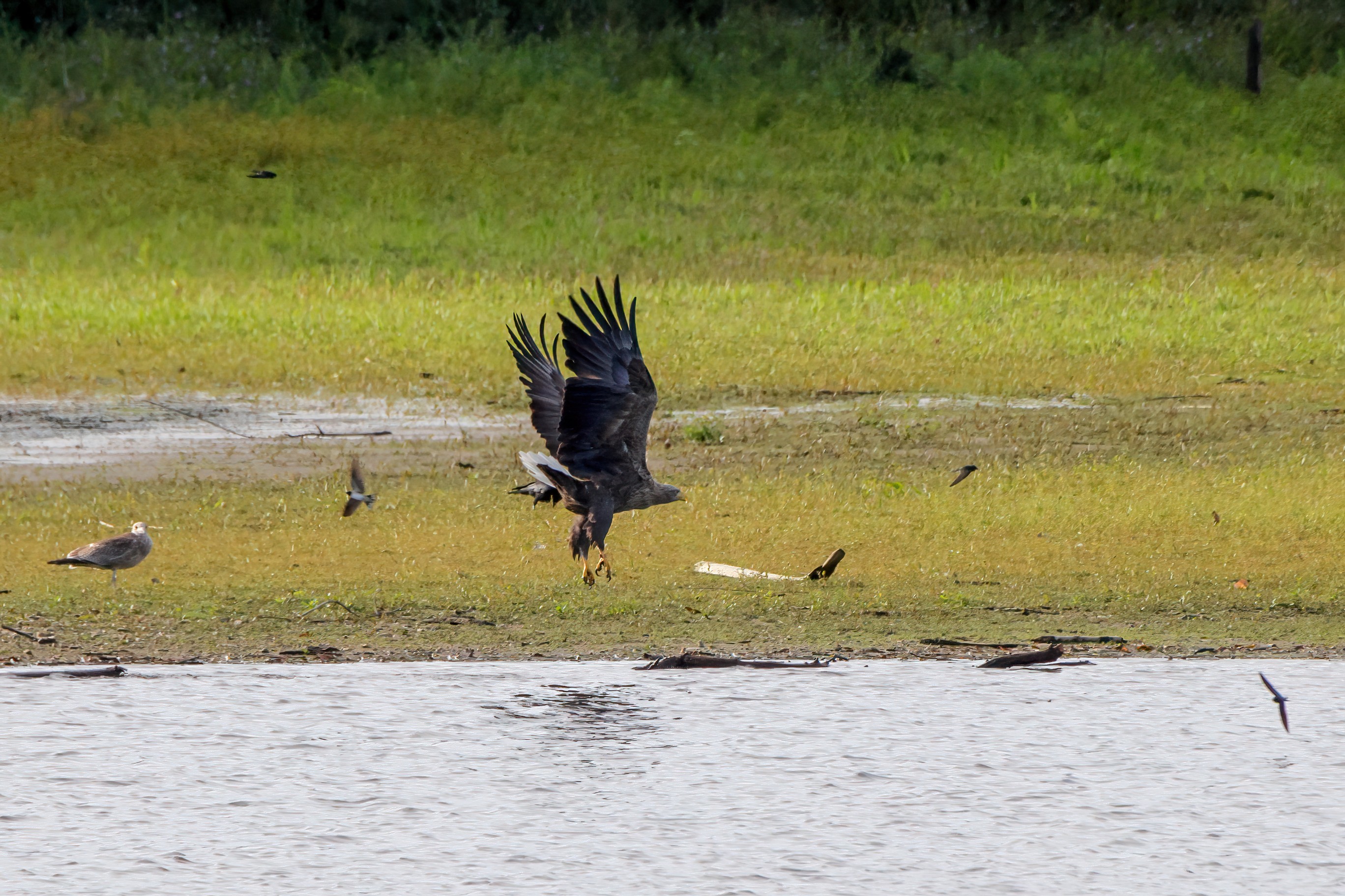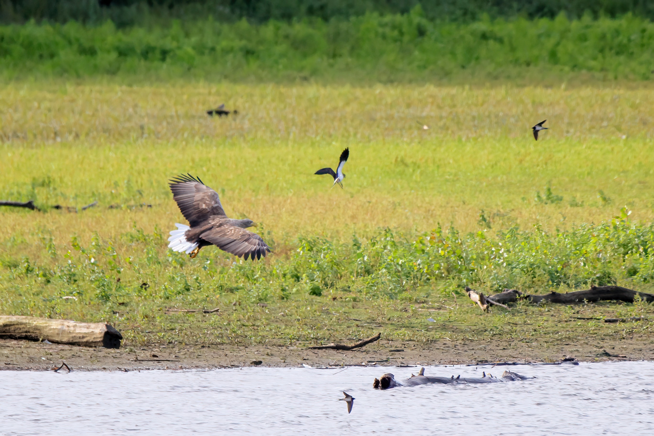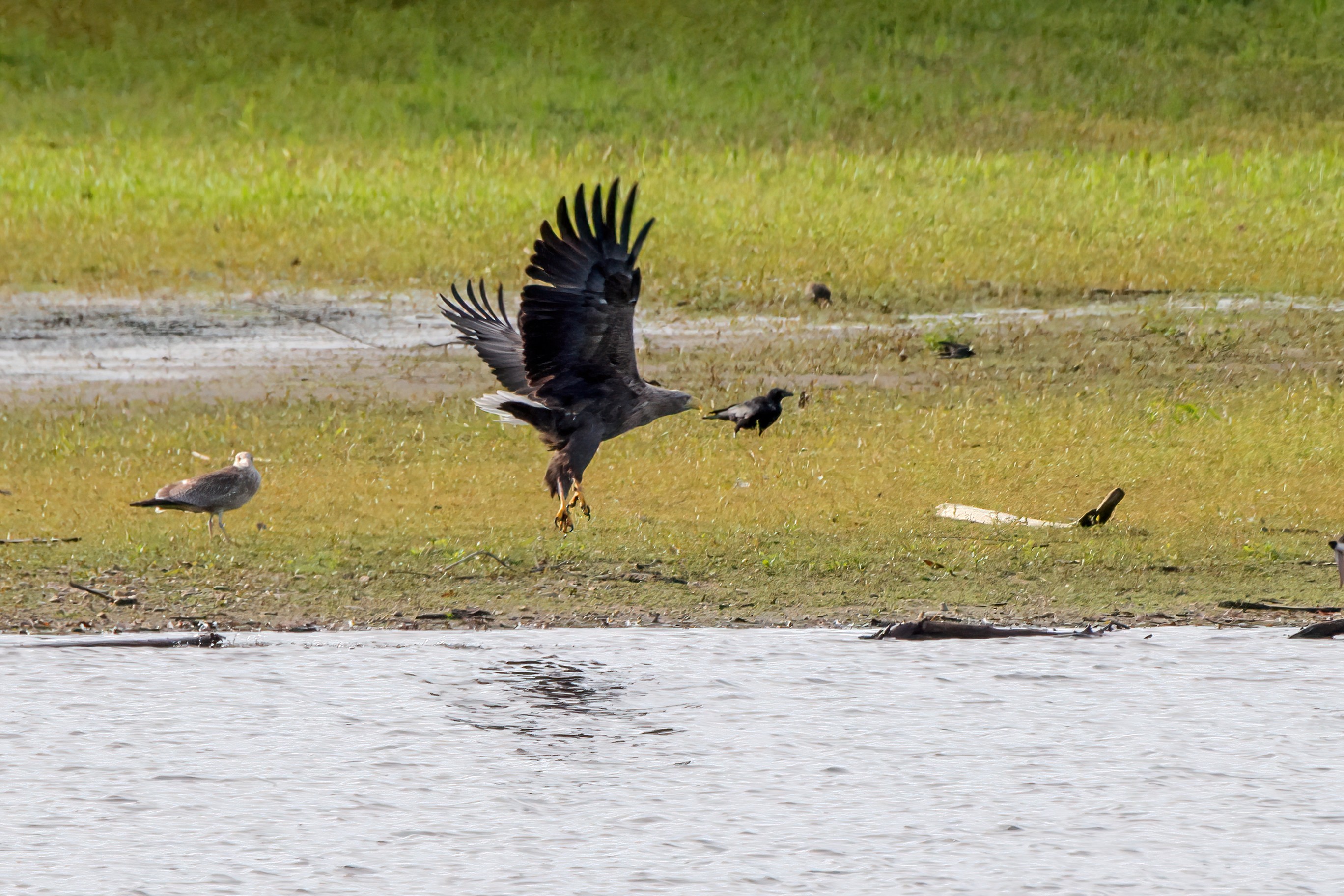 In den vorangegangenen Bildstrecken konnten wir einen Wechsel der Sichtbarkeit des eingedrungenen männlichen Seeadlers sowie des männlichen Habitatsgründers auf der Bislicher Insel nachvollziehen. Am 19. September wurde diese Bildstrecke aus der Beobachtungshütte III aufgenommen, die uns das ursprüngliche Seeadlermännchen in der Gemeinsamkeit mit dem neuen Seeadlerweibchen bei der Nahrungsaufnahme zeigt. Zur Zeit möchte ich keine Prognose über den weiteren Verlauf der hier zu beobachtenden Nähe der beiden Seeadler treffen. Es bleibt abzuwarten wie sich bis zum Jahresende die Seeadler für das kommende Jahr zusammenfinden. Das neue Seeadlerweibchen ist beidseitig beringt, hat dunklere Augen entgegen adulter Artgenossen und verfügt über einen mächtigen Oberkörper. Unser Habitatsgründer ist durch den am rechten Fang befindlichen kupferfarbenen Ring leicht erkennbar.
