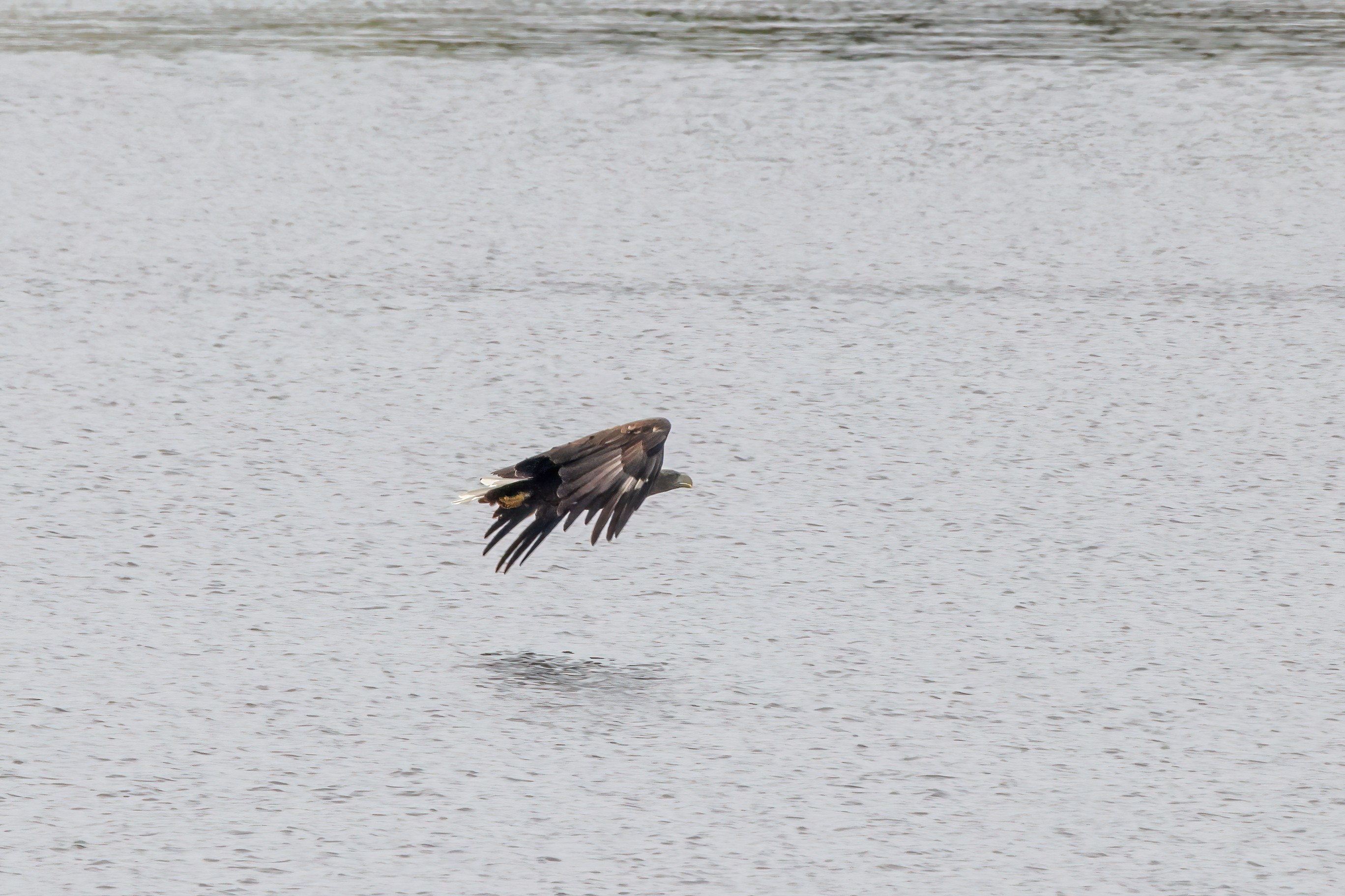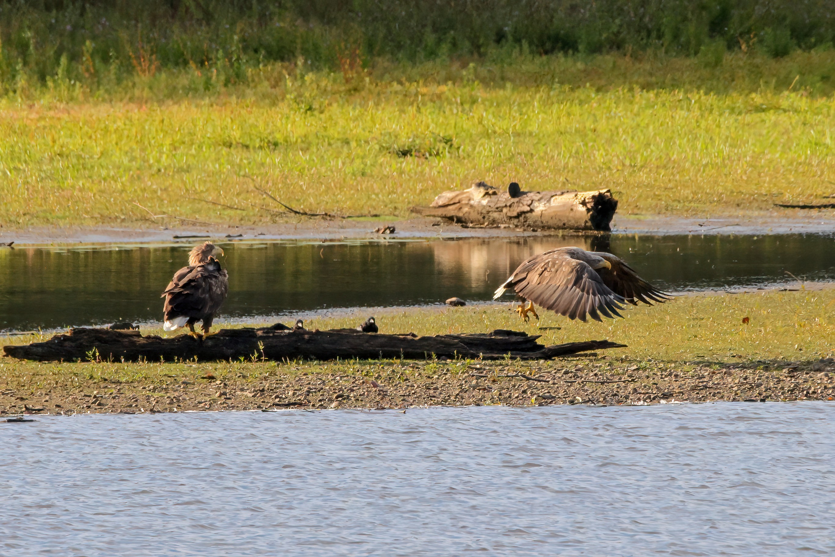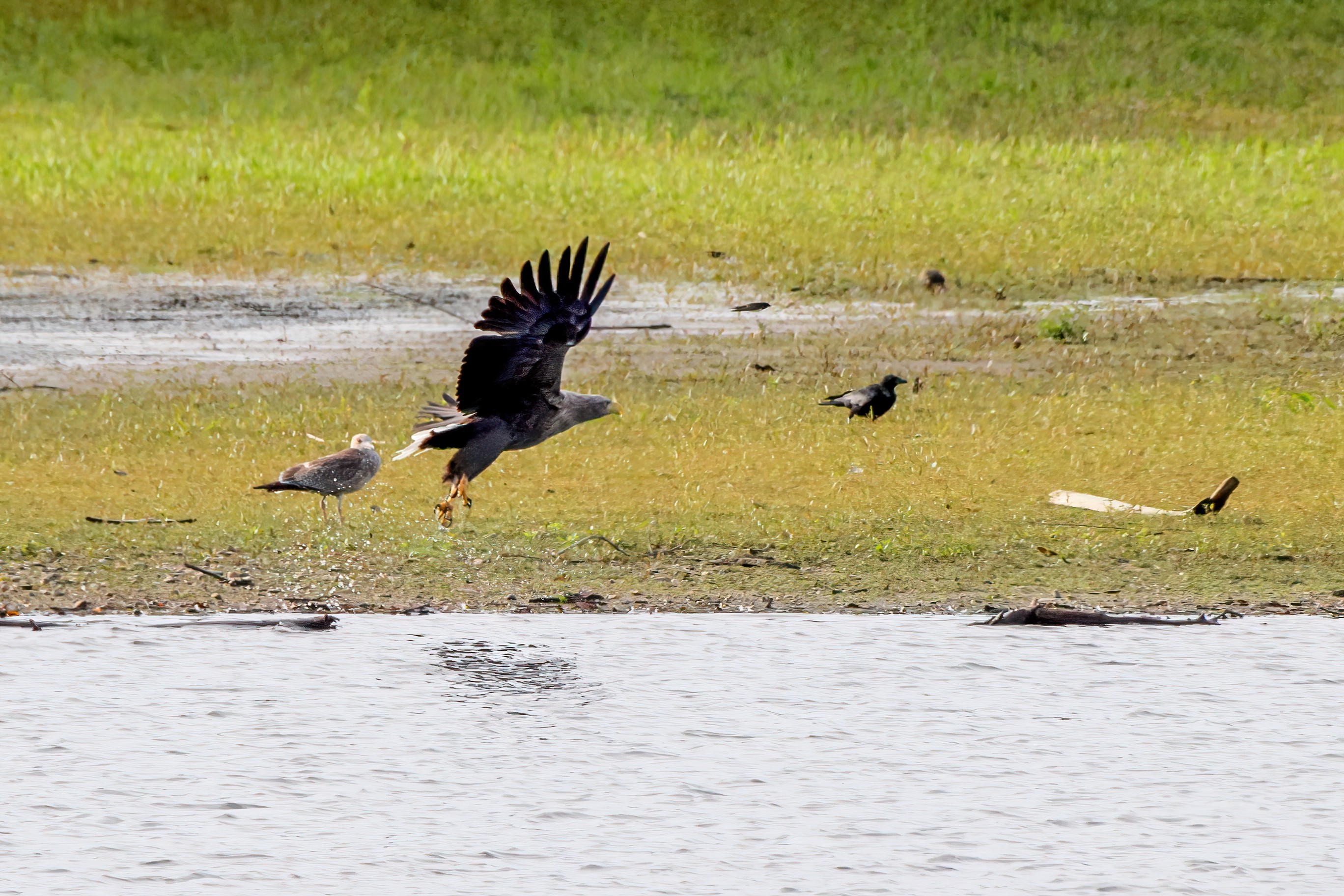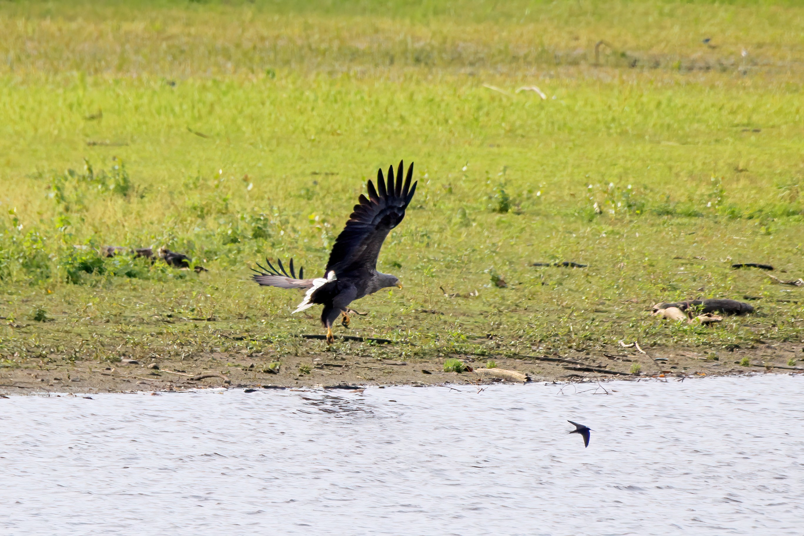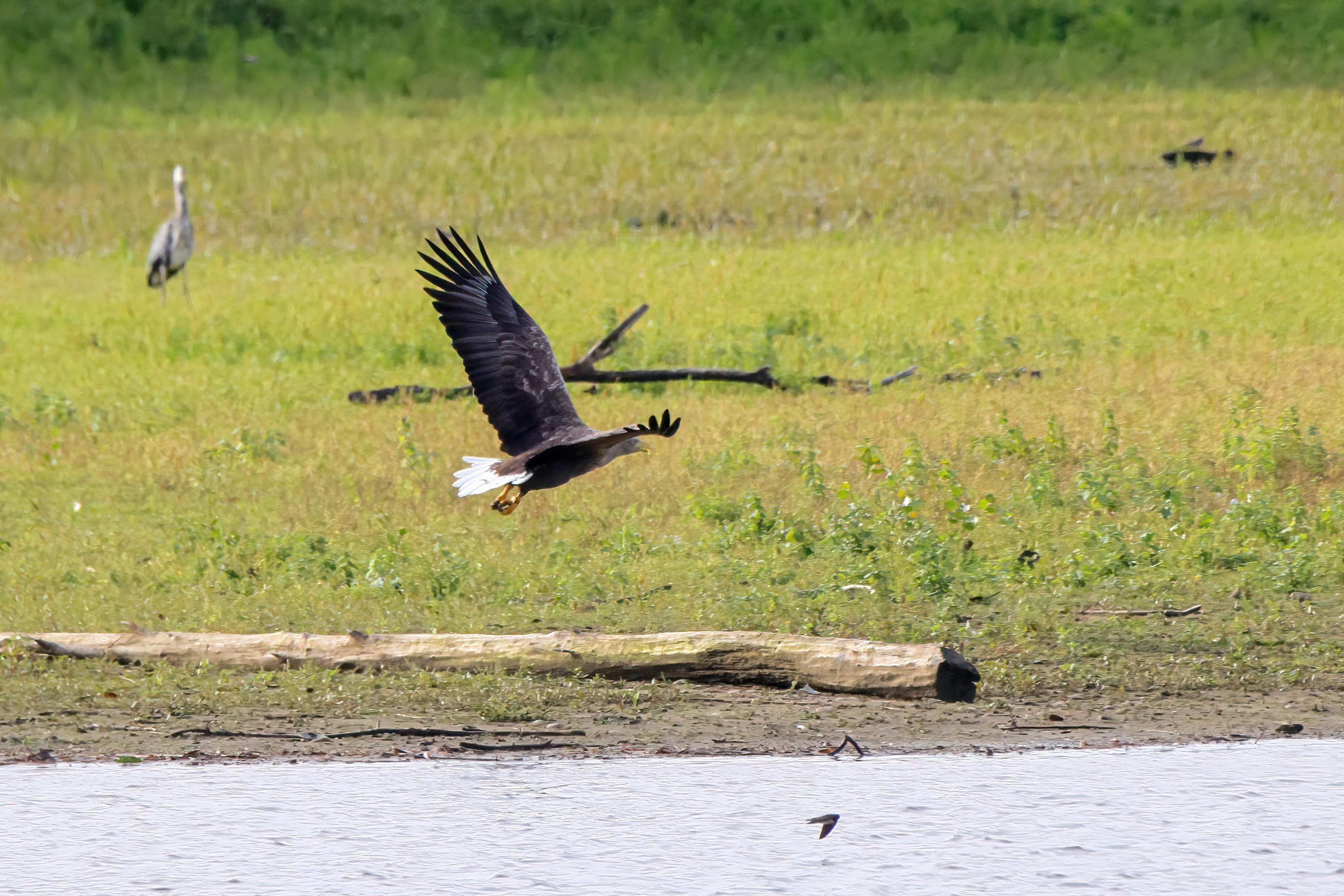 In den vorangegangenen Bildstrecken konnten wir einen Wechsel der Sichtbarkeit des eingedrungenen männlichen Seeadlers sowie des männlichen Habitatsgründers auf der Bislicher Insel nachvollziehen. Am 19. September wurde diese Bildstrecke aus der Beobachtungshütte III aufgenommen, die uns das ursprüngliche Seeadlermännchen in der Gemeinsamkeit mit dem neuen Seeadlerweibchen bei der Nahrungsaufnahme zeigt. Zur Zeit möchte ich keine Prognose über den weiteren Verlauf der hier zu beobachtenden Nähe der beiden Seeadler treffen. Es bleibt abzuwarten wie sich bis zum Jahresende die Seeadler für das kommende Jahr zusammenfinden. Das neue Seeadlerweibchen ist beidseitig beringt, hat dunklere Augen entgegen adulter Artgenossen und verfügt über einen mächtigen Oberkörper. Unser Habitatsgründer ist durch den am rechten Fang befindlichen kupferfarbenen Ring leicht erkennbar.
