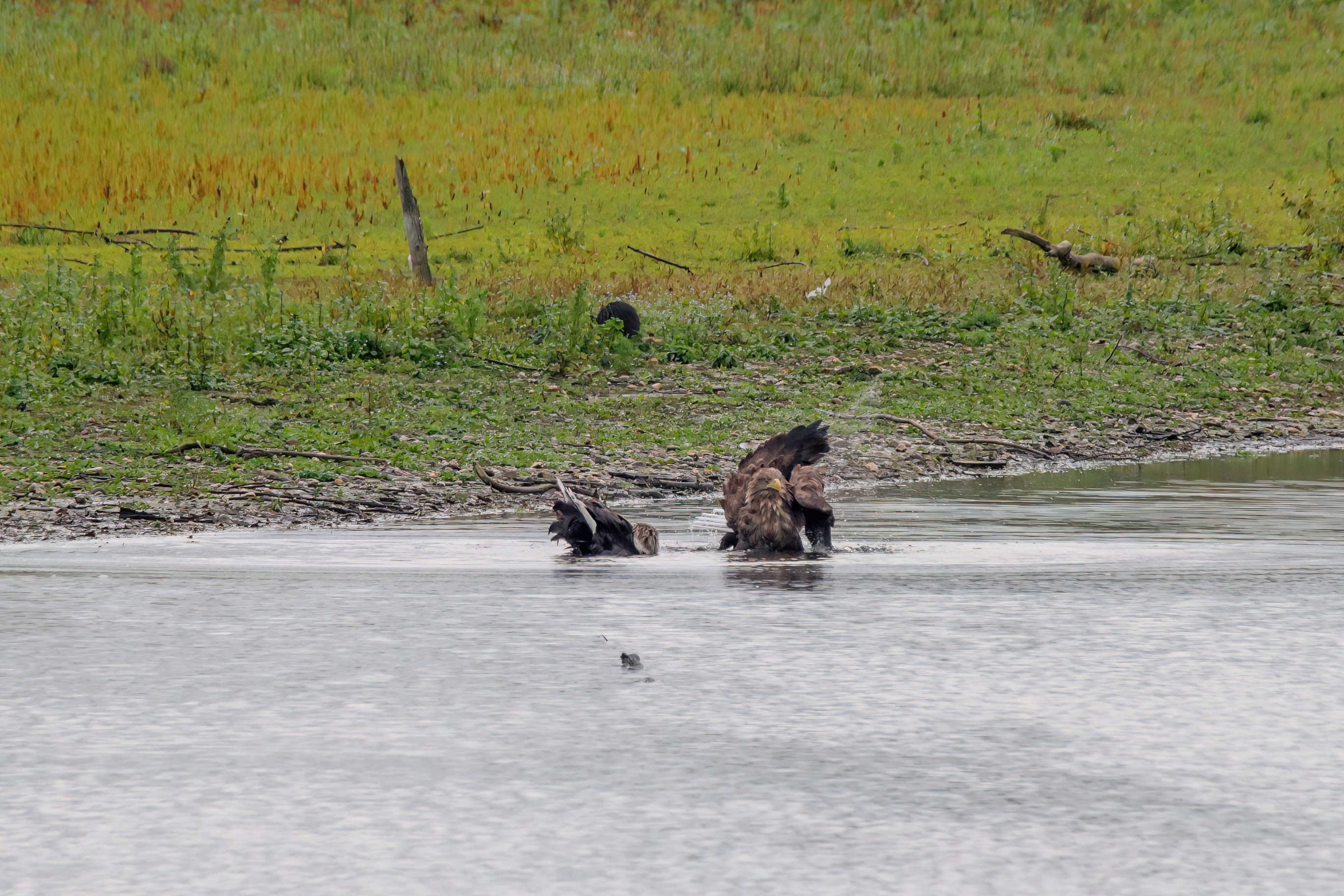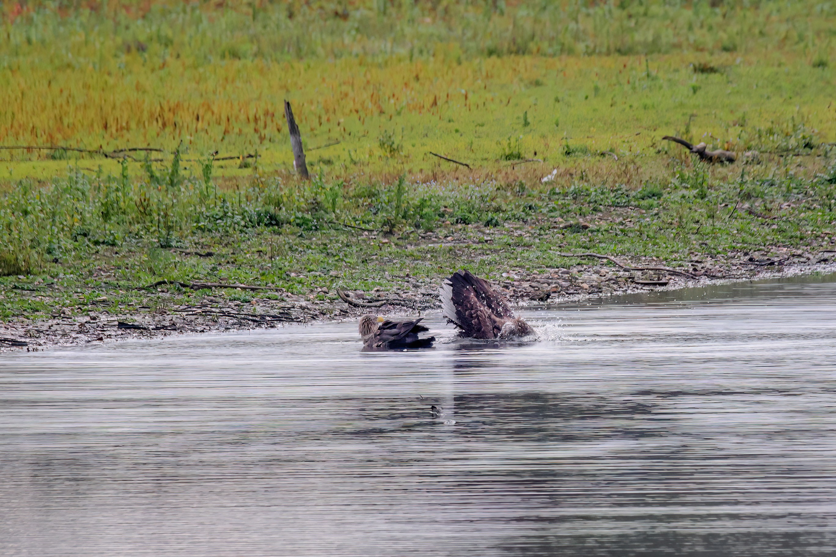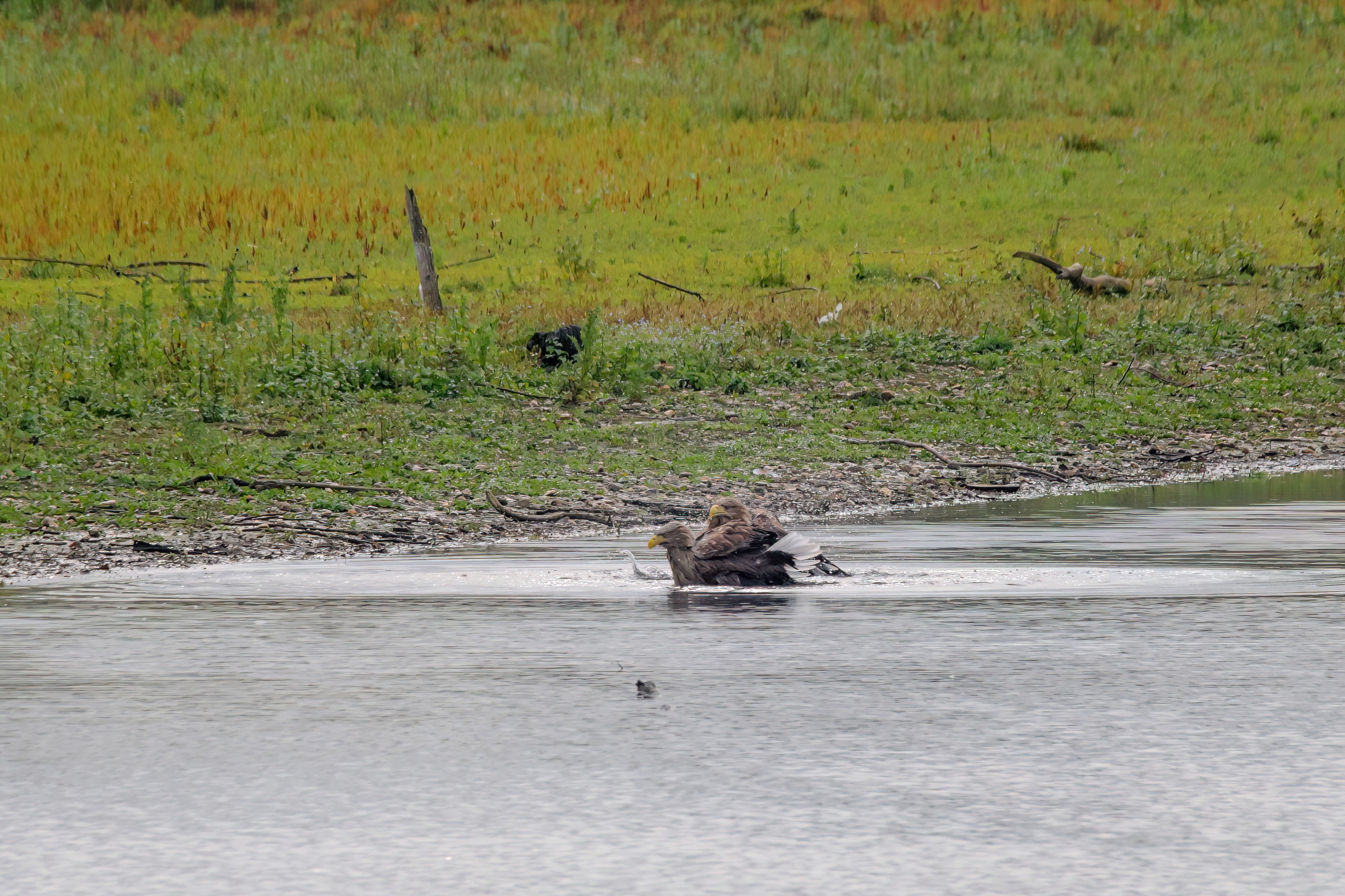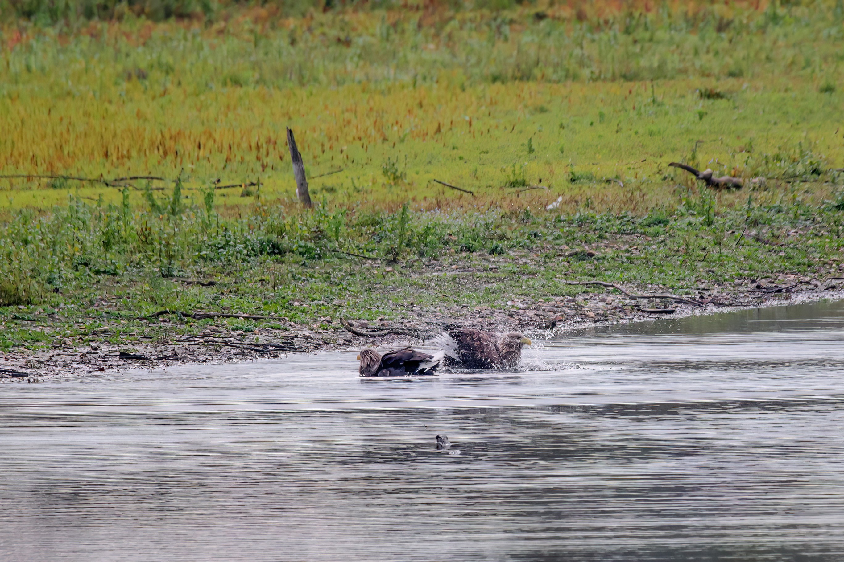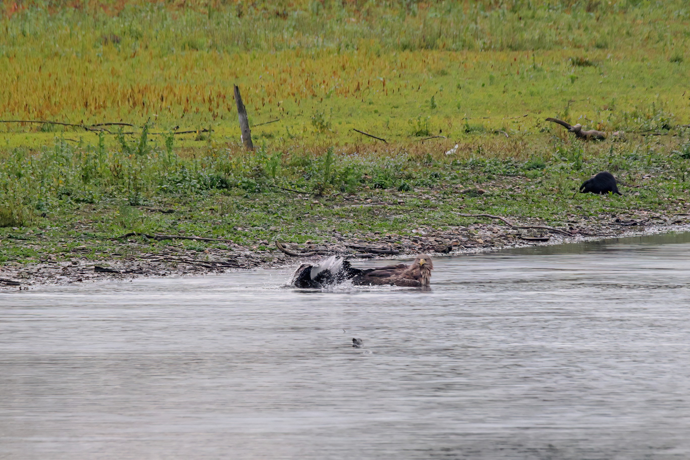 Erfolgreicher Beutefang des neuen Seeadlerweibchens am Ende des Gewässers der Beobchtungshütte III. Im zweiten Anflug wurde eine Stockente geschlagen. Eine weitere Bildstrecke zeigt den Habitatsgründer "Rheingold" mit dem neuen Seeadlerweibchen beim gemeinsamen Badevergnügen.