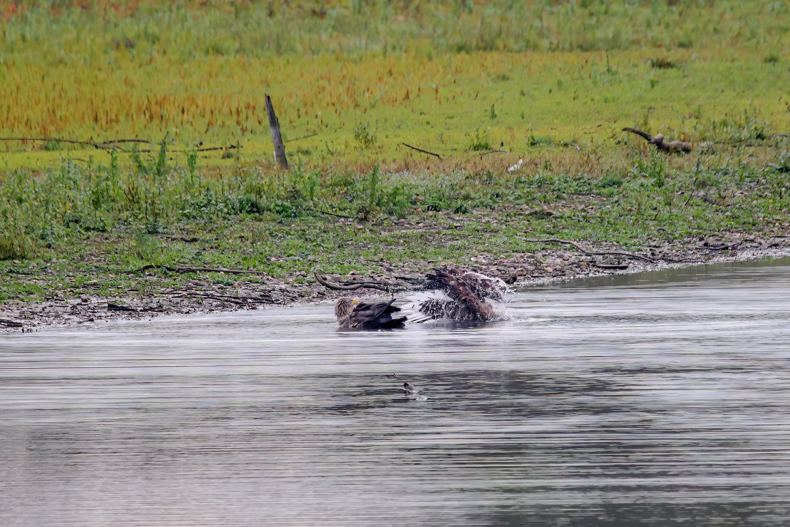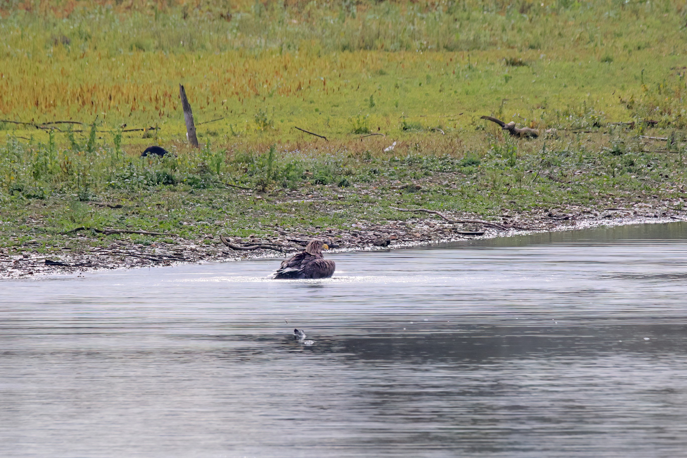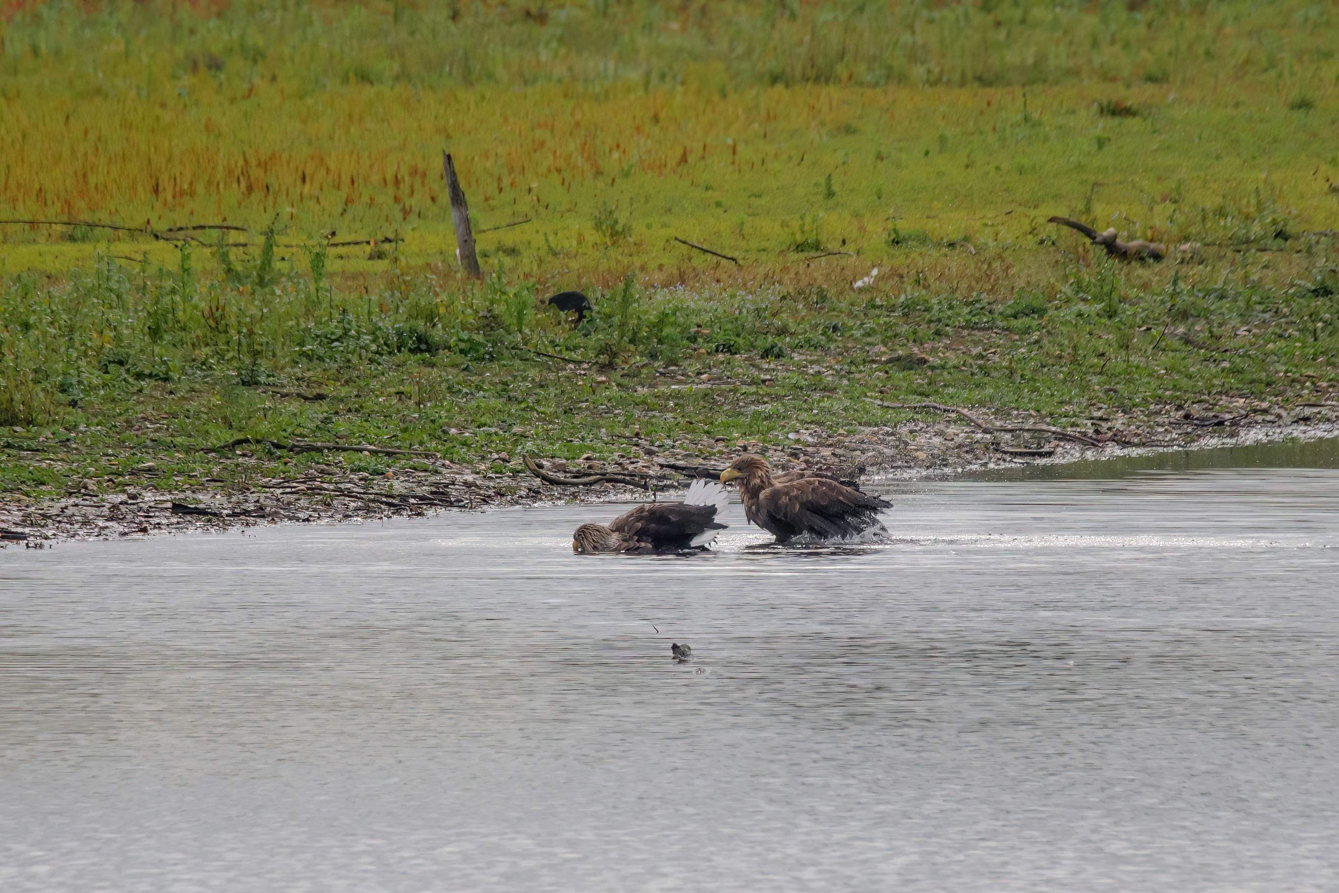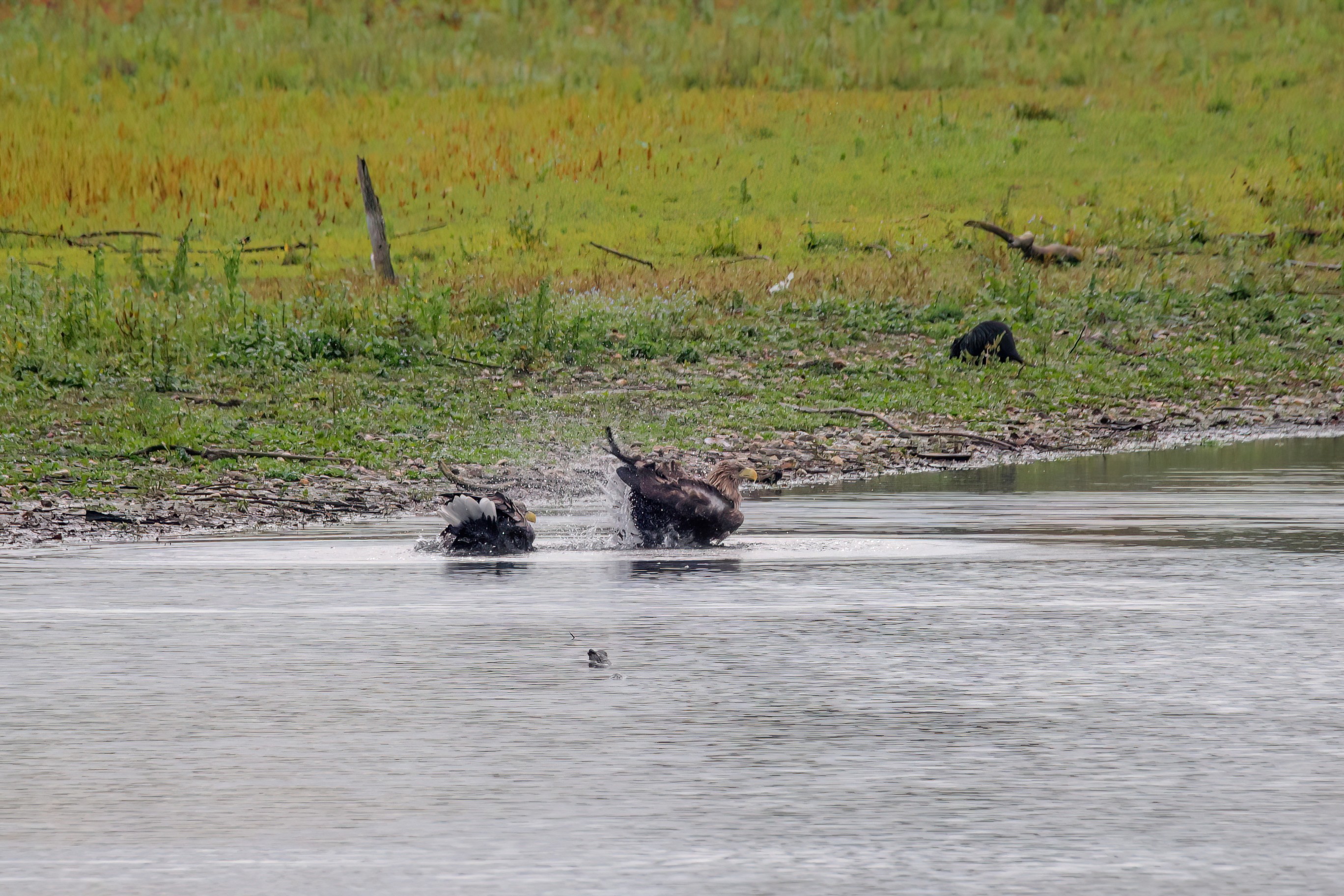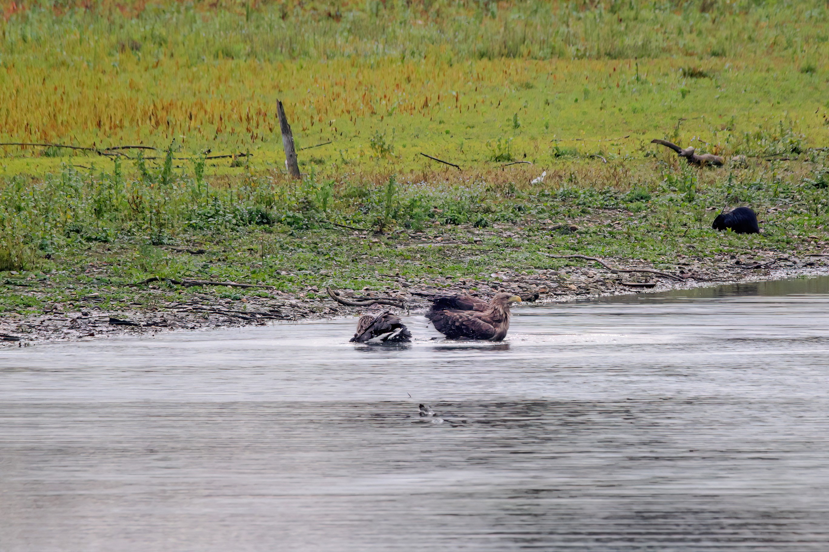Erfolgreicher Beutefang des neuen Seeadlerweibchens am Ende des Gewässers der Beobchtungshütte III. Im zweiten Anflug wurde eine Stockente geschlagen. Eine weitere Bildstrecke zeigt den Habitatsgründer "Rheingold" mit dem neuen Seeadlerweibchen beim gemeinsamen Badevergnügen.