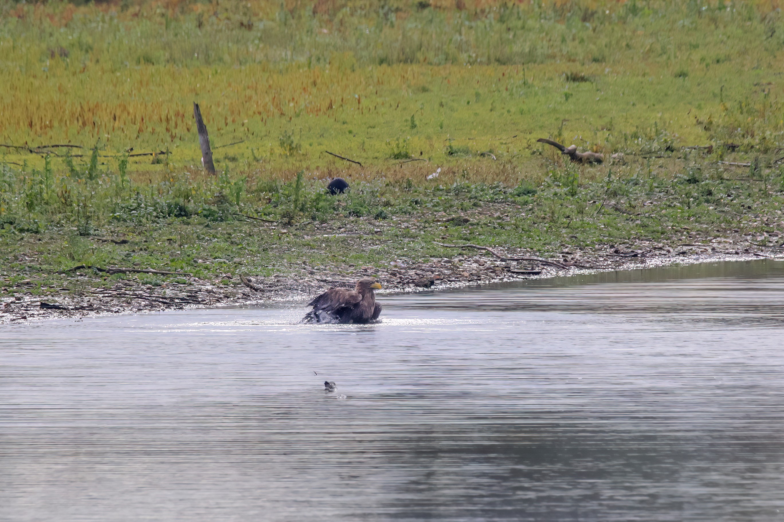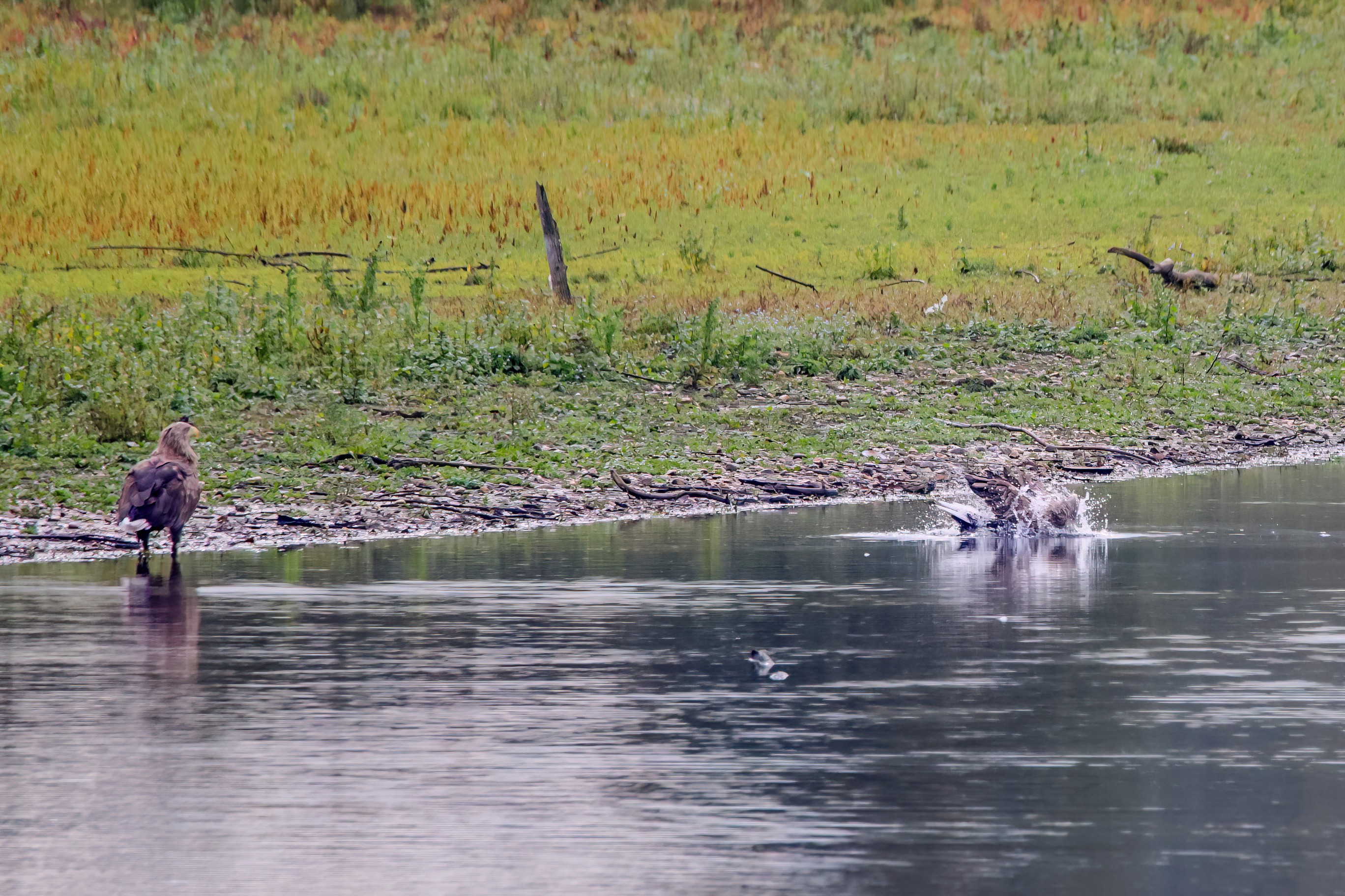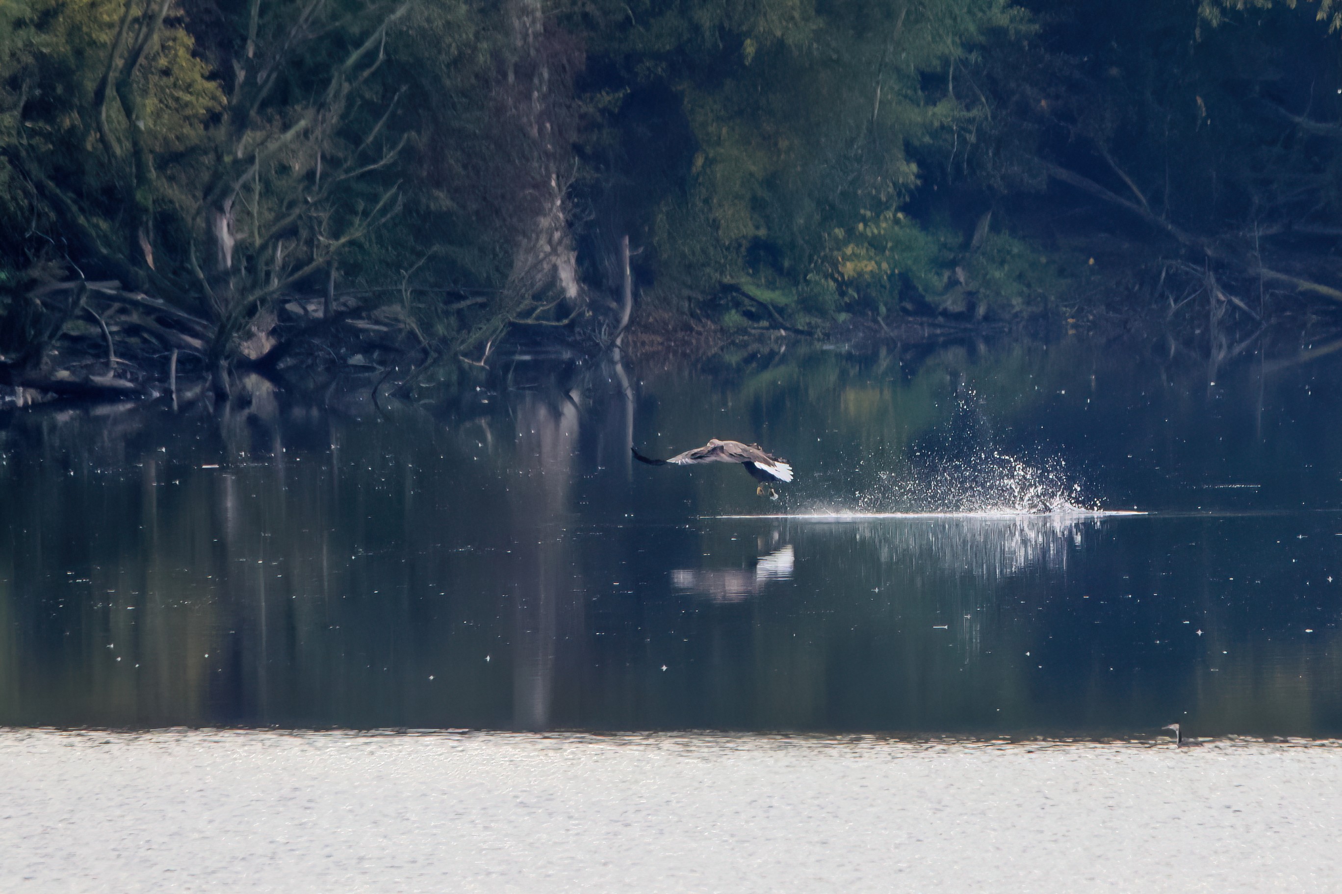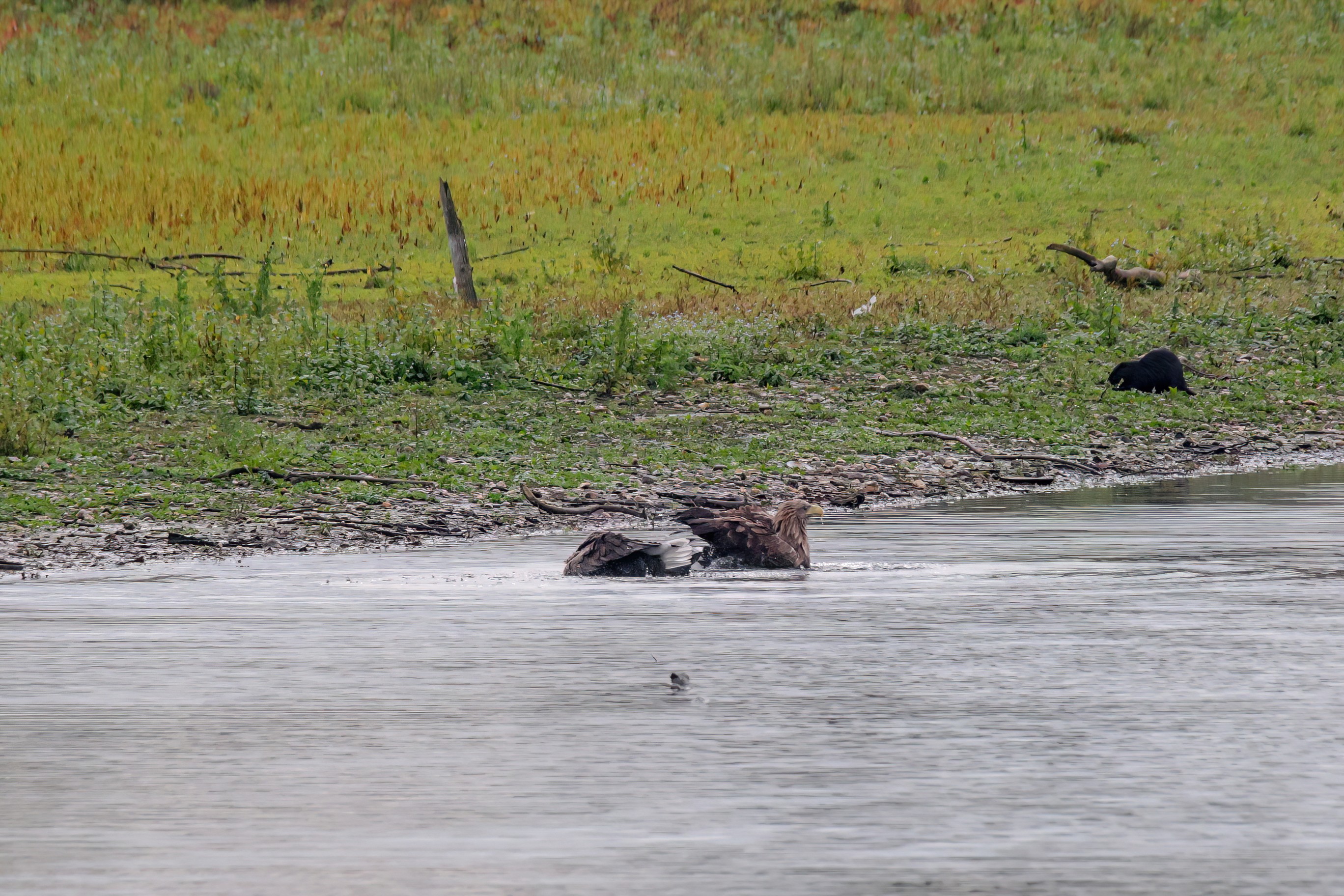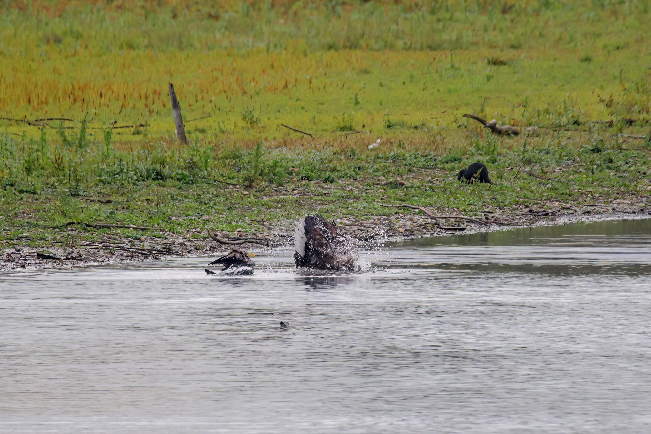 Erfolgreicher Beutefang des neuen Seeadlerweibchens am Ende des Gewässers der Beobchtungshütte III. Im zweiten Anflug wurde eine Stockente geschlagen. Eine weitere Bildstrecke zeigt den Habitatsgründer "Rheingold" mit dem neuen Seeadlerweibchen beim gemeinsamen Badevergnügen.