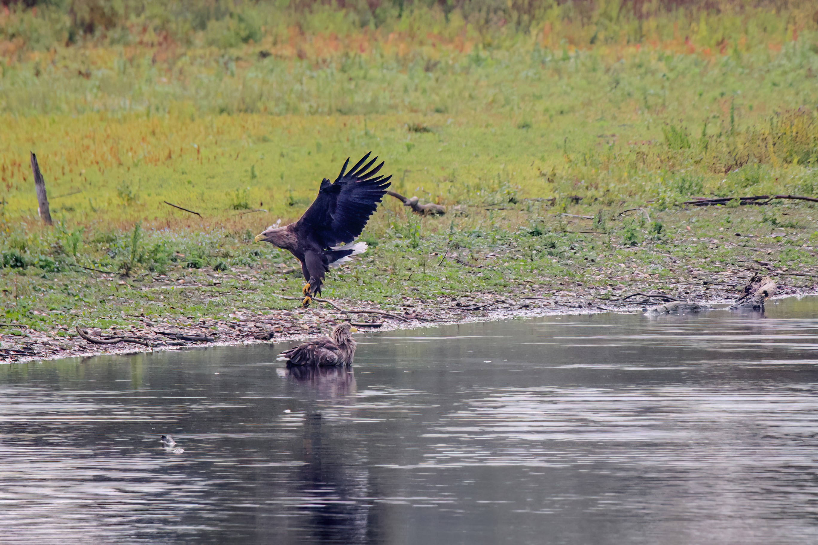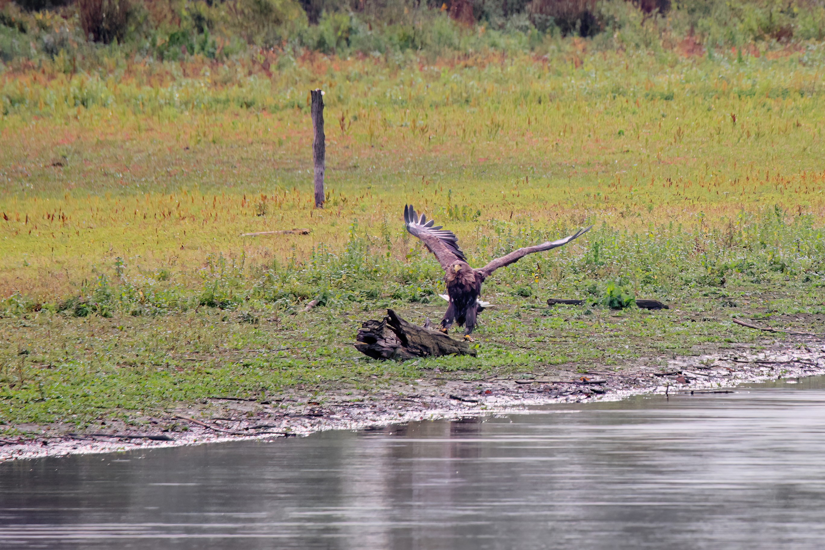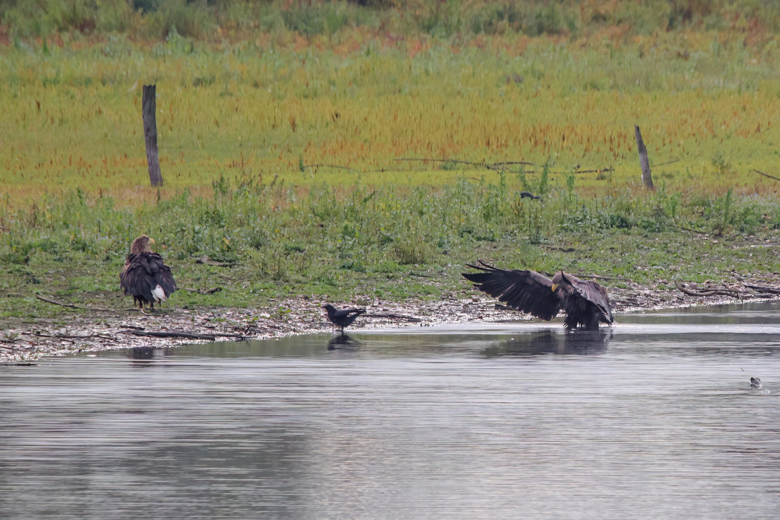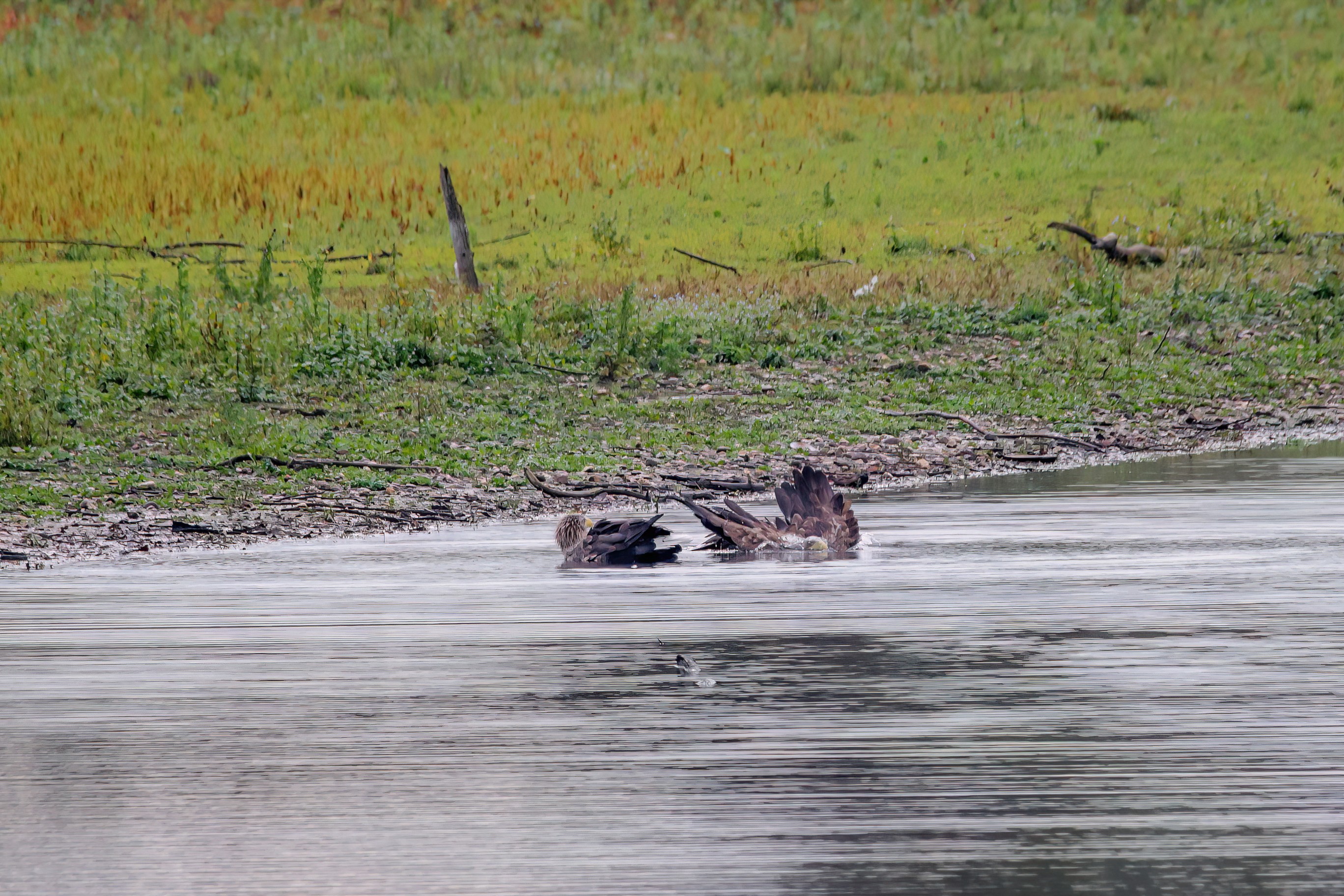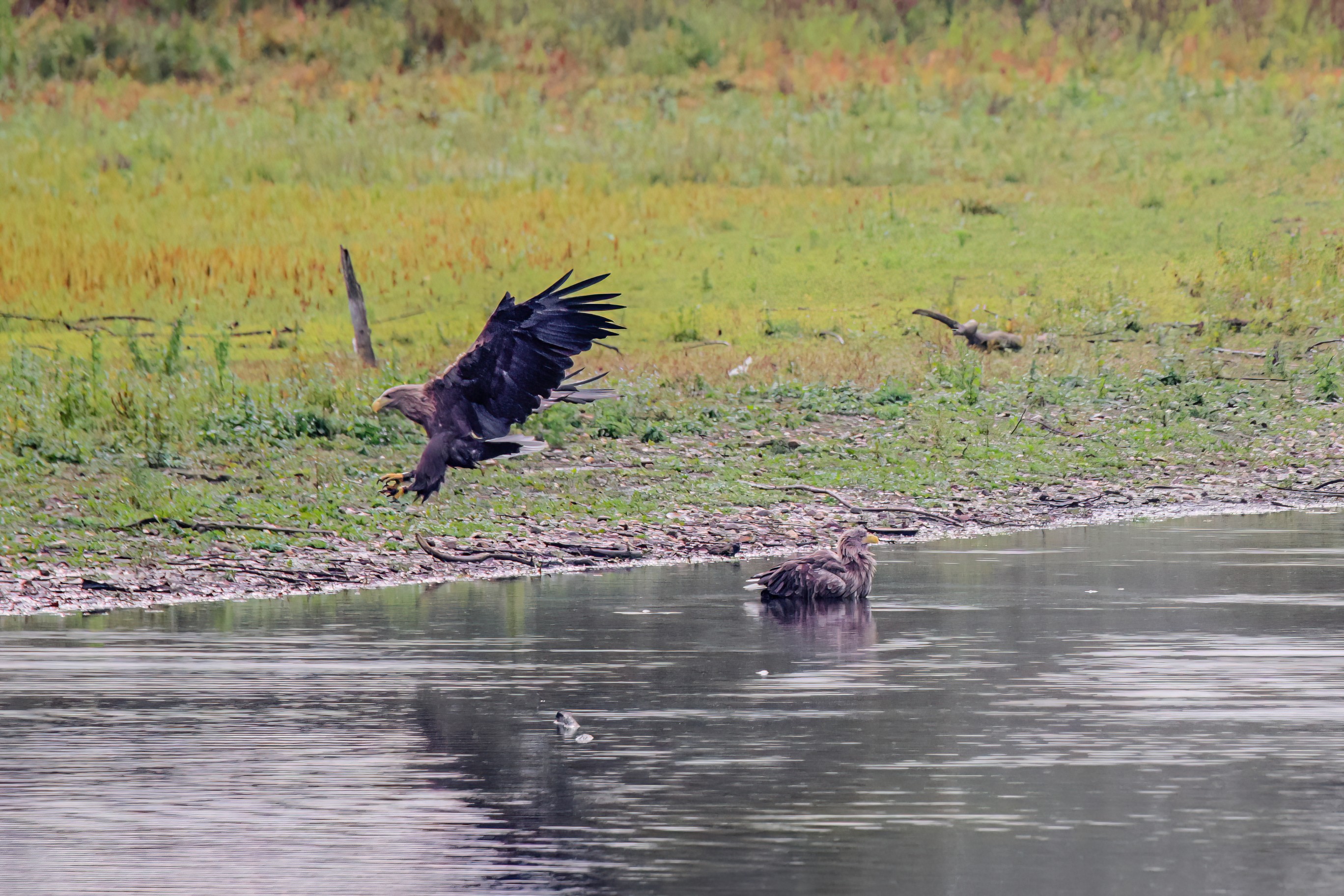 Erfolgreicher Beutefang des neuen Seeadlerweibchens am Ende des Gewässers der Beobchtungshütte III. Im zweiten Anflug wurde eine Stockente geschlagen. Eine weitere Bildstrecke zeigt den Habitatsgründer "Rheingold" mit dem neuen Seeadlerweibchen beim gemeinsamen Badevergnügen.