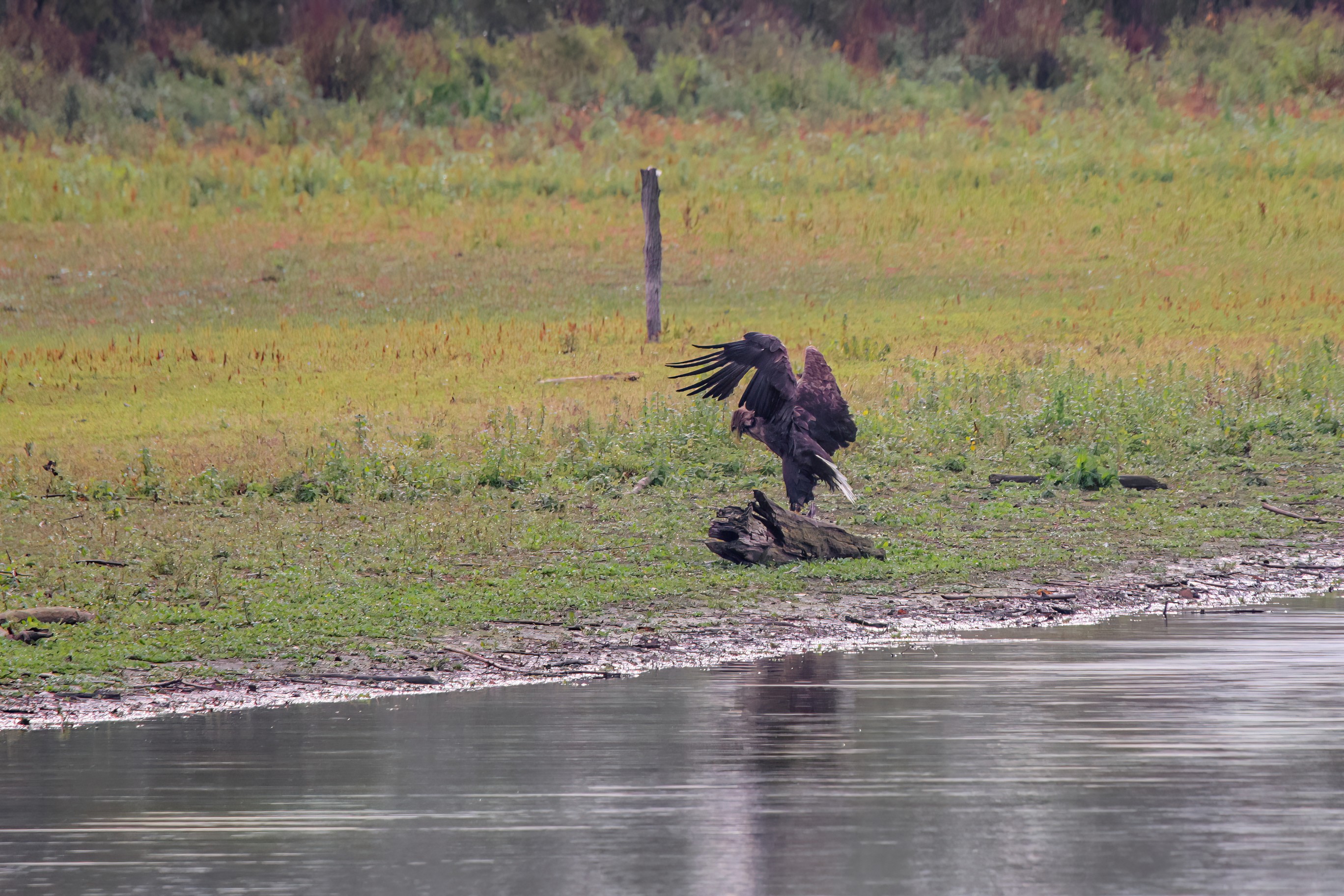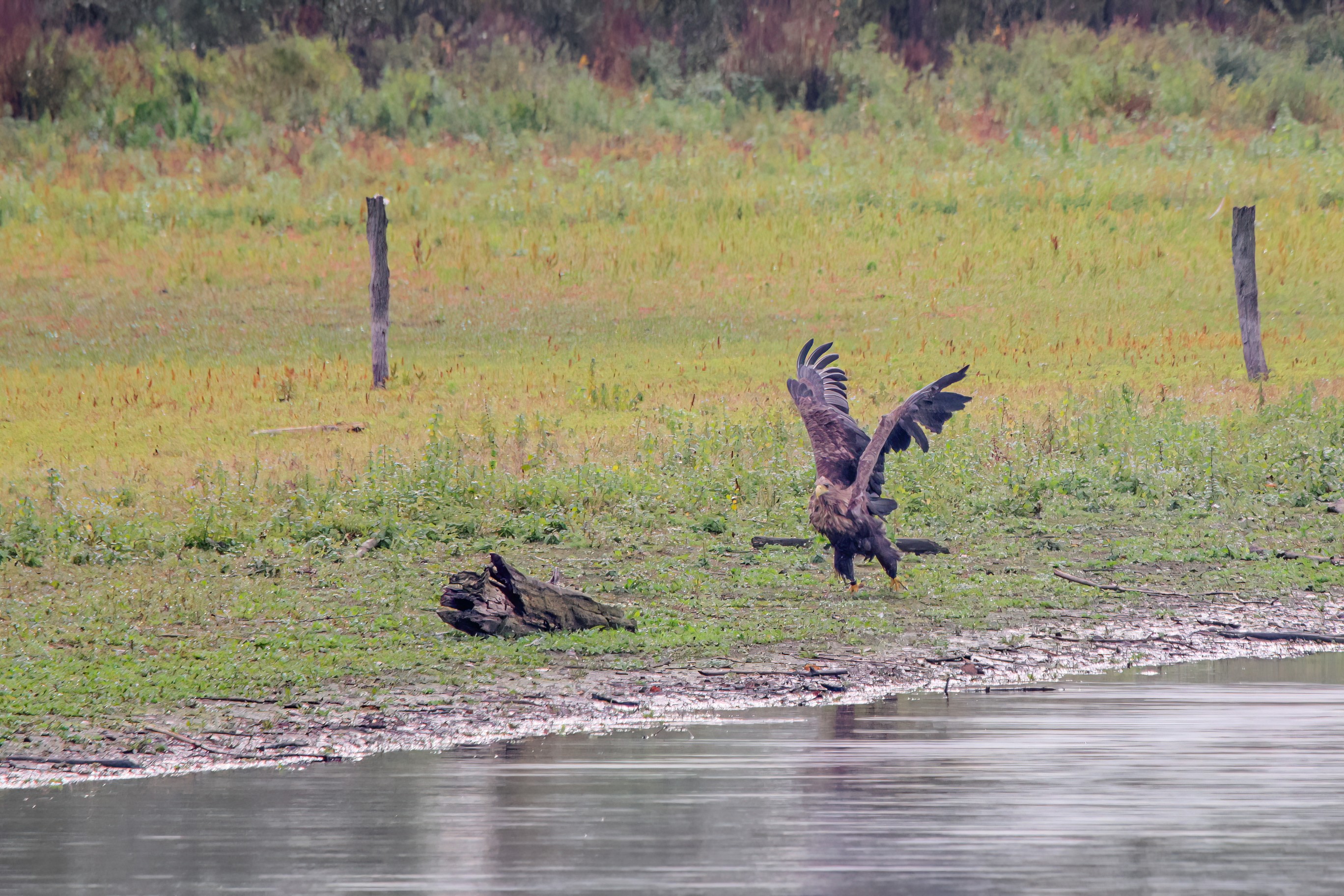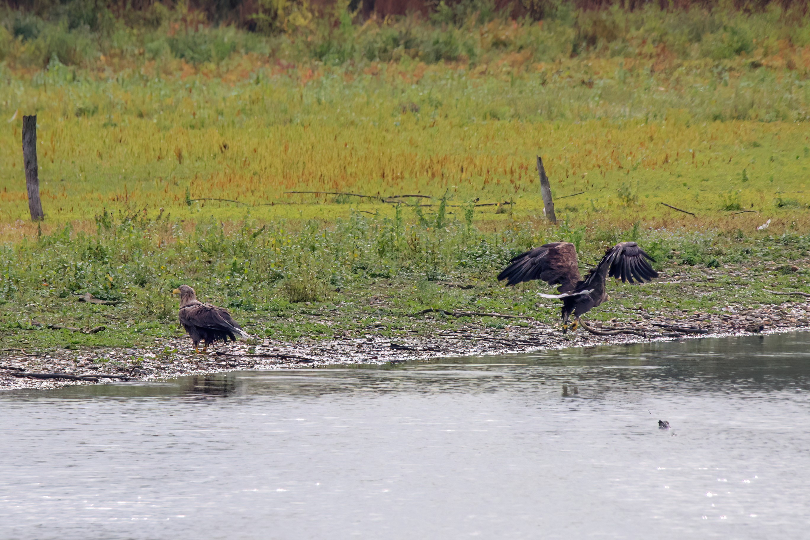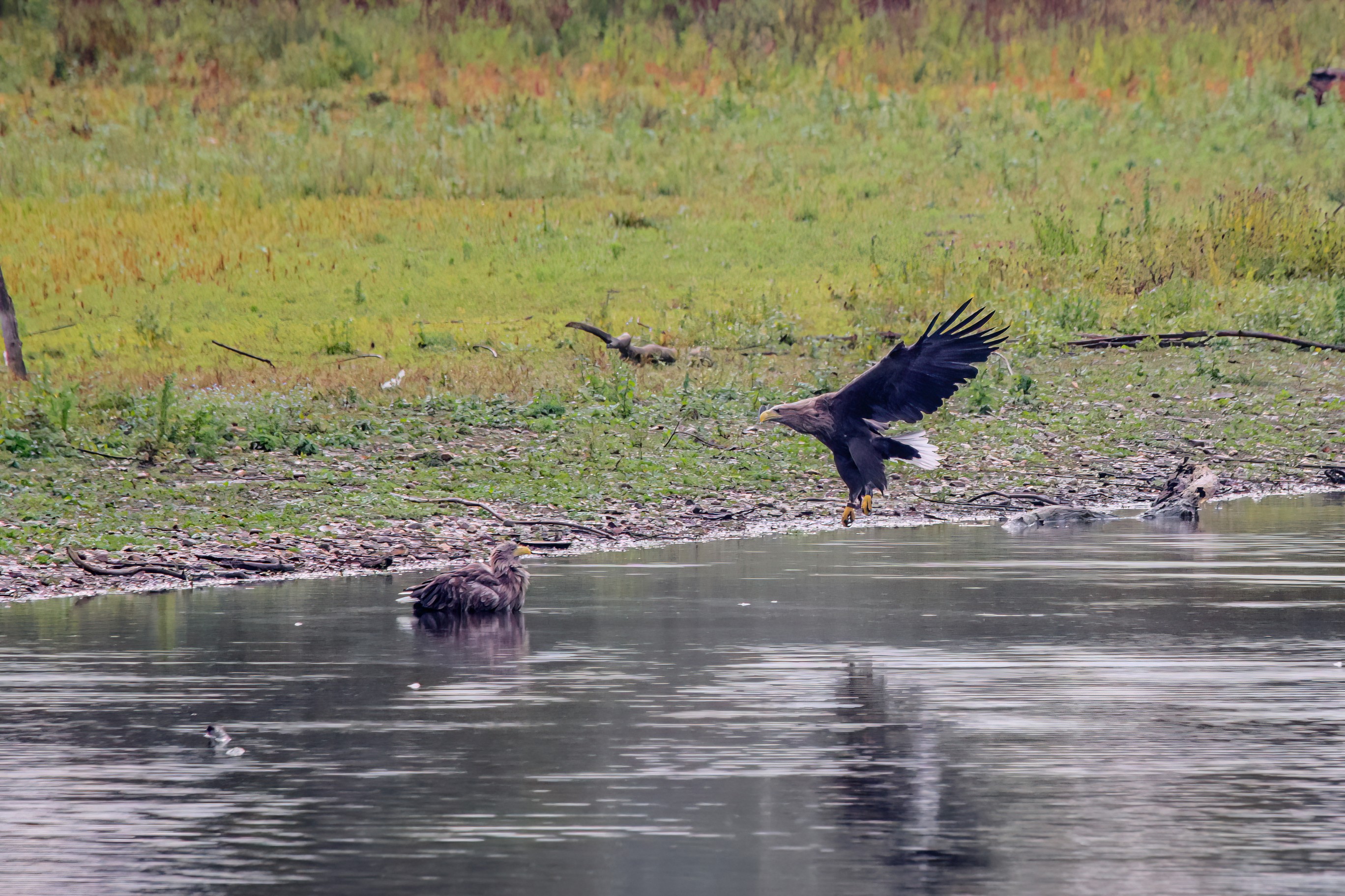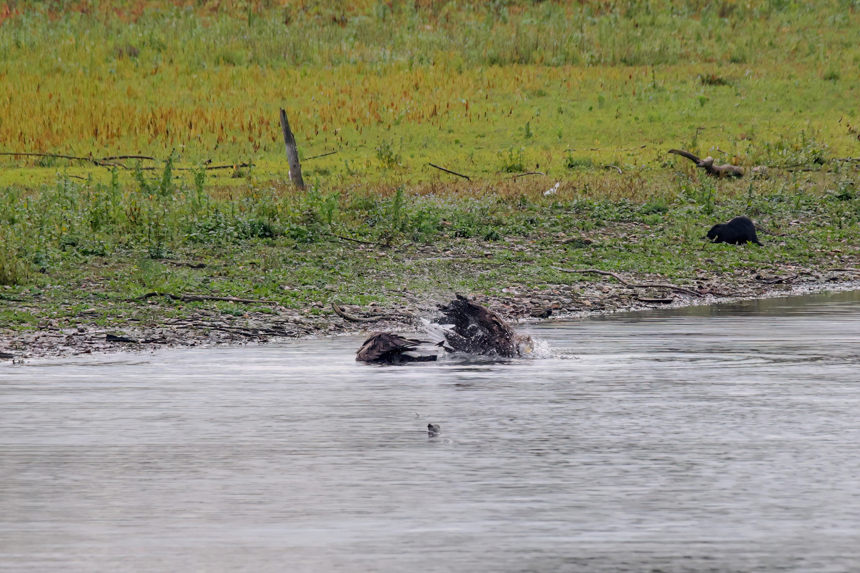 Erfolgreicher Beutefang des neuen Seeadlerweibchens am Ende des Gewässers der Beobchtungshütte III. Im zweiten Anflug wurde eine Stockente geschlagen. Eine weitere Bildstrecke zeigt den Habitatsgründer "Rheingold" mit dem neuen Seeadlerweibchen beim gemeinsamen Badevergnügen.