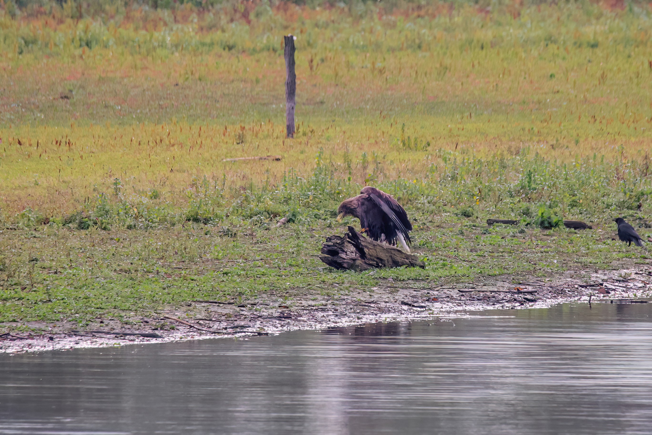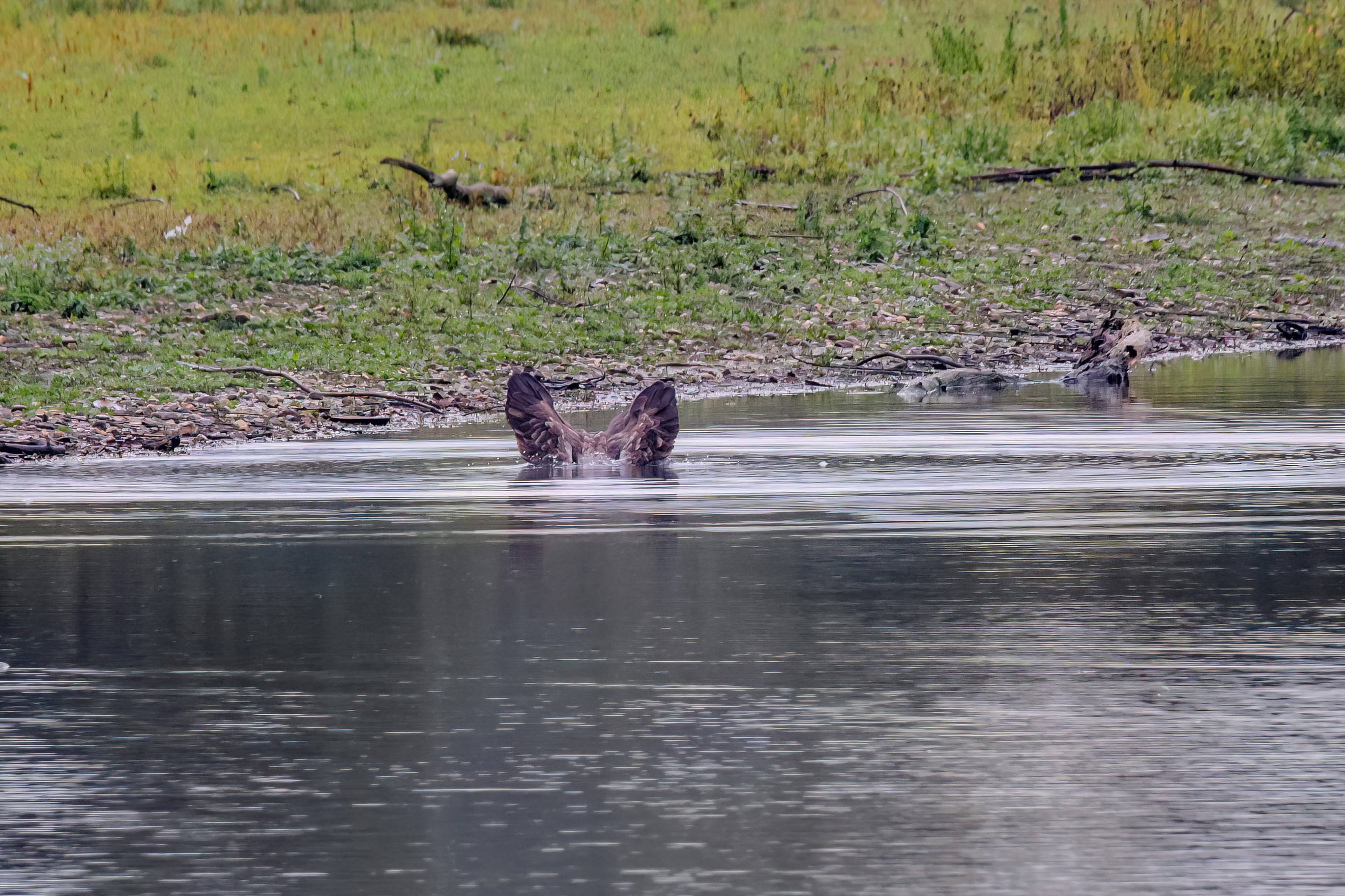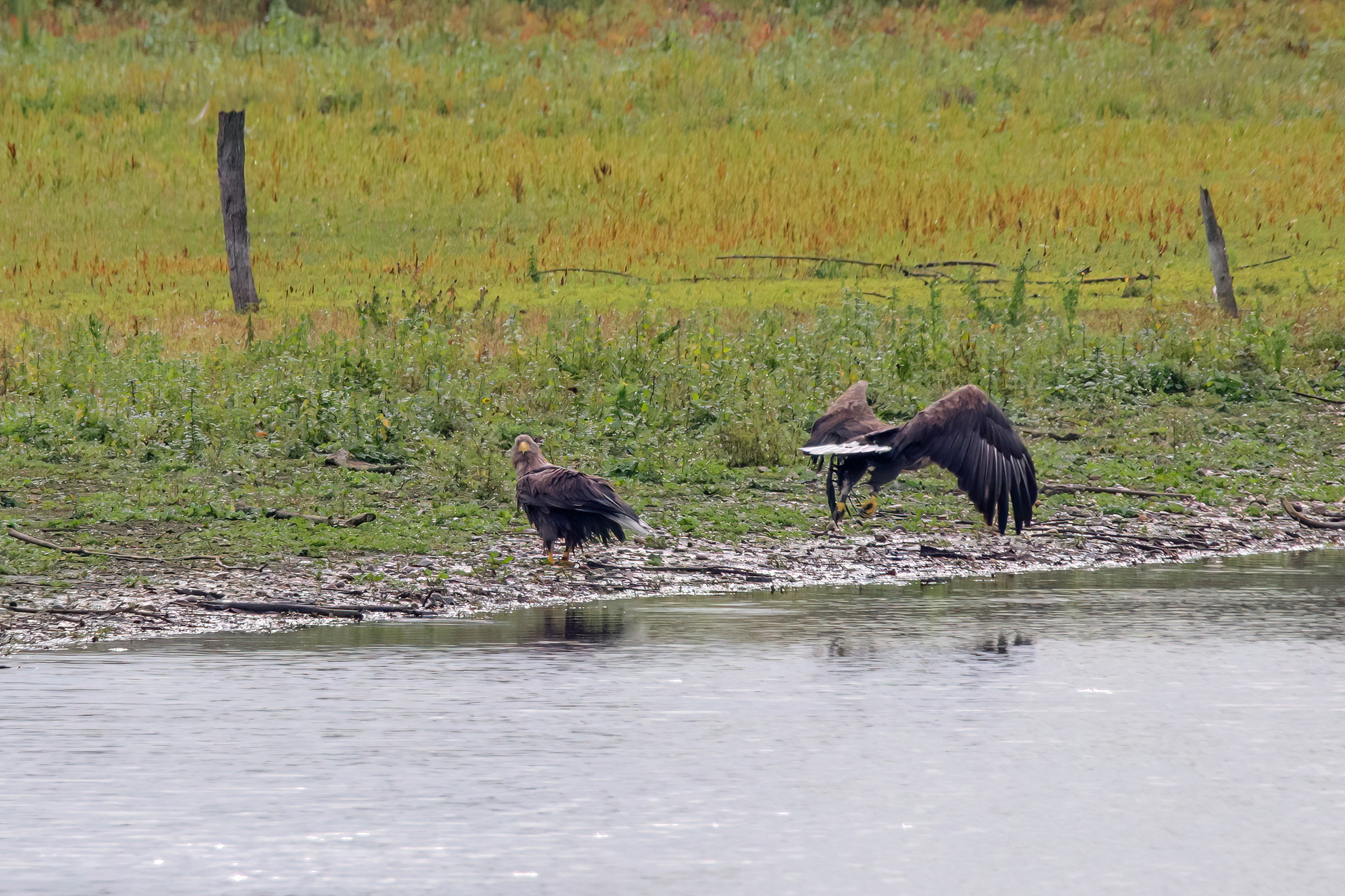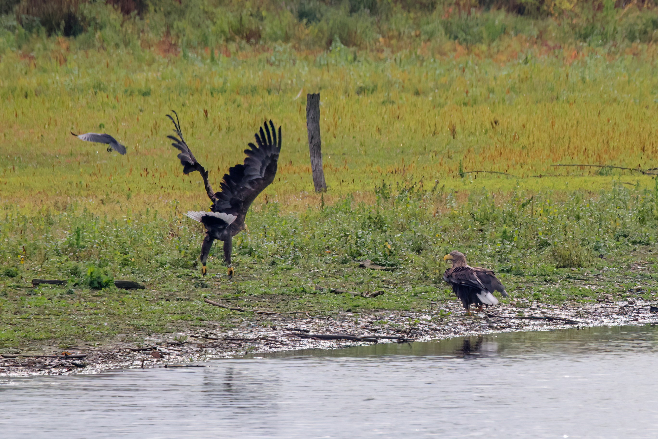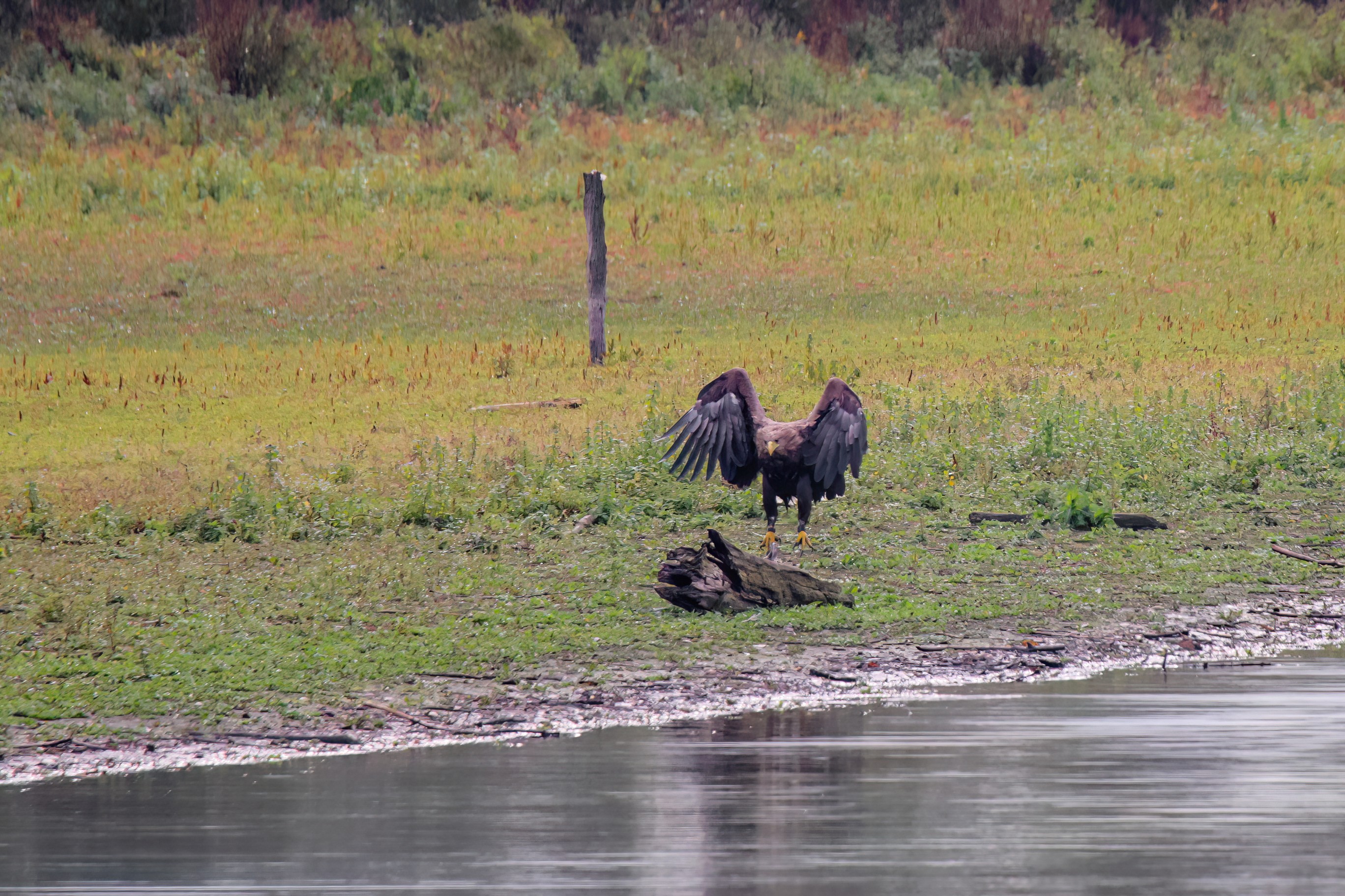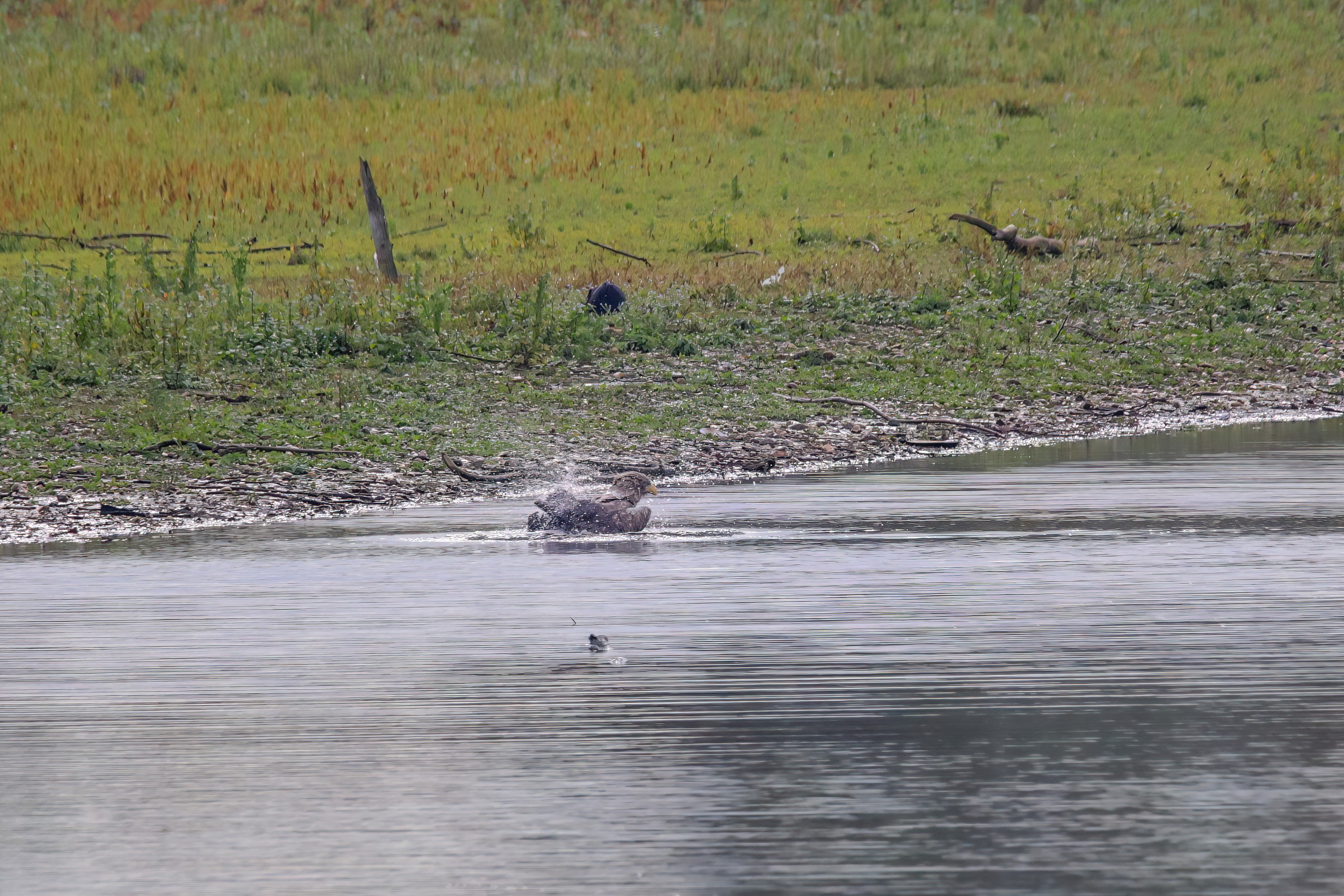 Erfolgreicher Beutefang des neuen Seeadlerweibchens am Ende des Gewässers der Beobchtungshütte III. Im zweiten Anflug wurde eine Stockente geschlagen. Eine weitere Bildstrecke zeigt den Habitatsgründer "Rheingold" mit dem neuen Seeadlerweibchen beim gemeinsamen Badevergnügen.