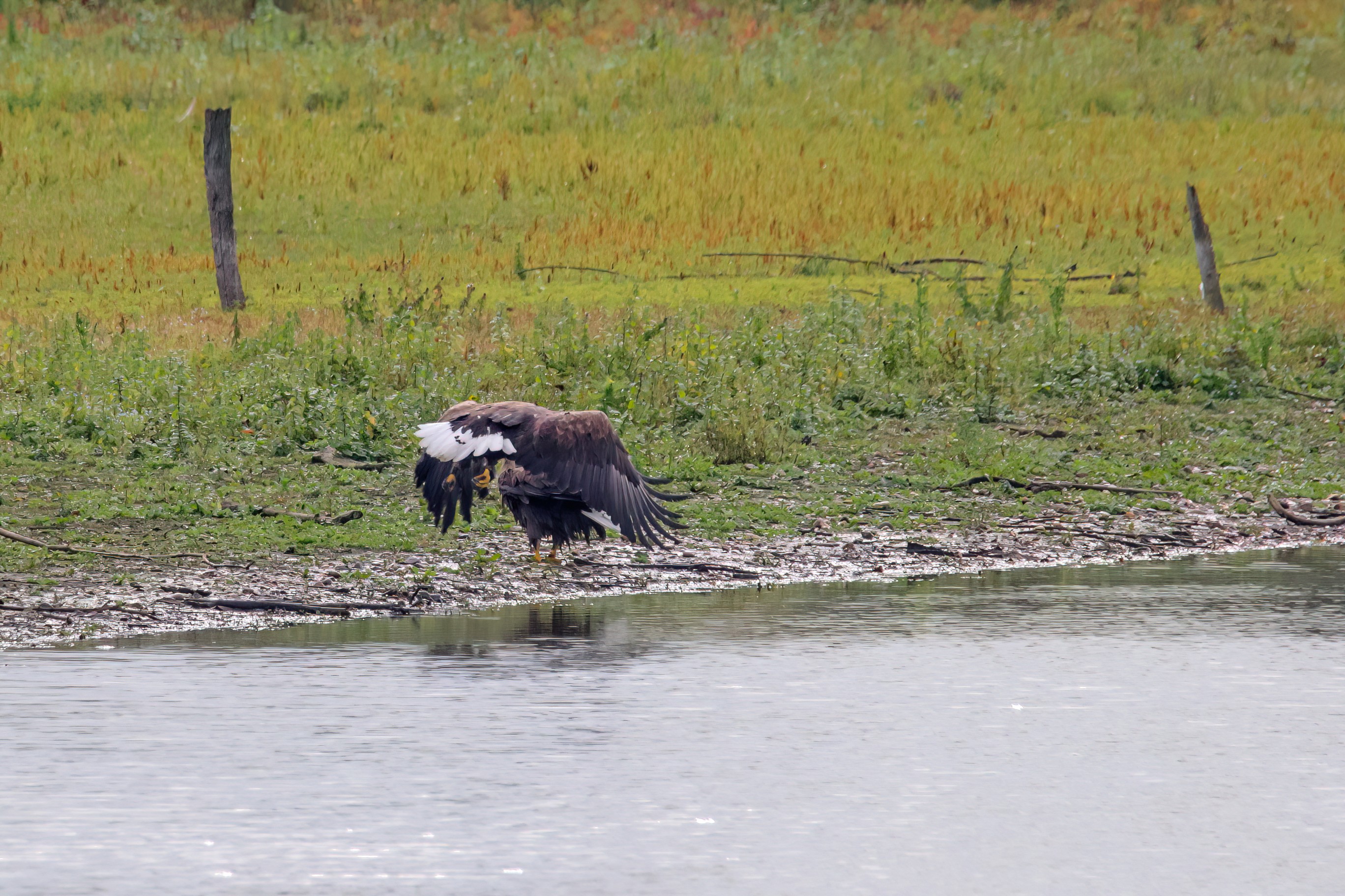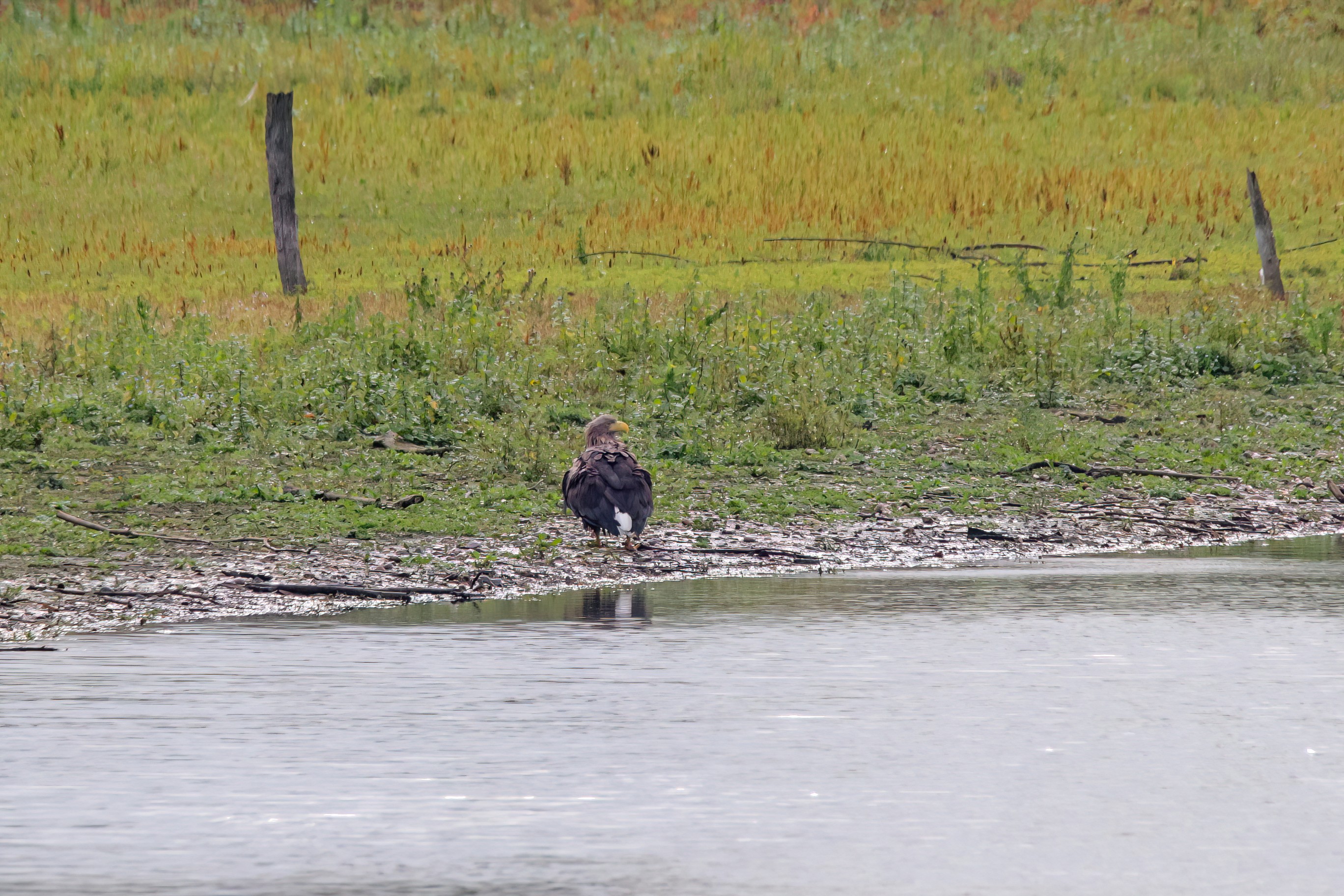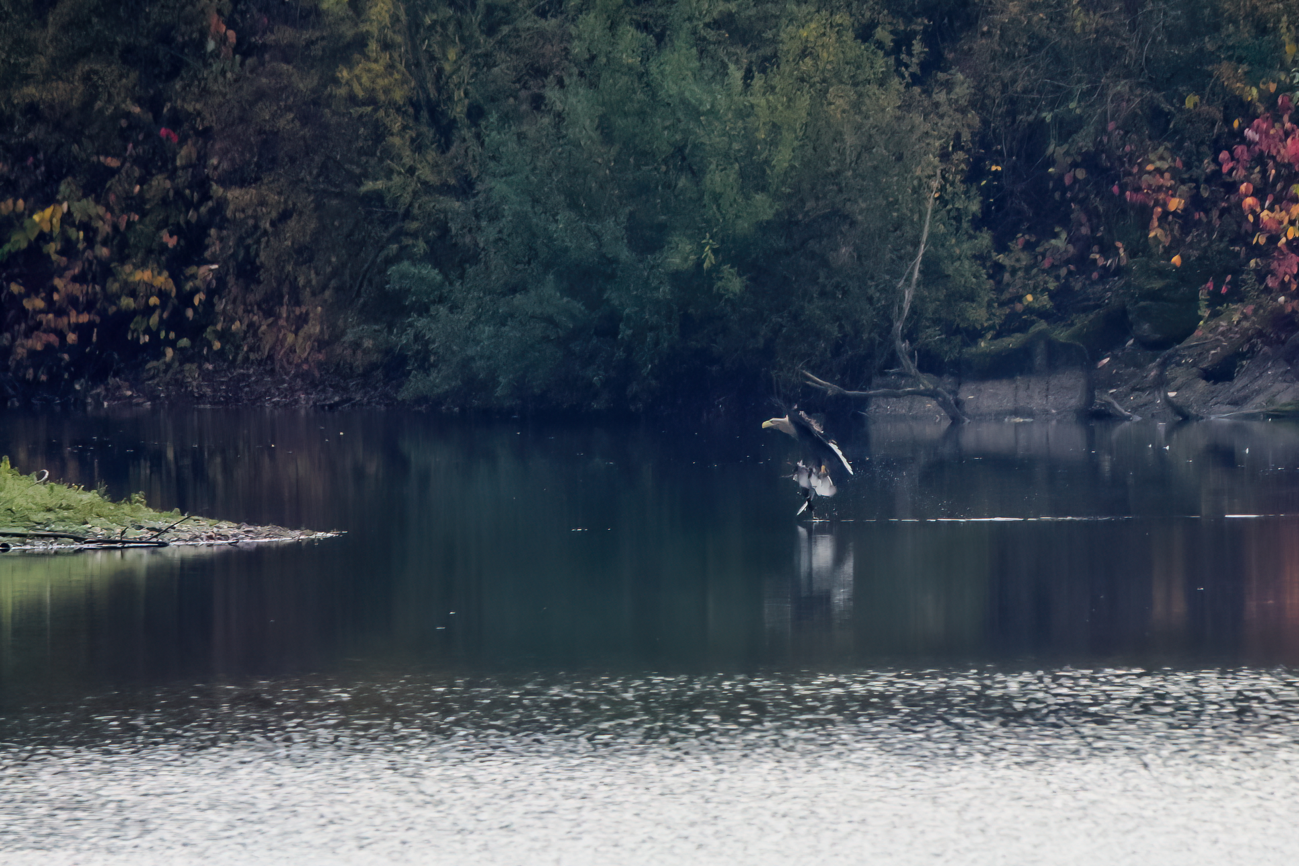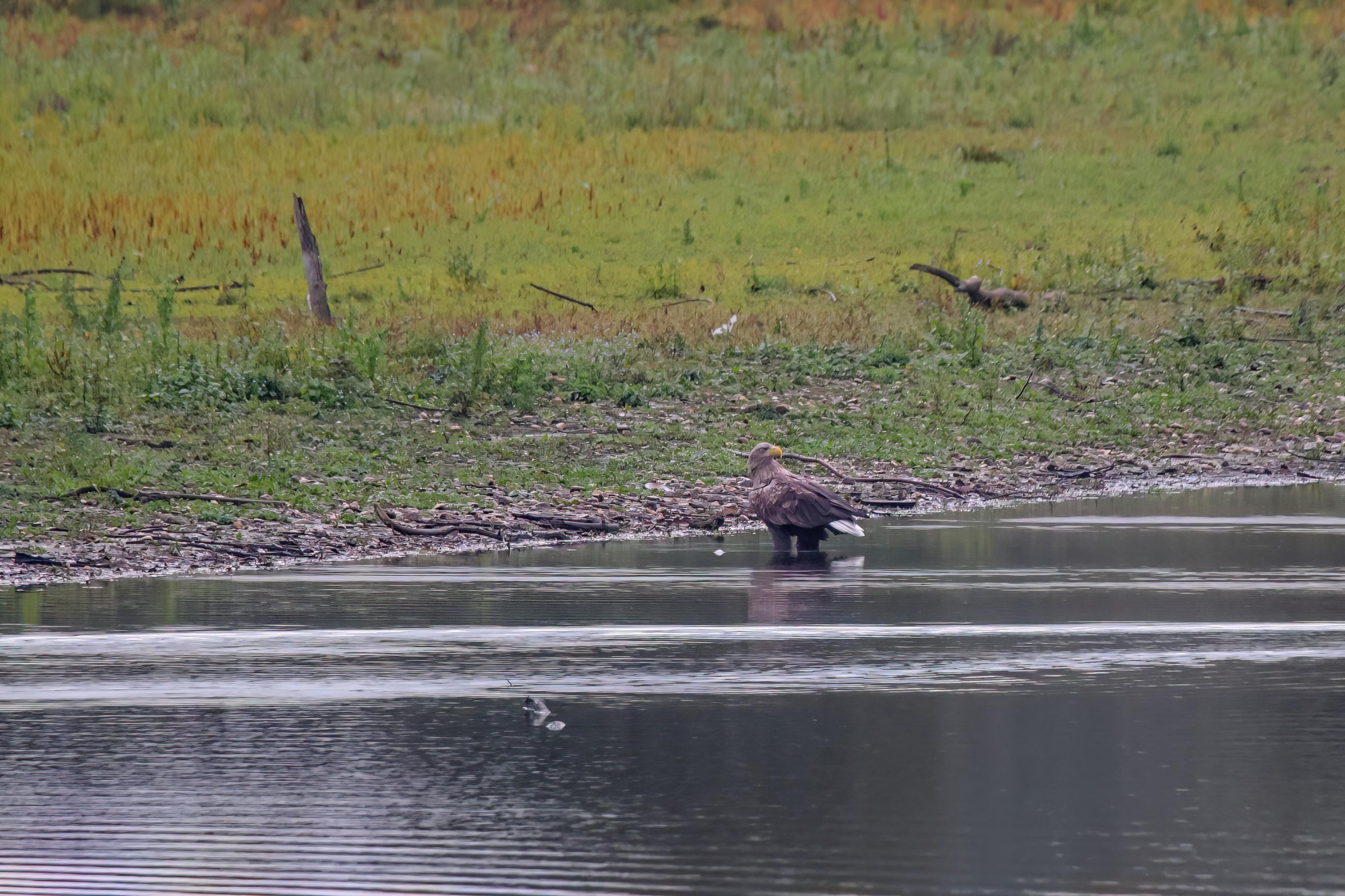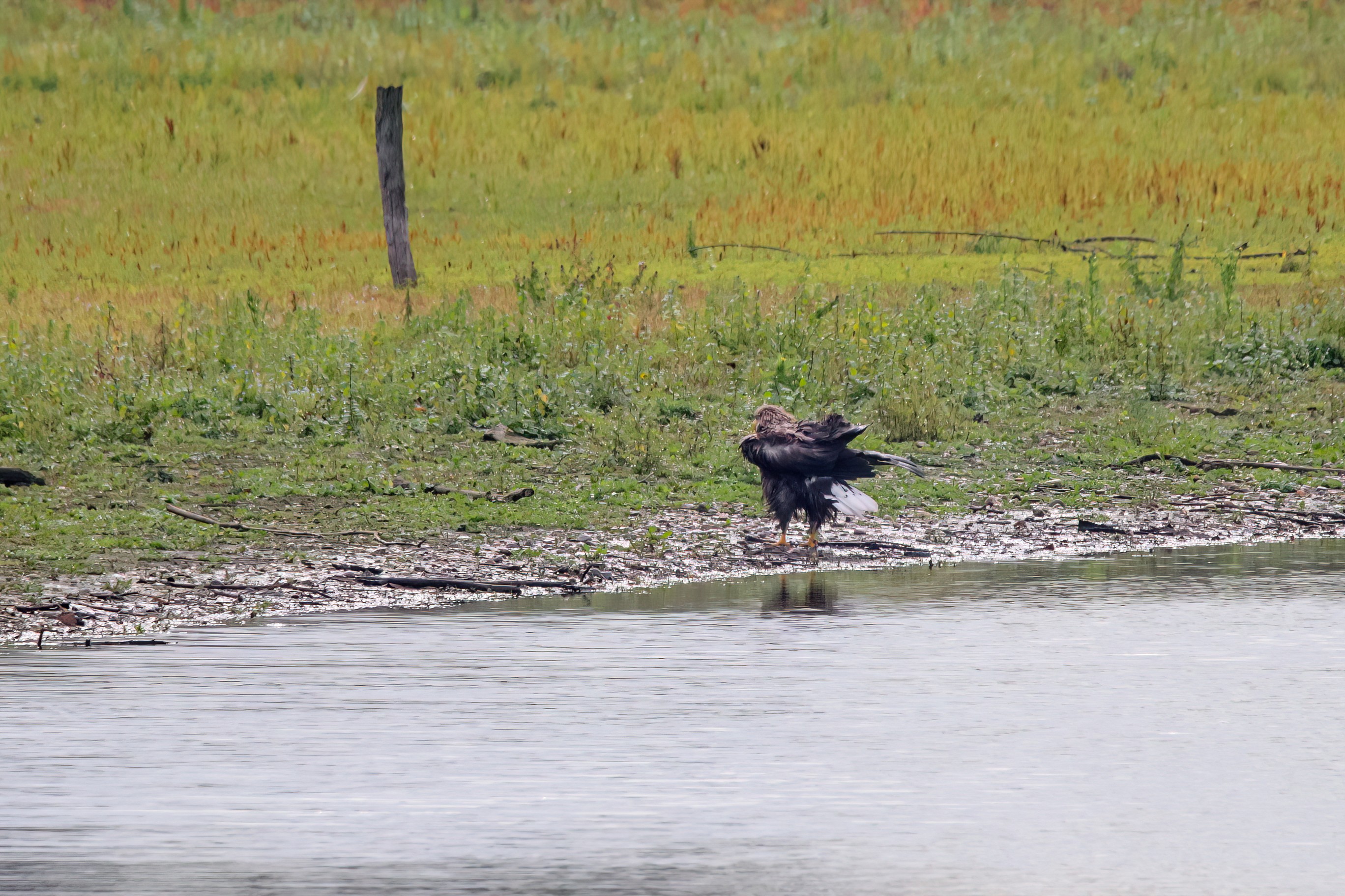 Erfolgreicher Beutefang des neuen Seeadlerweibchens am Ende des Gewässers der Beobchtungshütte III. Im zweiten Anflug wurde eine Stockente geschlagen. Eine weitere Bildstrecke zeigt den Habitatsgründer "Rheingold" mit dem neuen Seeadlerweibchen beim gemeinsamen Badevergnügen.