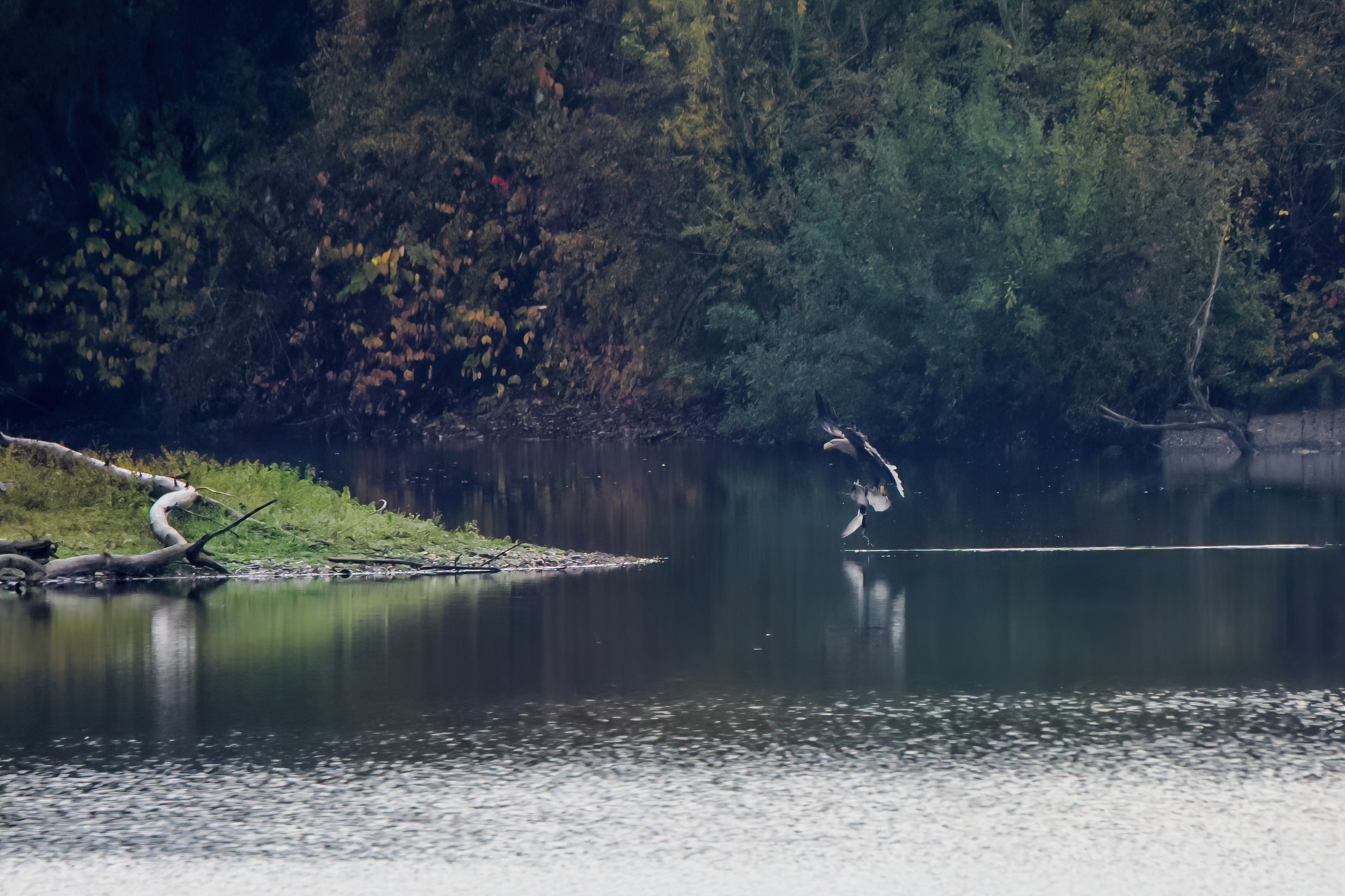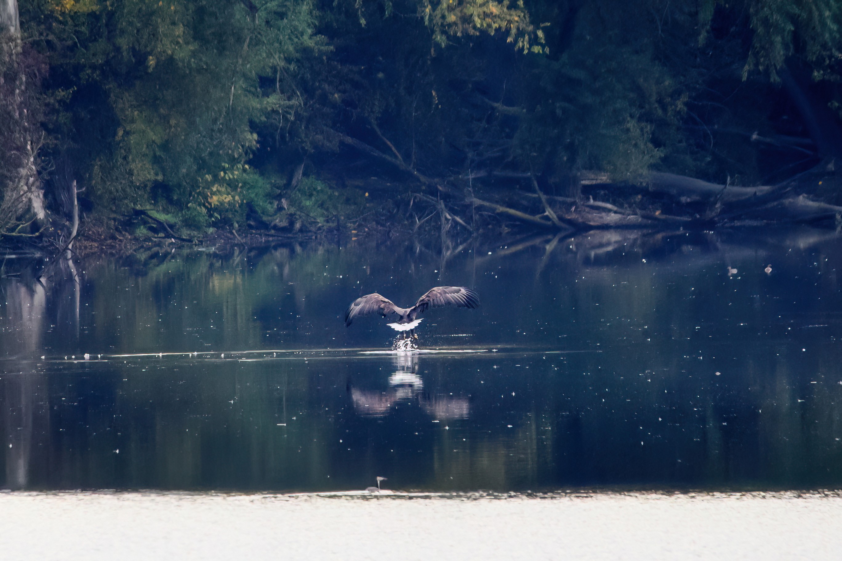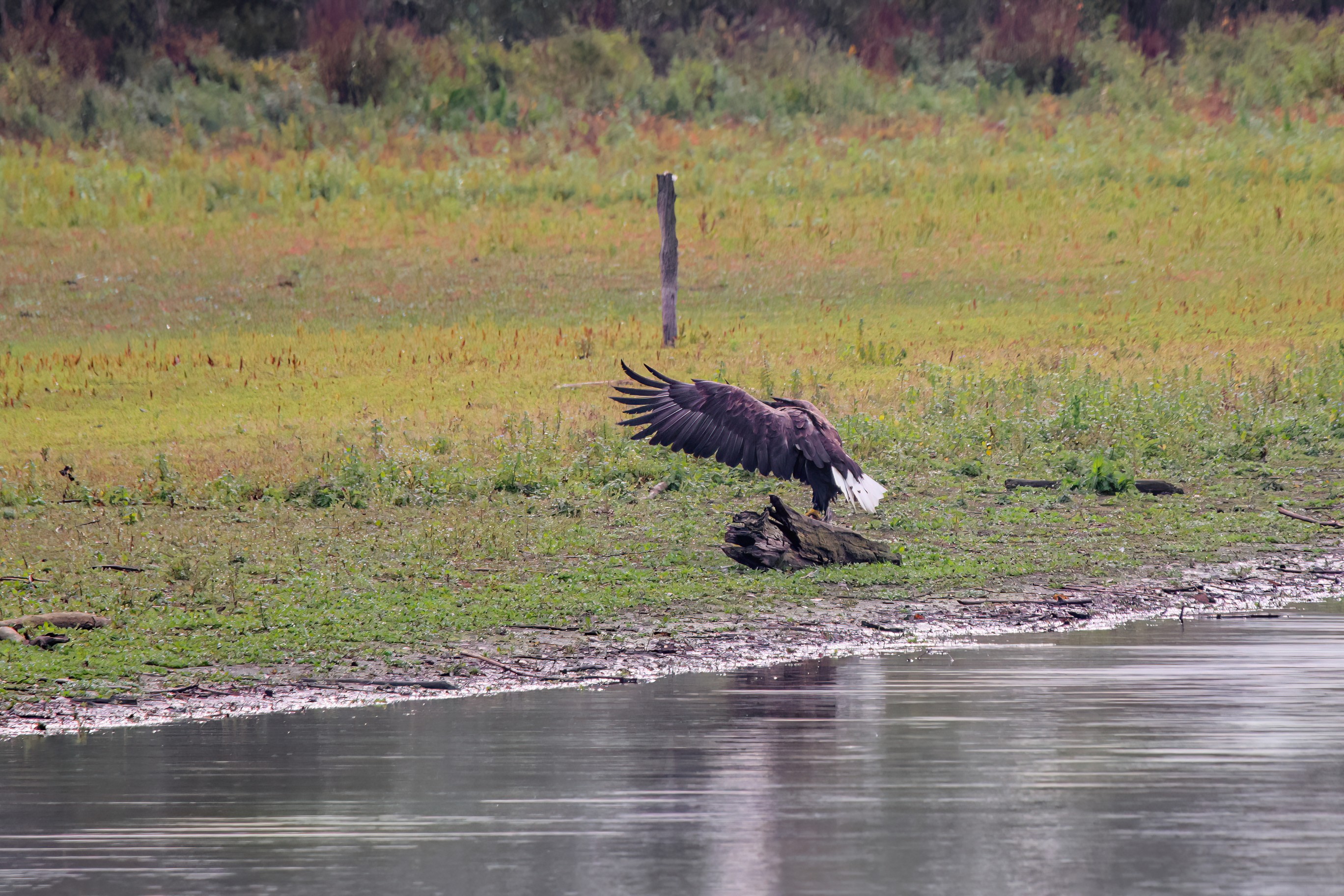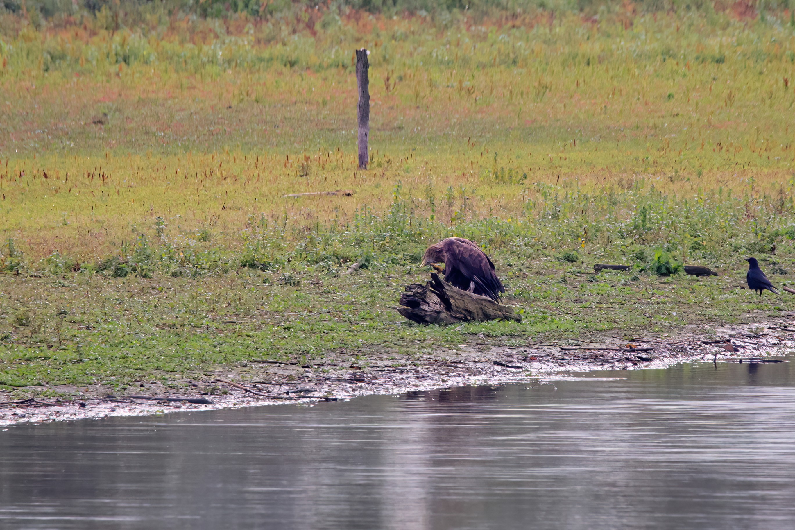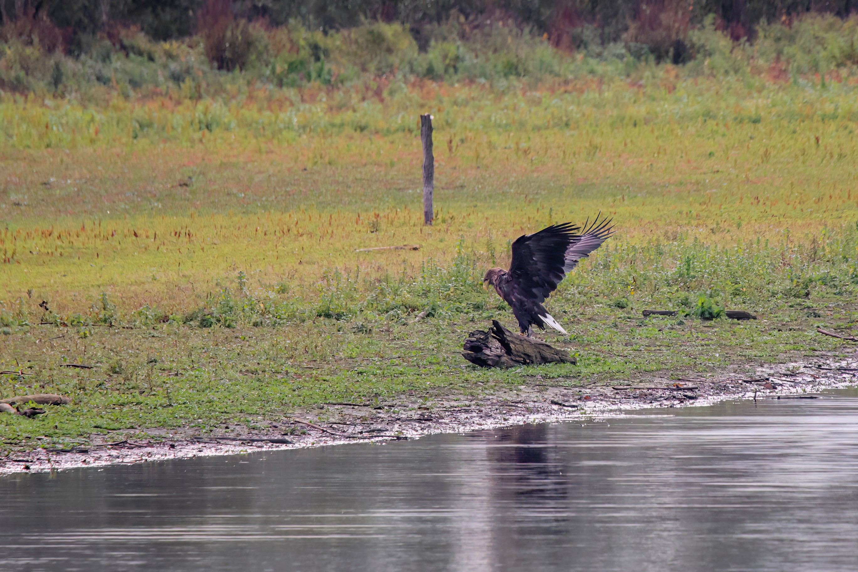 Erfolgreicher Beutefang des neuen Seeadlerweibchens am Ende des Gewässers der Beobchtungshütte III. Im zweiten Anflug wurde eine Stockente geschlagen. Eine weitere Bildstrecke zeigt den Habitatsgründer "Rheingold" mit dem neuen Seeadlerweibchen beim gemeinsamen Badevergnügen.