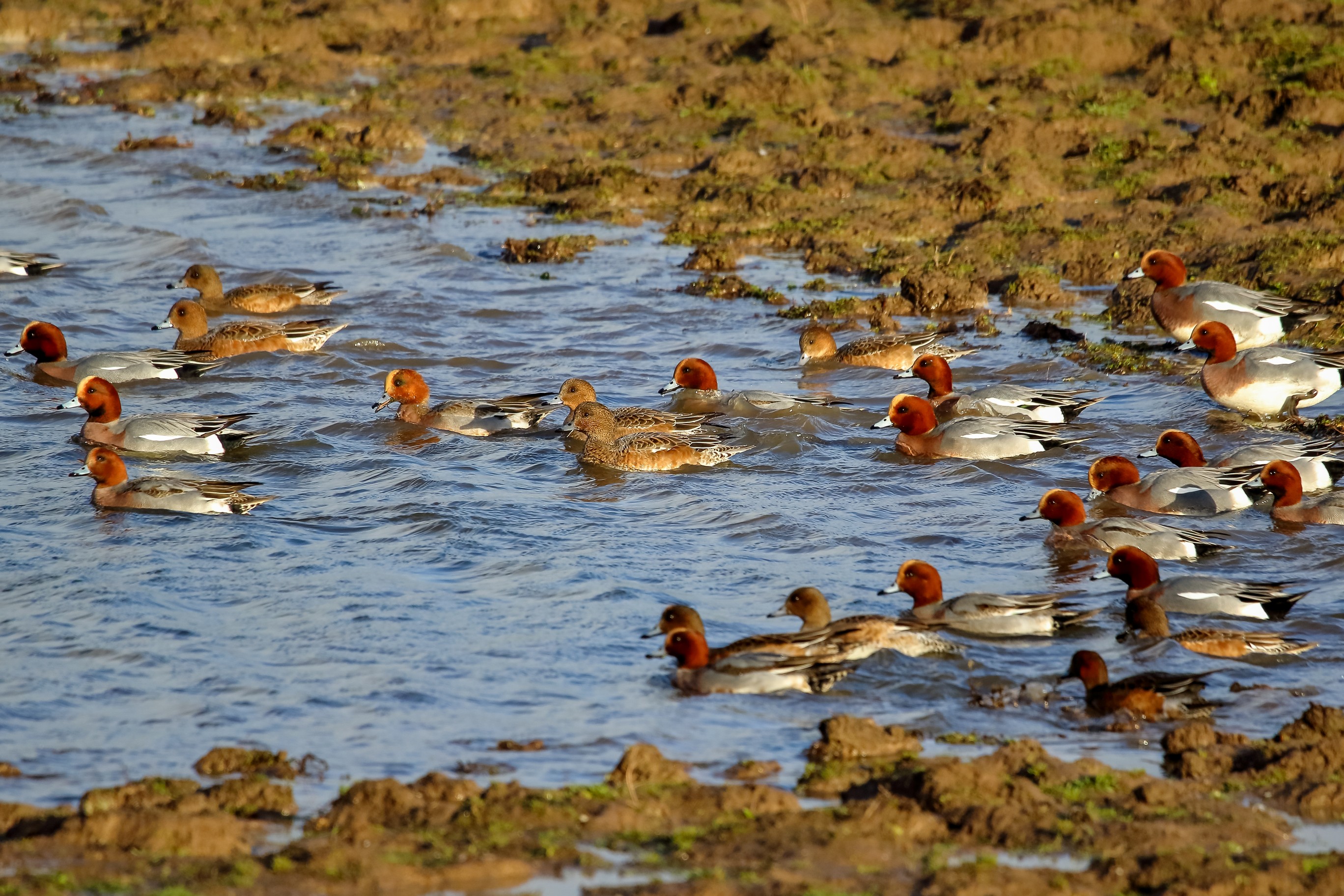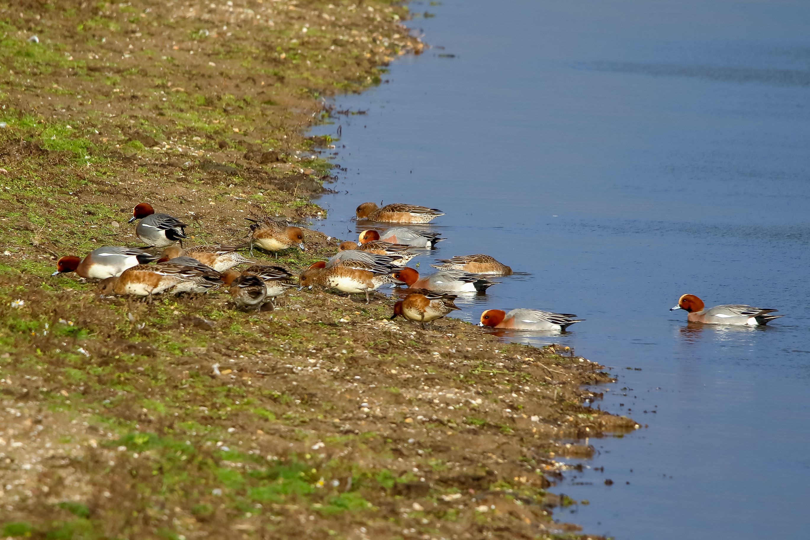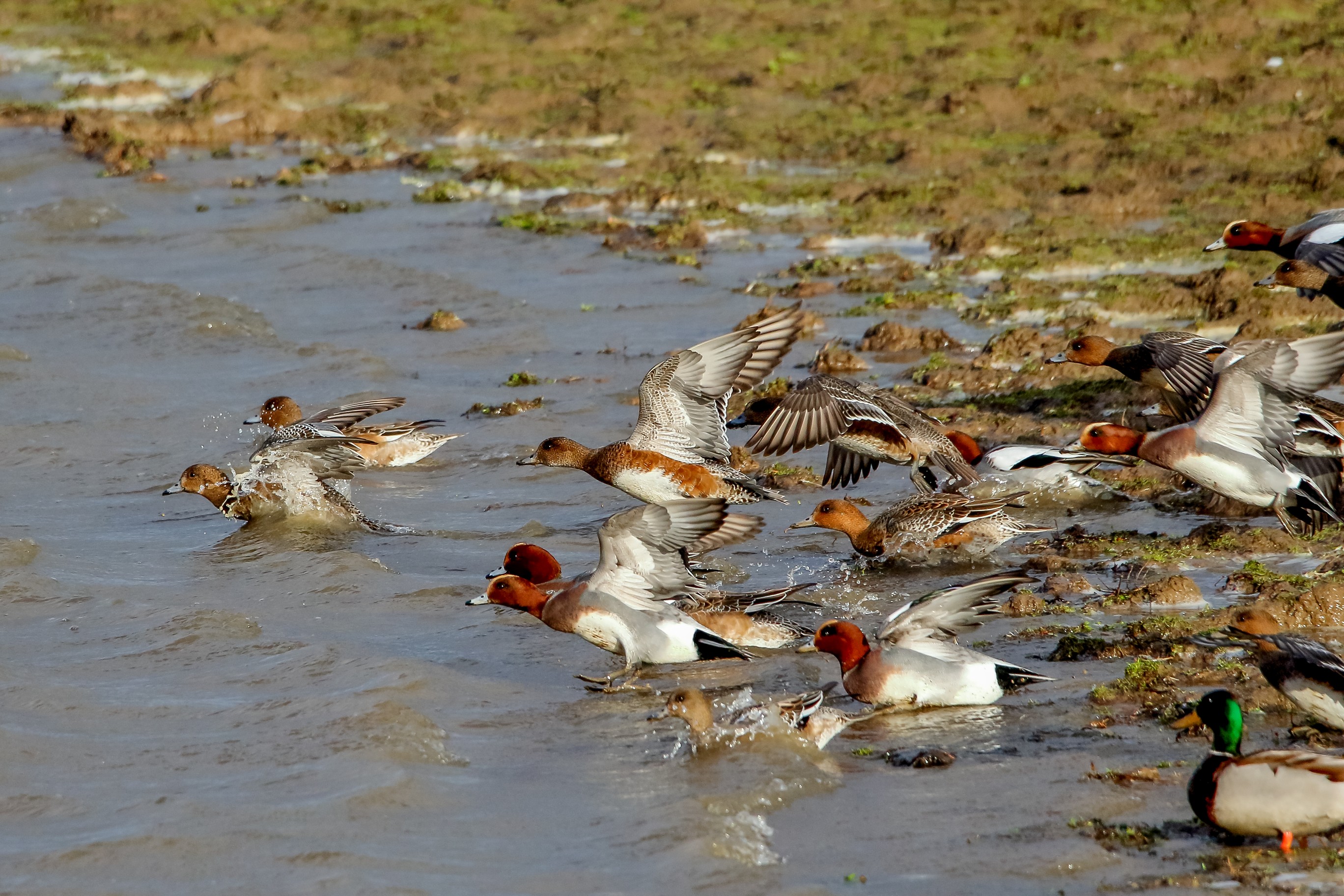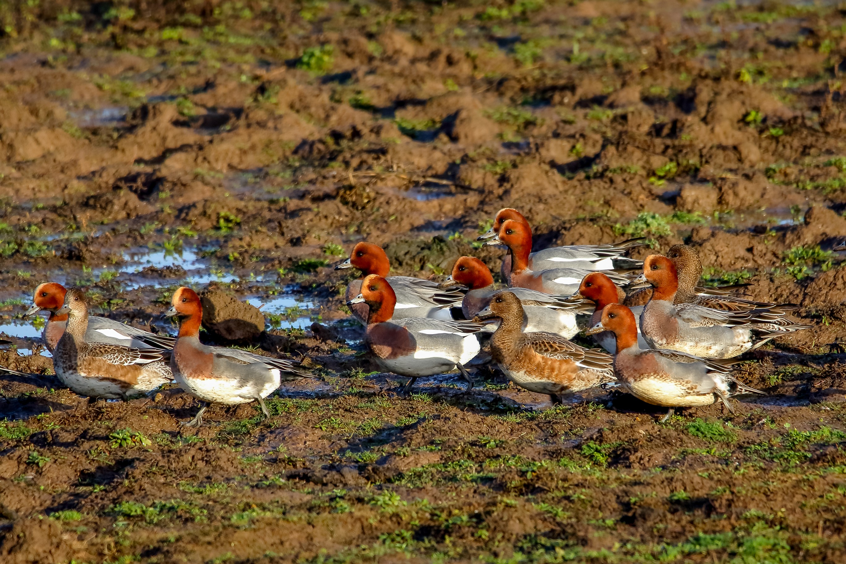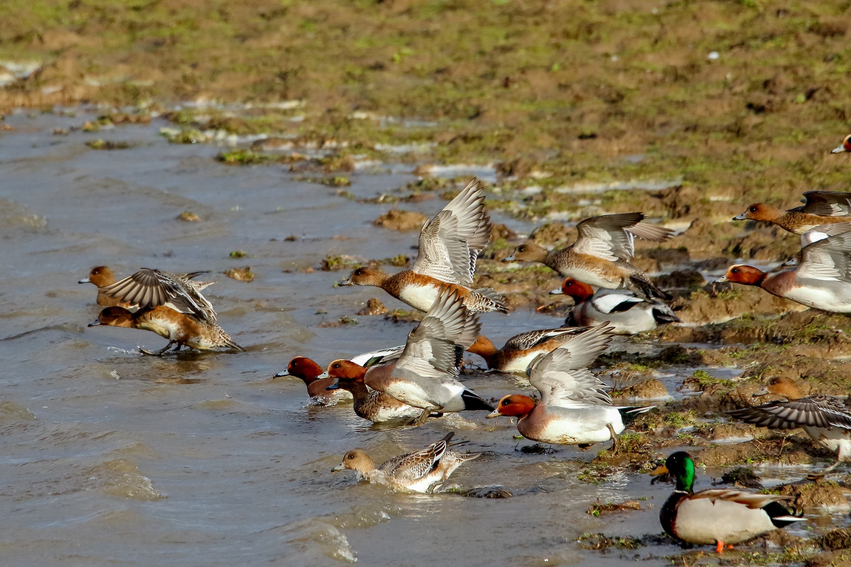Eine aktive Truppe Pfeifenten an der Flutmulde