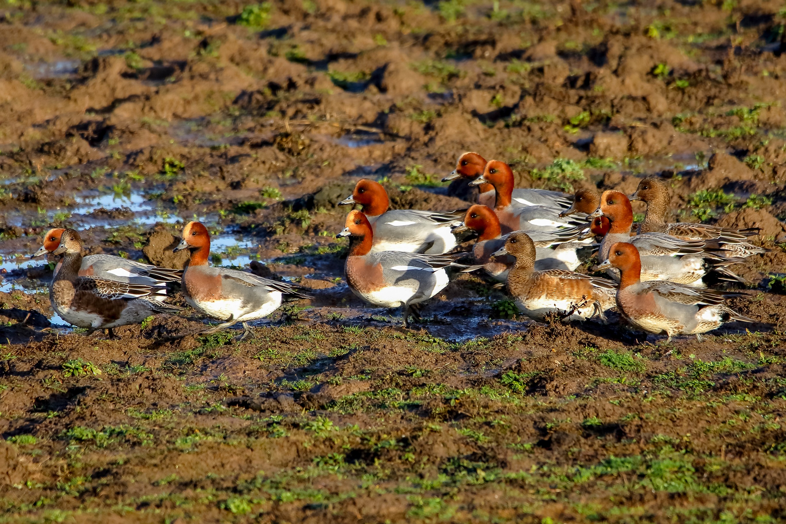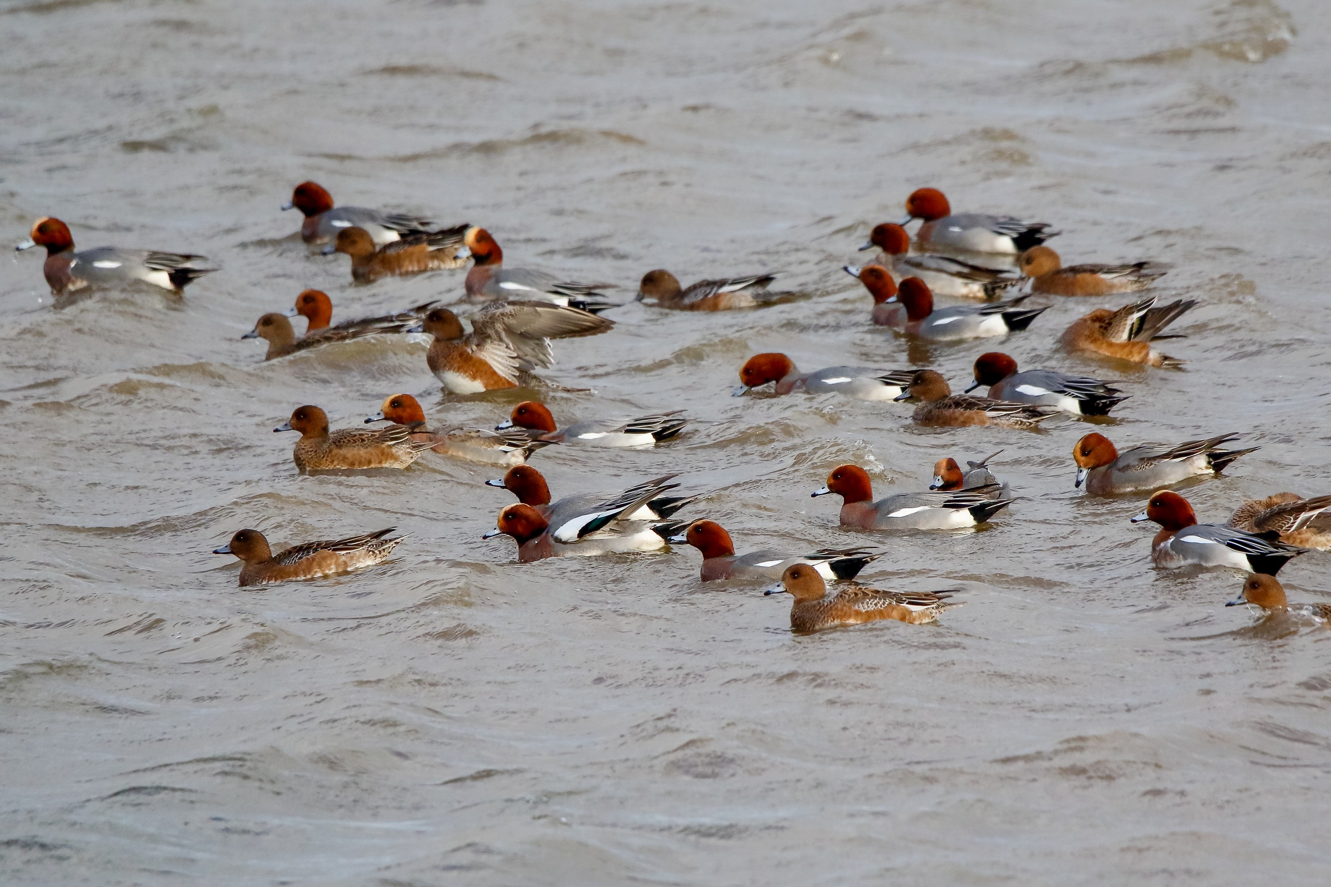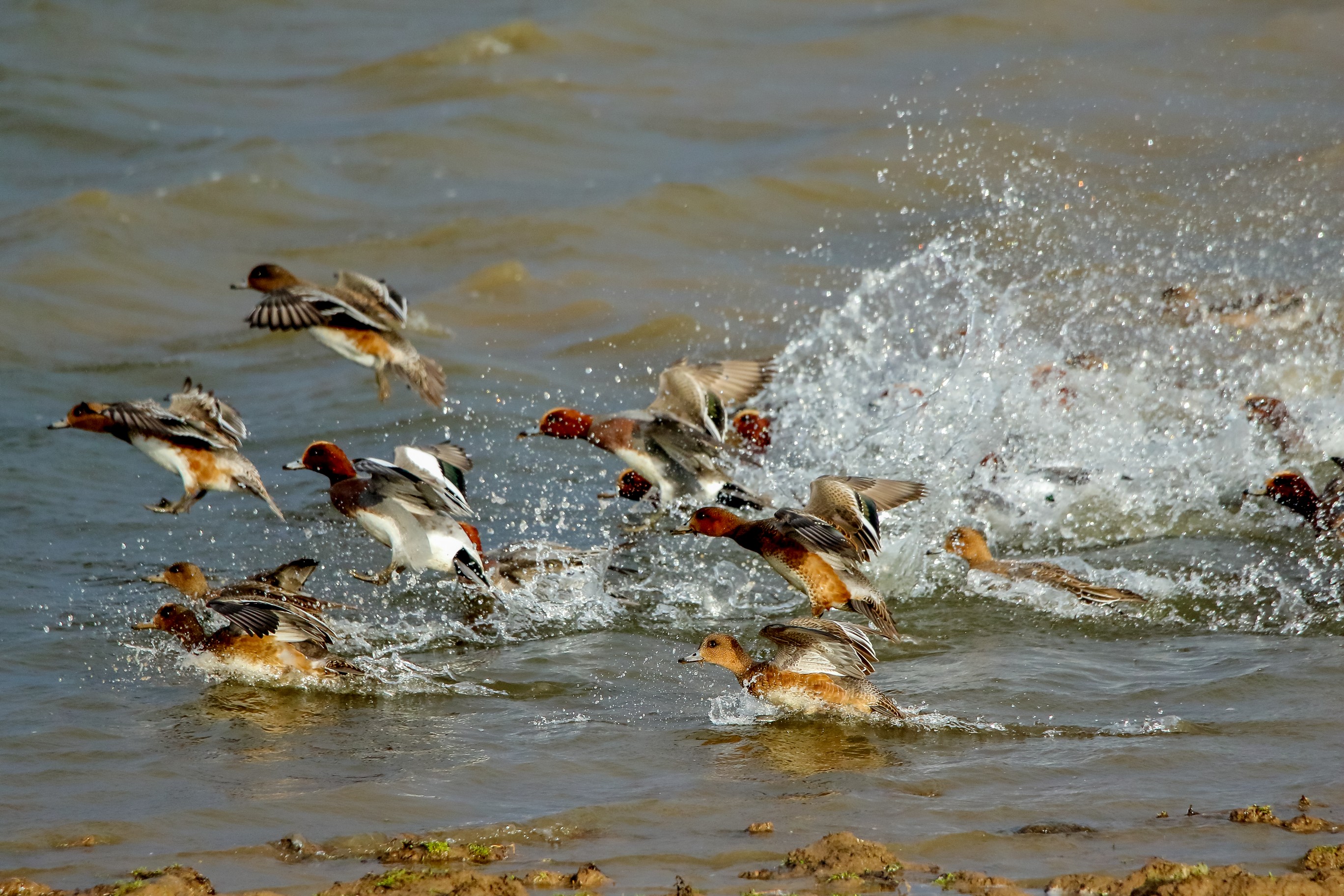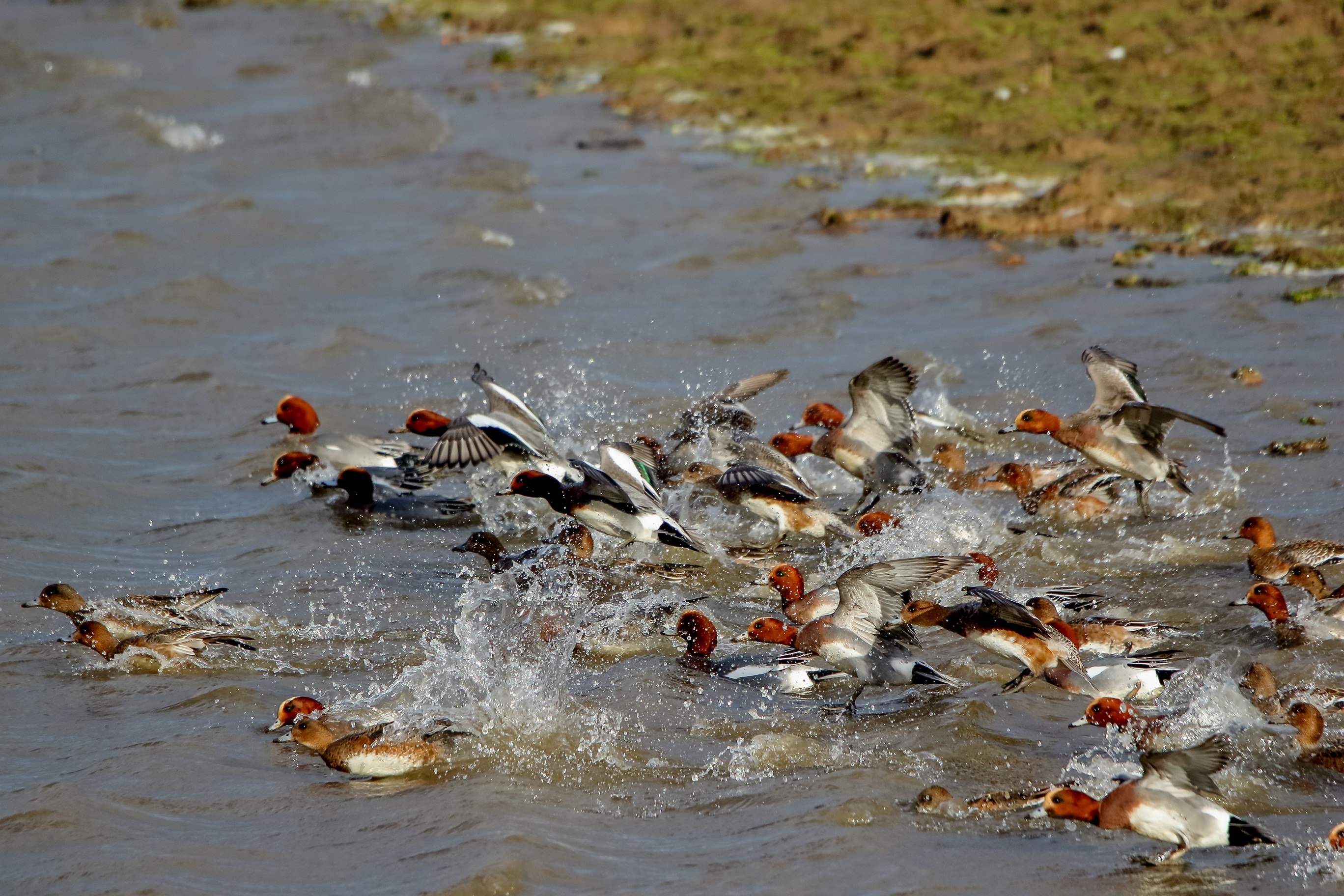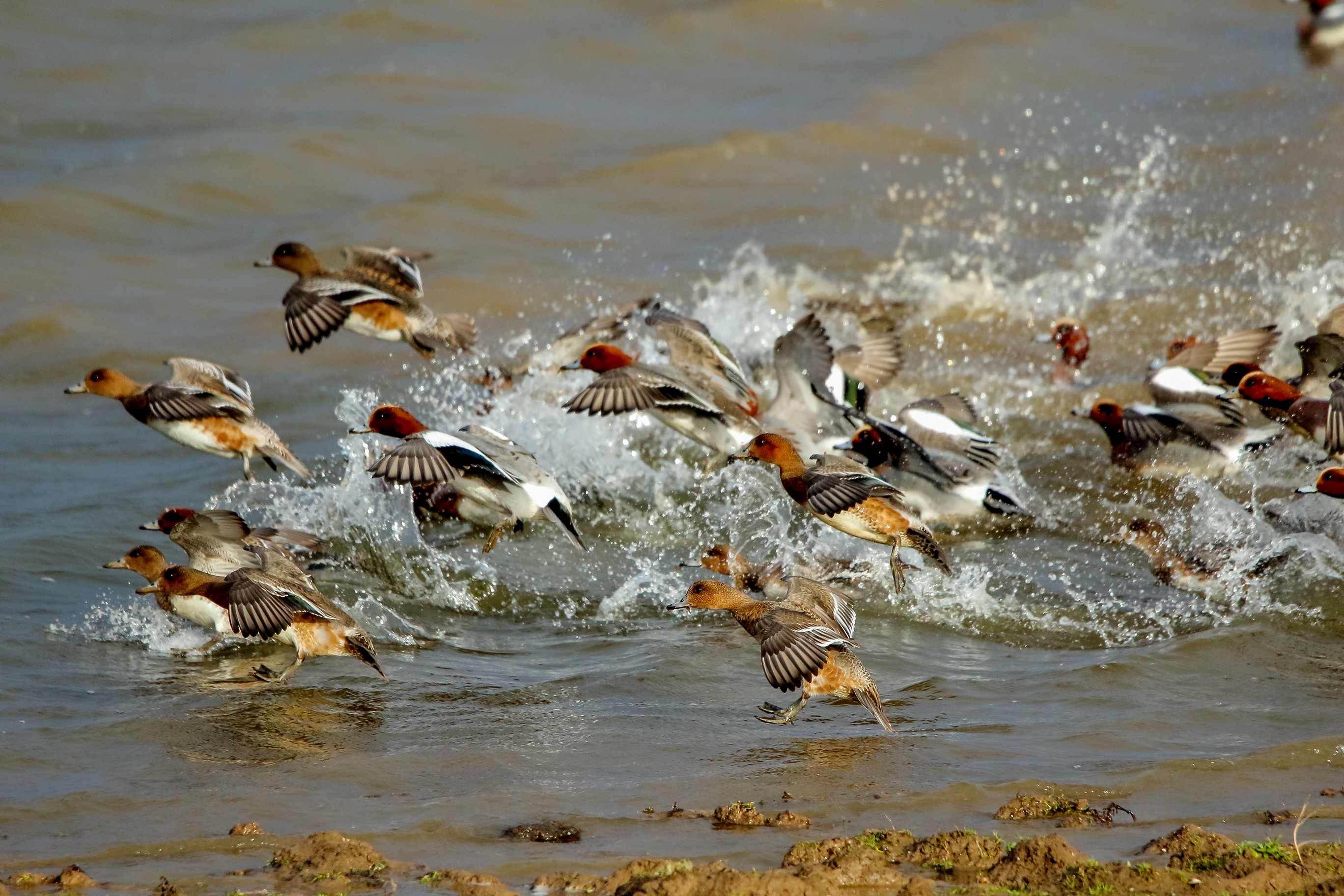 Eine aktive Truppe Pfeifenten an der Flutmulde