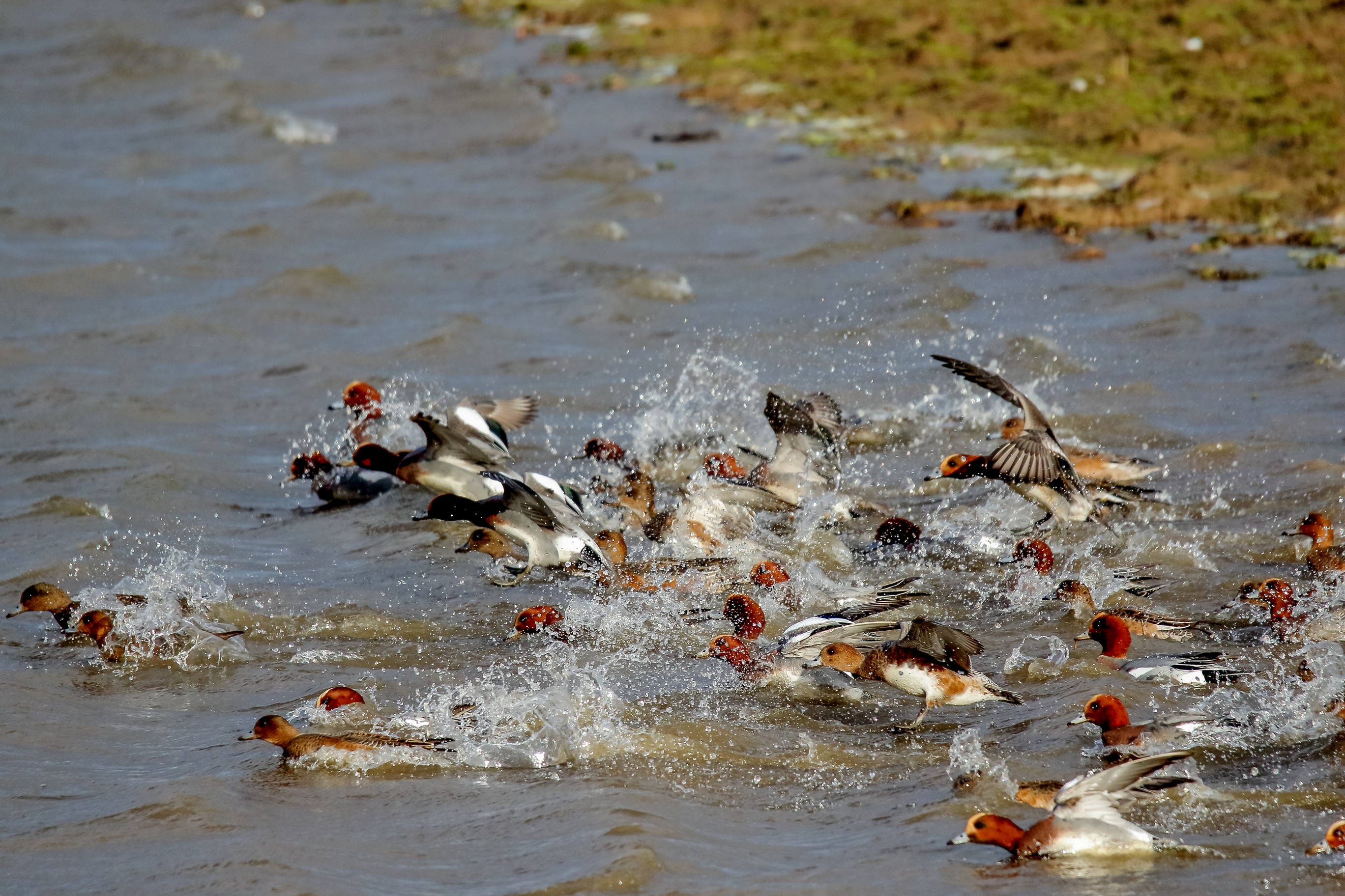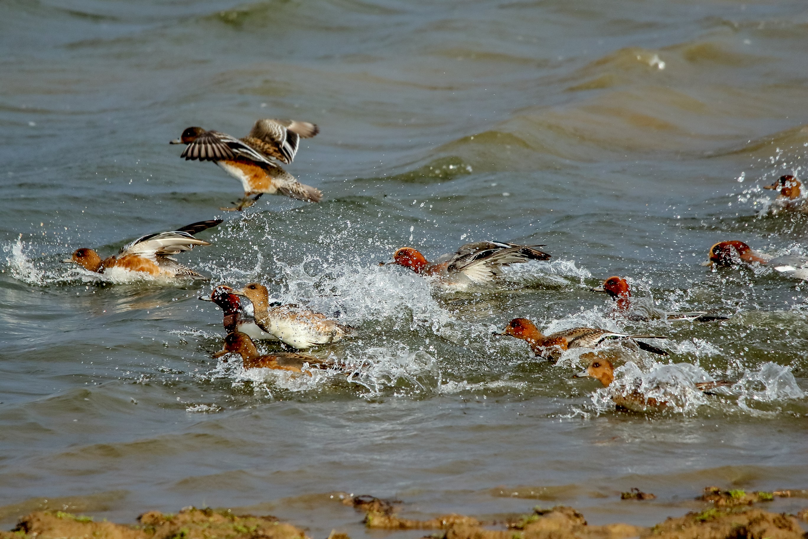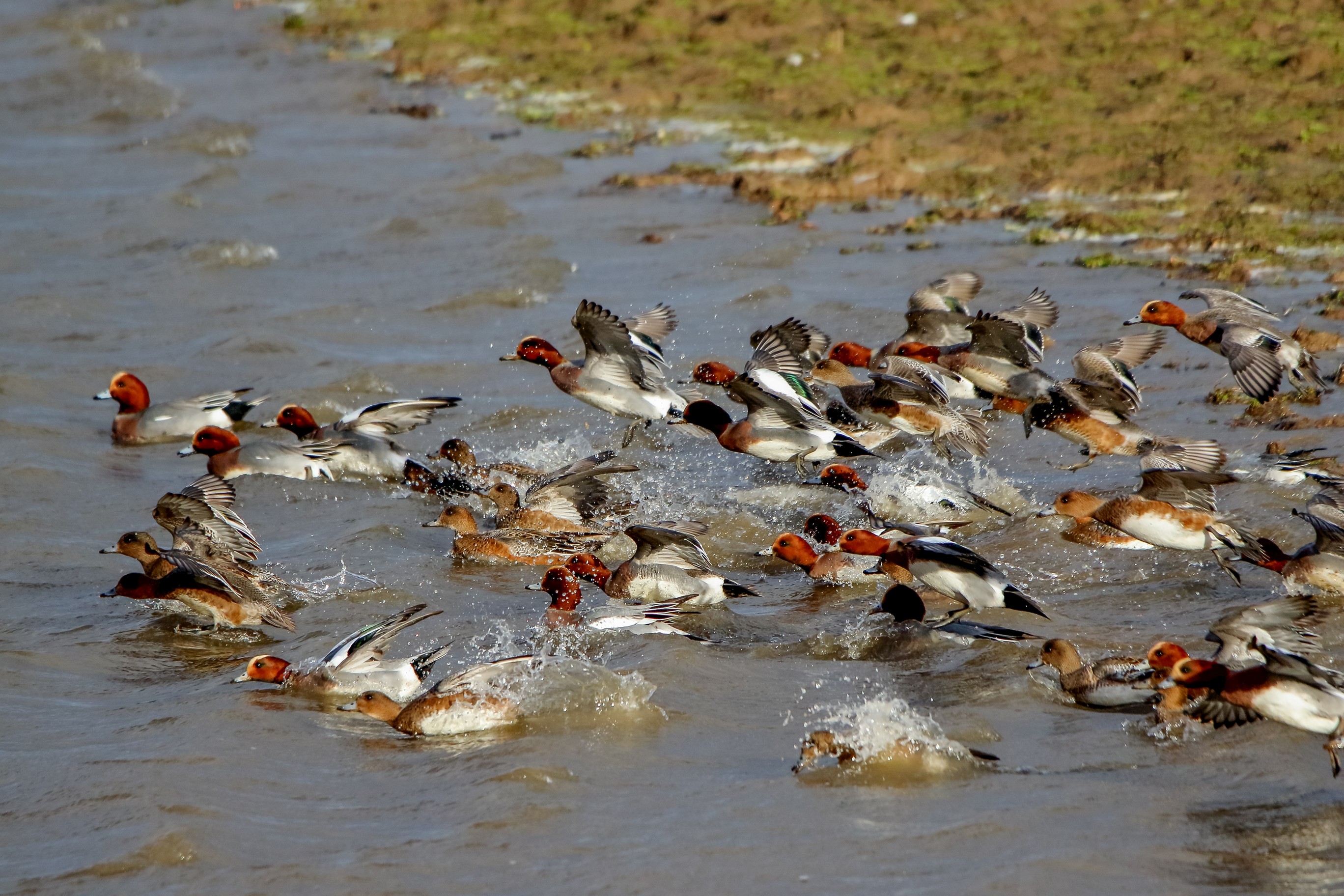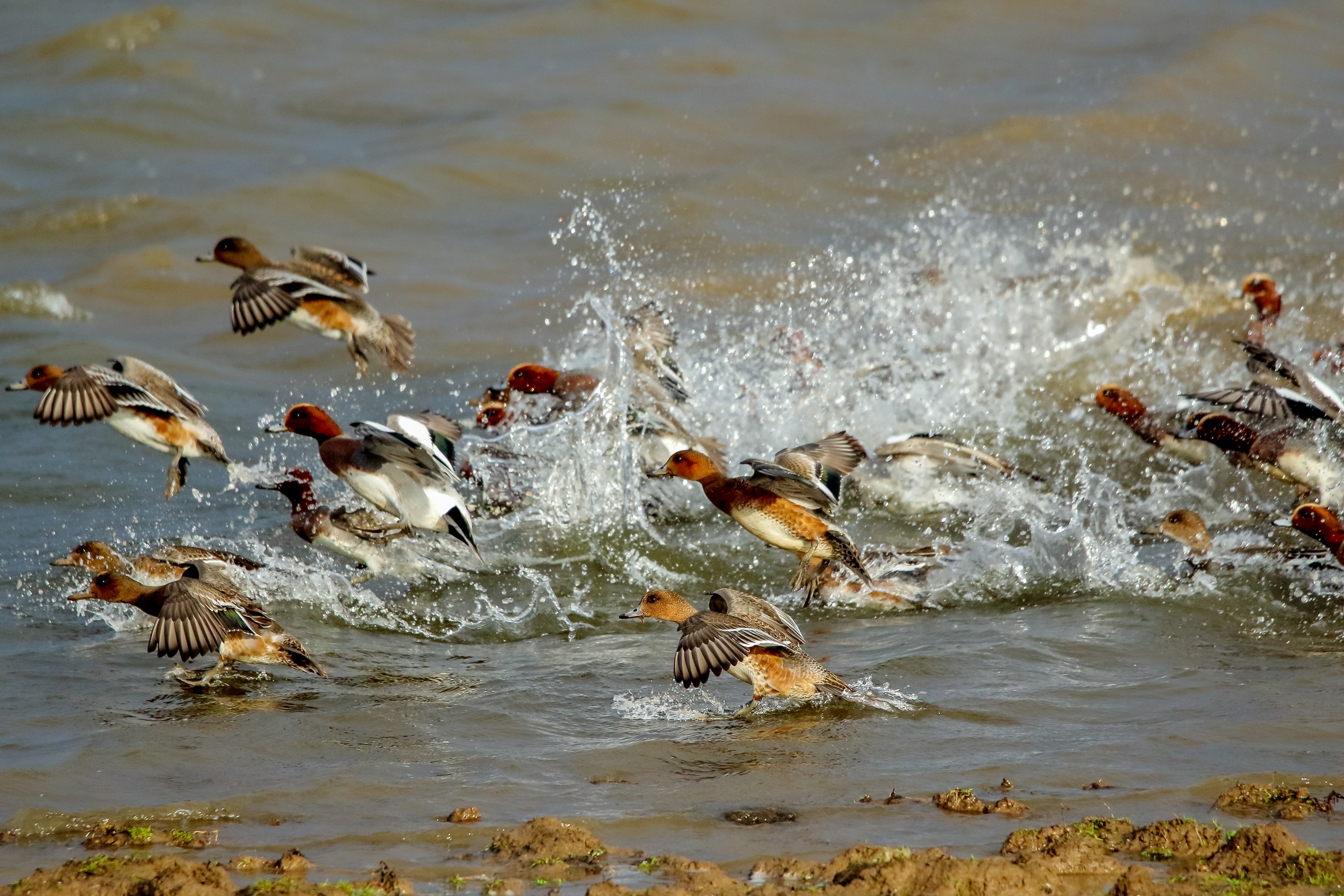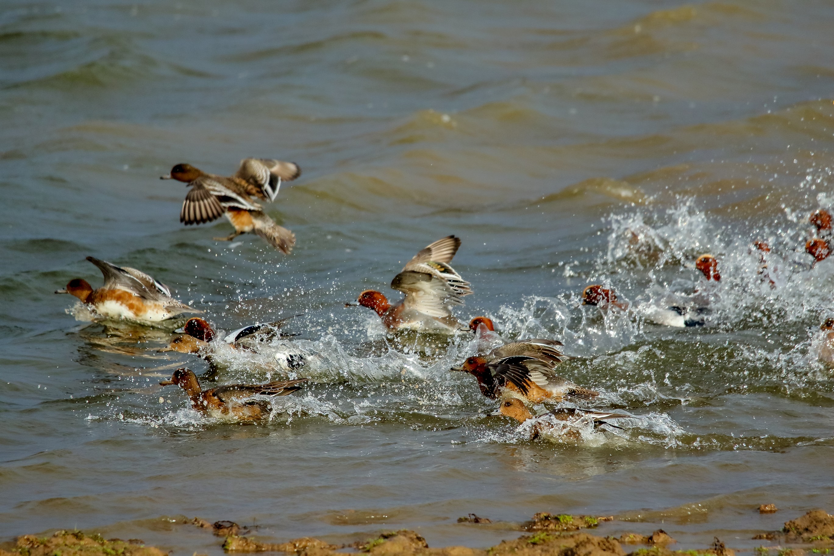 Eine aktive Truppe Pfeifenten an der Flutmulde