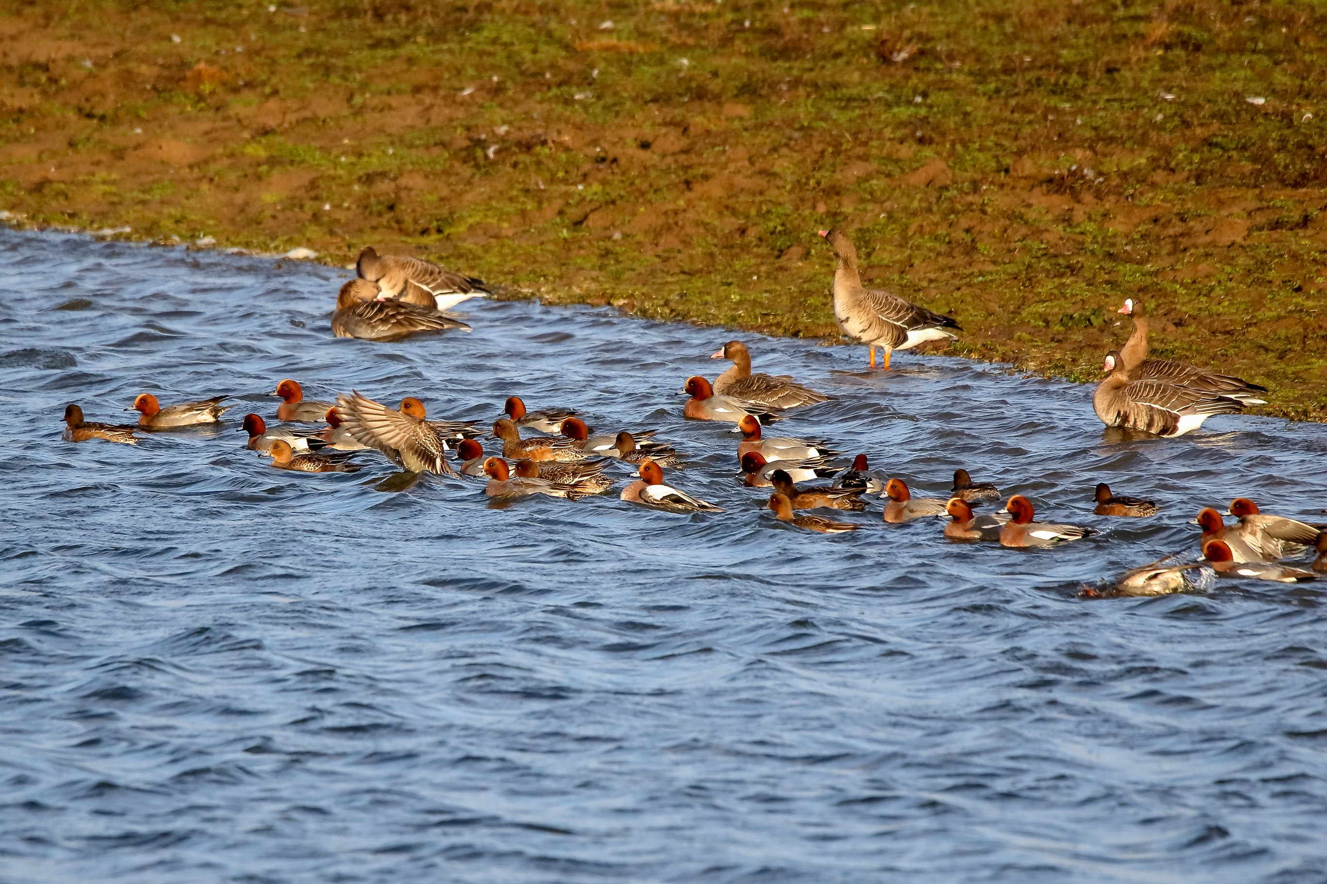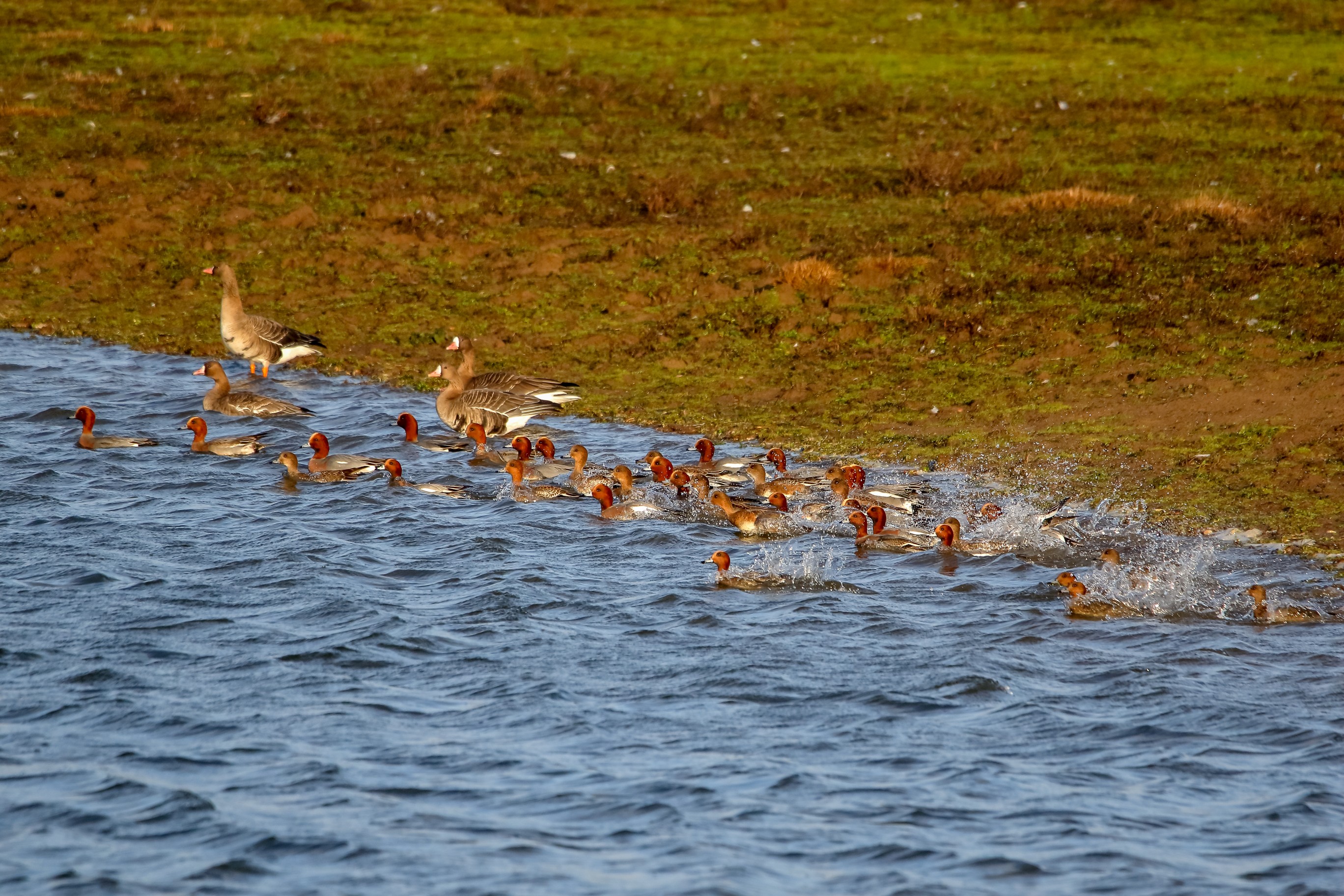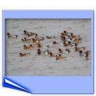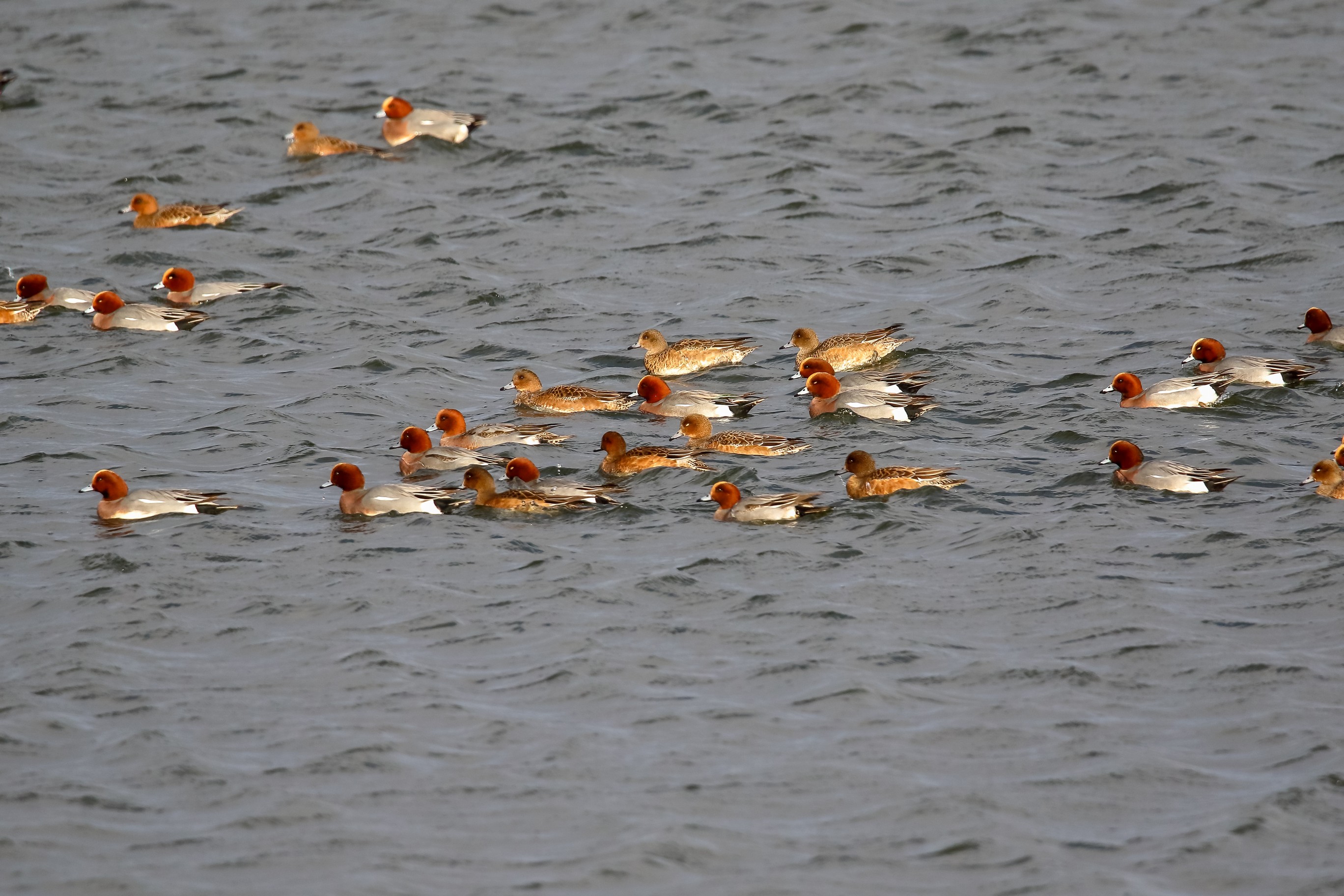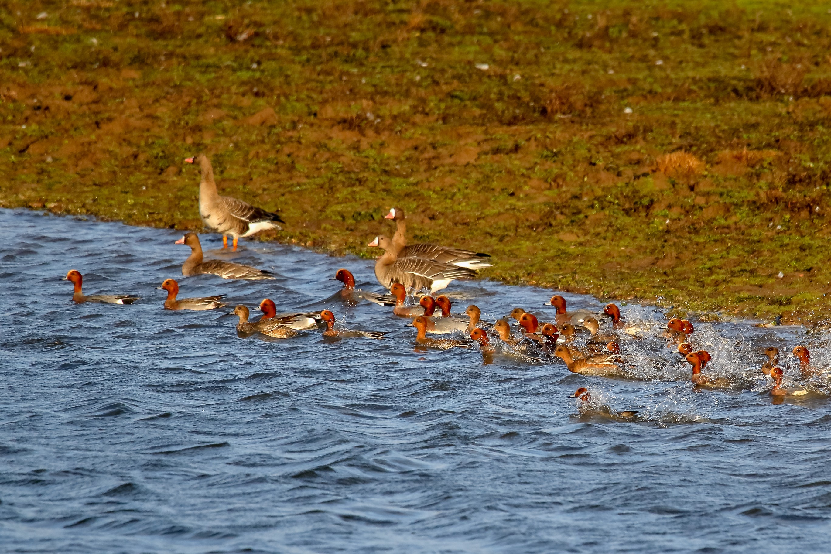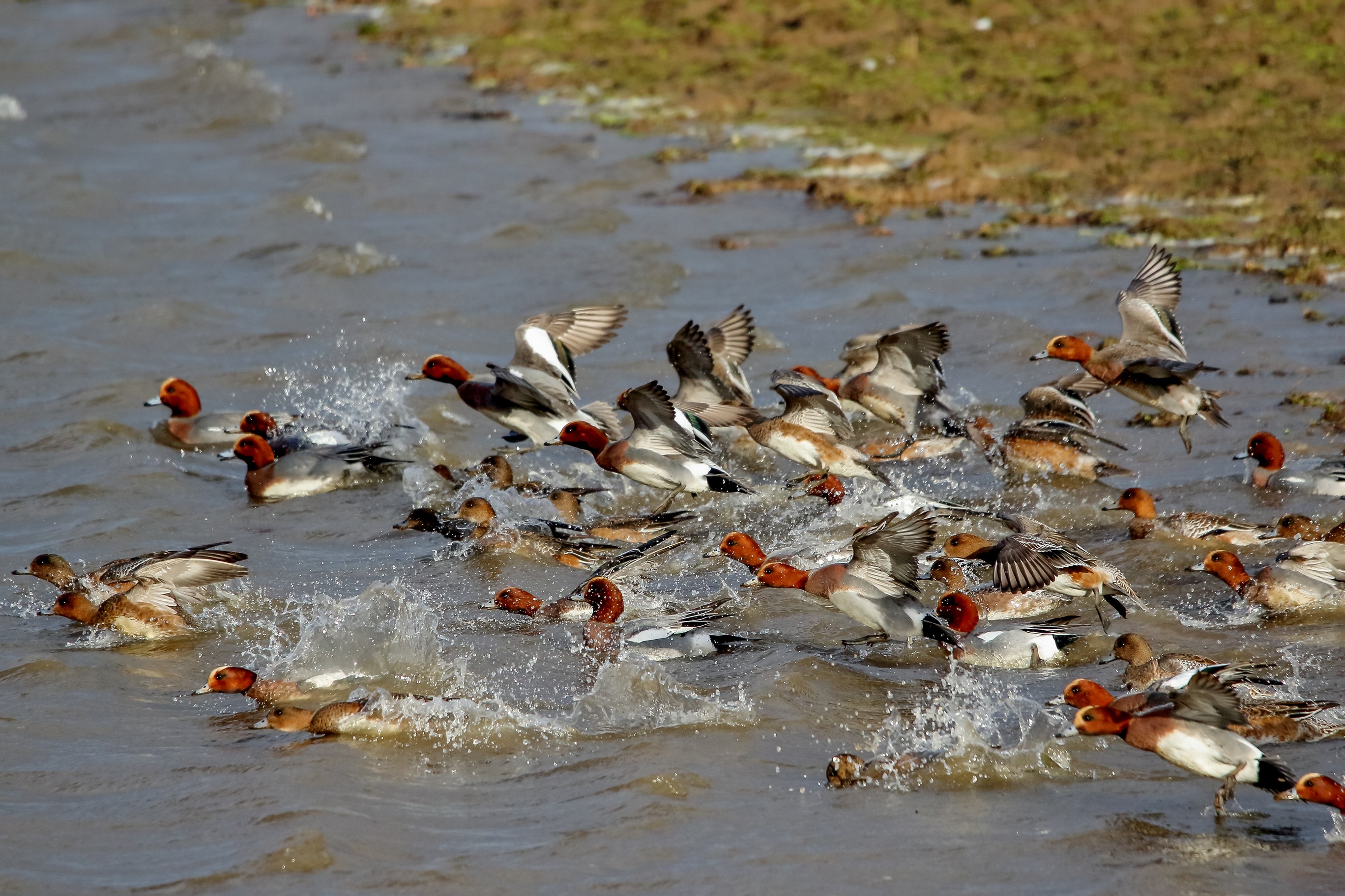 Eine aktive Truppe Pfeifenten an der Flutmulde
