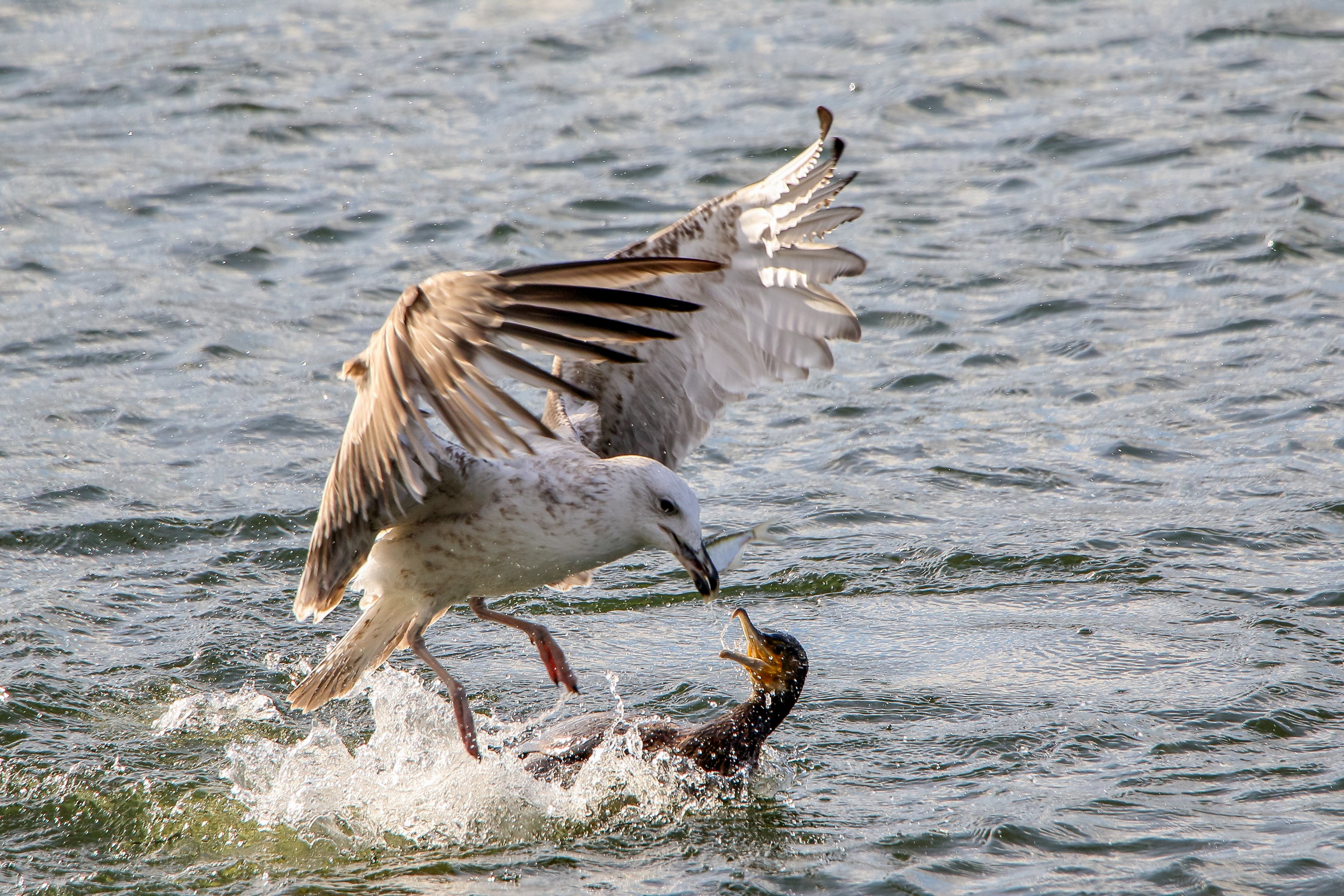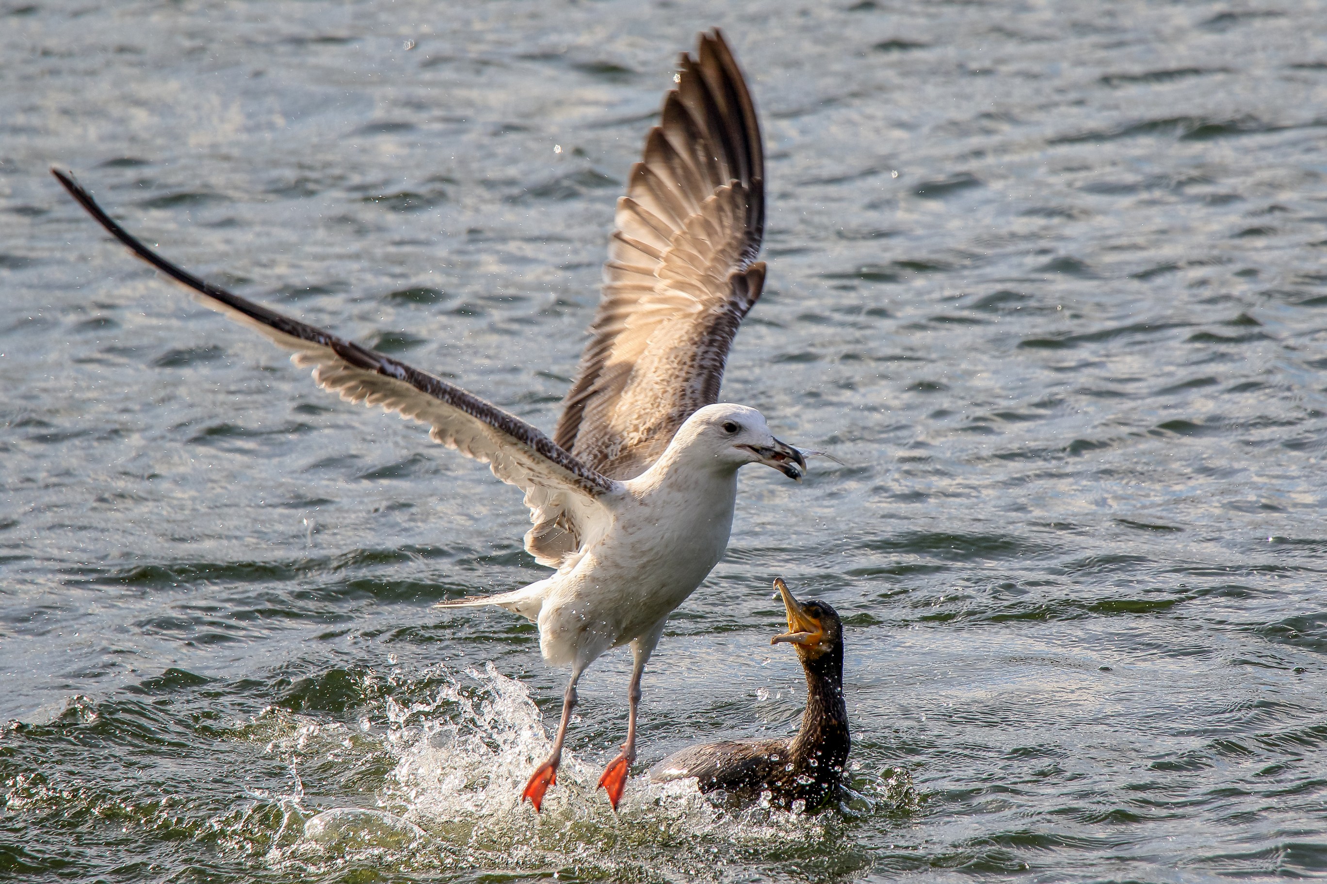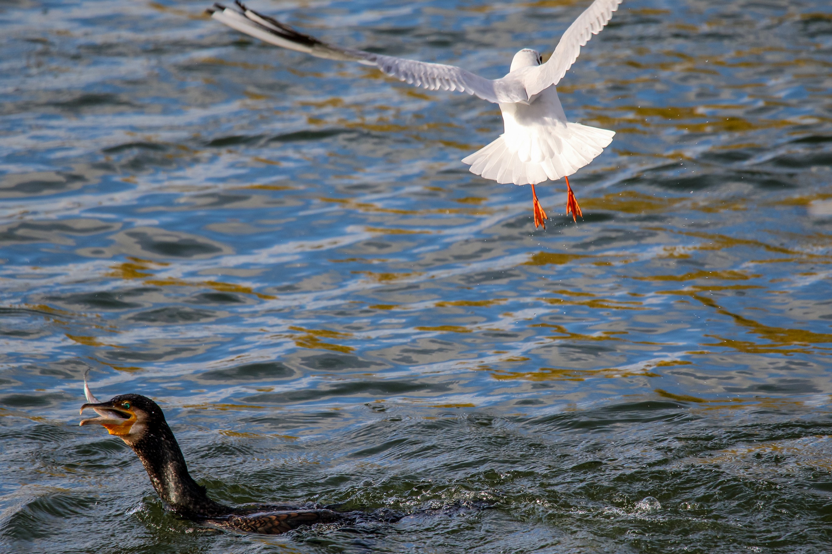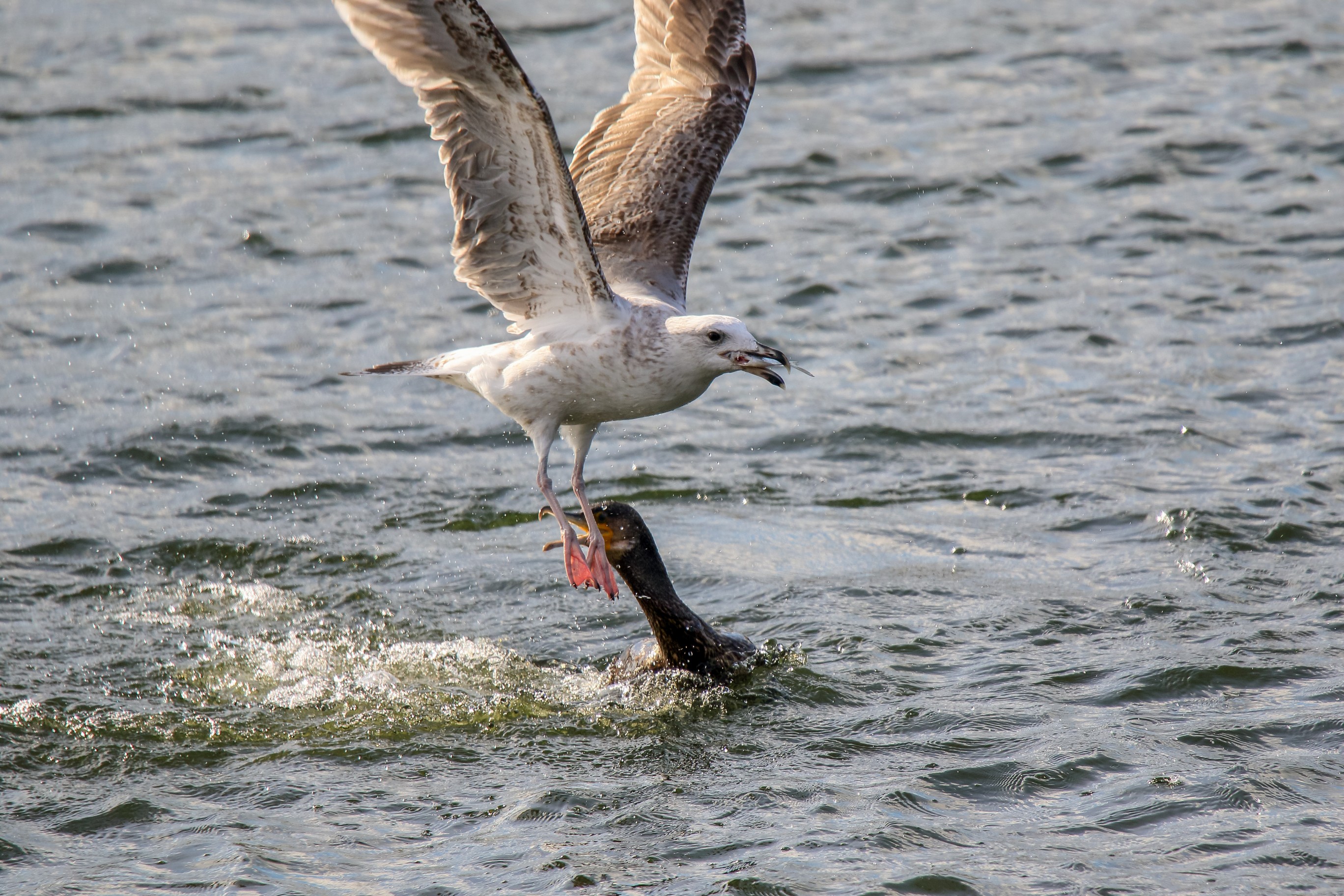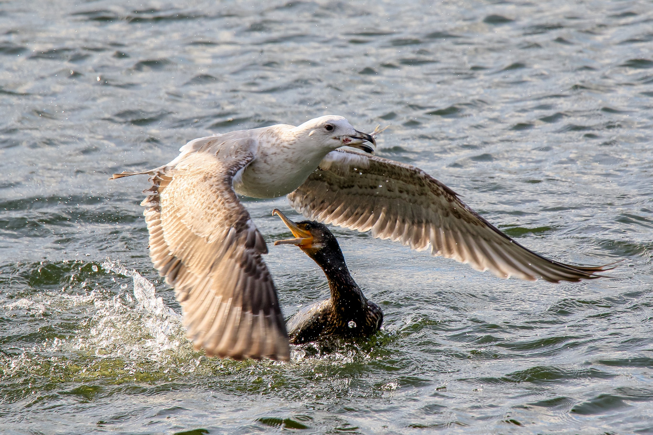 Möwe raubt Fisch aus dem Schabel des Kormoran