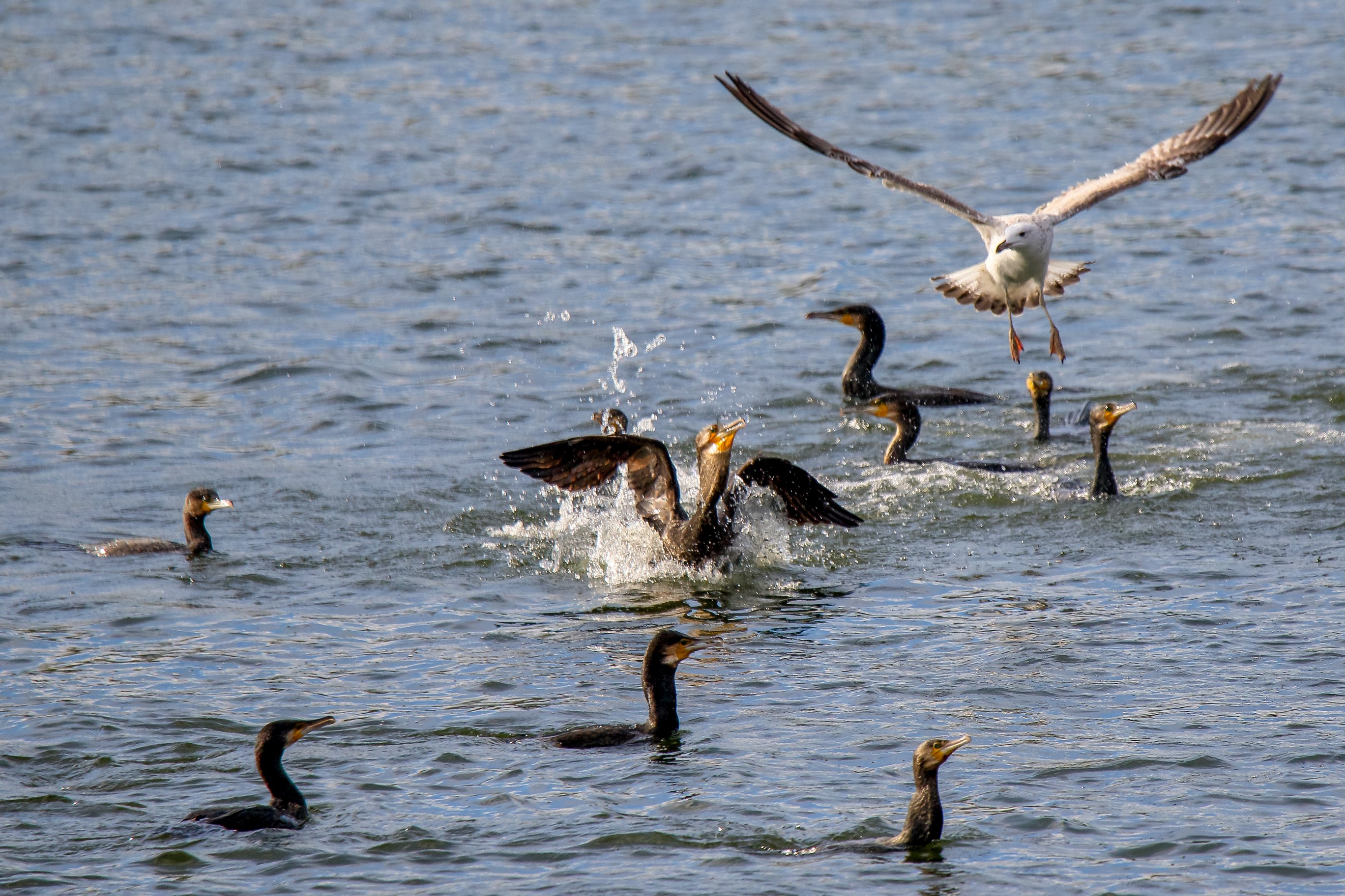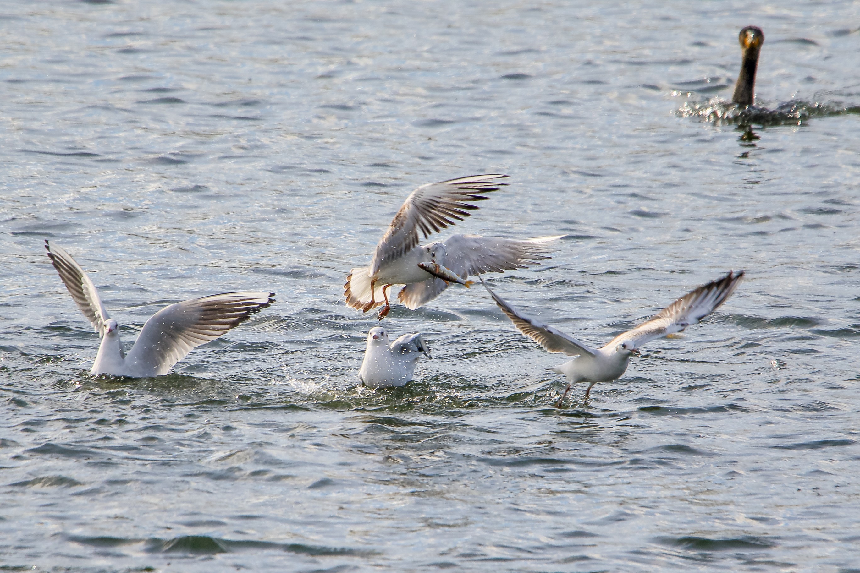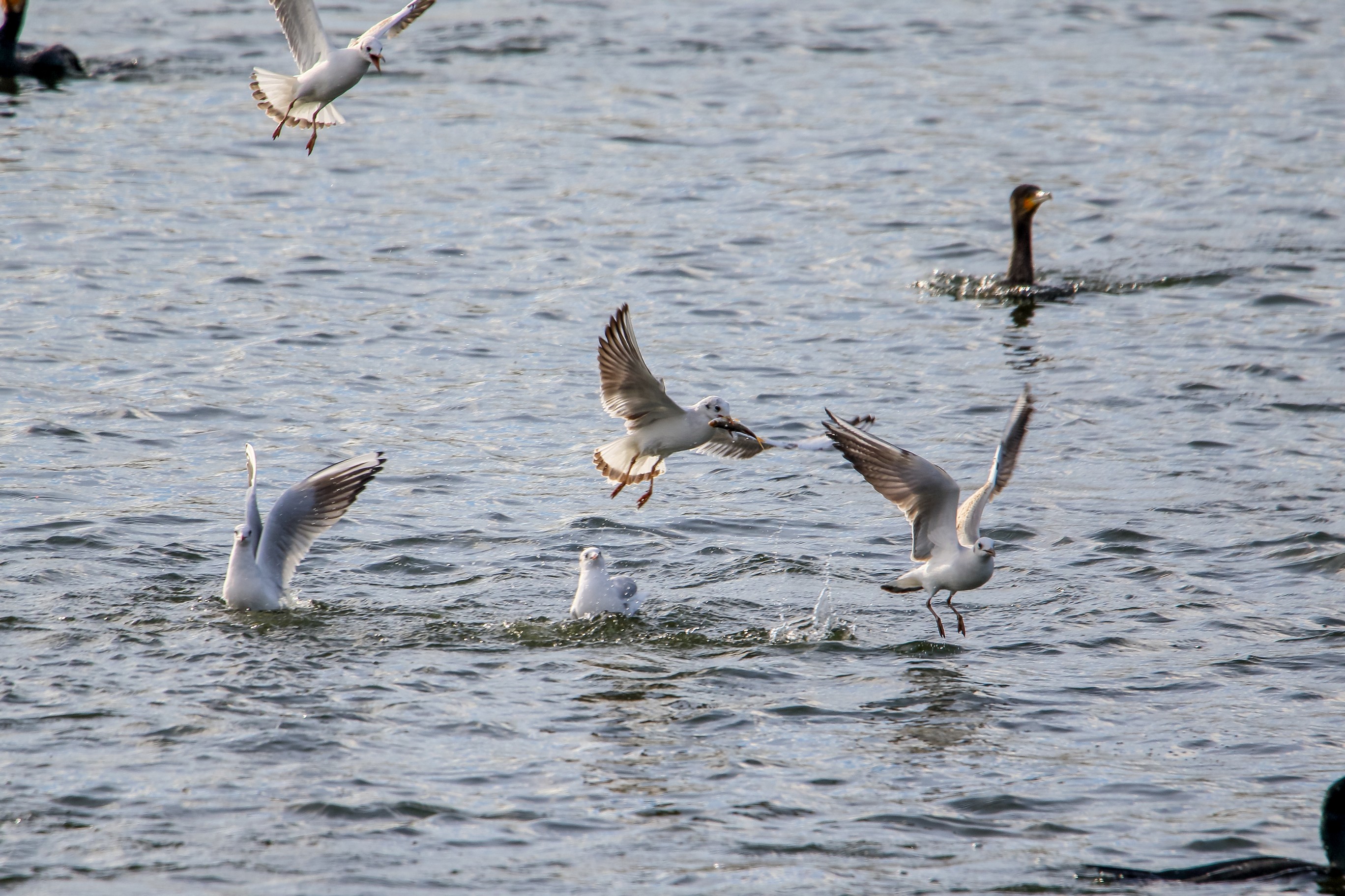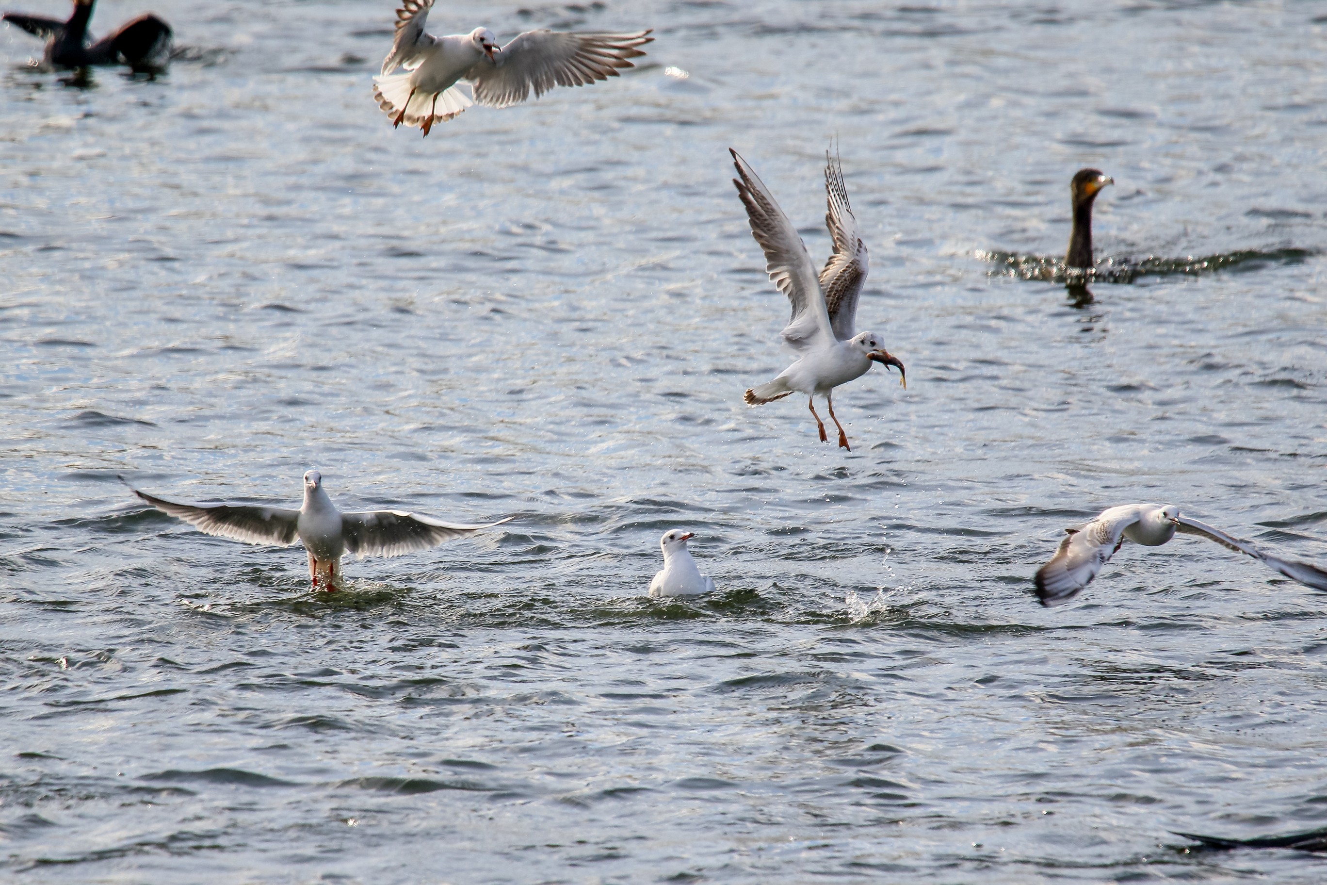 Möwe raubt Fisch aus dem Schabel des Kormoran