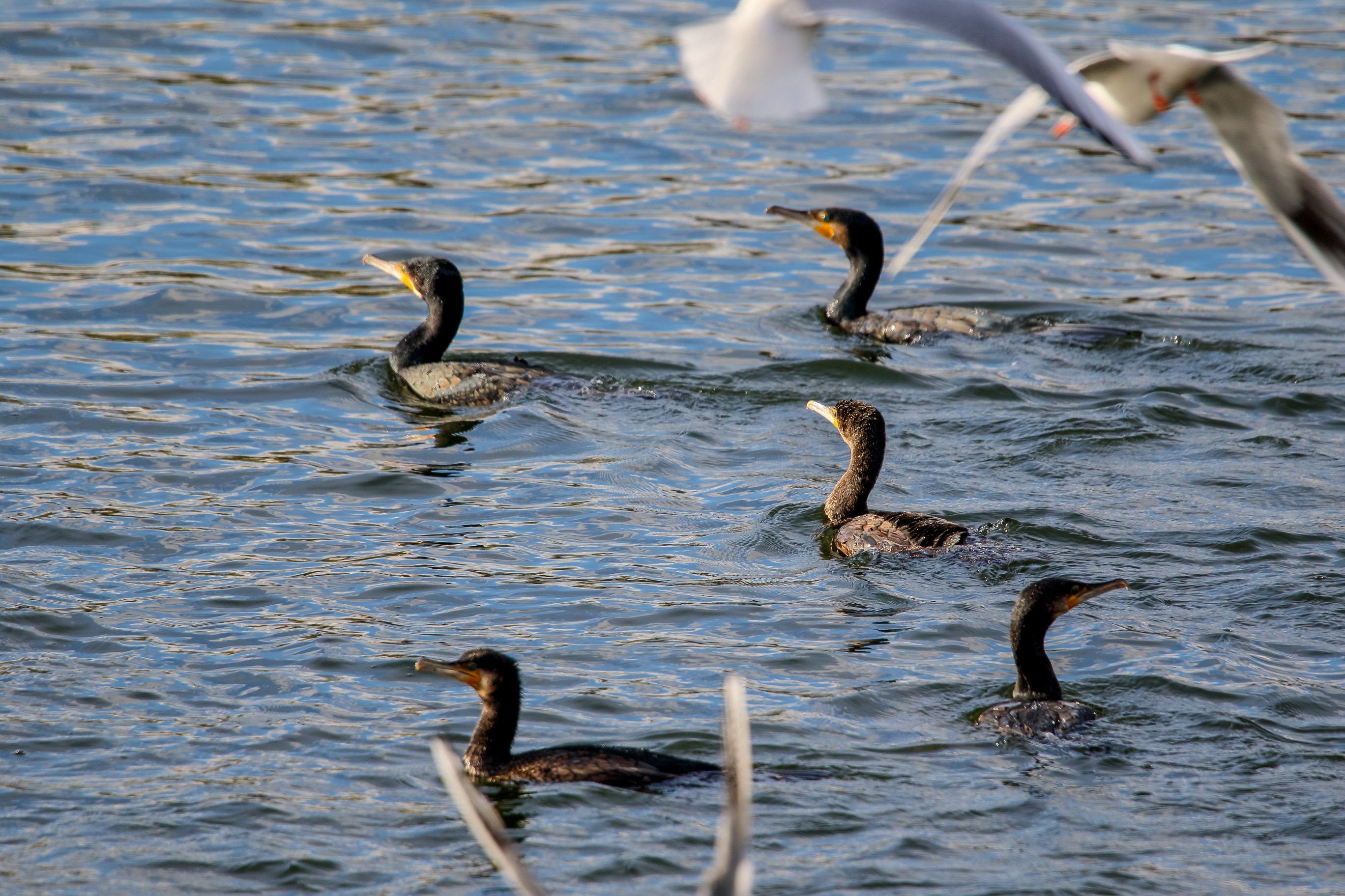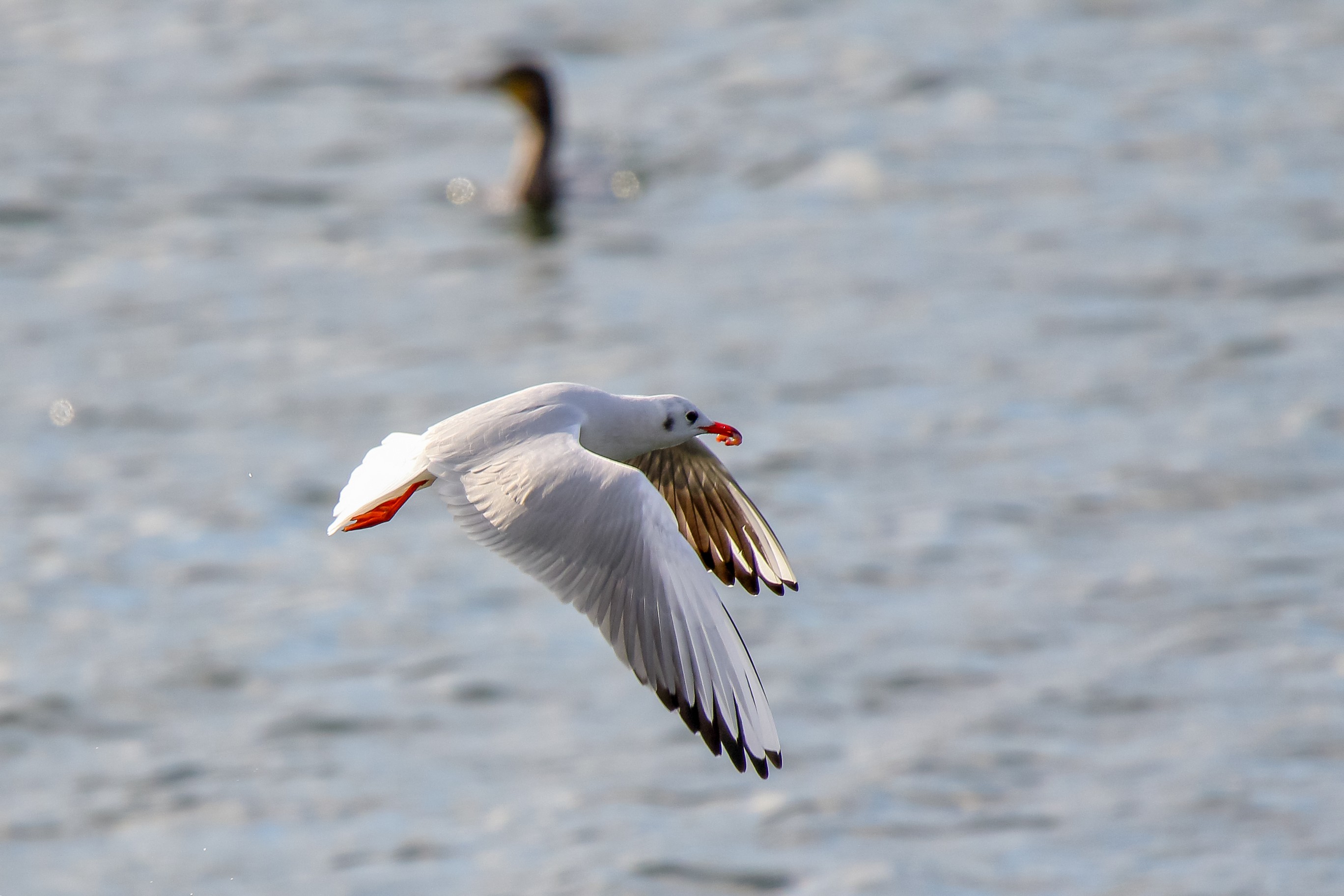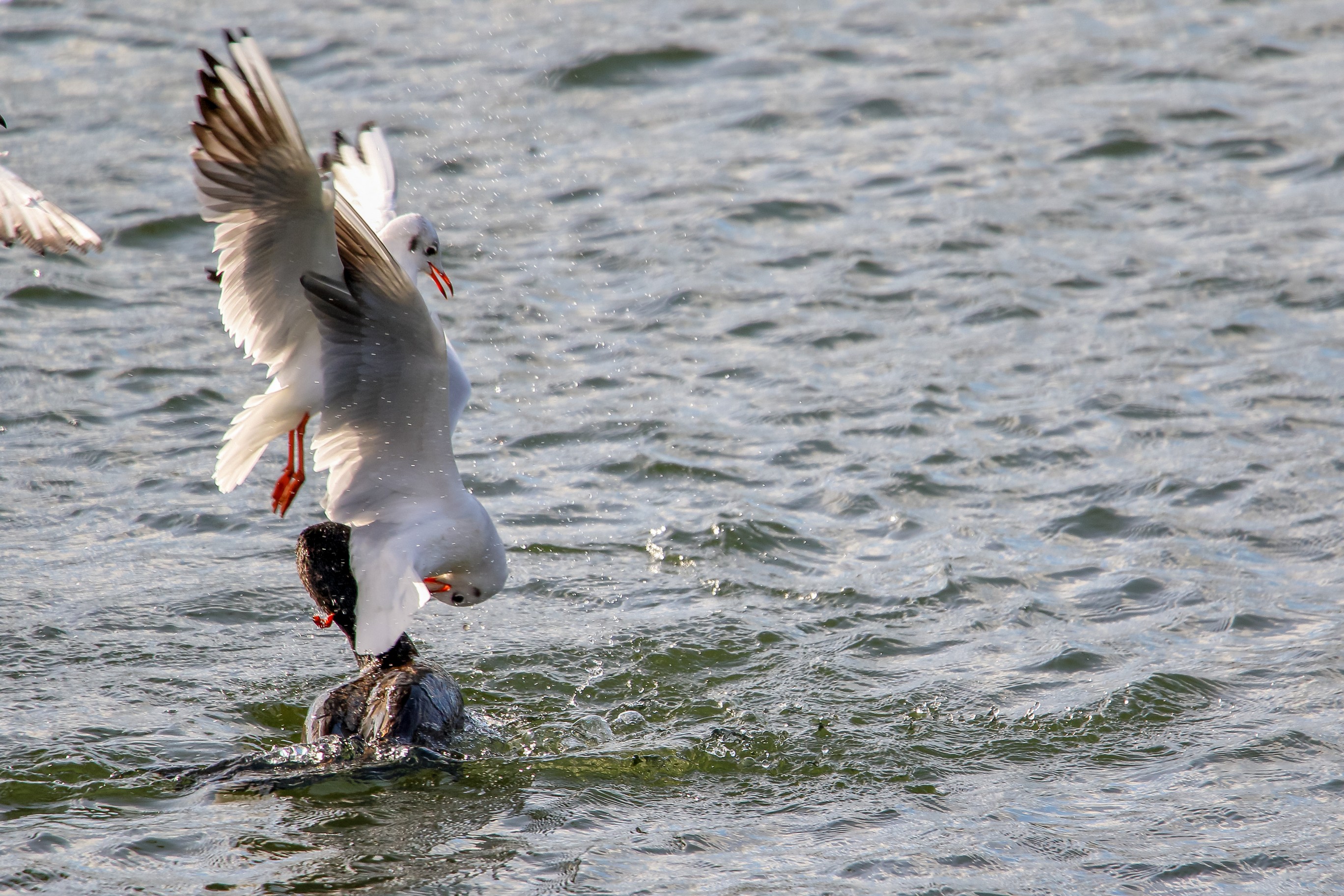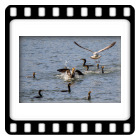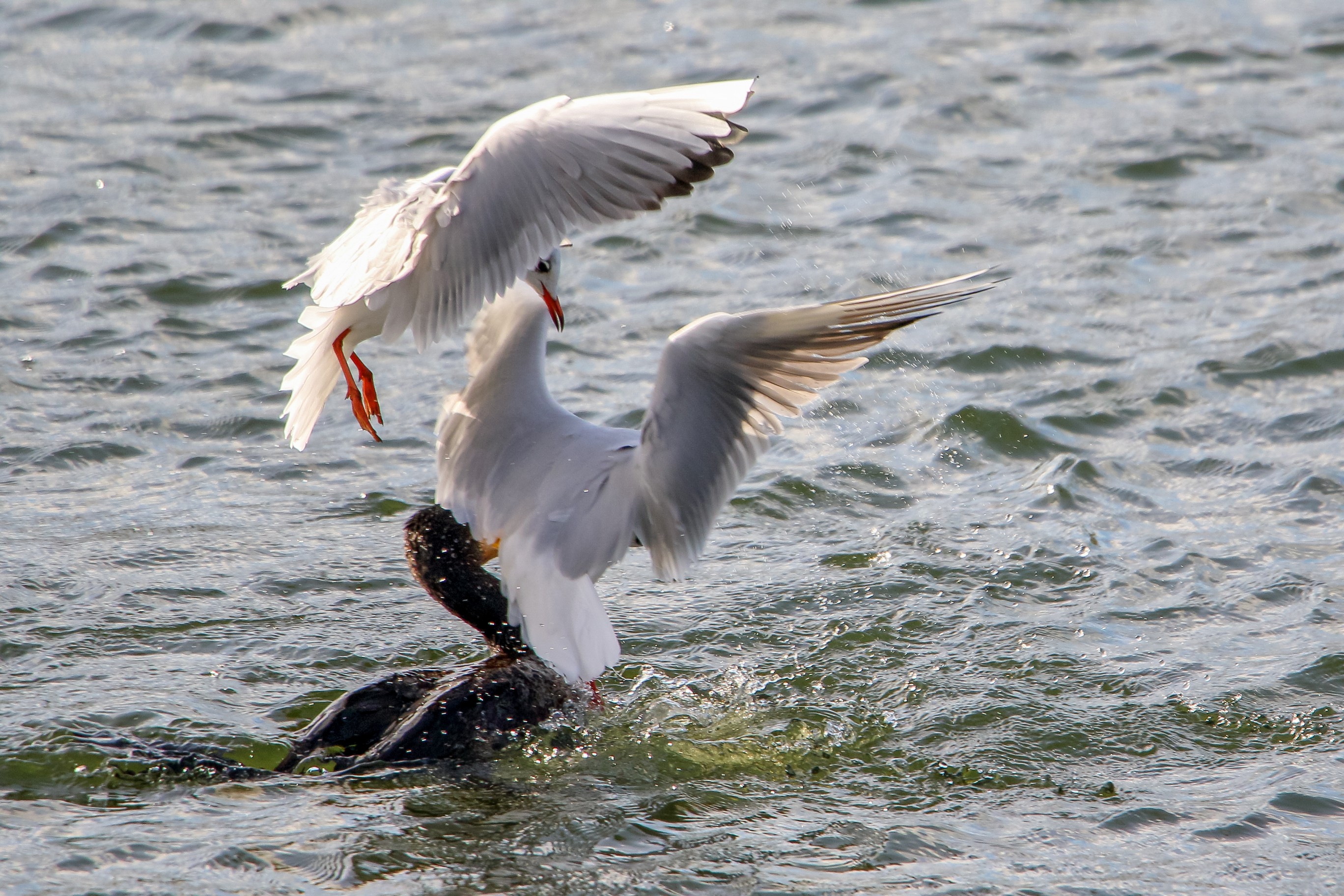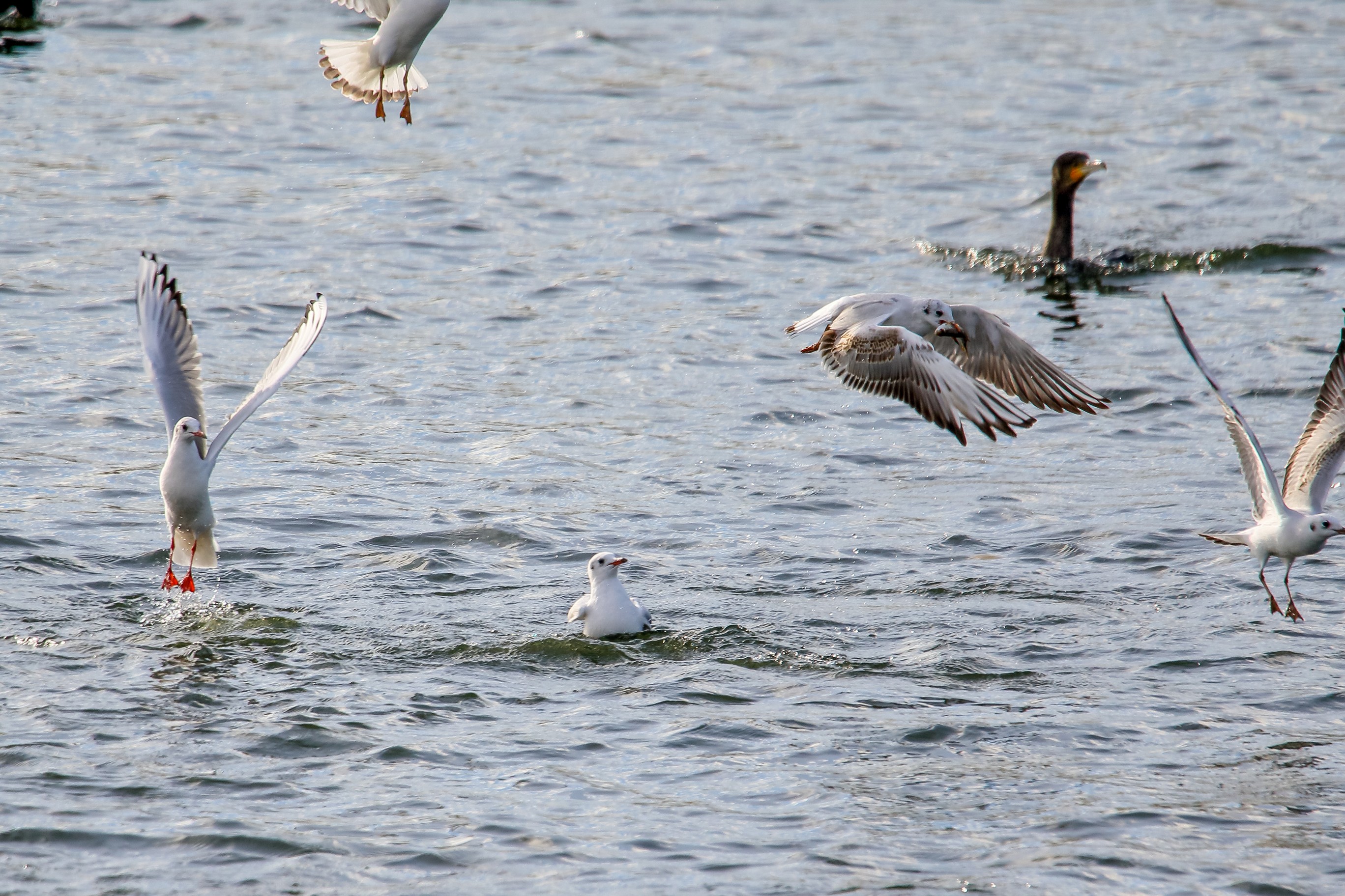 Möwe raubt Fisch aus dem Schabel des Kormoran