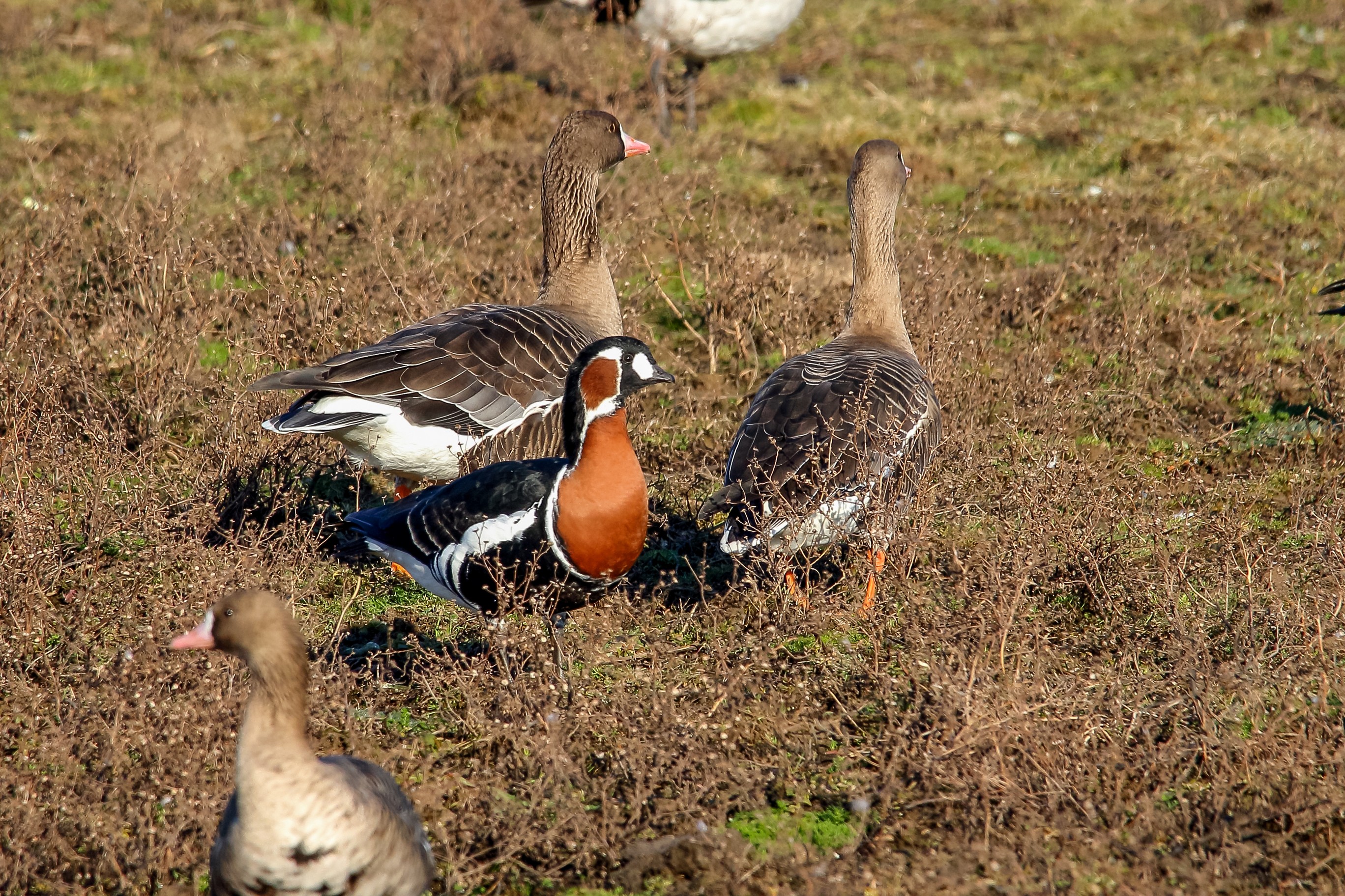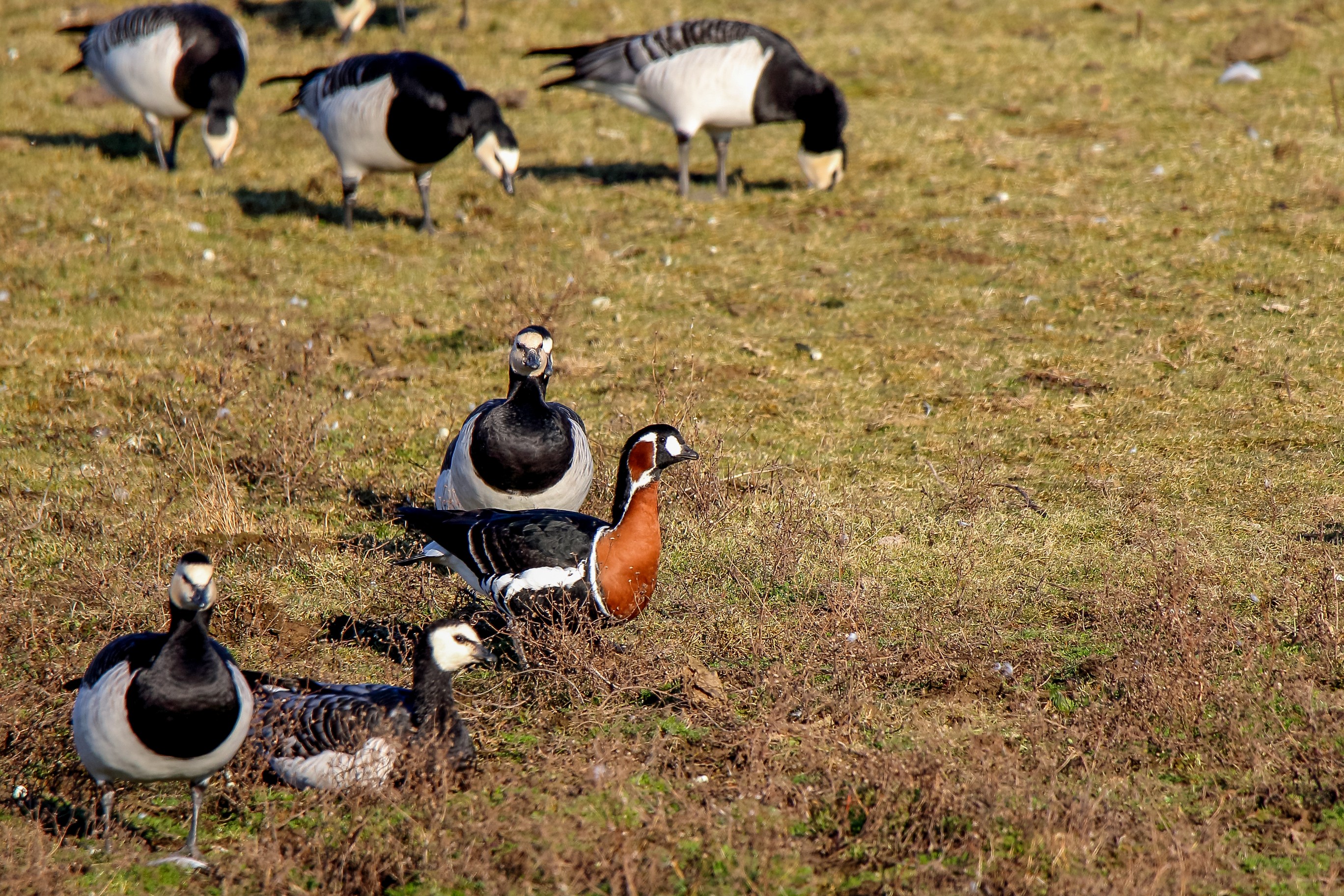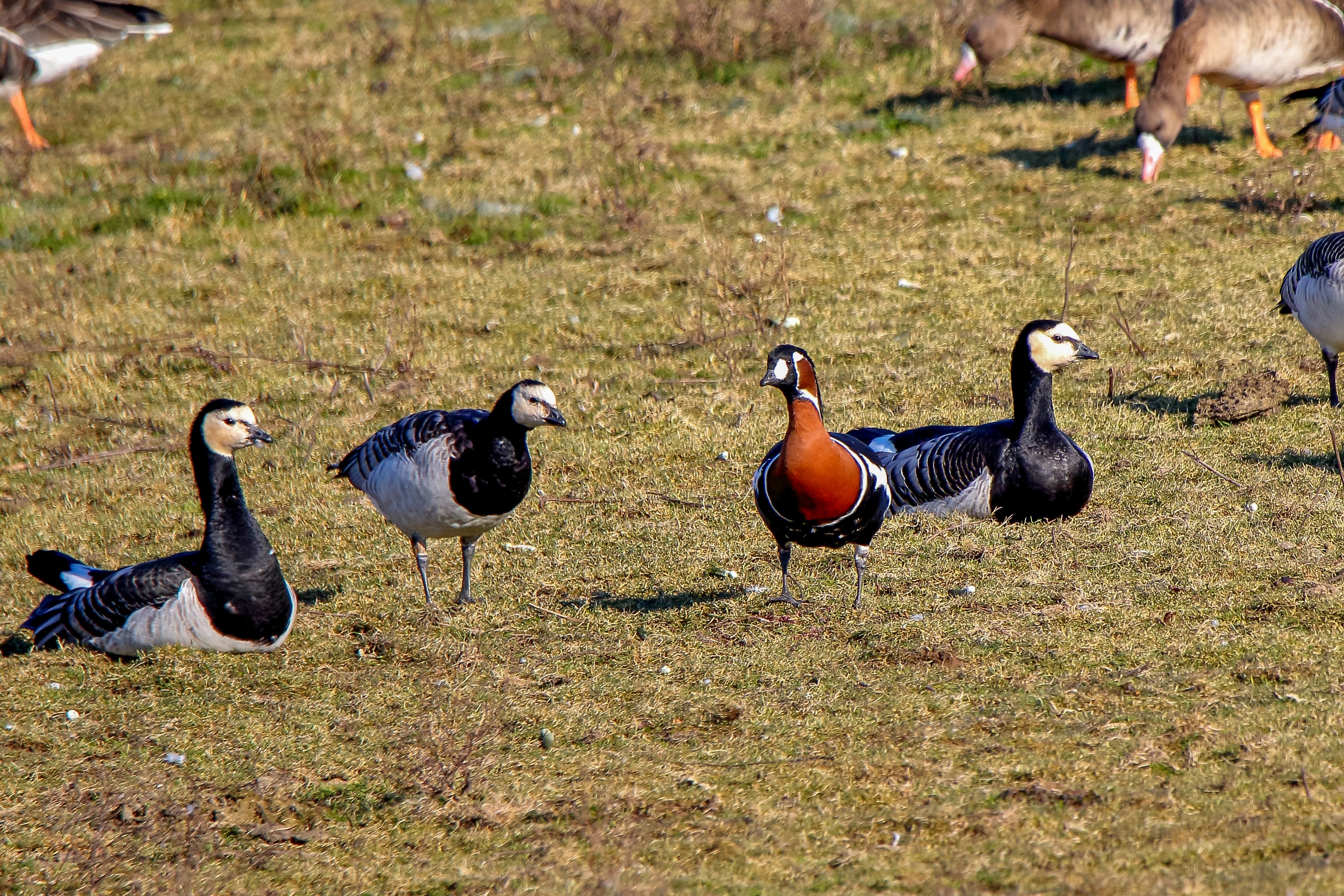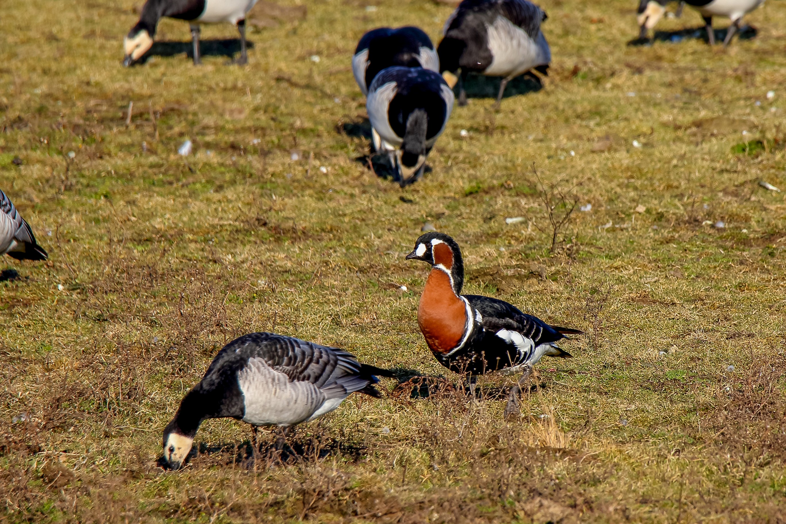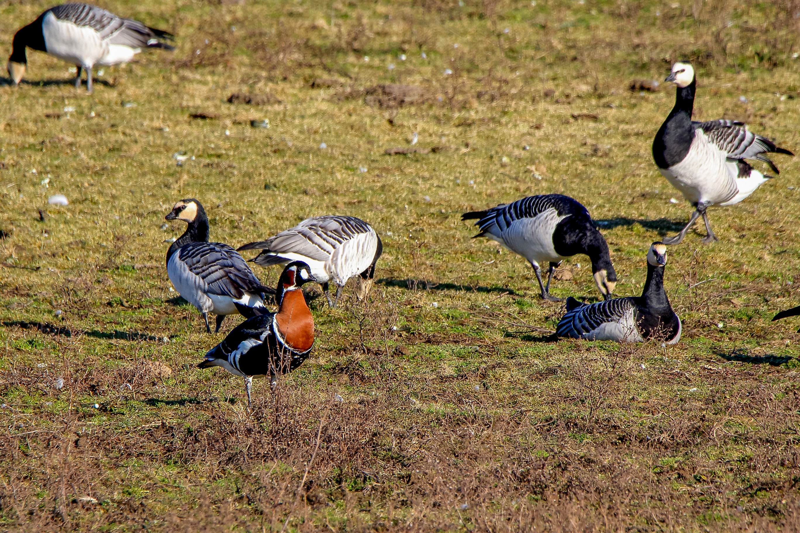 Auch am Niederrhein ist es für Gänsebeobachter ein besonderes Erlebnis, zwischen der großen Anzahl von Weisswangengänsen die sich so gut wie niemals in der ersten Linie aufhaltende Rothalsgans zu sichten. Aus diesem Grund sind Aufnahmen aus kurzer Distanz nur selten zu fertigen.