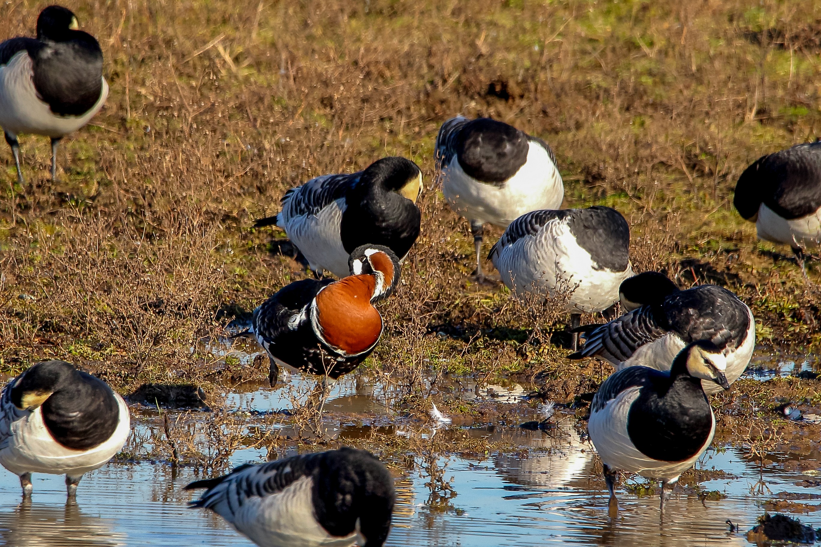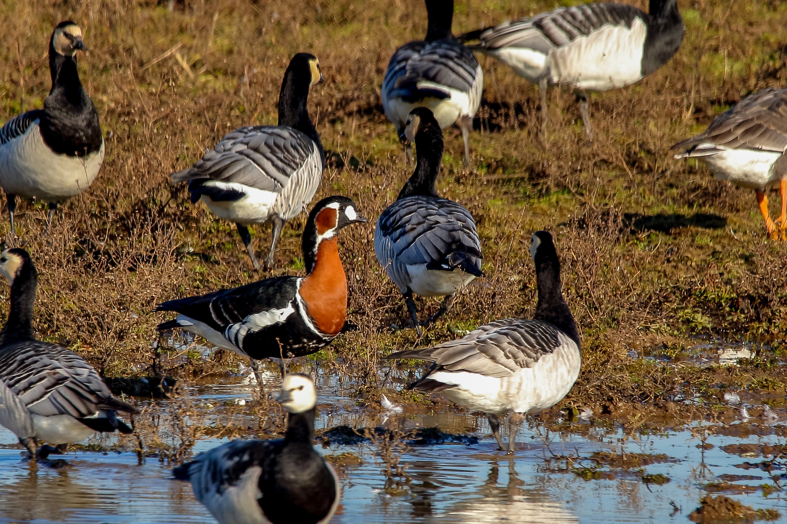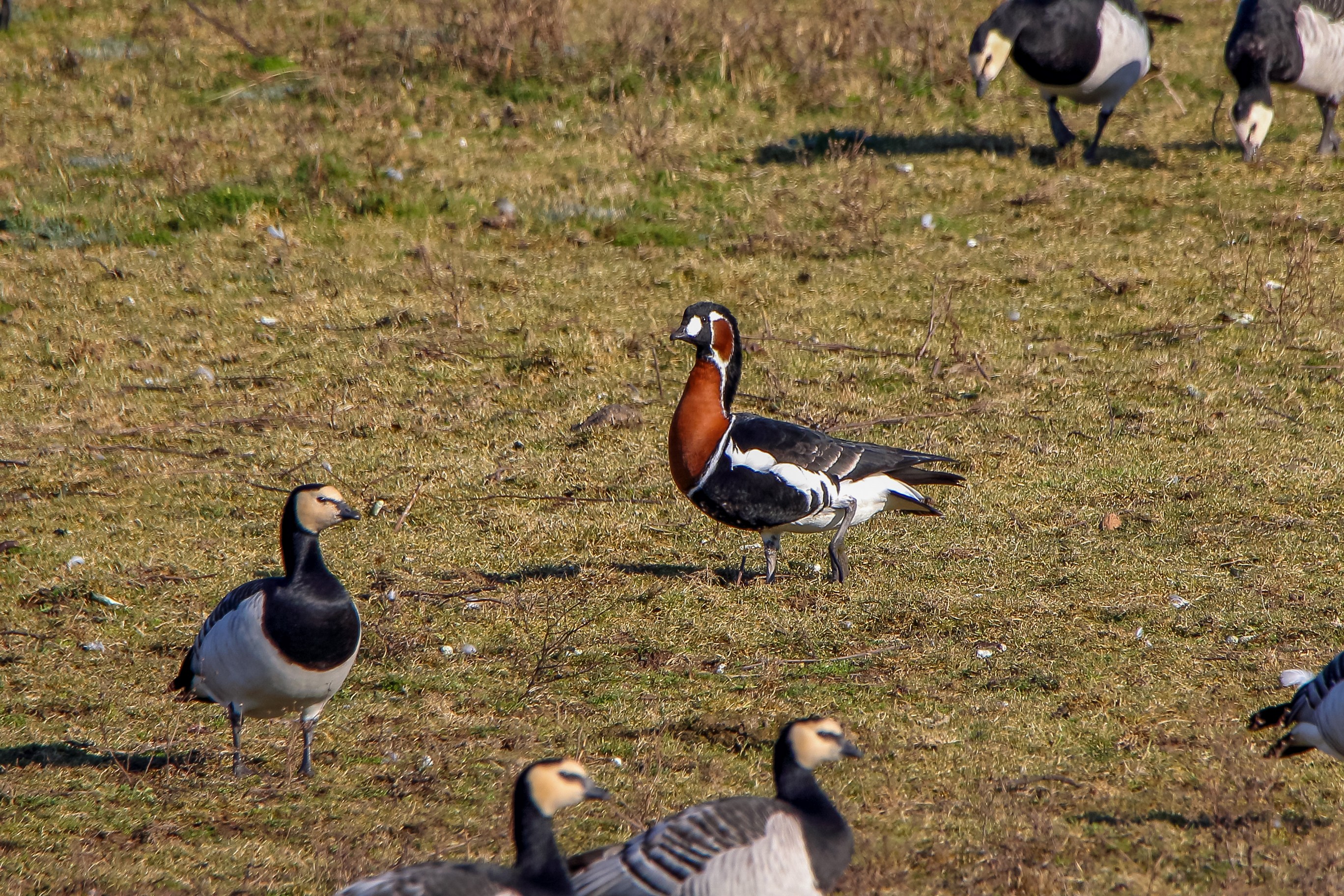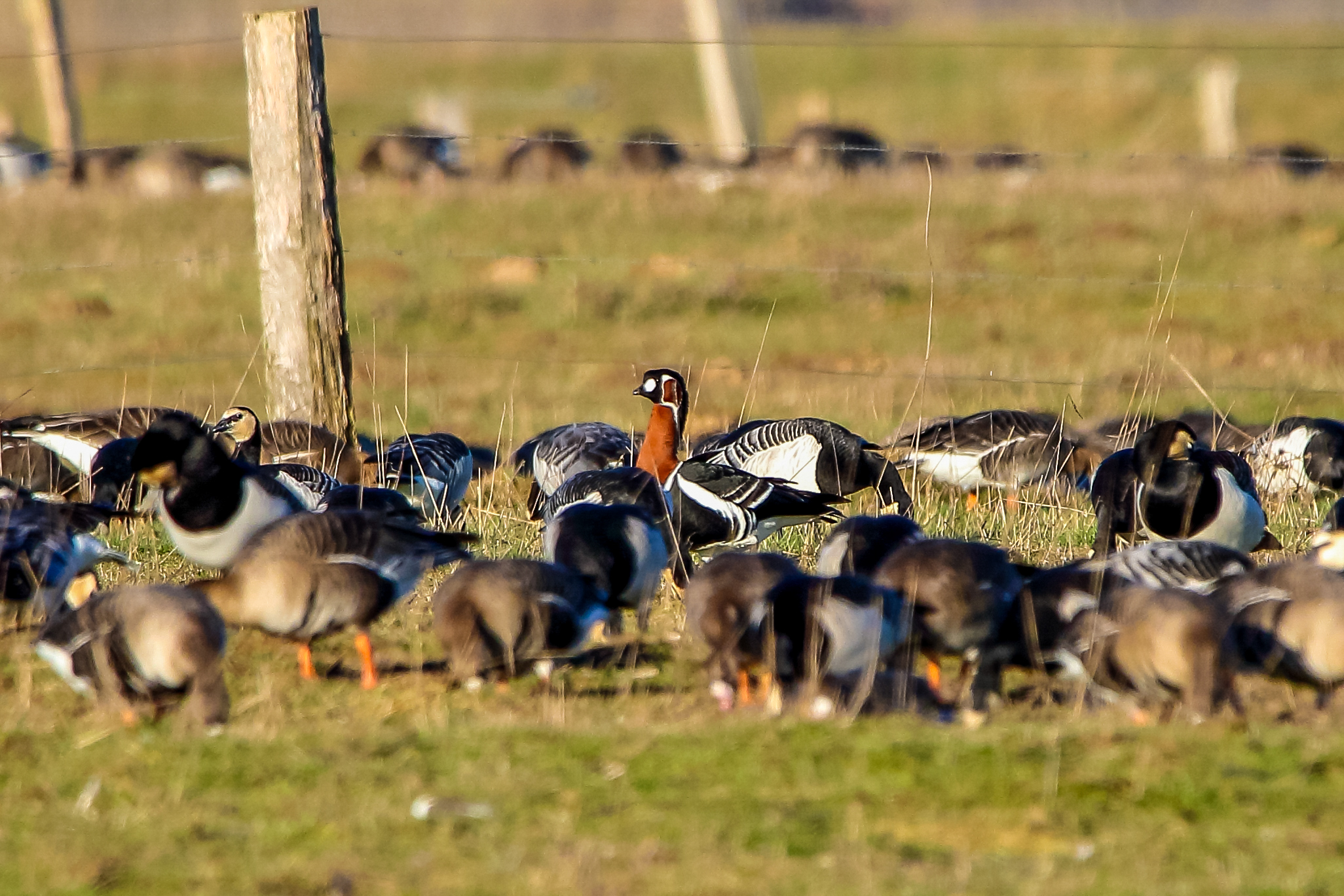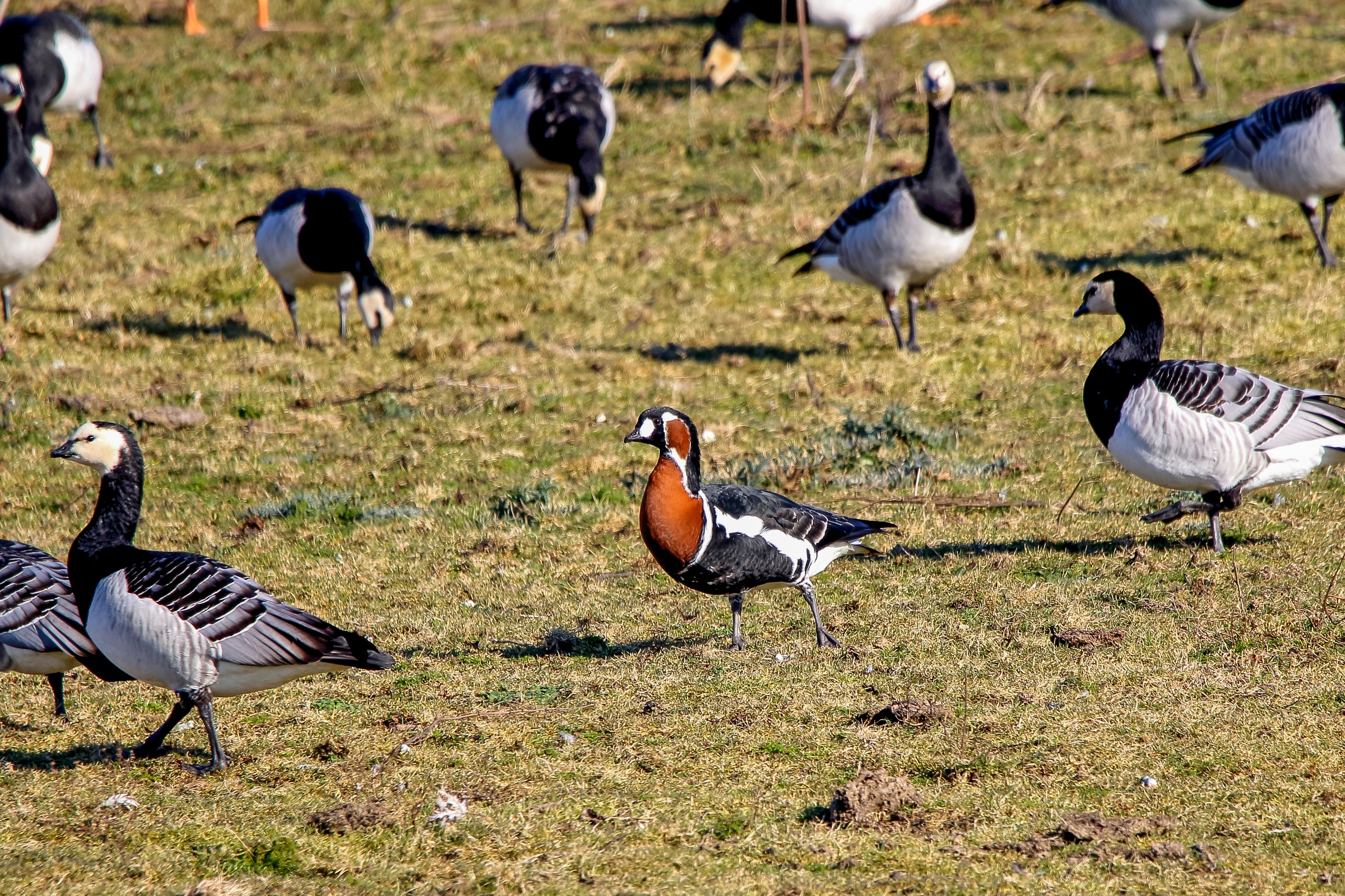 Auch am Niederrhein ist es für Gänsebeobachter ein besonderes Erlebnis, zwischen der großen Anzahl von Weisswangengänsen die sich so gut wie niemals in der ersten Linie aufhaltende Rothalsgans zu sichten. Aus diesem Grund sind Aufnahmen aus kurzer Distanz nur selten zu fertigen.