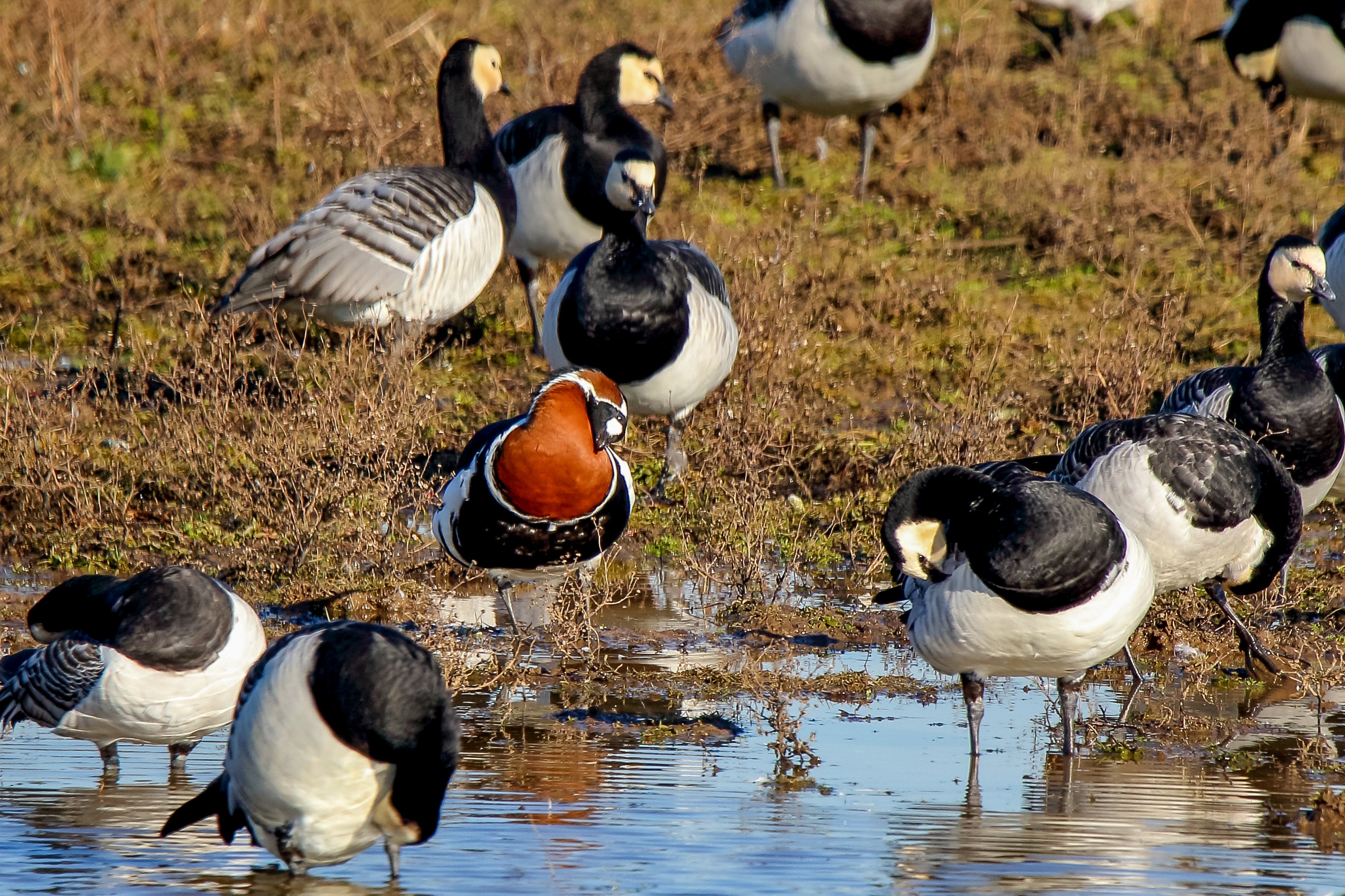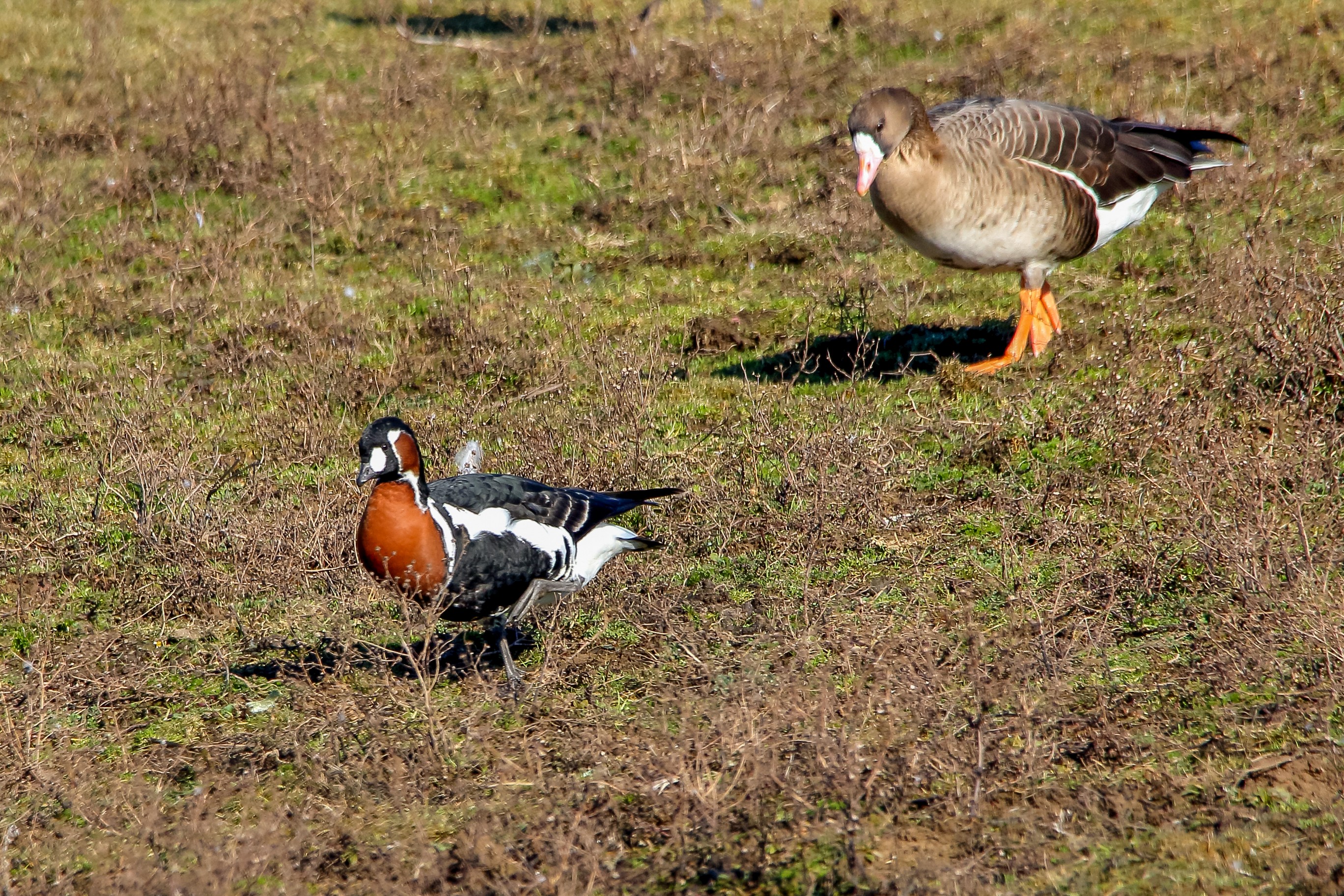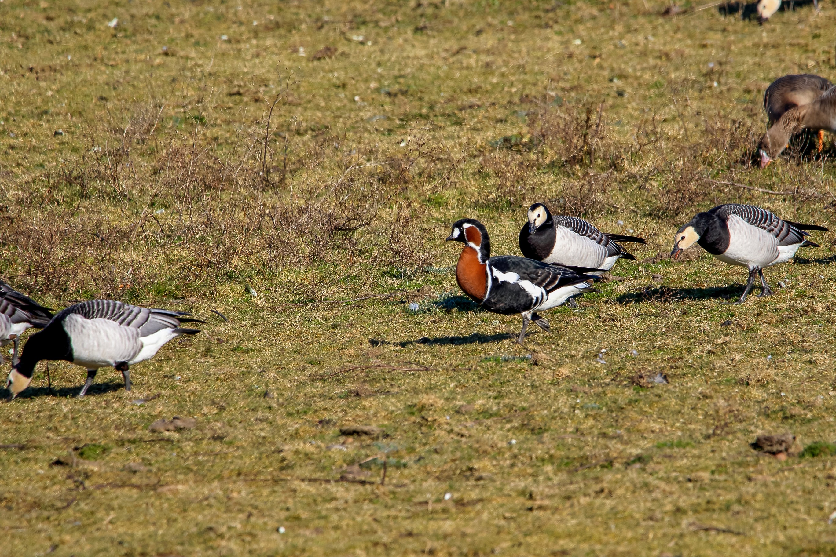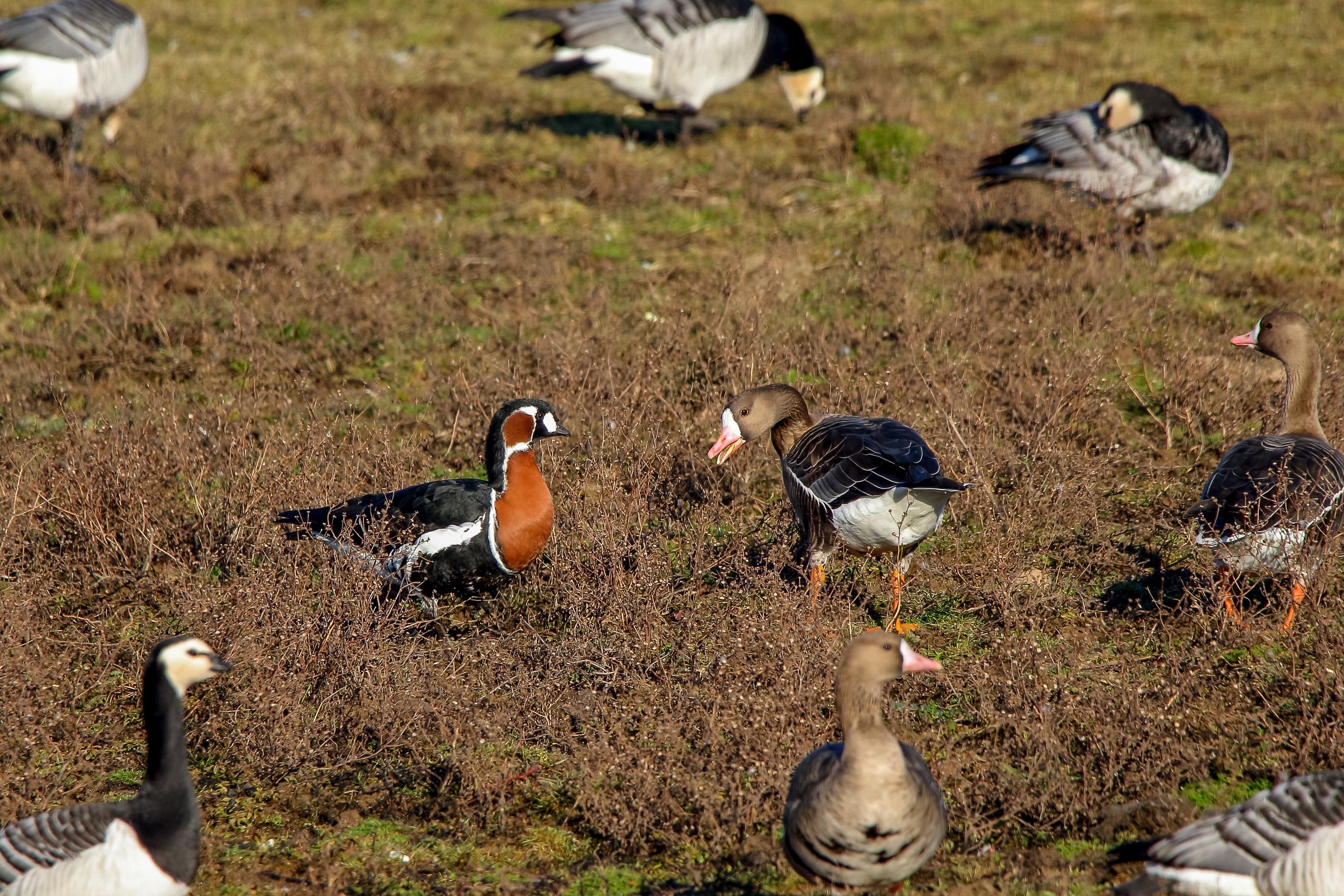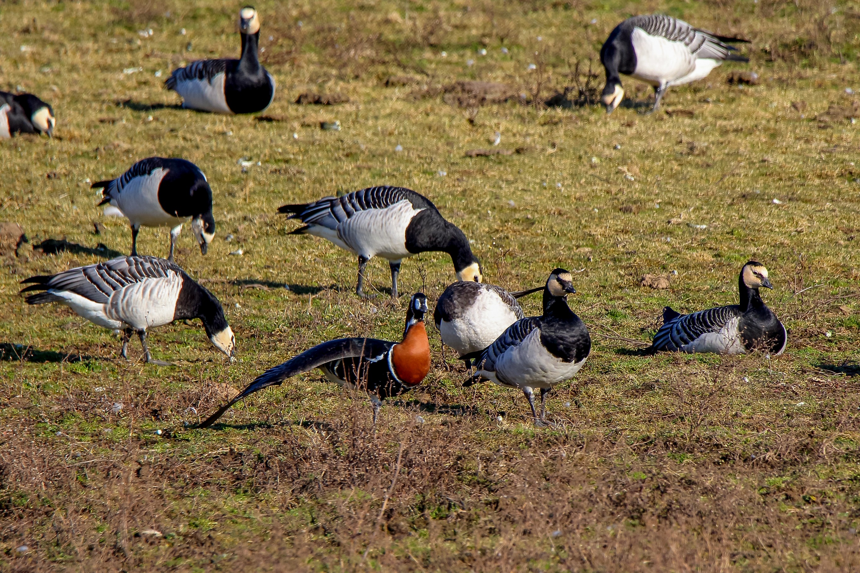 Auch am Niederrhein ist es für Gänsebeobachter ein besonderes Erlebnis, zwischen der großen Anzahl von Weisswangengänsen die sich so gut wie niemals in der ersten Linie aufhaltende Rothalsgans zu sichten. Aus diesem Grund sind Aufnahmen aus kurzer Distanz nur selten zu fertigen.